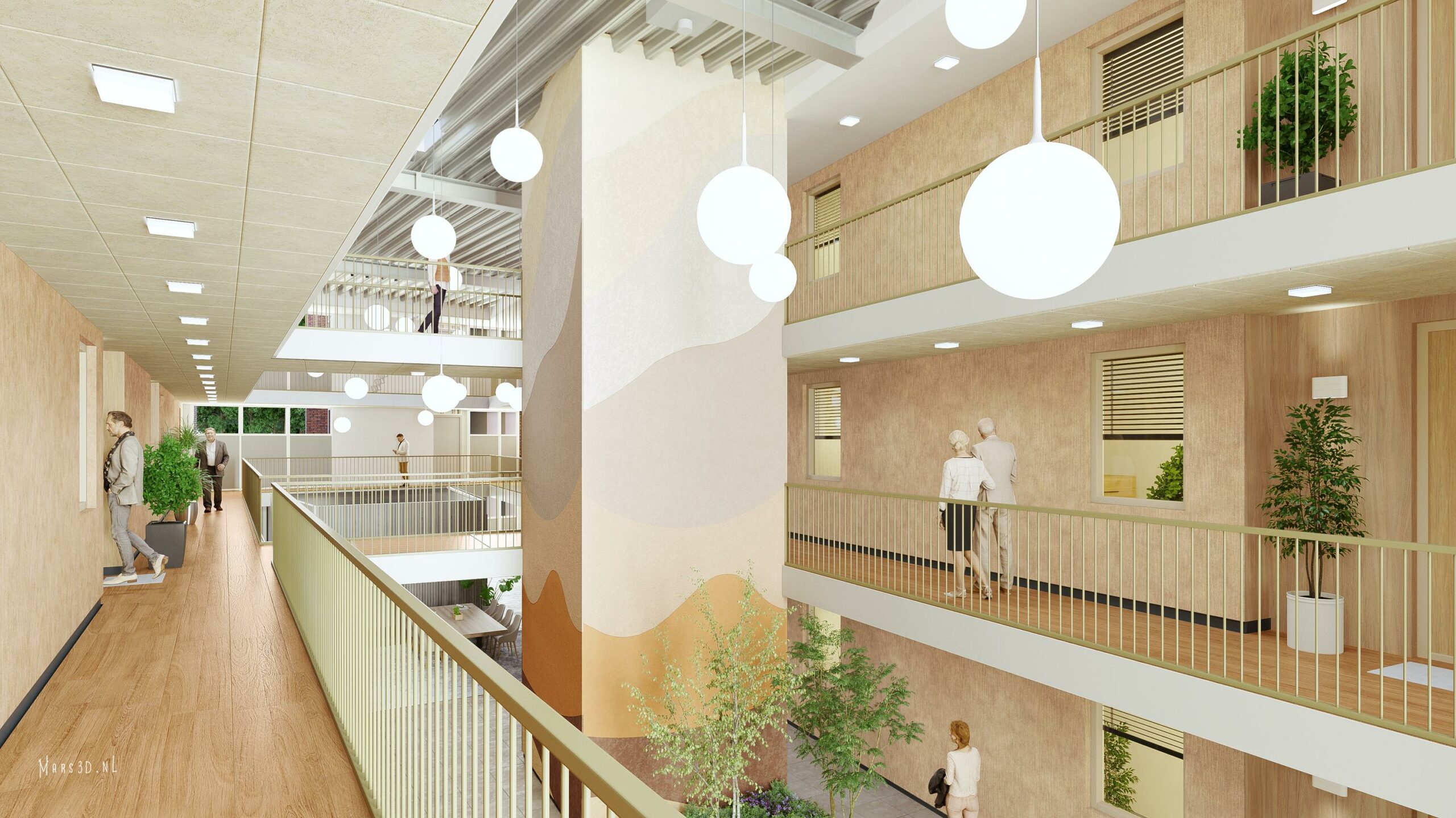 De algemene ruimtes zijn ruim, licht opgezet en afgewerkt met natuurlijke materialen. Bij binnenkomst is het atrium een echte eyecatcher. U heeft hier overzicht over de verdiepingen en de galerijen die via loopbruggen met elkaar verbonden zijn. Op de begane grond staat een grote leestafel die gebruikt kan worden als ontmoetingsplek.