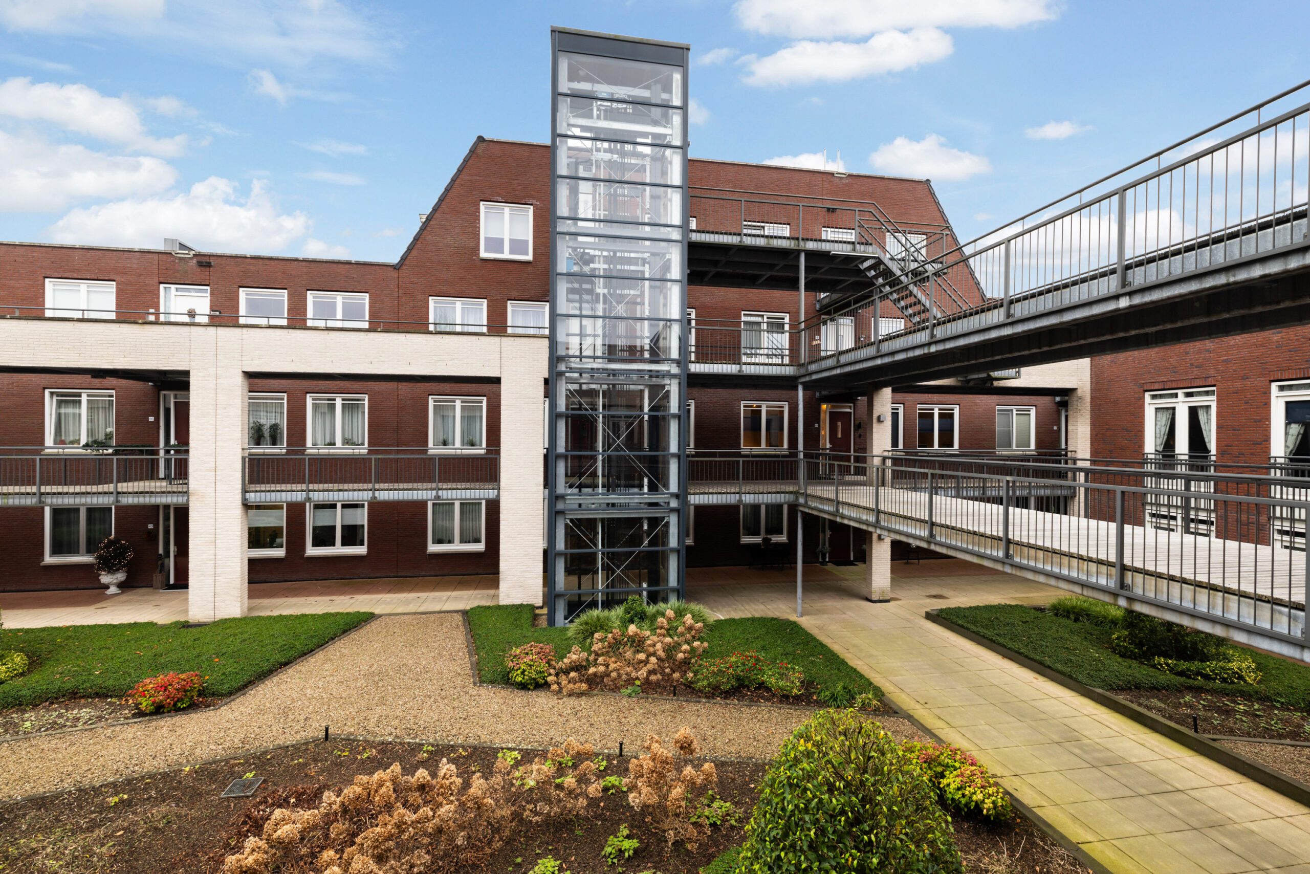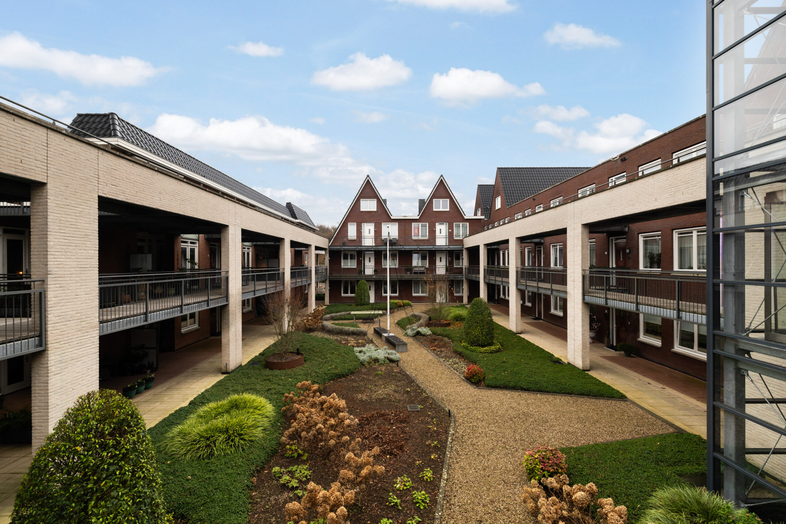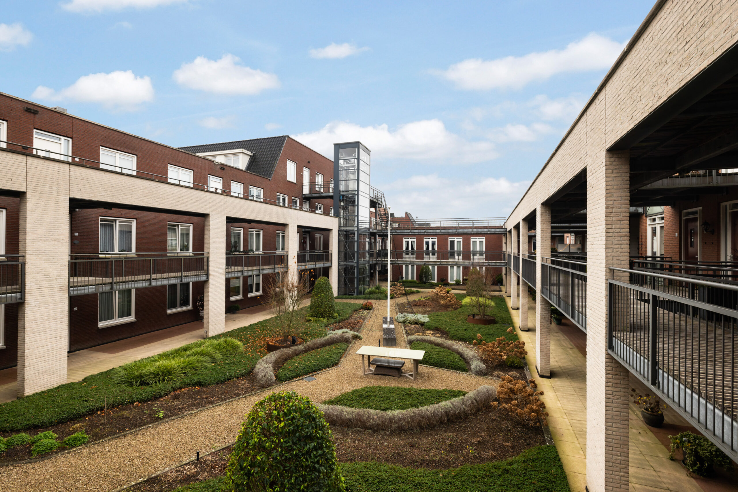 De blikvanger van het complex is de mooie binnentuin. Een prachtig aangelegde en goed onderhouden gemeenschappelijke tuin, voorzien van royale borders met een diversiteit aan beplanting en met ruime looppaden met grind. Een fijne ontmoetingsplaats voor alle bewoners van het complex!