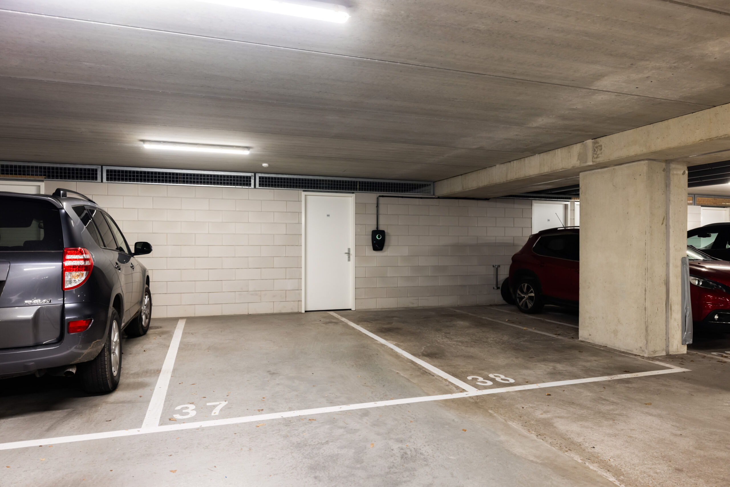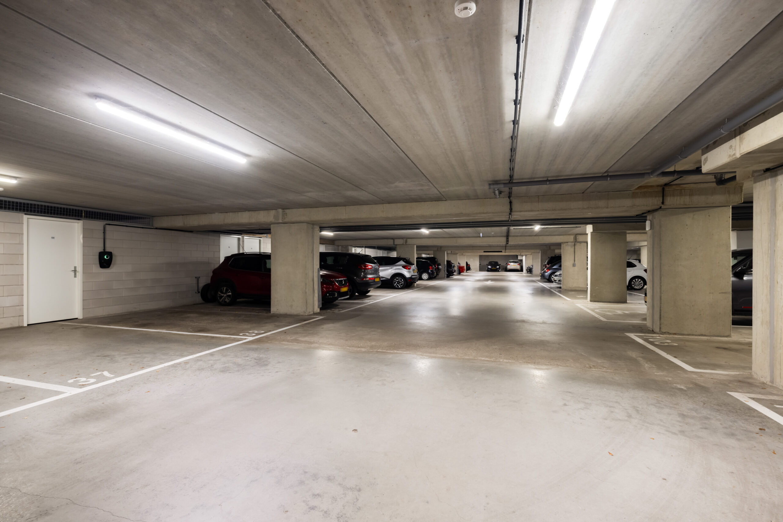 Via zowel het trappenhuis als de lift bereikt u de ondergelegen parkeerkelder met in de directe nabijheid van de lift de twee parkeerplaatsen en de aangrenzende berging die bij het appartement behoren. Tevens bevindt zich hier ook het oplaadpunt voor de elektrische auto.