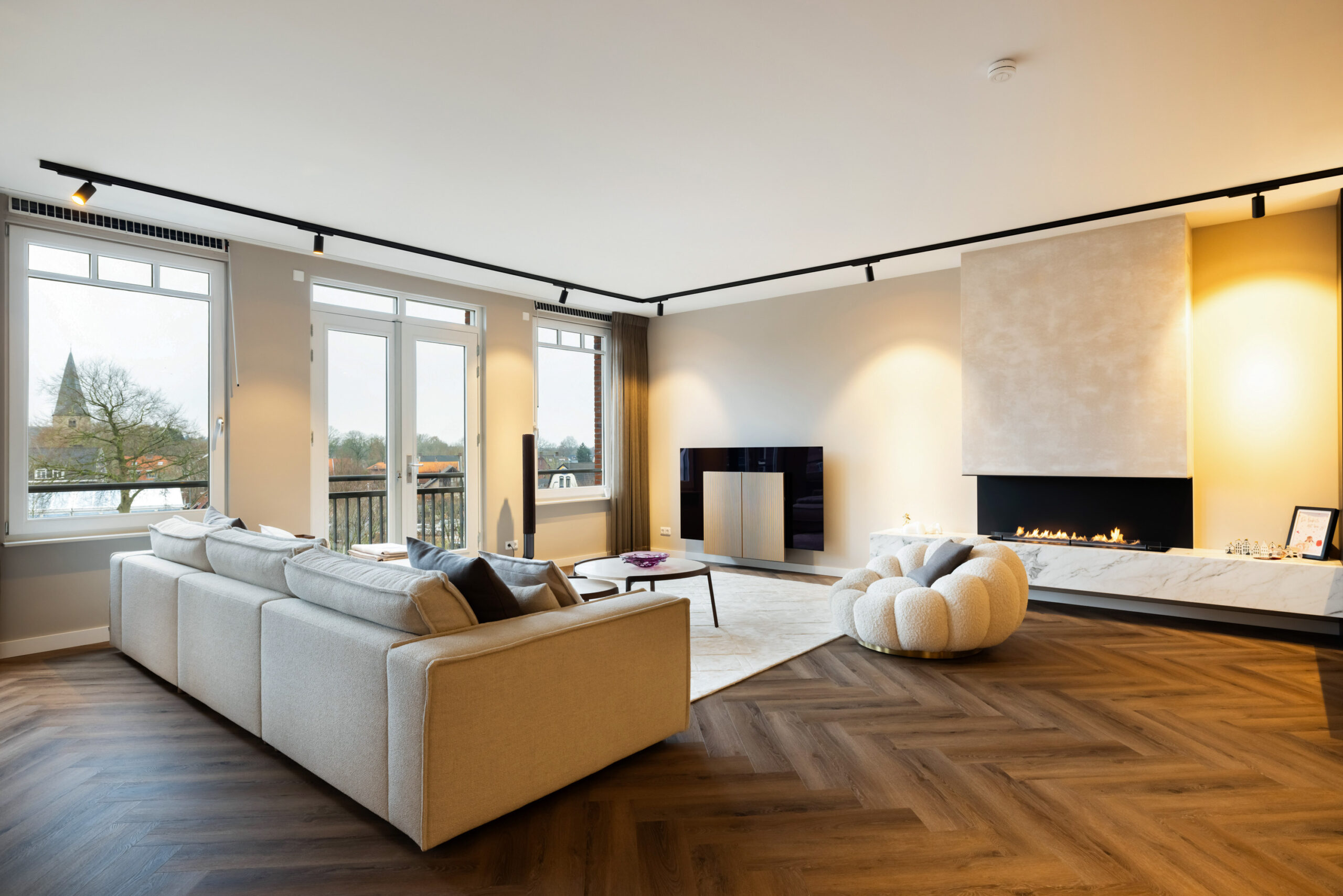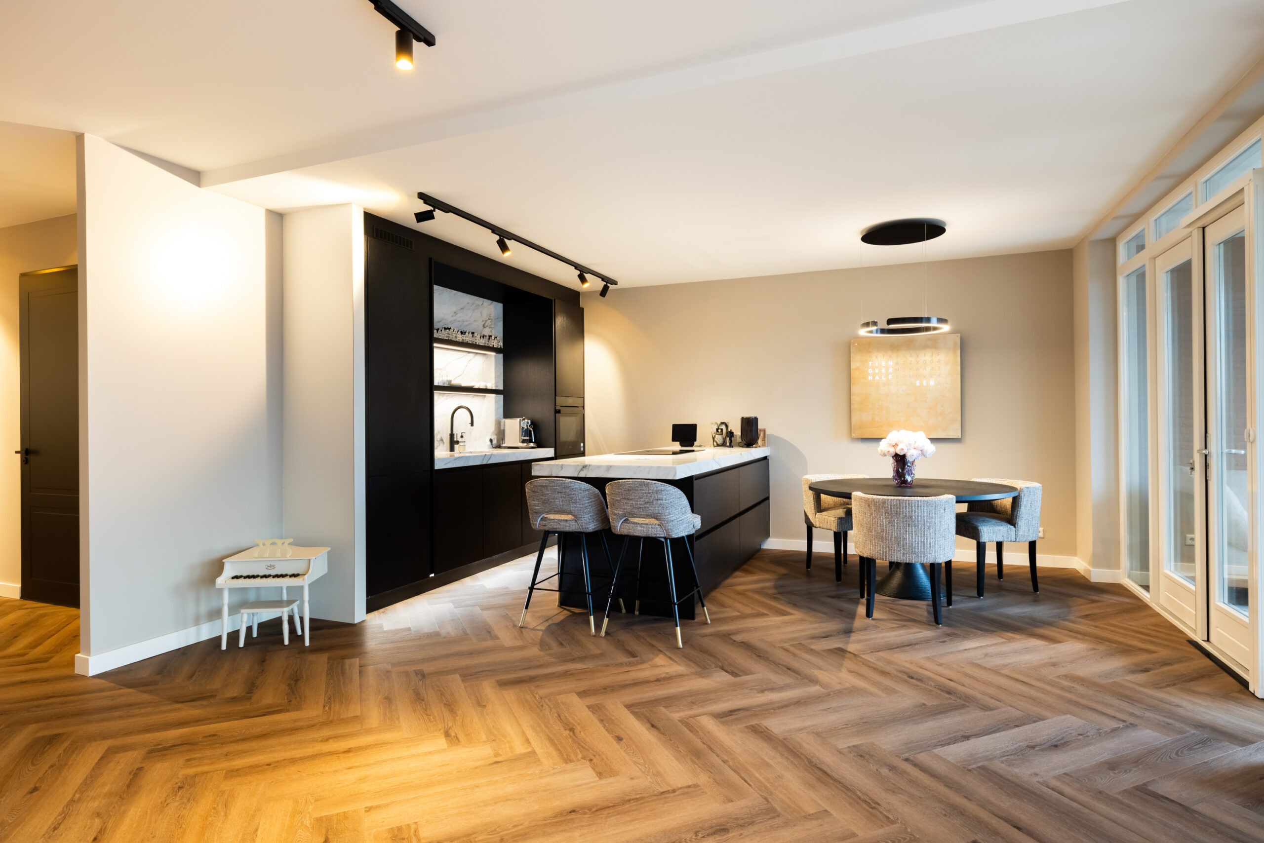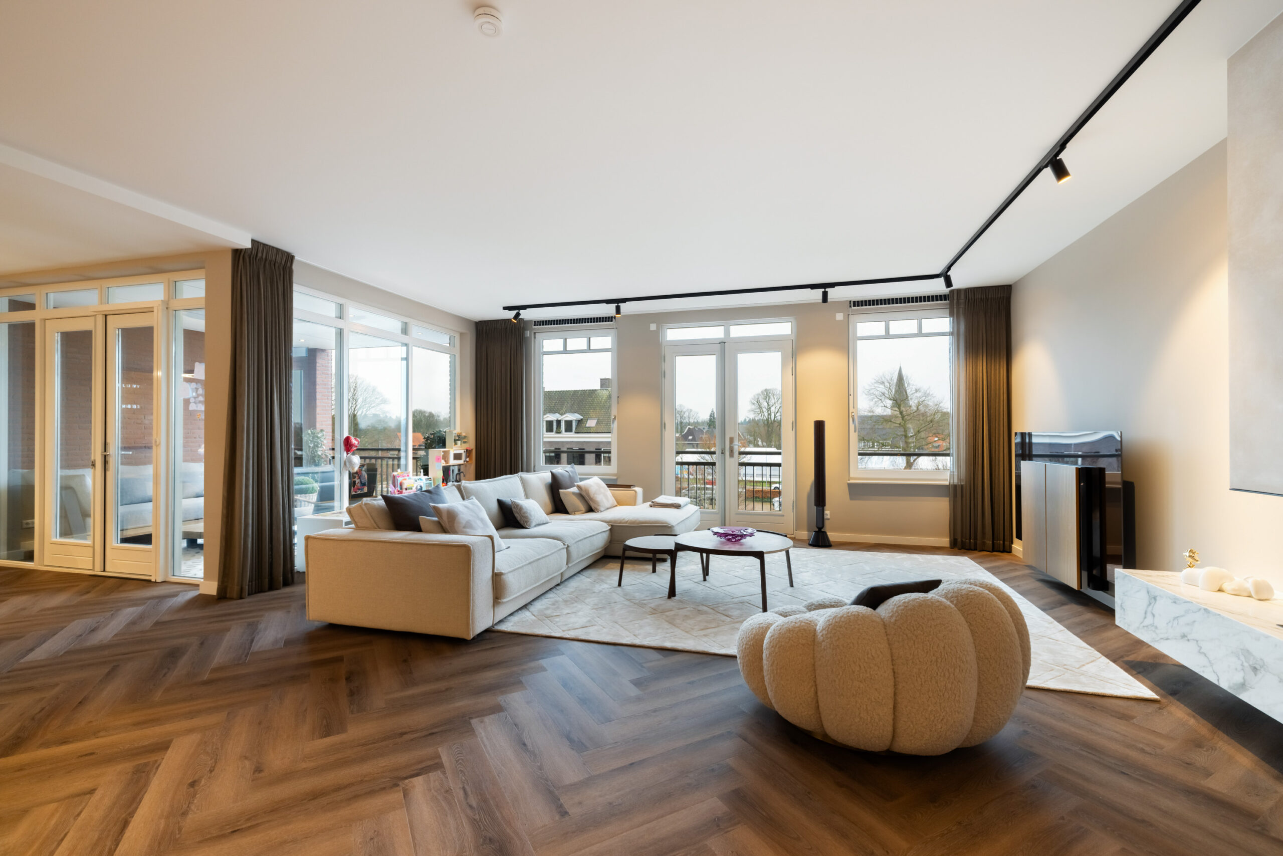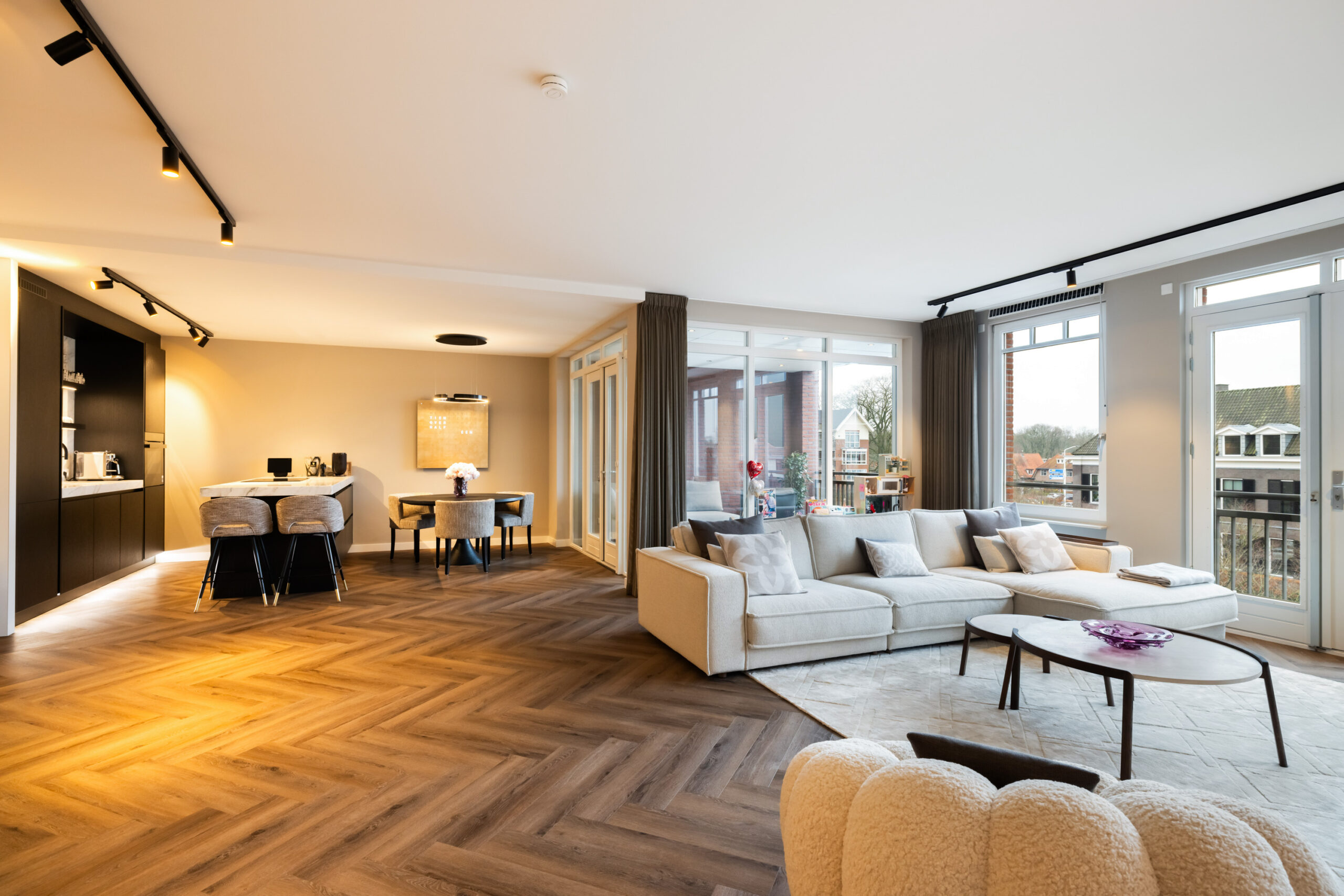 En dan het appartement..... bij binnenkomst ervaart u direct de ruimte, sfeer en luxe die dit appartement uitademt. Alle ruimtes zijn voorzien van strakke plafond-, wand- en vloerafwerking en de aanwezig spotverlichting zorgt voor een warme belichting in het hele appartement. Het aanwezige domoticasysteem maakt dat het appartement helemaal voldoet aan het hedendaagse wooncomfort. De mooie visgraat pvc-vloer geeft een warme uitstraling en de open doorgang van de entree naar de living zorgt voor een extra ruimtelijk effect. Daarnaast komt er in de living en keuken voldoende natuurlijk lichtinval binnen door de grote raampartijen. Hierdoor ontstaat er een directe verbinding met buiten en geniet u tevens van een fantastisch uitzicht!