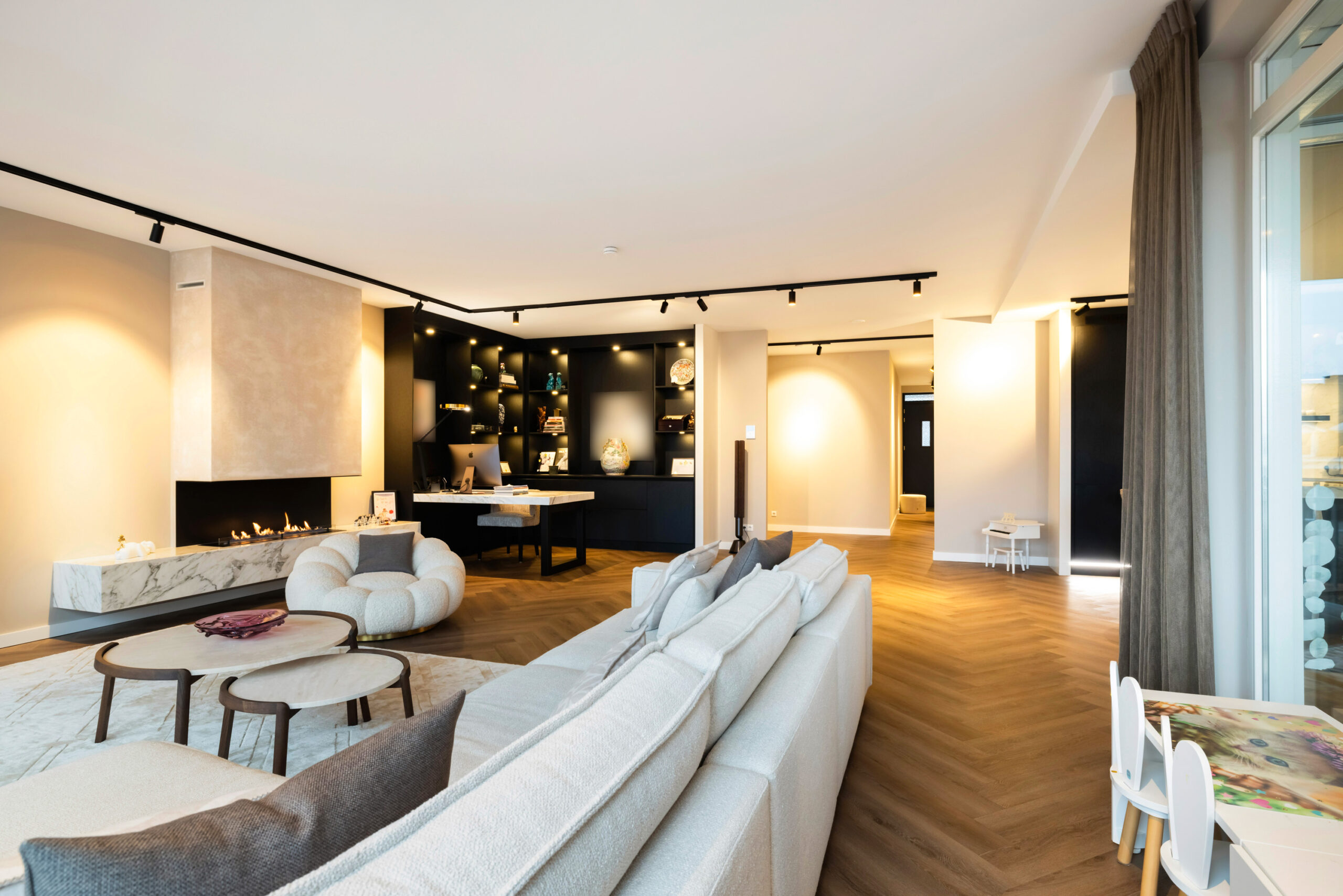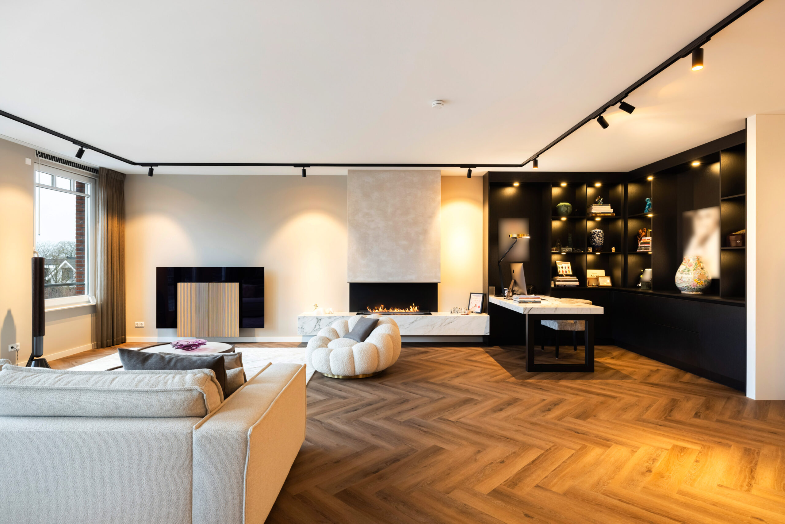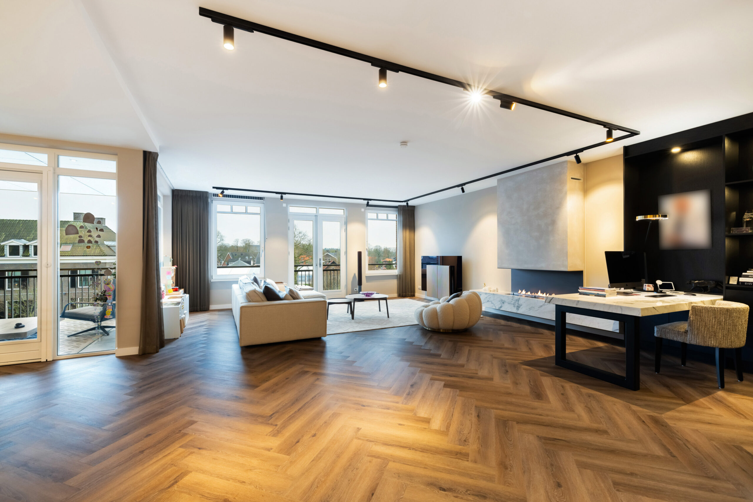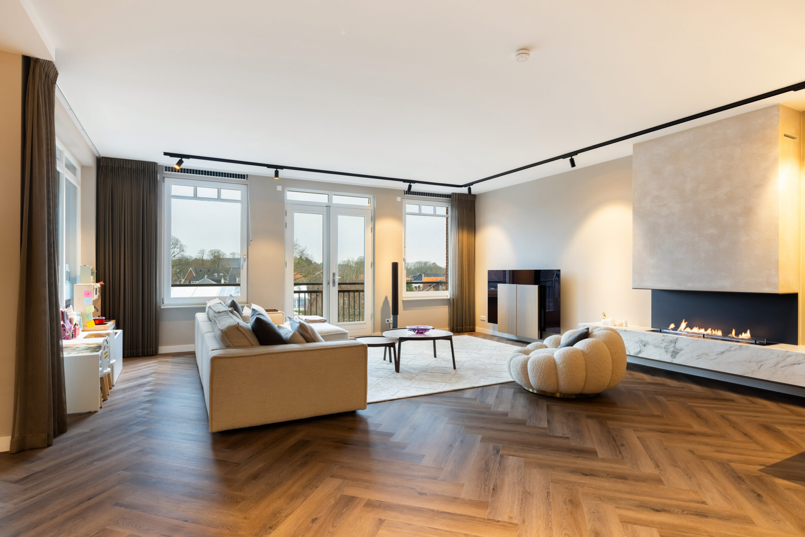 Naast de visgraat pvc-vloer, de mooie zwarte kastenwand en de grote raampartijen bevindt zich in de royale living een schitterende sfeerhaard met schouw; een échte eye-catcher!