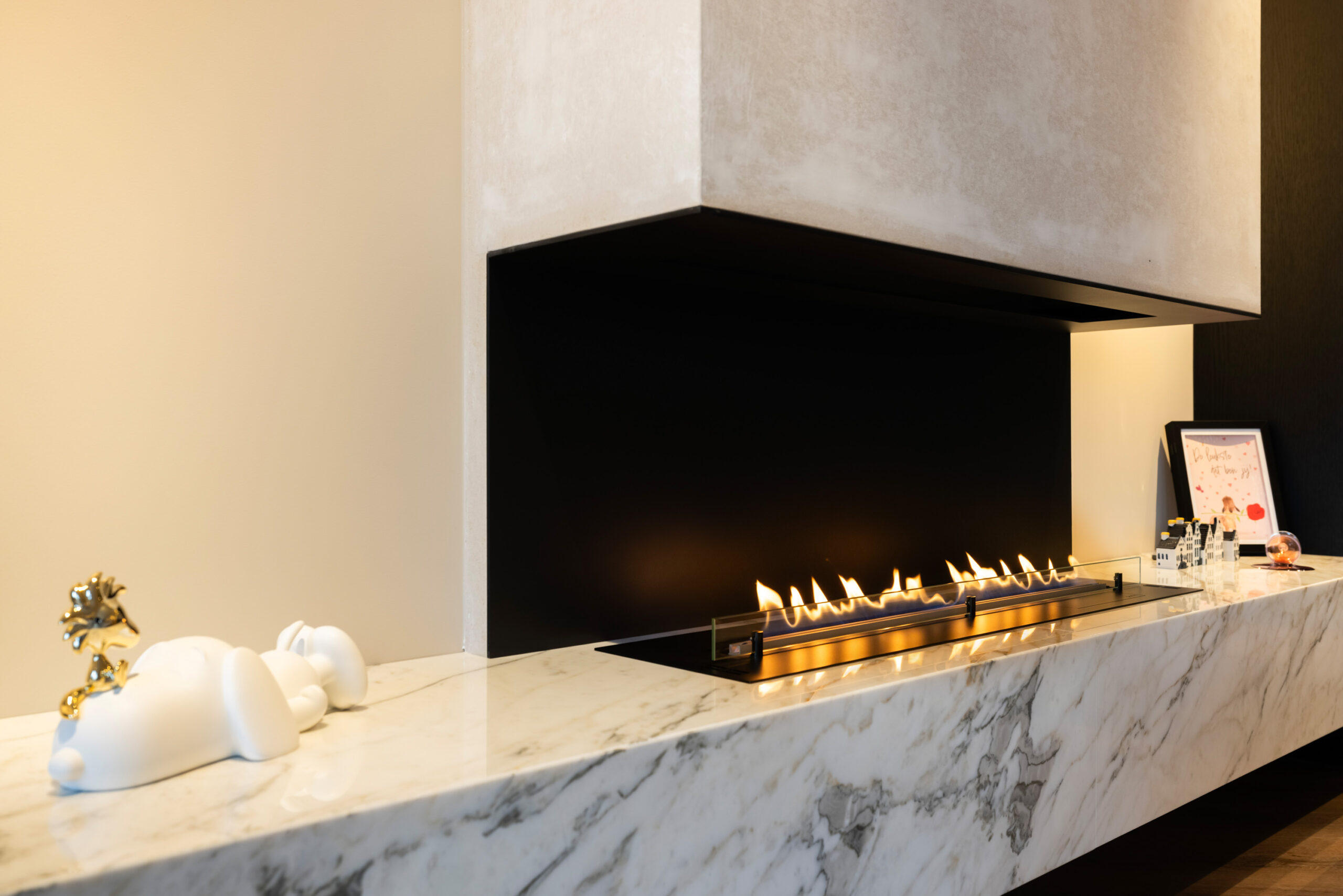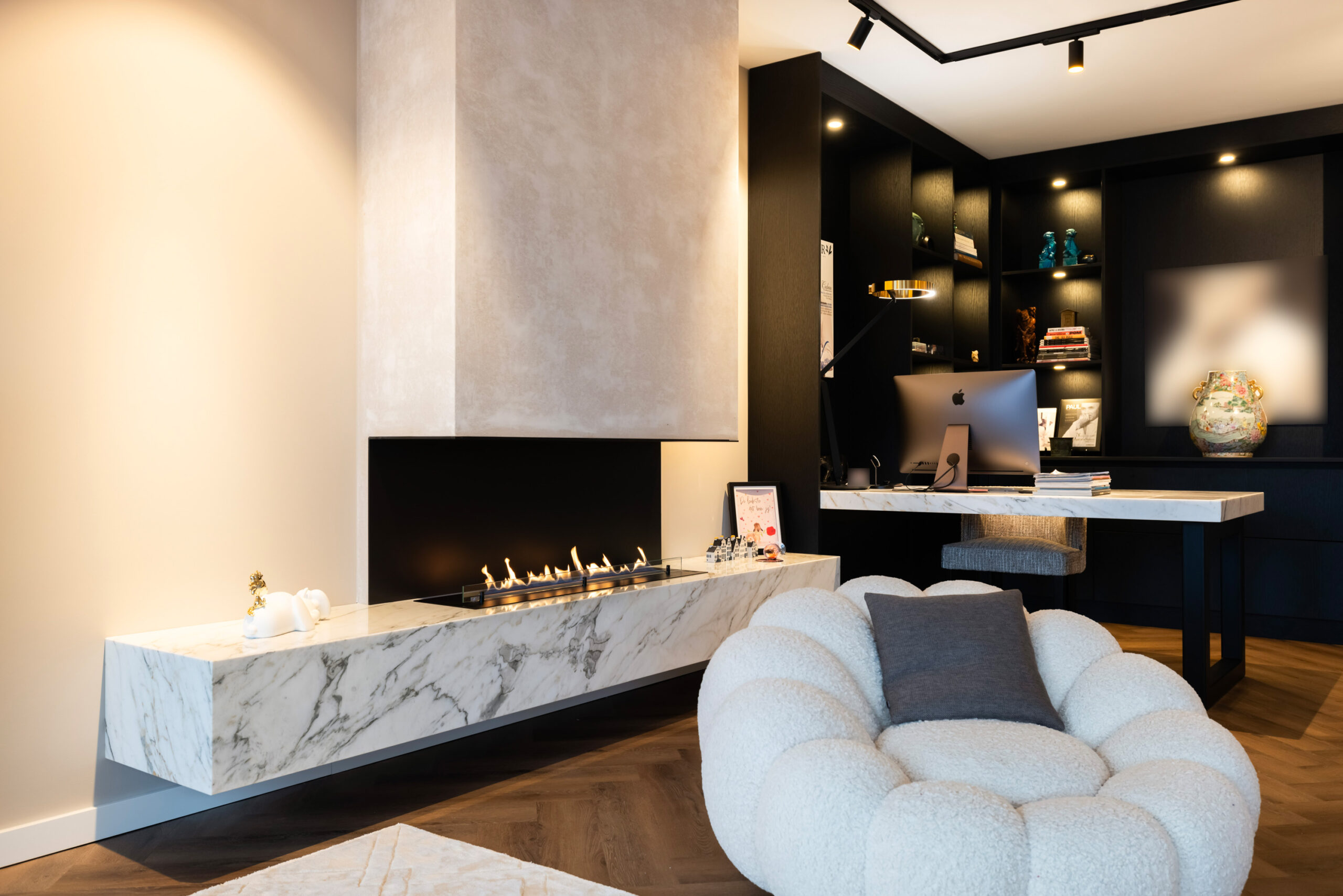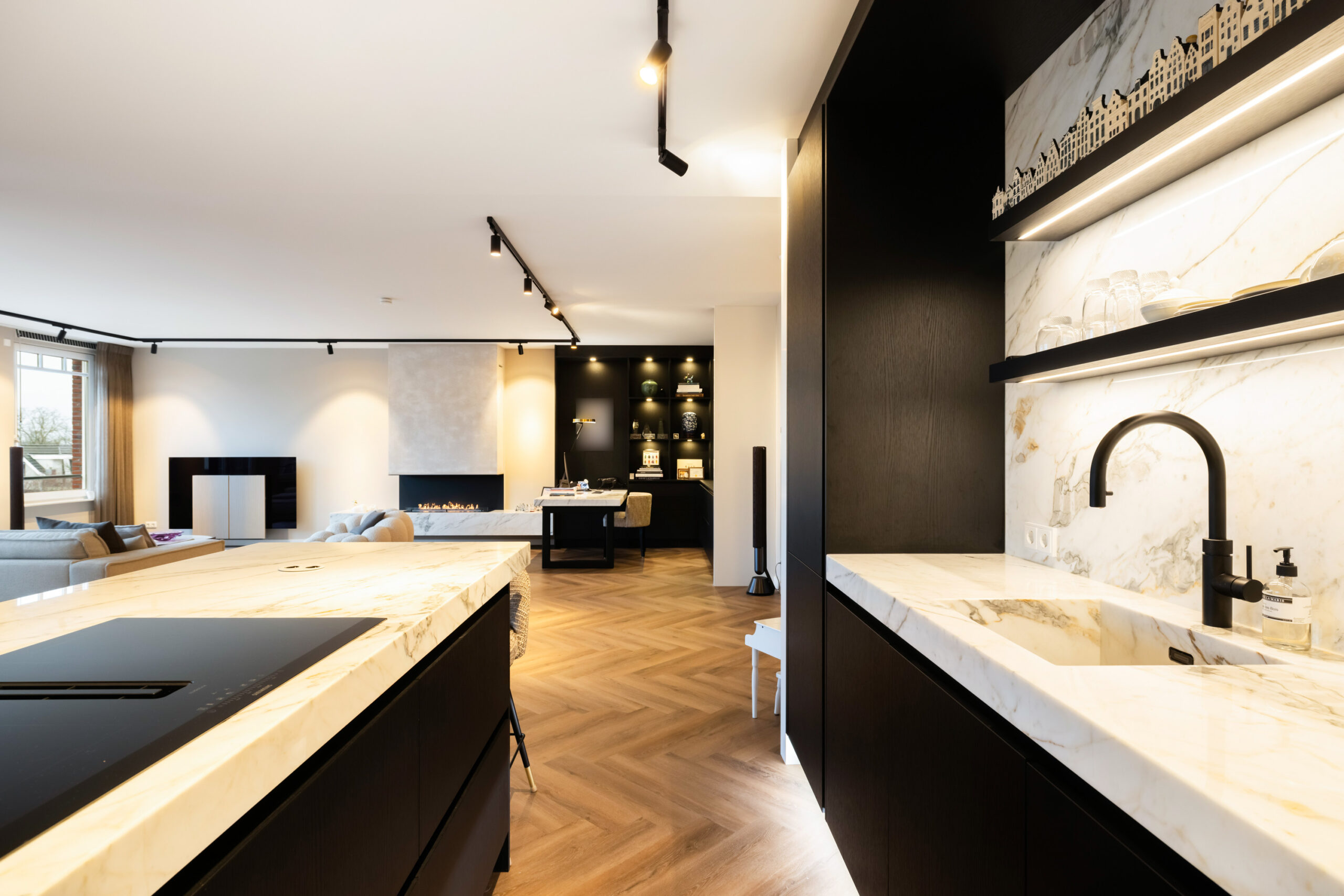 Naast de visgraat pvc-vloer, de mooie zwarte kastenwand en de grote raampartijen bevindt zich in de royale living een schitterende sfeerhaard met schouw; een échte eye-catcher!