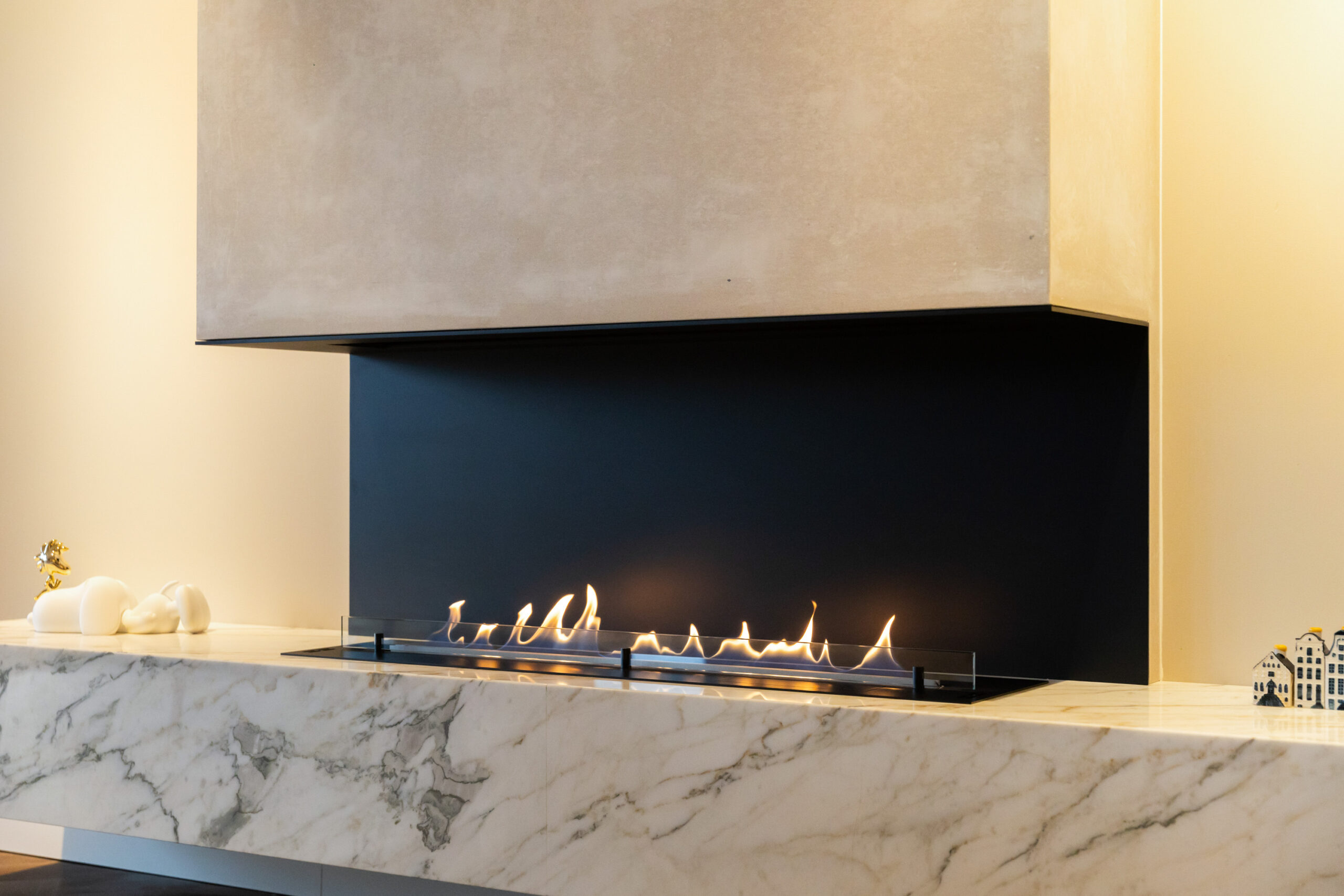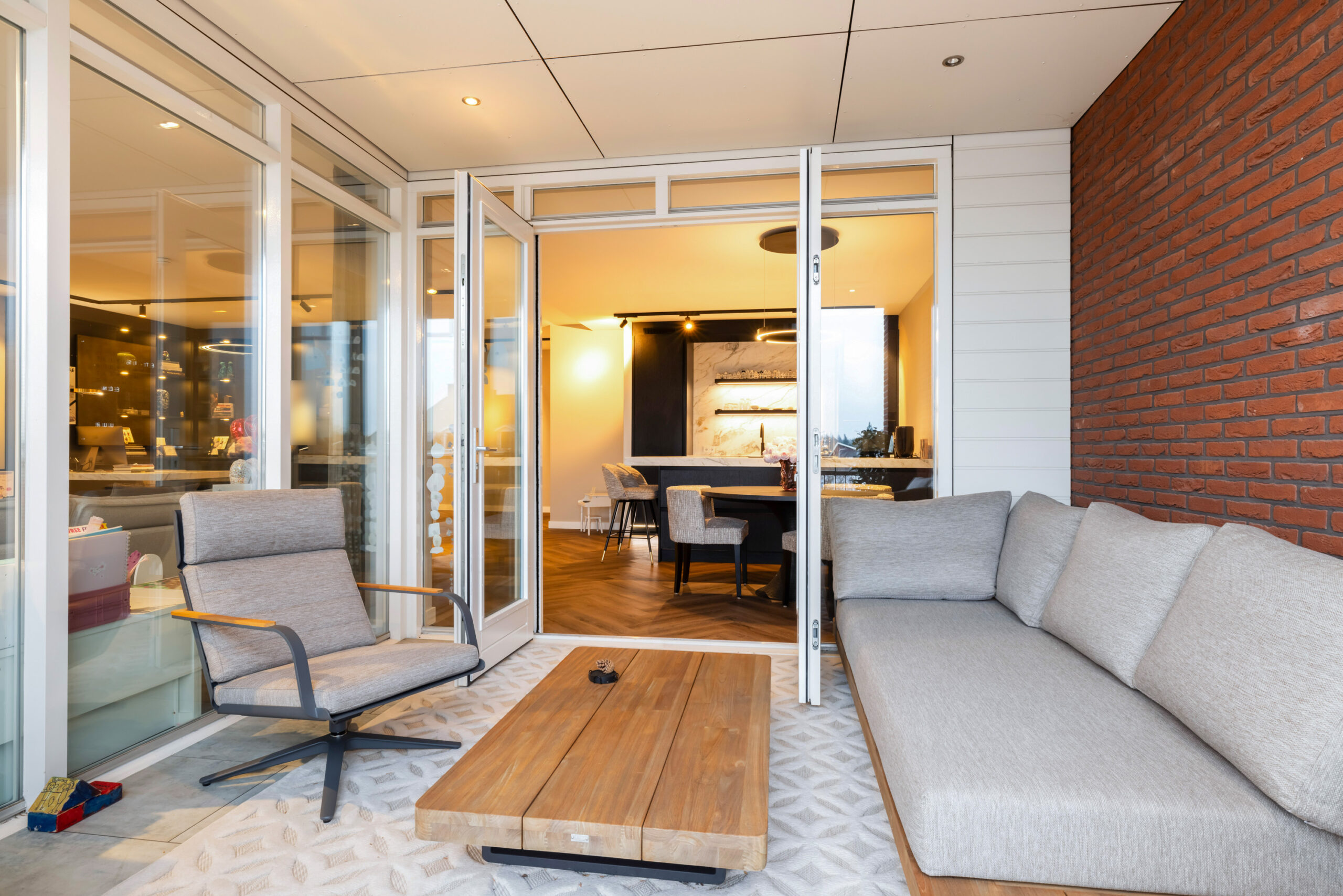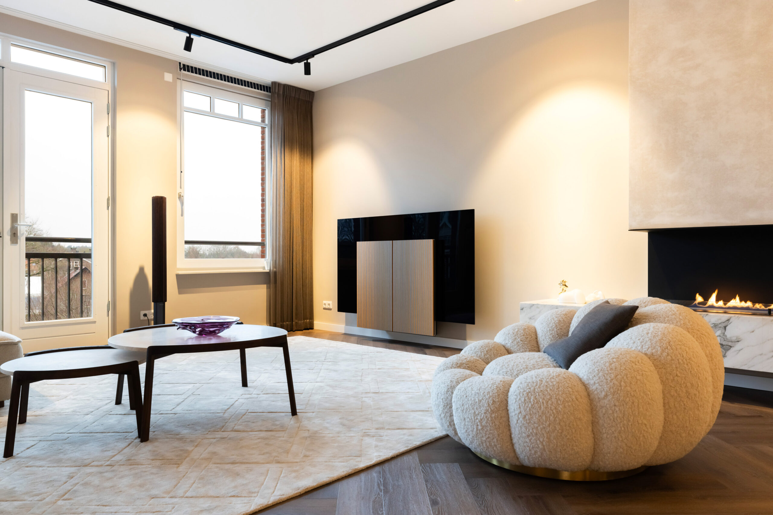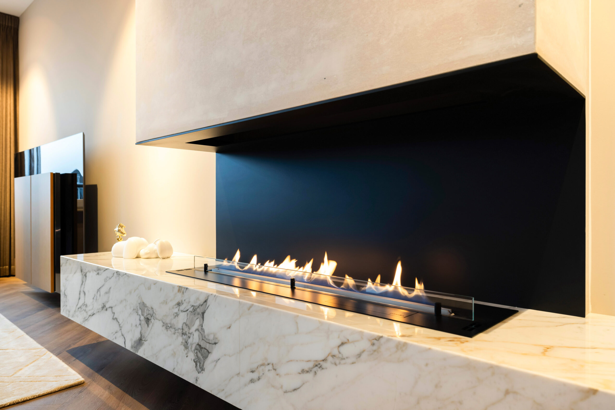 Naast de visgraat pvc-vloer, de mooie zwarte kastenwand en de grote raampartijen bevindt zich in de royale living een schitterende sfeerhaard met schouw; een échte eye-catcher!
