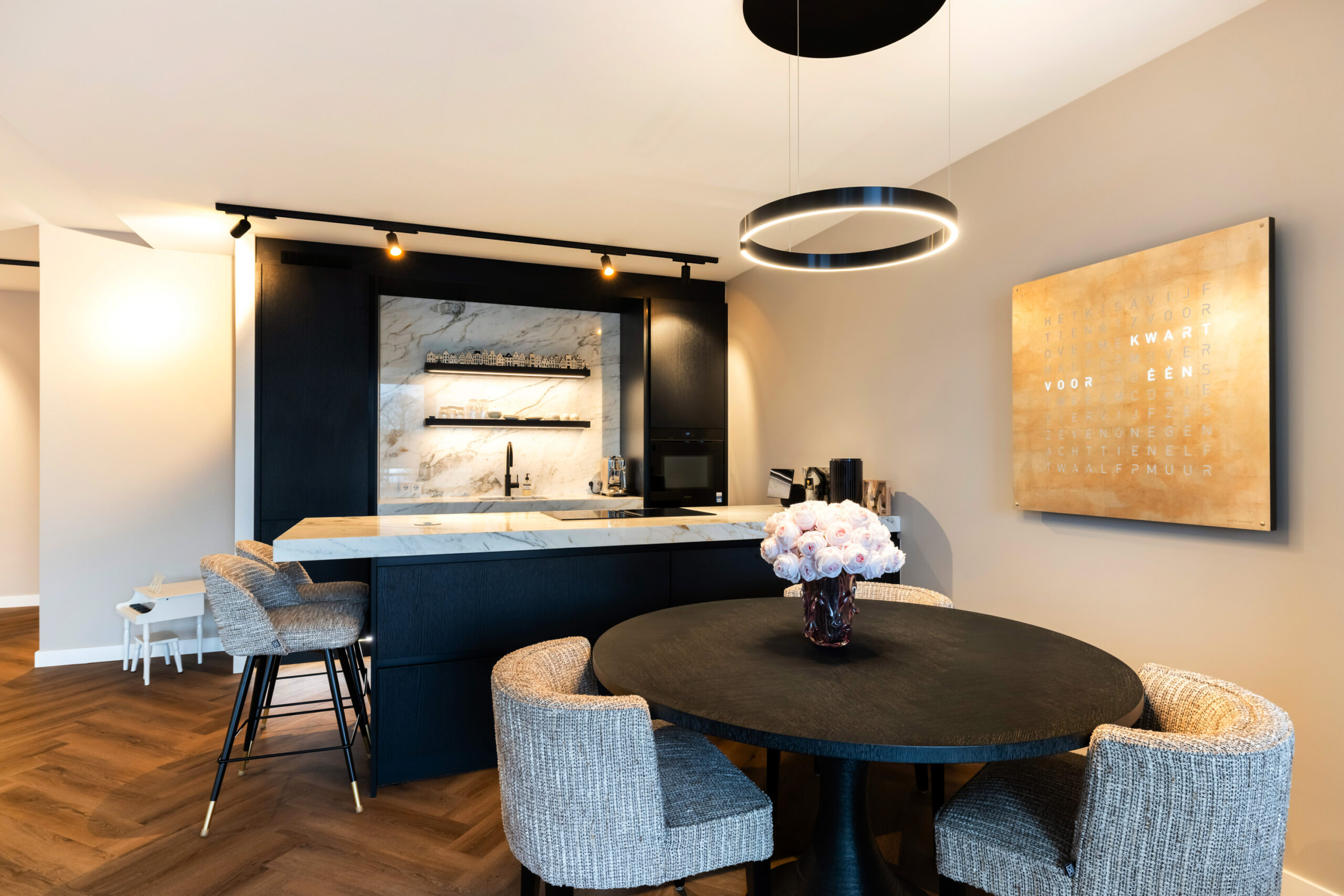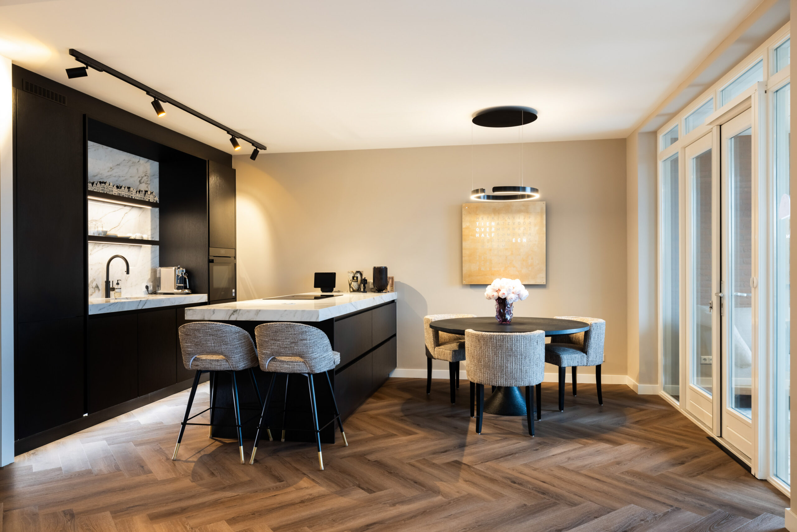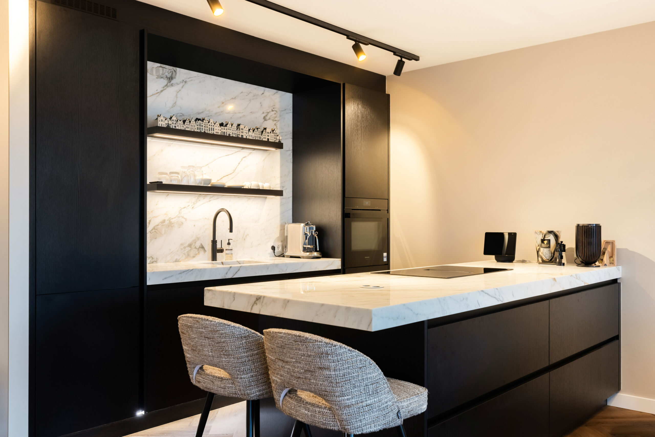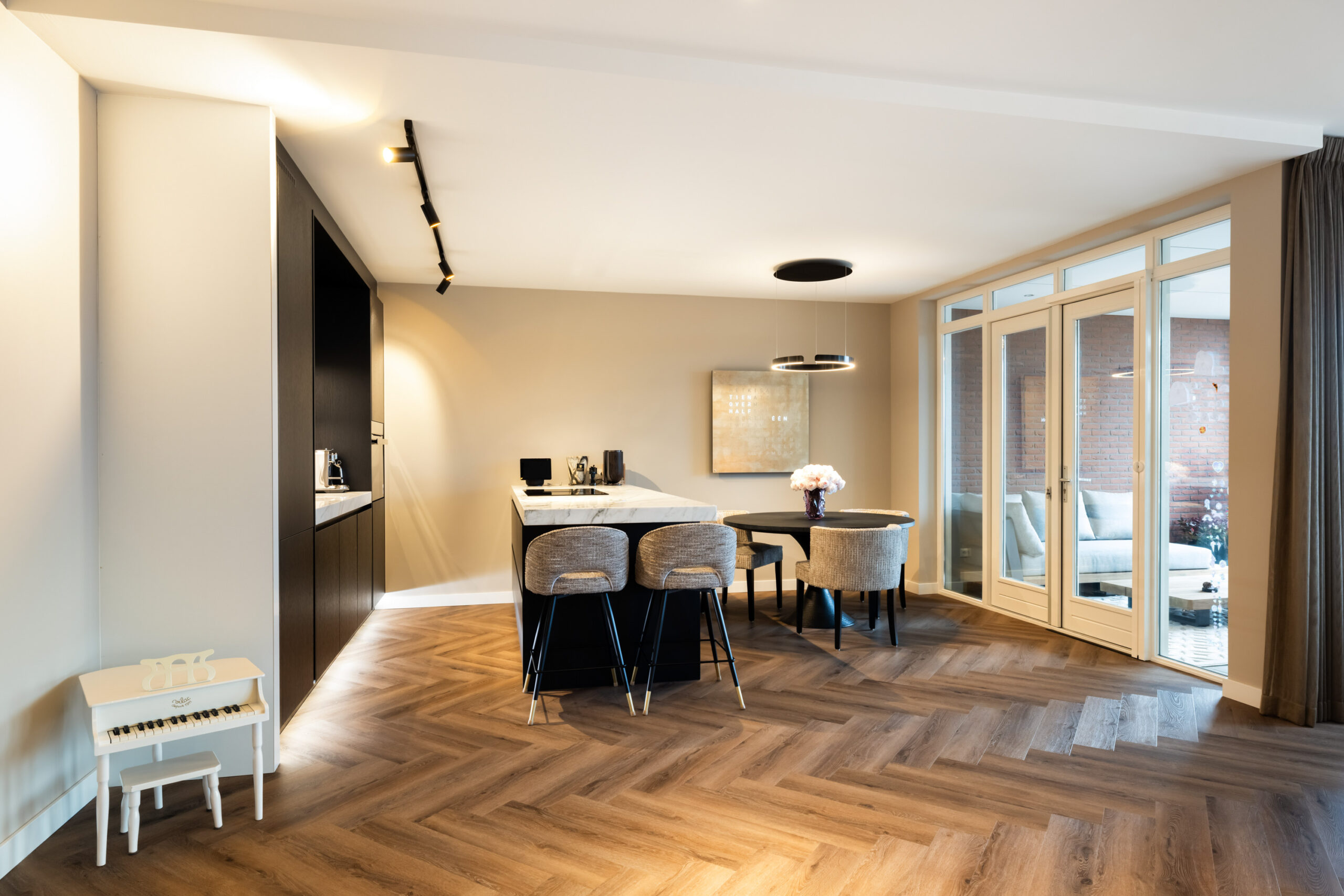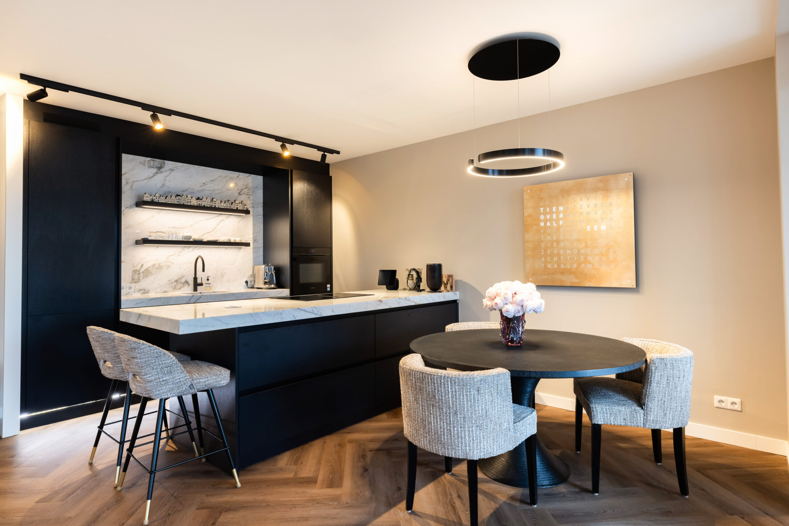 De prachtige keuken uit 2023 welke is voorzien van zwarte kastruimte en een licht composietblad geeft een mooie luxe uitstraling en beschikt tevens over alle gewenste inbouwapparatuur (waaronder een quooker) en het kookeiland is voorzien van een geïntegreerde afzuiginstallatie.