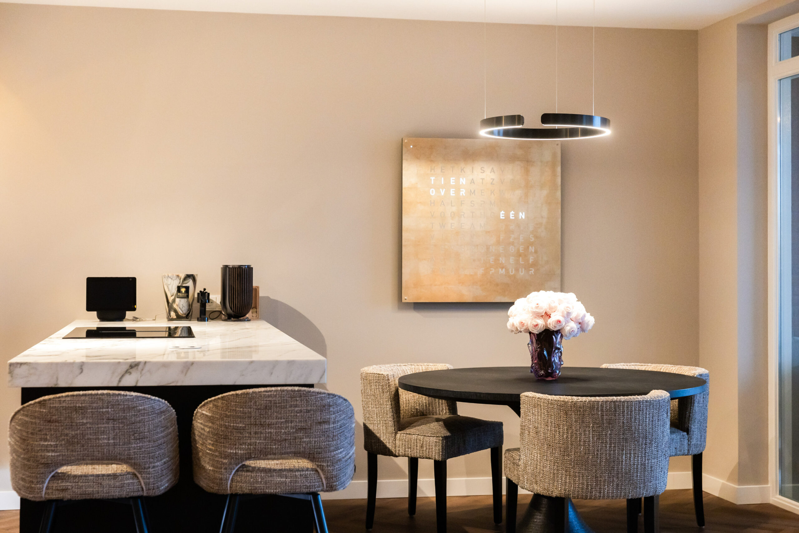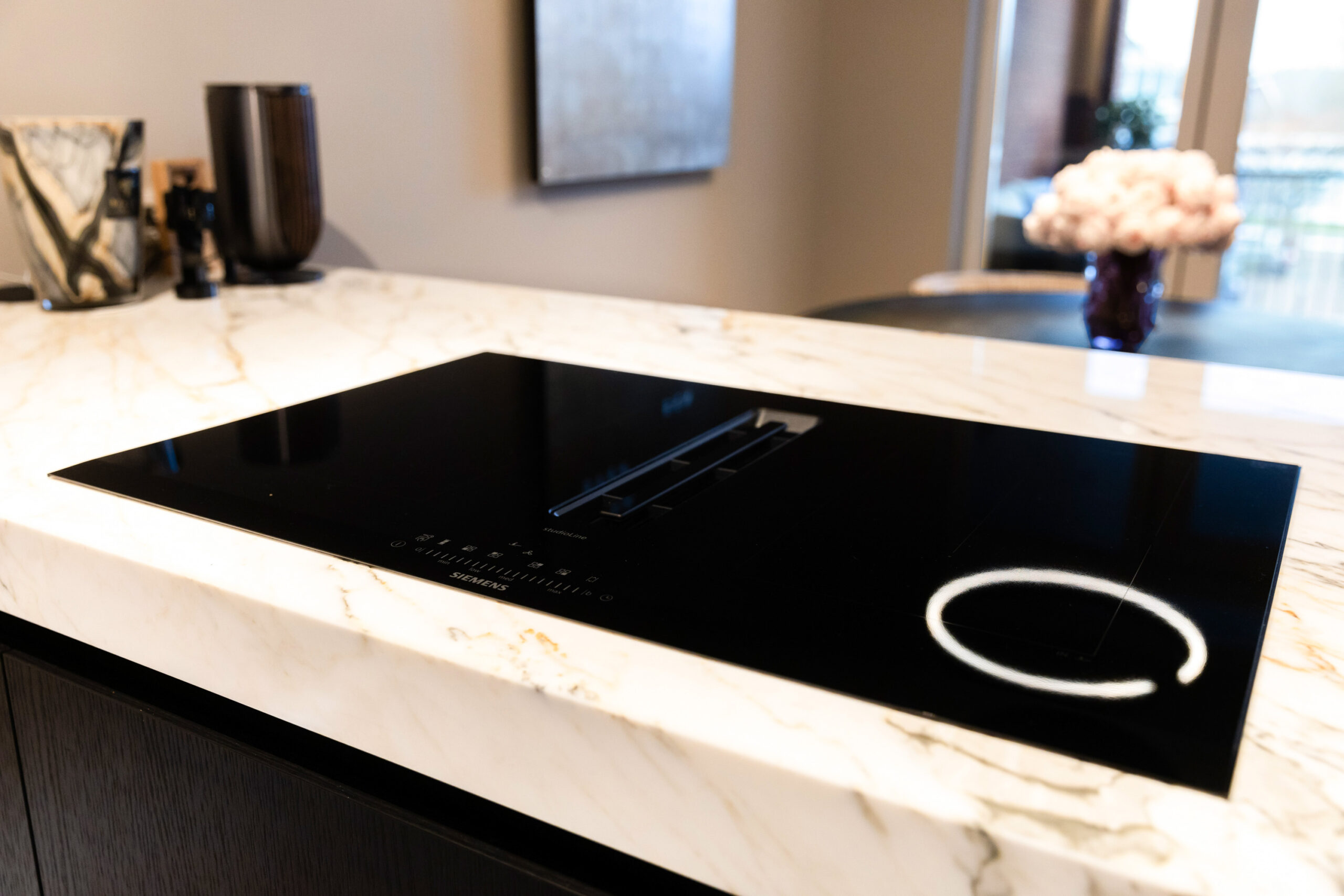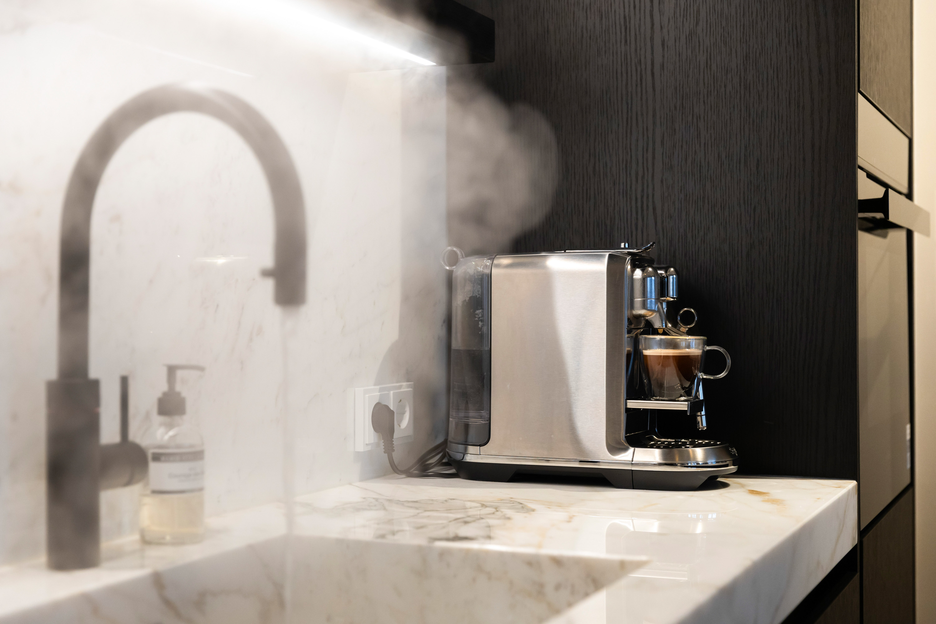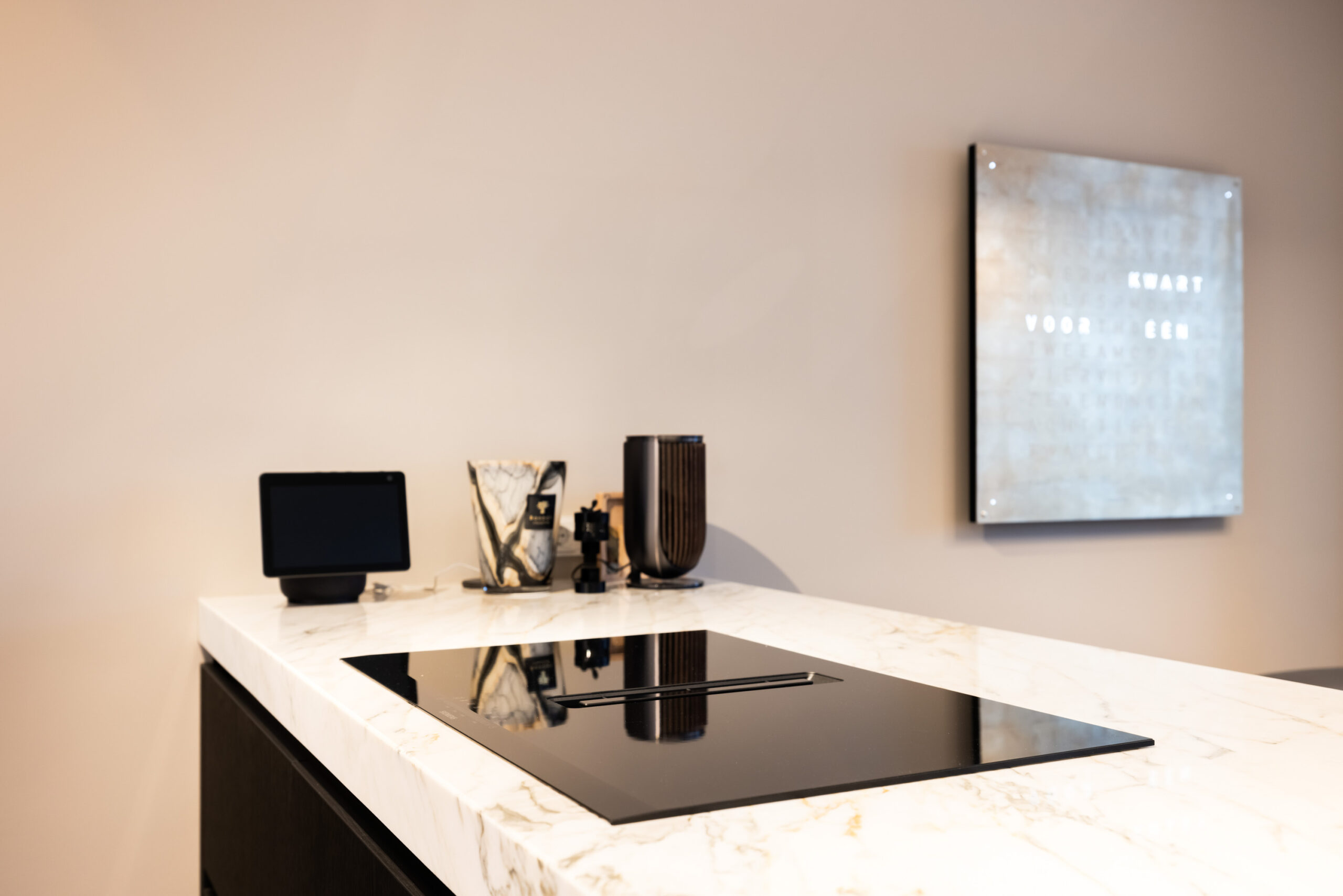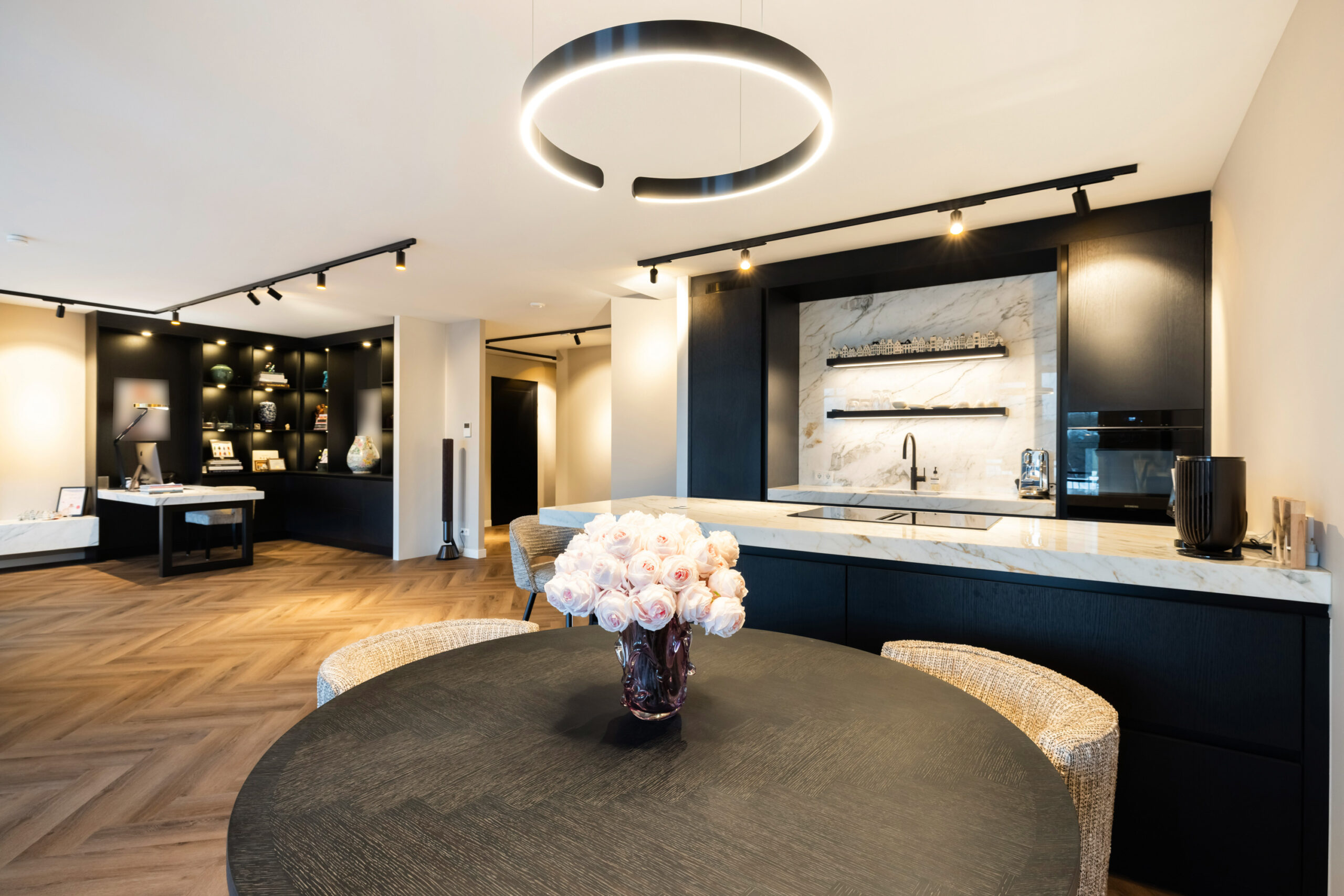 De prachtige keuken uit 2023 welke is voorzien van zwarte kastruimte en een licht composietblad geeft een mooie luxe uitstraling en beschikt tevens over alle gewenste inbouwapparatuur (waaronder een quooker) en het kookeiland is voorzien van een geïntegreerde afzuiginstallatie.
