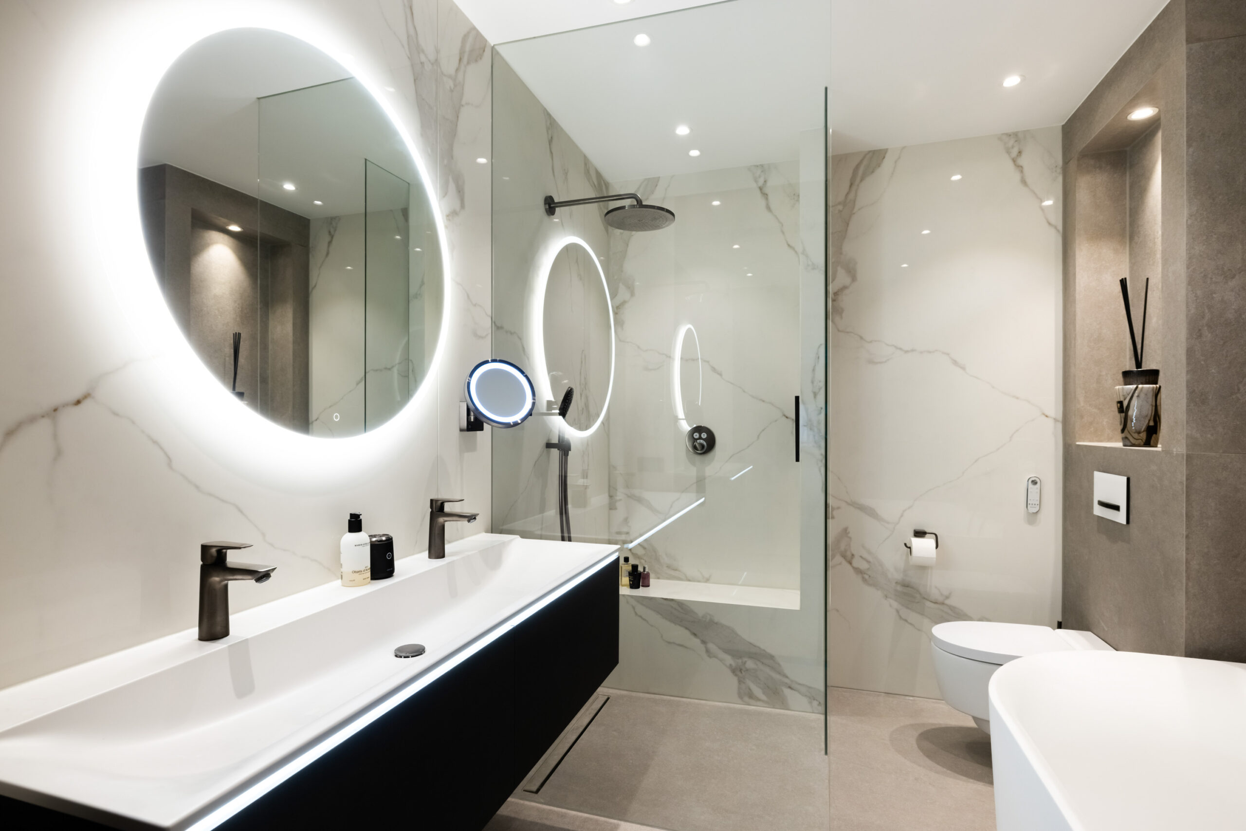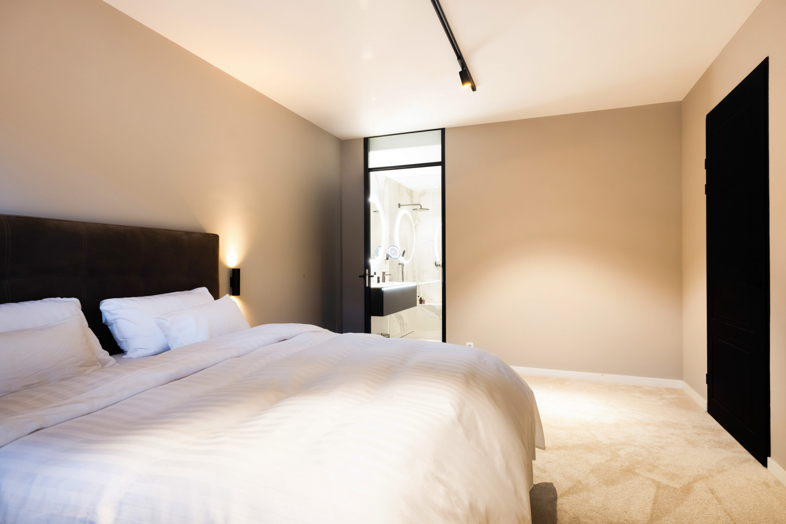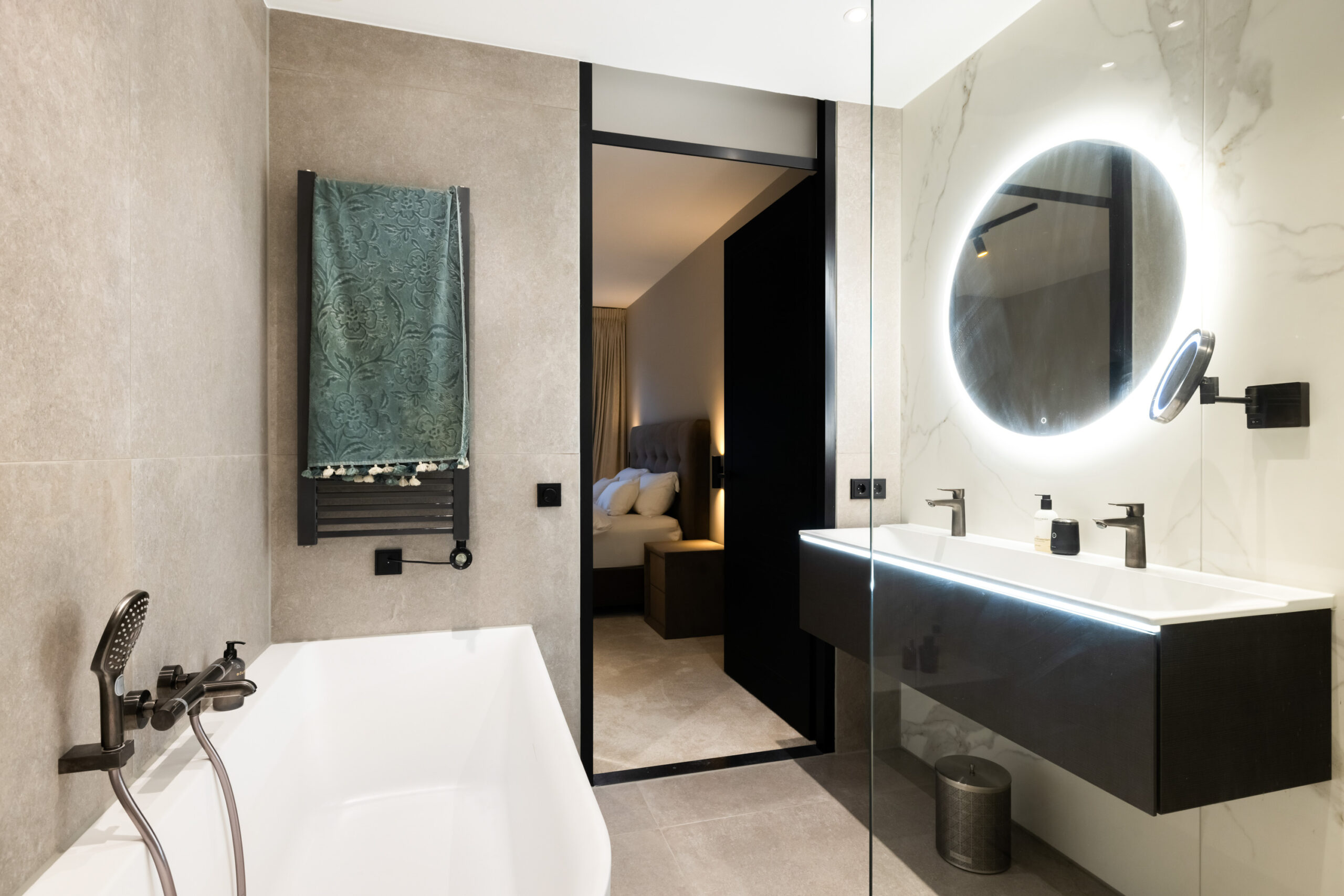 Vanuit de hal krijgt u ook toegang tot de Master Bedroom met eigen luxe badkamer welke is voorzien van een ligbad, wastafelmeubel met dubbele kraan, inloopdouche en vrijdragend toilet. Tevens bevindt zich aangrenzend een 2e badkamer met inloopdouche, wastafelmeubel en vrijdragend toilet.