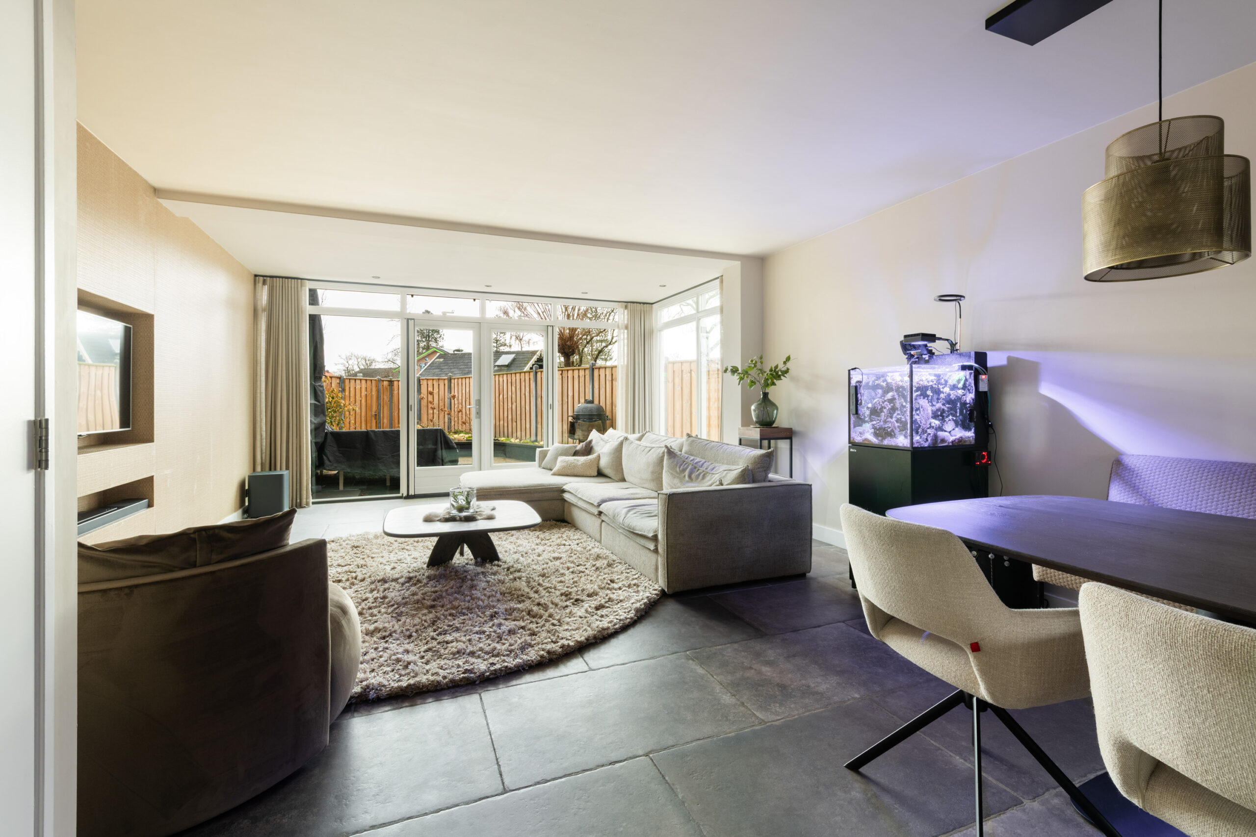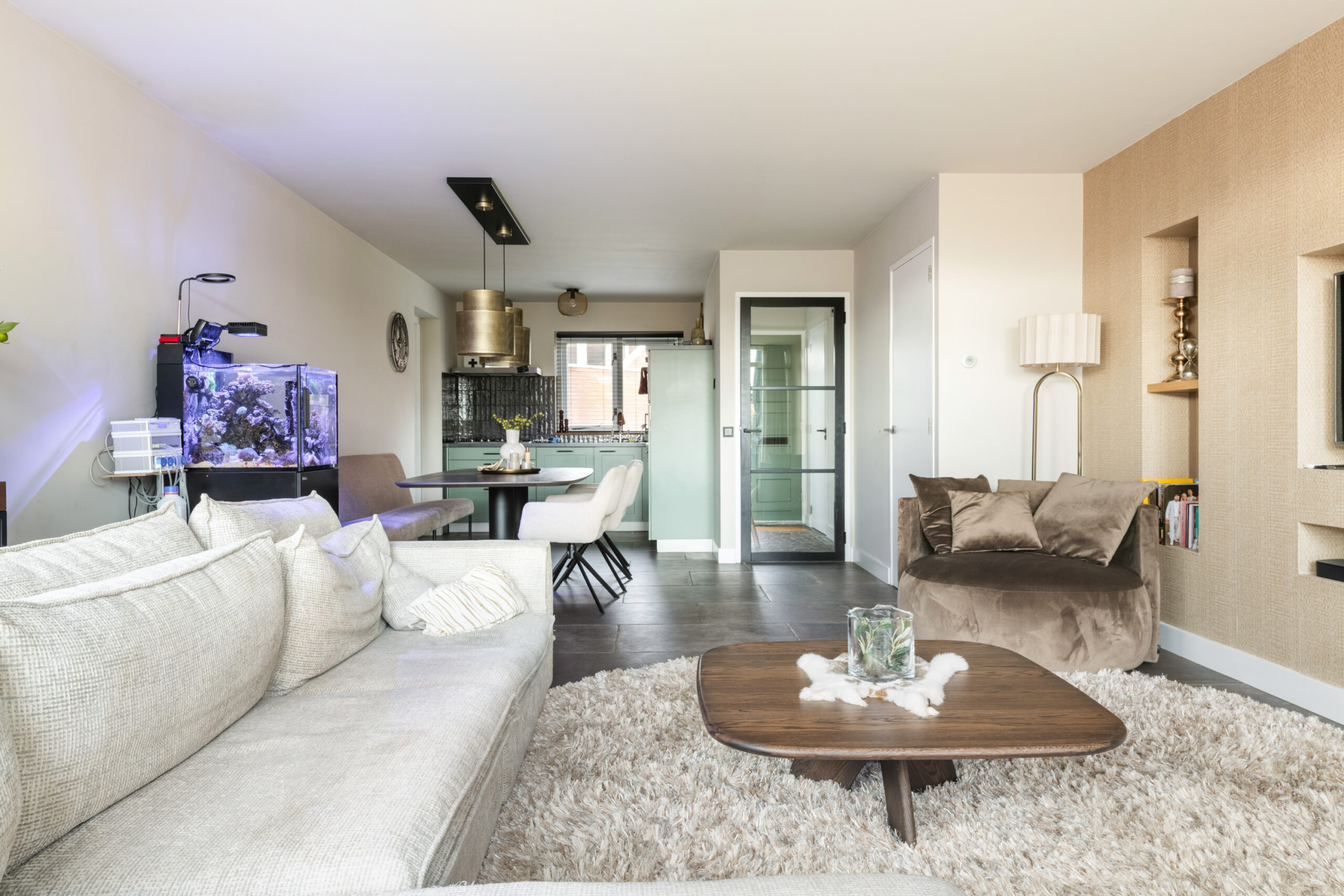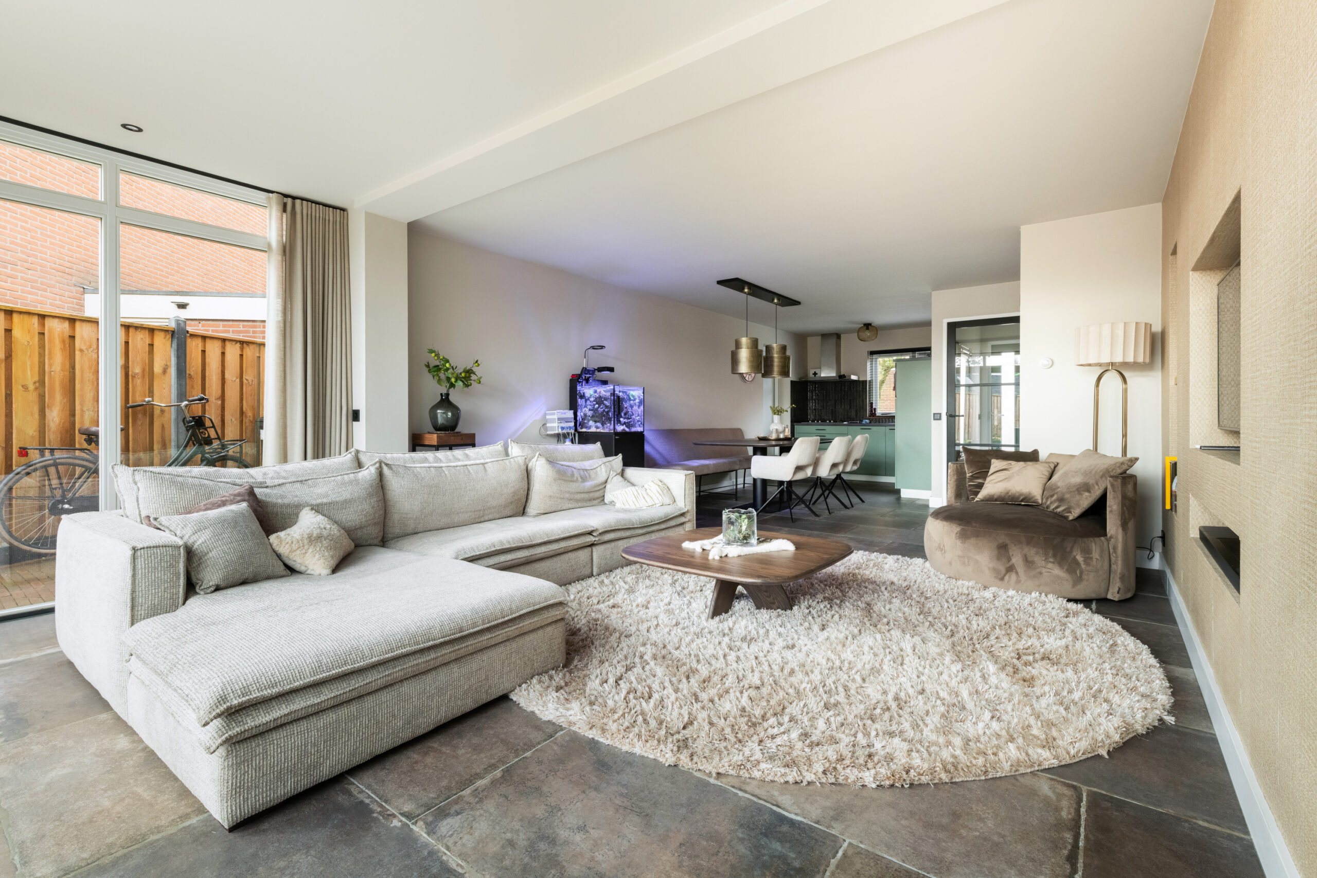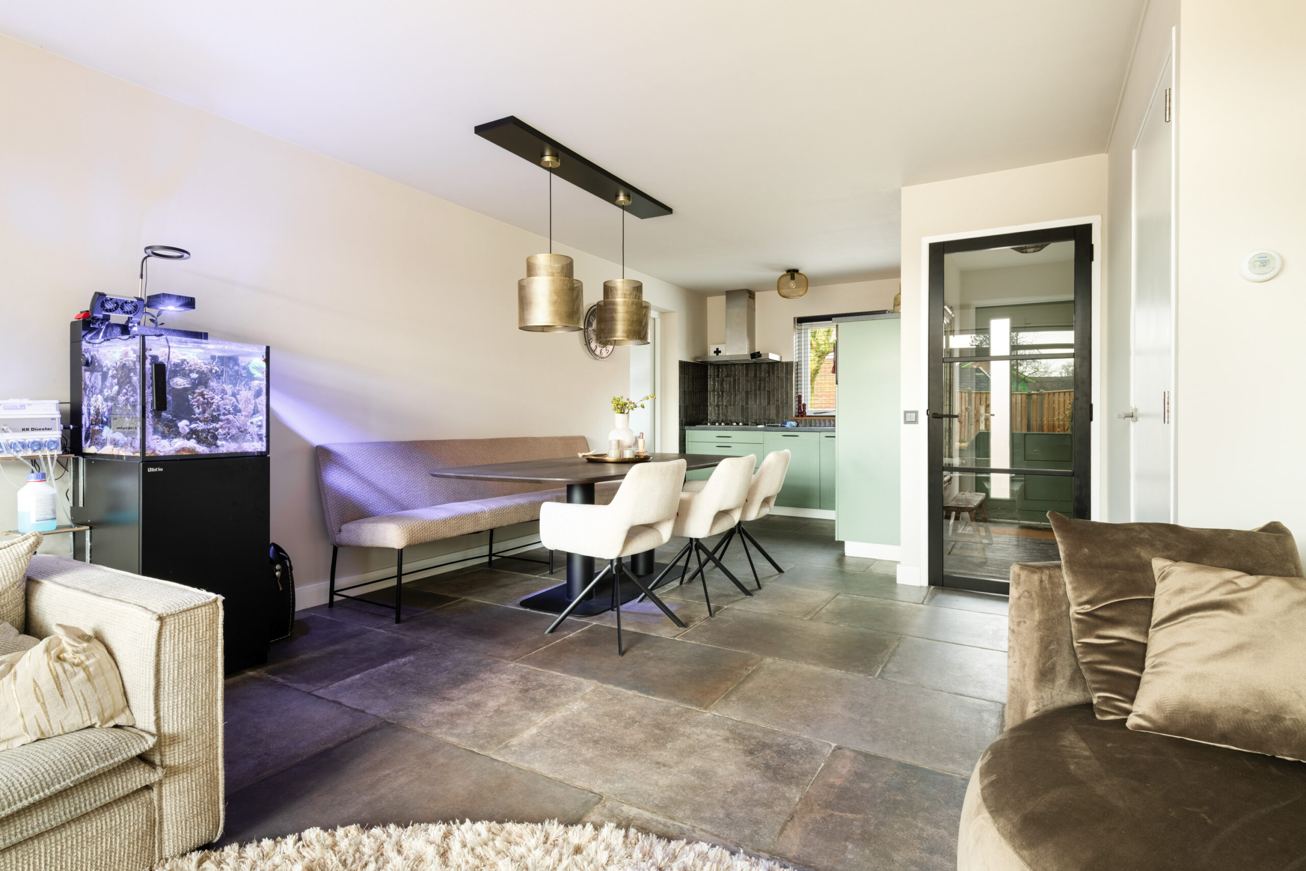 Begane grond: nette entree/hal met mooie stenenvloer, toiletruimte voorzien van toilet en fonteintje, meterkast en trapopgang. Middels glazen deur toegang tot de ruime en lichte tuingerichte woonkamer welke is voorzien van een prachtige tegelvloer met vloerverwarming, strakke wand- en plafondafwerking, vaste kast en openslaande deuren naar de achtertuin. De open keuken bevindt zich aan de voorzijde en is voorzien van de gewenste inbouwapparatuur. Aangrenzend bevindt zich de praktische bijkeuken met directe toegang tot zowel de royale berging als naar de voorzijde.