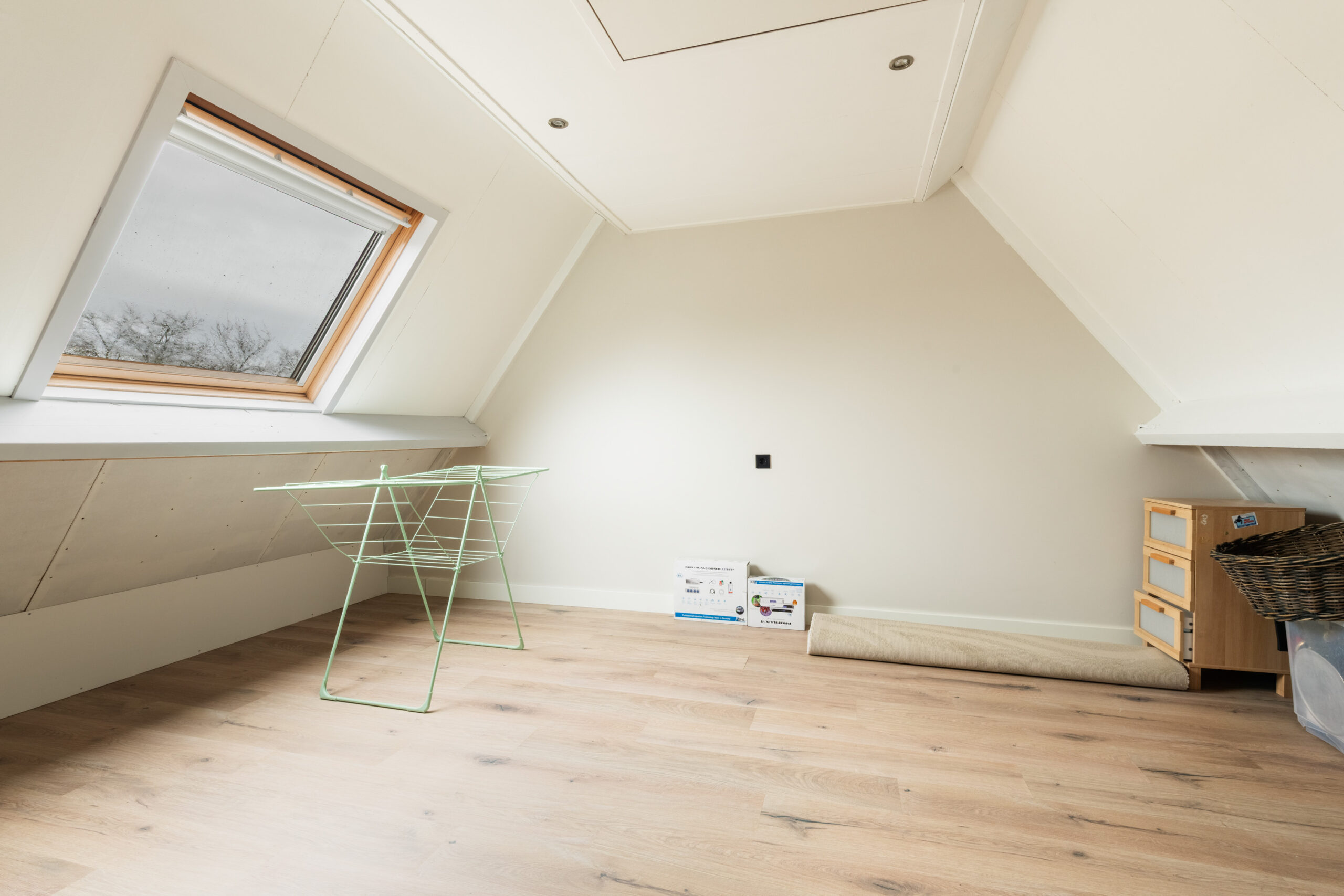 2e verdieping: open zolderruimte met dakraam en opstelplaats voor de cv-ketel (Atag) en aansluitingen voor de was-apparatuur.