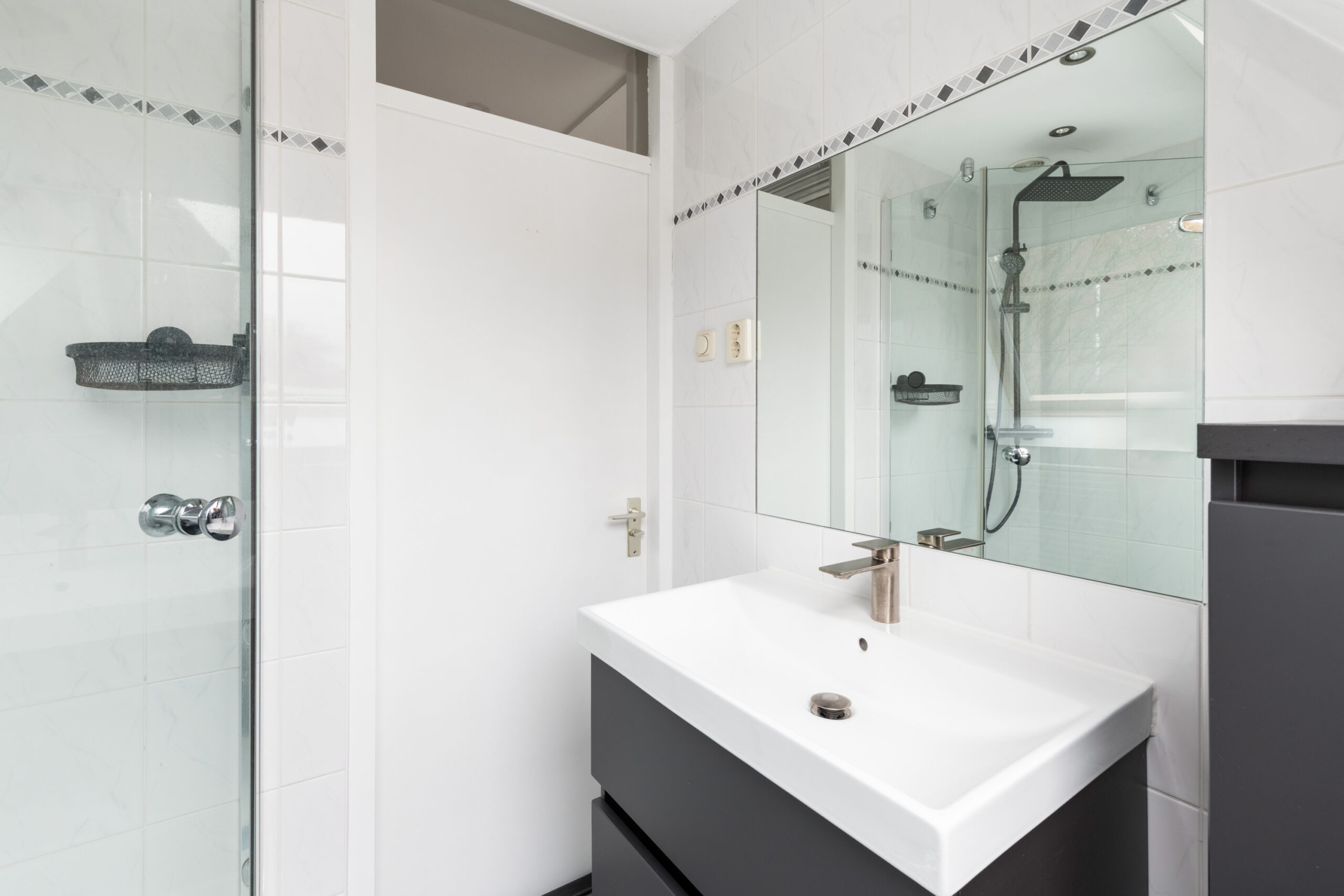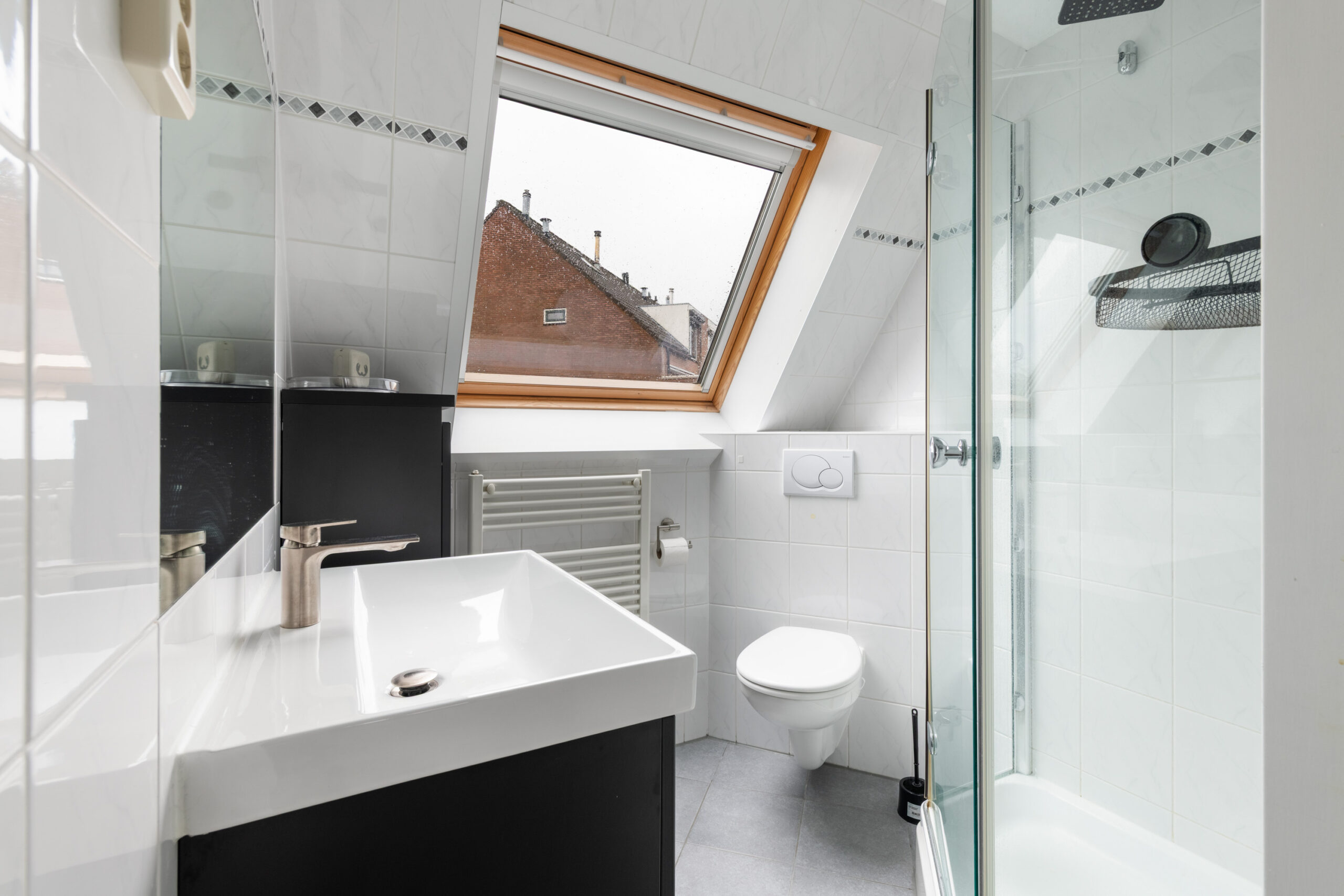 1e verdieping: overloop, 1e en 2e slaapkamer gesitueerd aan de achterzijde, 3e slaapkamer met dakraam gesitueerd aan de voorzijde, nette badkamer met dakraam en voorzien van wastafelmeubel, vrijdragend toilet en douche.