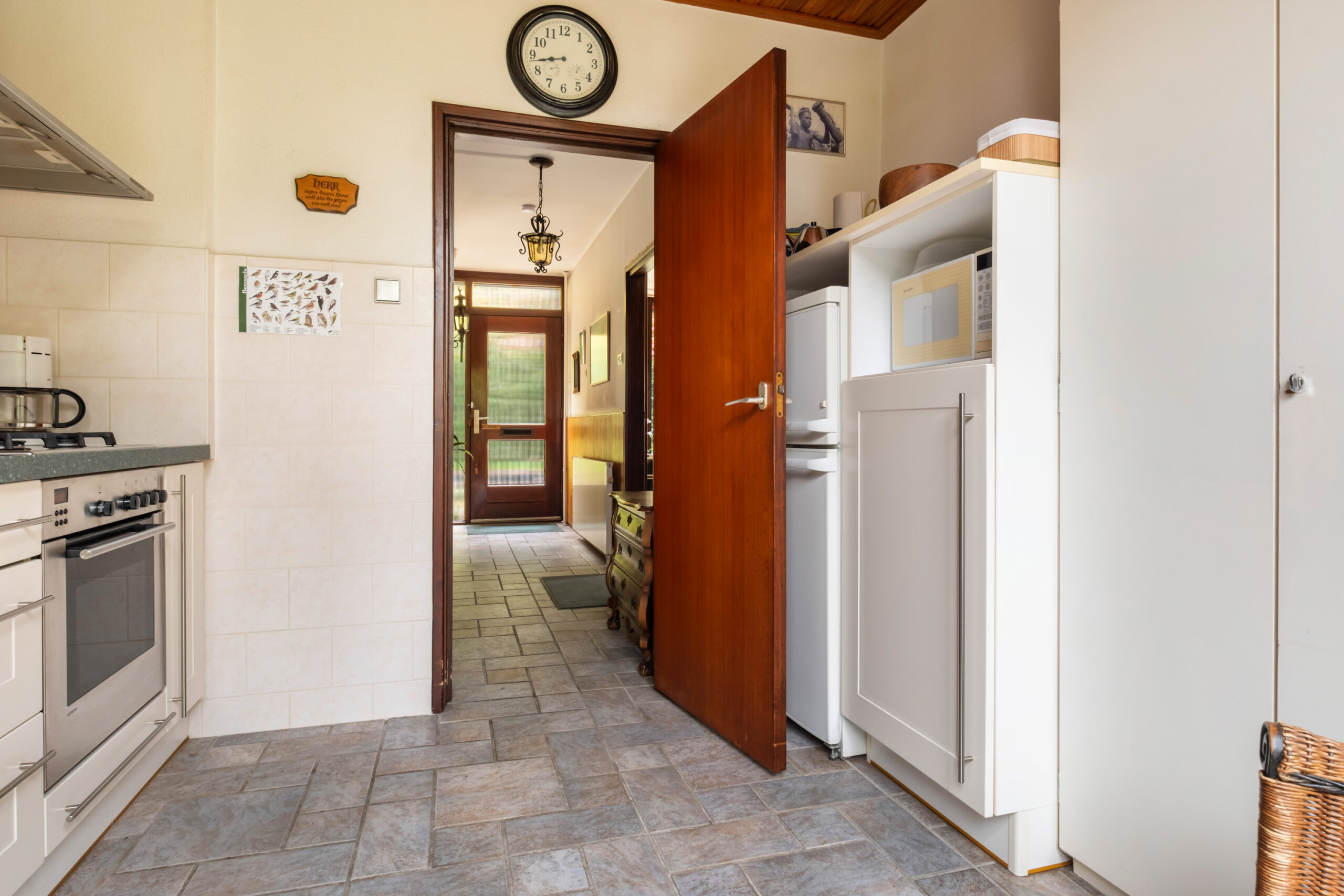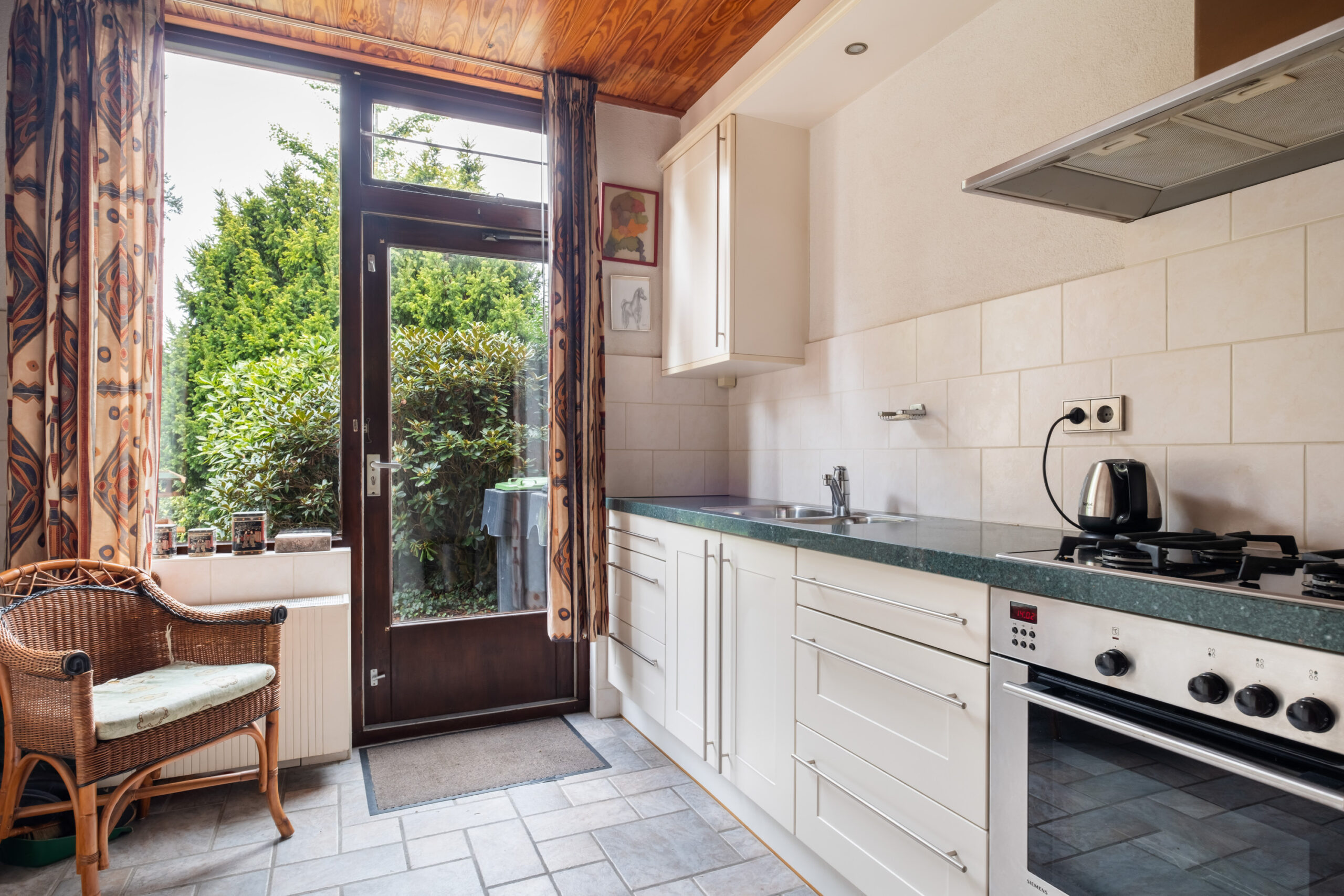 Entree/hal met meterkast, toiletruimte, trapopgang en trapkast, lichte doorzonwoonkamer met directe toegang tot de achtertuin. Via de hal bereikt u ook de separate keukenruimte welke is voorzien van een keuken in lichte kleurstelling (2000), een doorgeefluik naar het eetgedeelte en eveneens toegang tot de achtertuin.