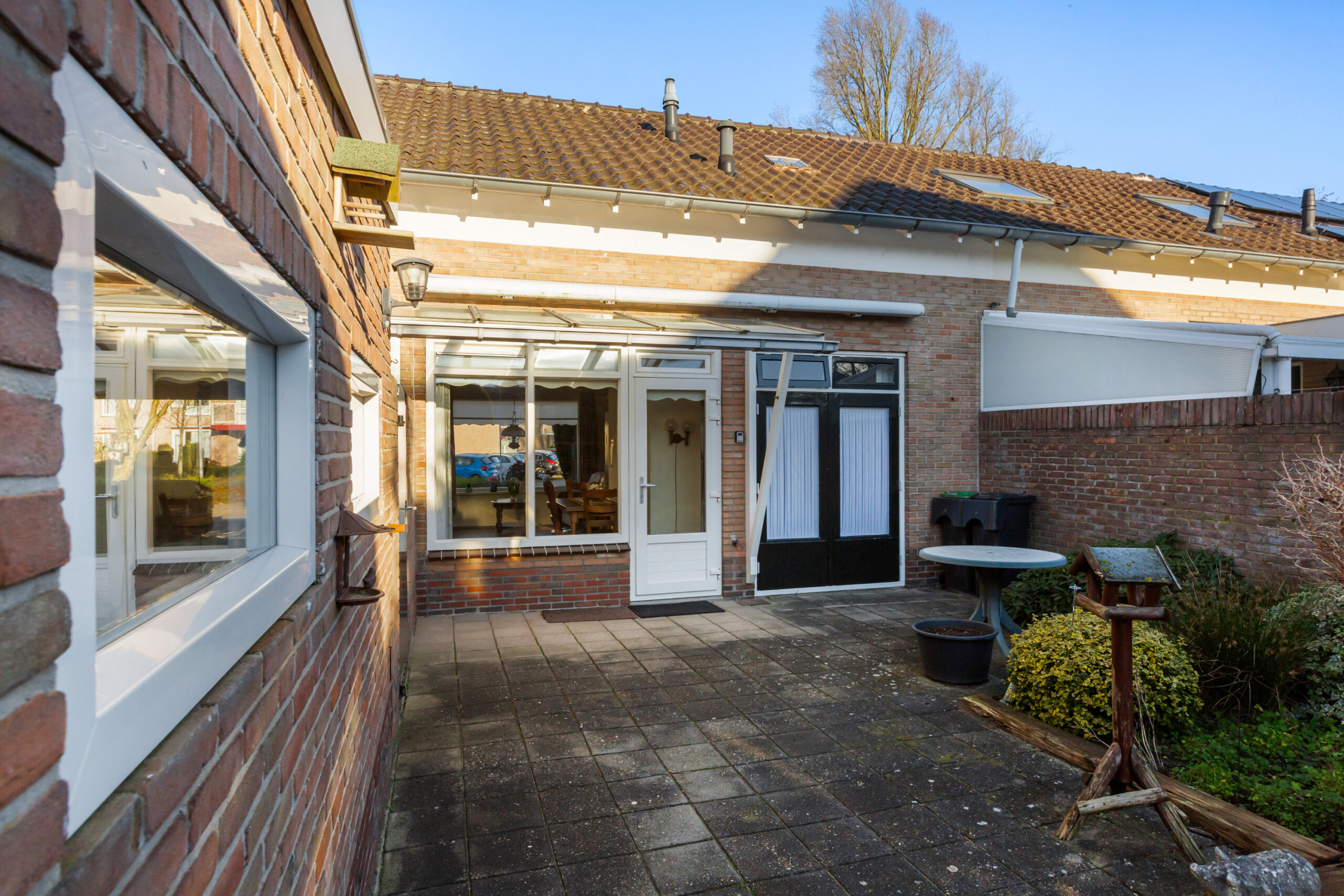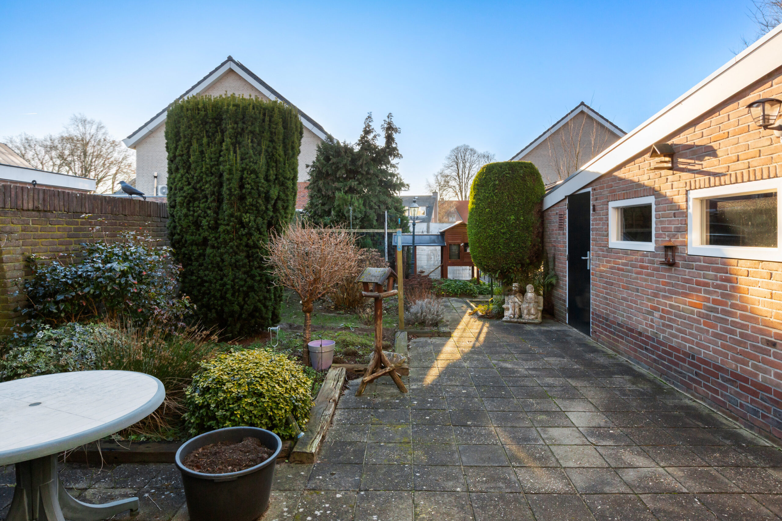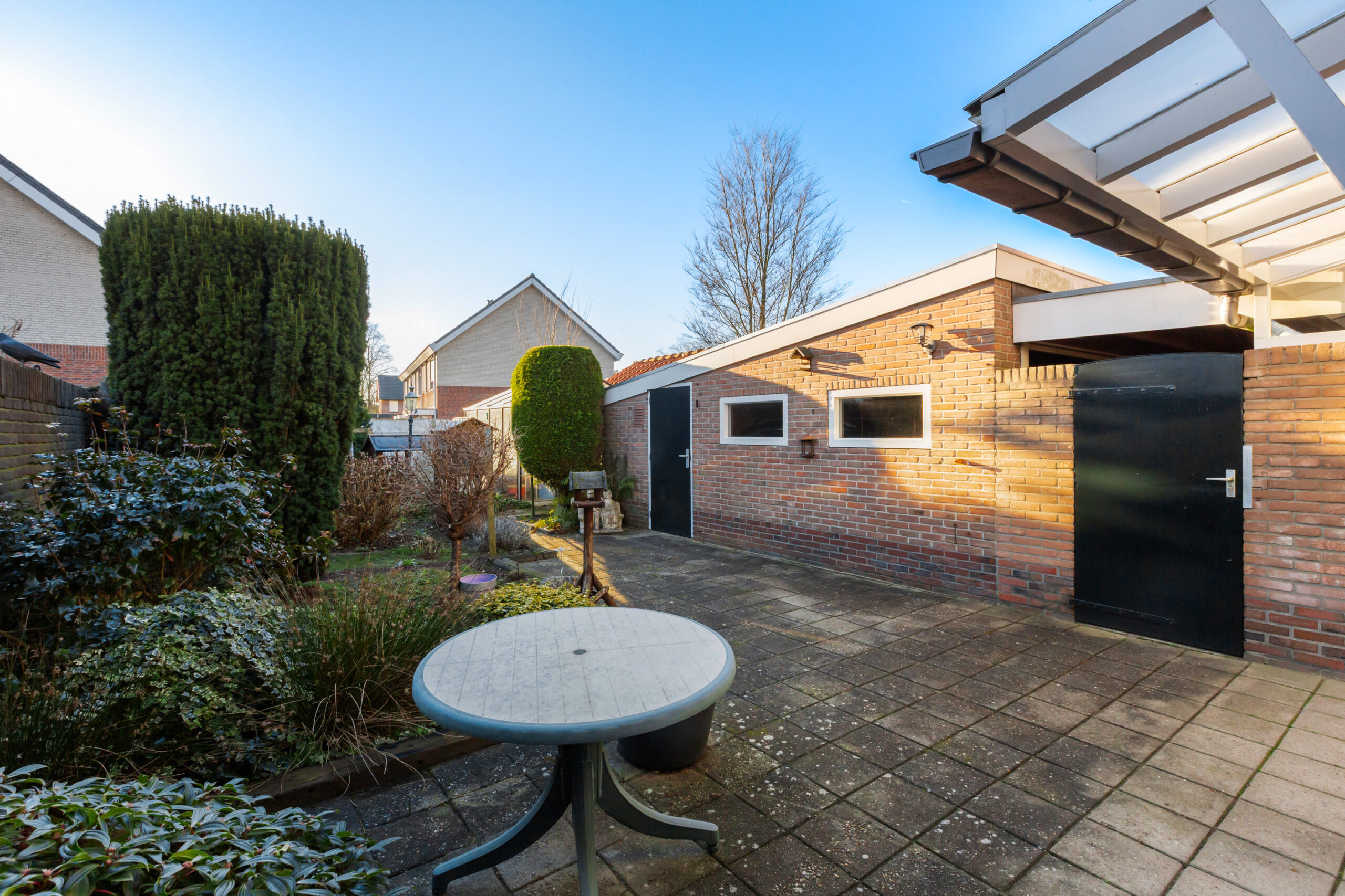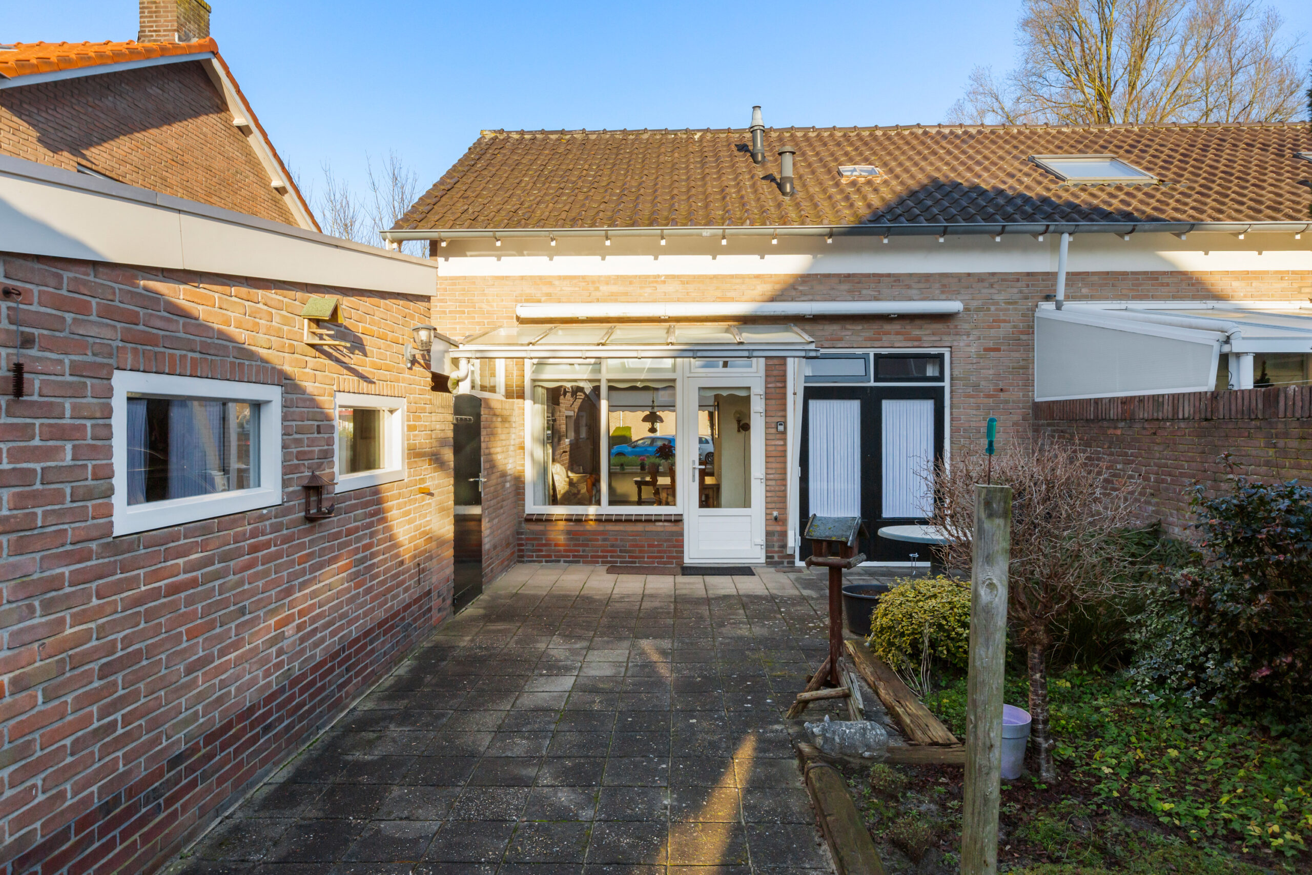 De diepe achtertuin is gesitueerd op het zuiden. Het terras direct achter de woning is deels voorzien van een glazen overkapping waardoor het hier fijn beschut zitten is. Verder is de achtertuin voorzien van straatwerk en diverse beplanting.