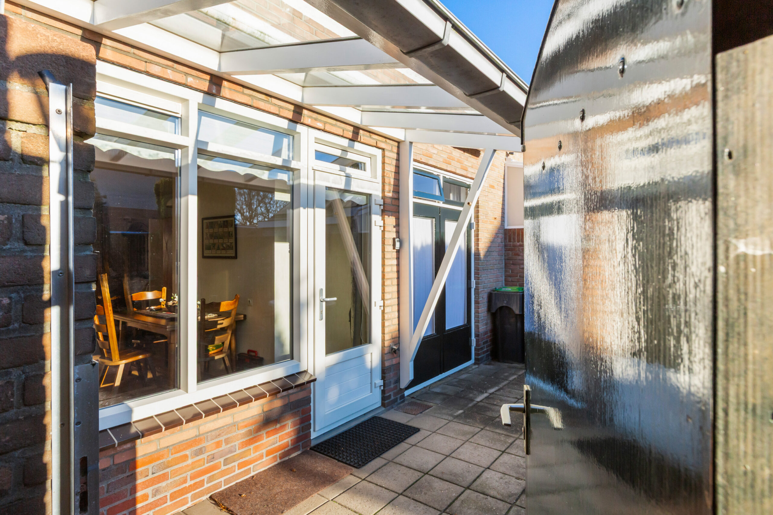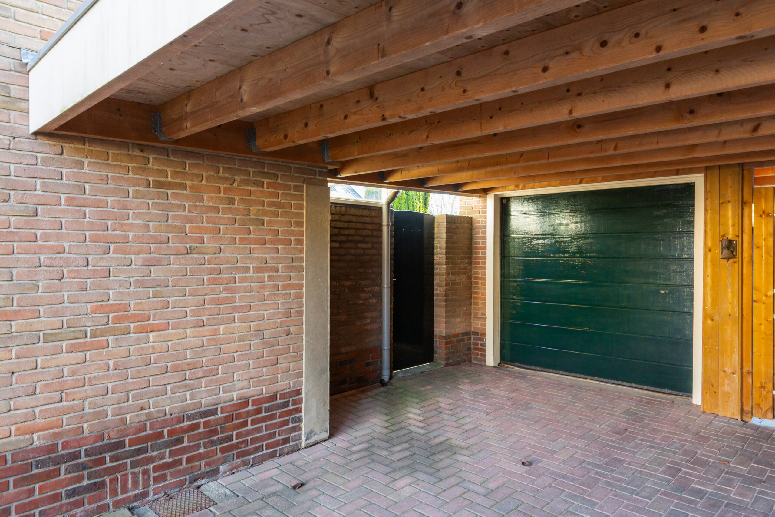 De vrijstaande garage en de aangrenzende bergingen zijn vanuit de achtertuin bereikbaar. De voorgelegen oprit is deels voorzien van een carport welke gezamenlijk met de buren is gerealiseerd.
