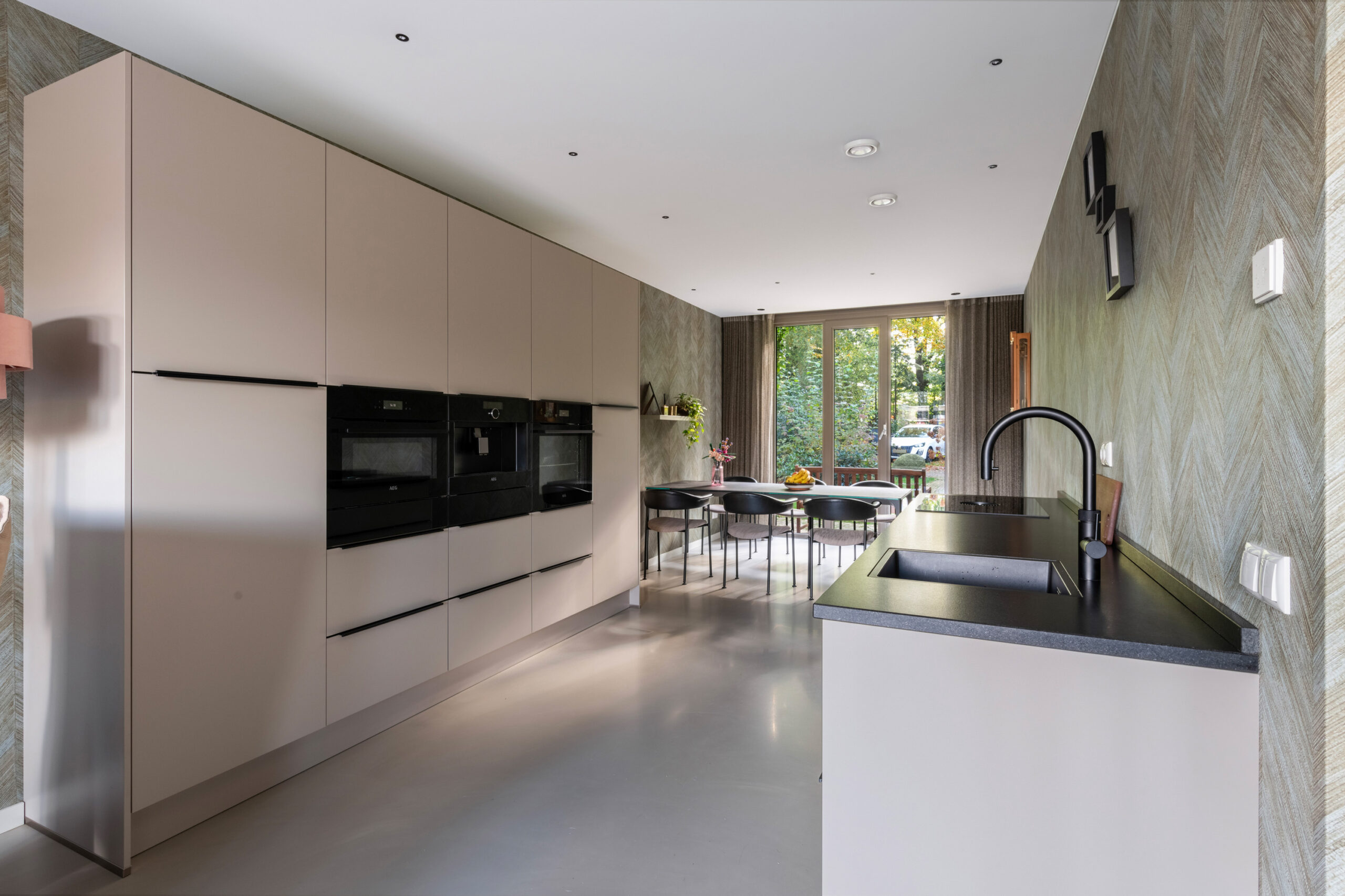 Indeling: entree/hal, meterkast, garderobe, toiletruimte voorzien van vrijdragend toilet en fonteintje, ruimte geschikt voor het plaatsen van een lift, nu in gebruik als berg/provisieruimte. Tuingerichte woonkamer met deur naar het terras, de luxe keuken gesitueerd tussen woon- en eetkamer met o.a. quooker, inductiekookplaat met geïntegreerde afzuiging, koffiemachine, combioven en heteluchtoven, vaatwasser en koel/vriescombinatie. De eetkamer bevindt zich aan de voorzijde van de woning.