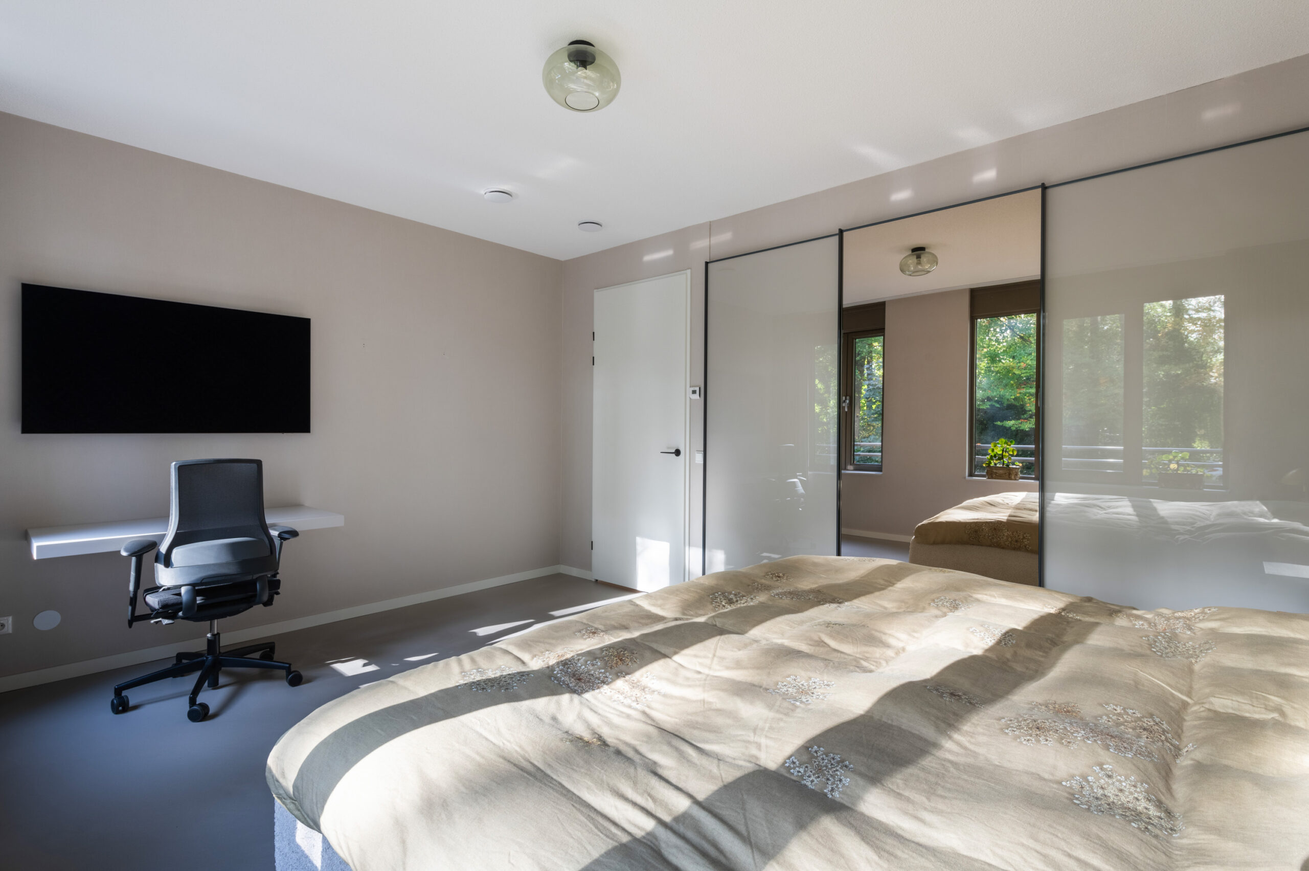 1e verdieping: overloop, ruimte voor de was-apparatuur, technische ruimte met WTW installatie, ruimte geschikt voor het plaatsen van een lift, nu in gebruik als berging. Er zijn drie slaapkamers elk met op maat gemaakte inbouwkasten en bureaus, mooie ruime badkamer met inloopdouche, ligbad, toilet en wastafelmeubel voorzien van wastafel met dubbele kraan.