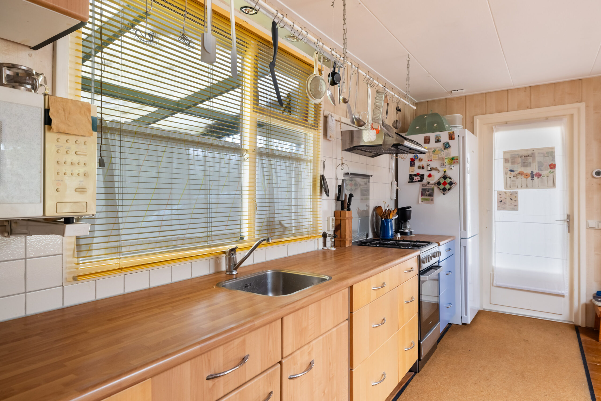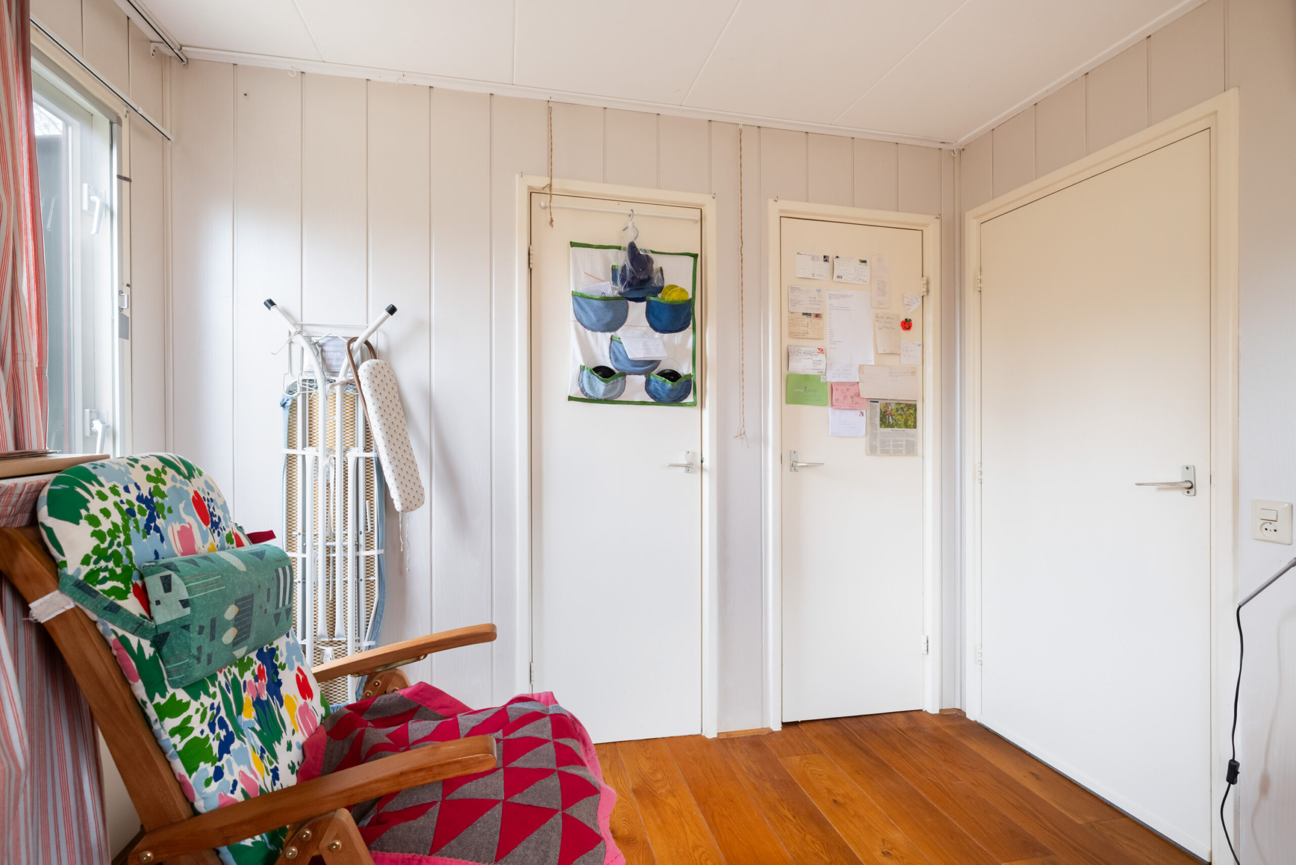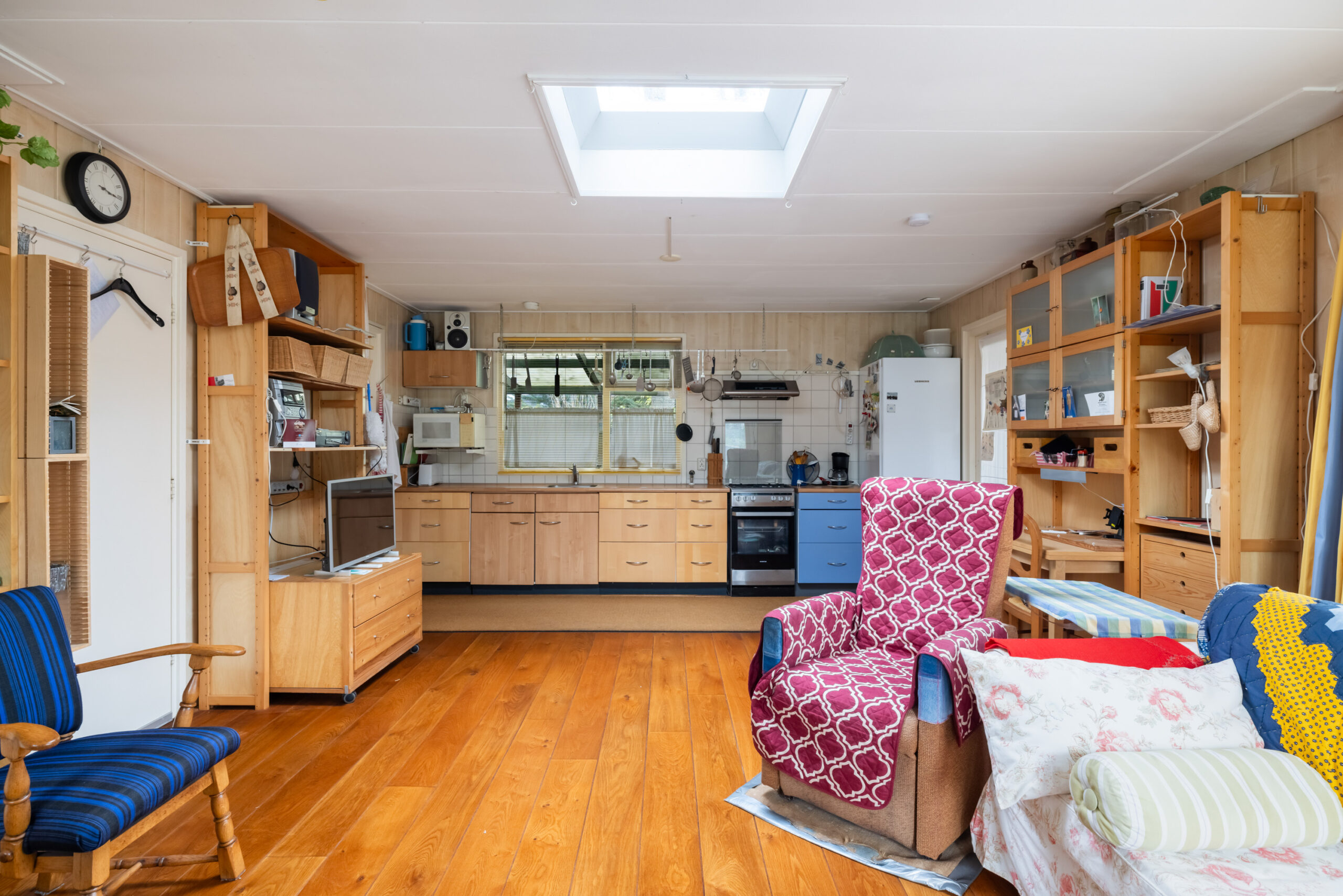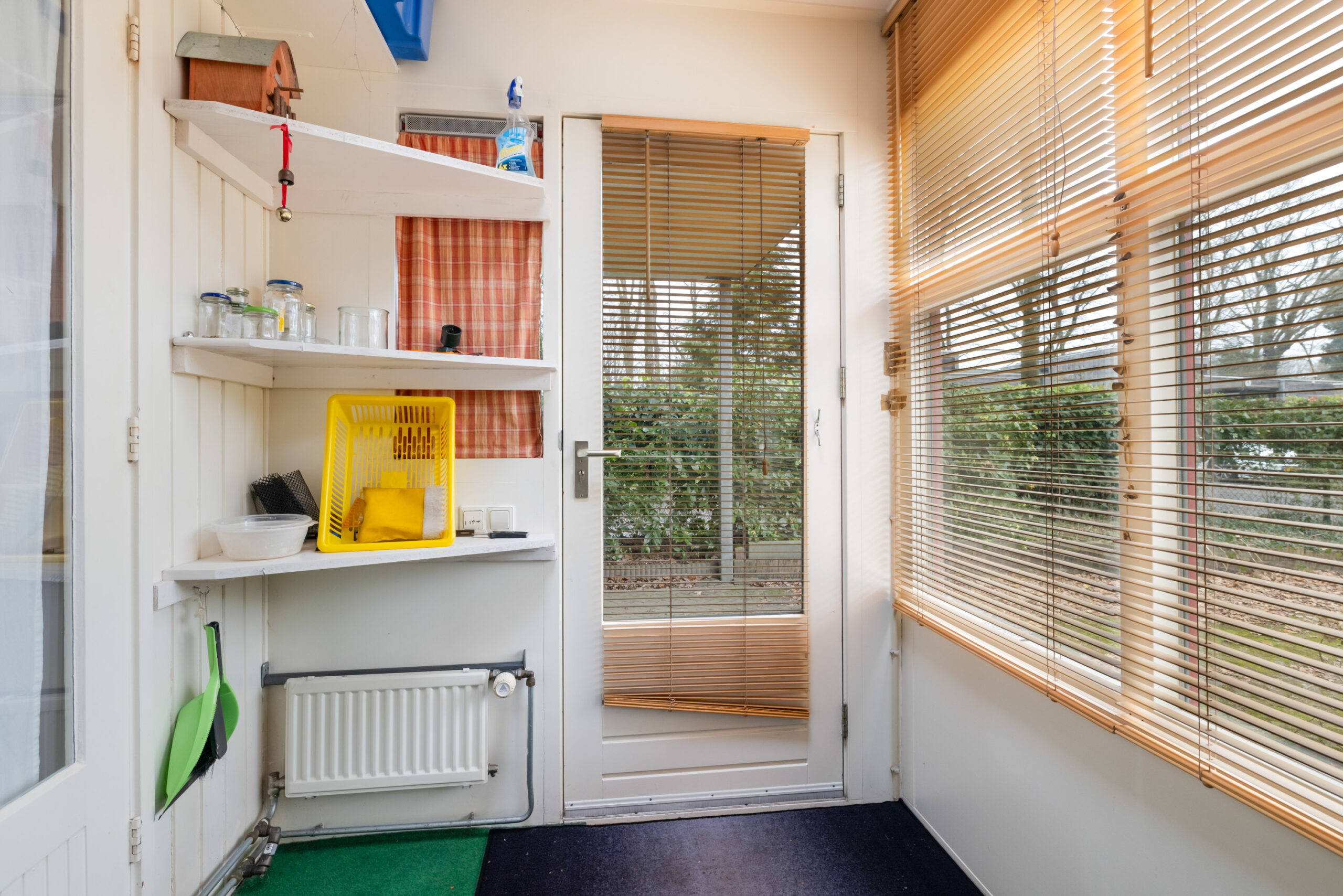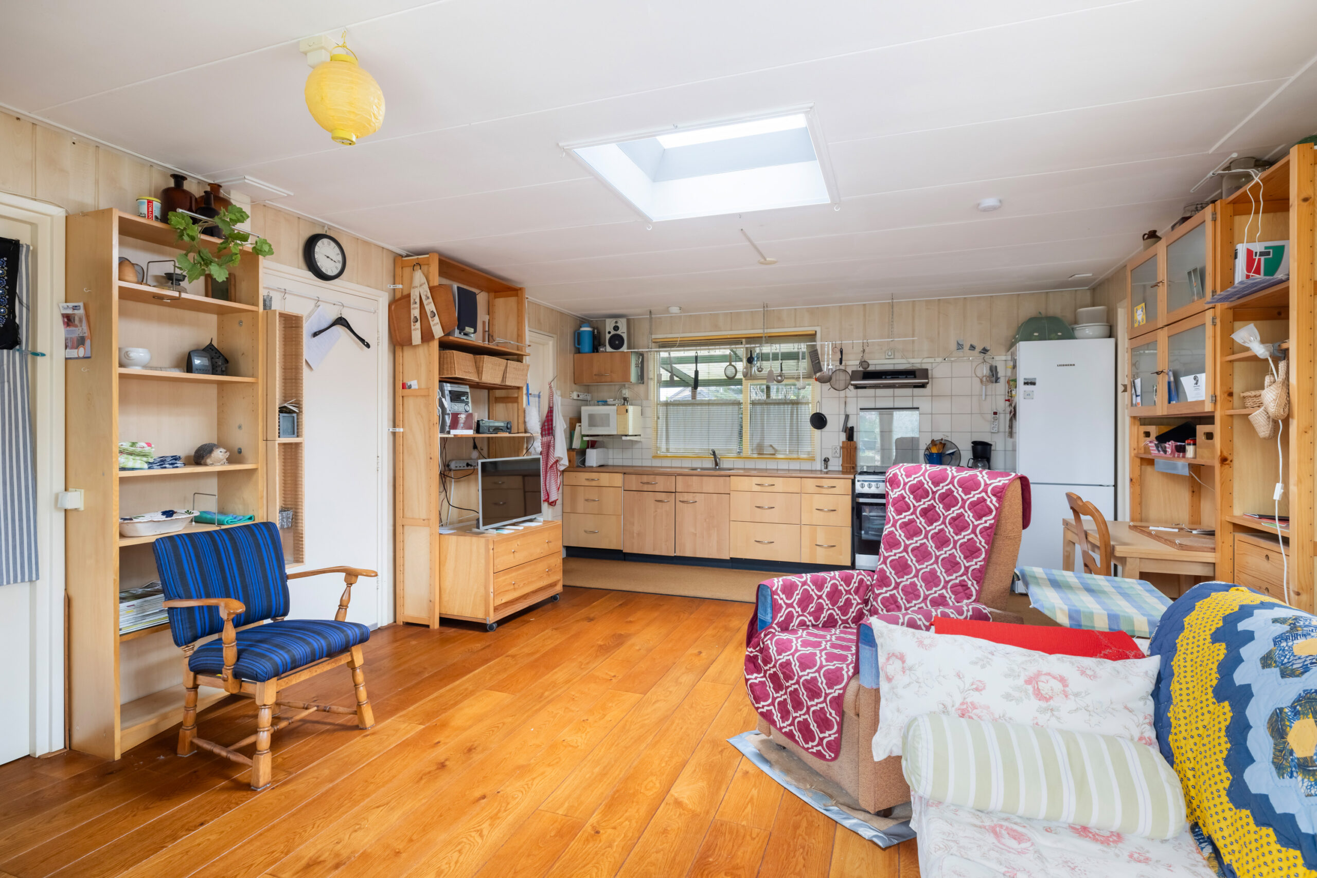 Entree/hal met lichtkoepel en meterkast, open keuken met rechte keukenopstelling, woonkamer met lichtkoepel en openslaande deuren naar de tuin, 1e slaapkamer met vaste kasten, 2e slaapkamer met vaste kast, badkamer voorzien van badkamermeubel met wastafel en inloopdouche en aangrenzende toiletruimte. Vanuit de badkamer ook toegang tot de overkapping. De aangebouwde berging is bereikbaar aan zowel de tuinkant als via de overkapping. Hier bevinden zich de aansluitingen voor de was-apparatuur en de opstelplaats voor de cv-ketel. Door de gehele woning ligt er een Frans eikenhouten vloer van circa 8 mm dik.
