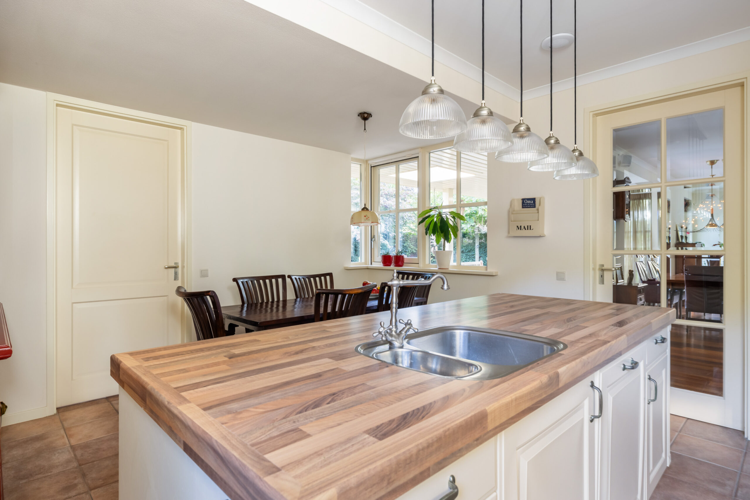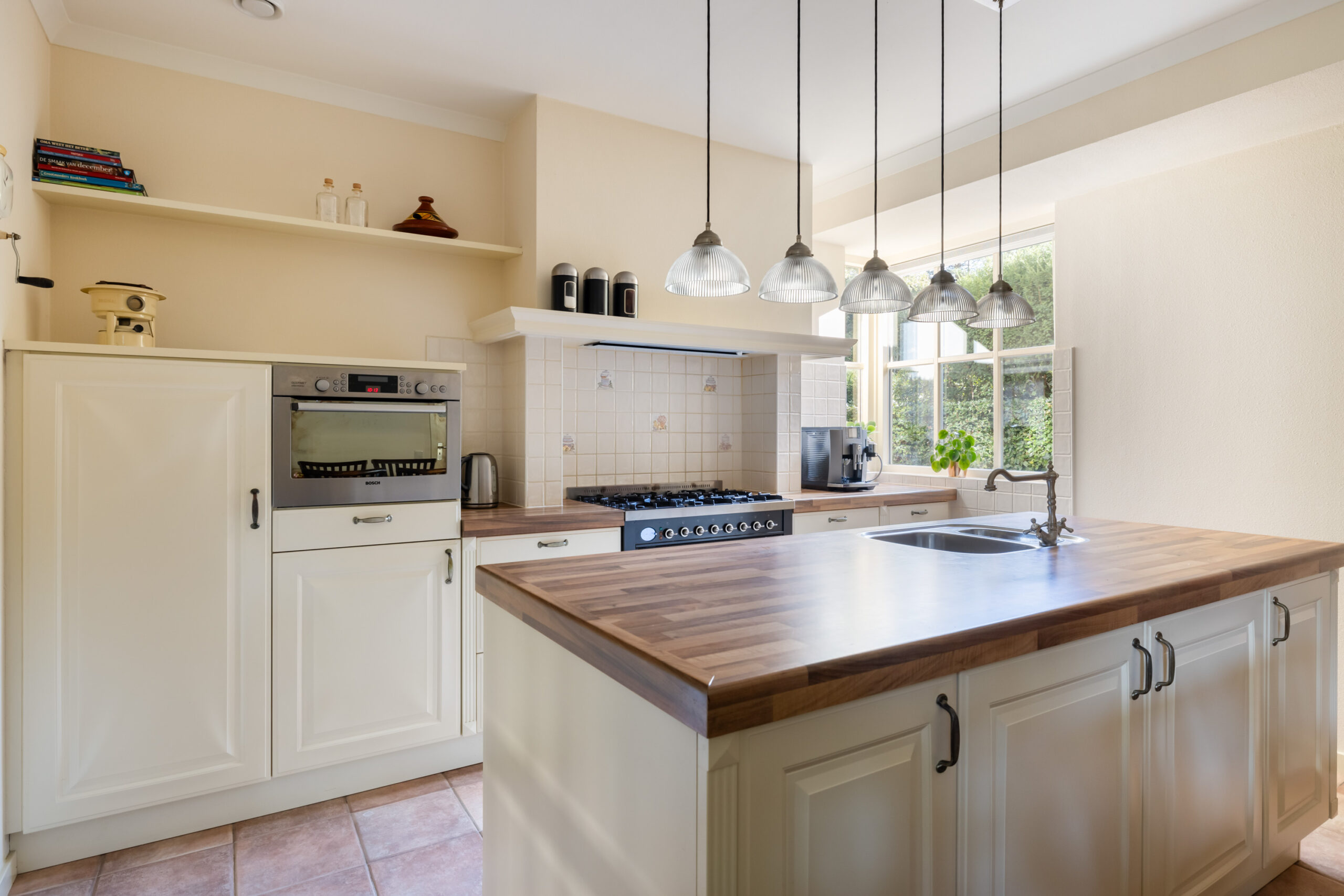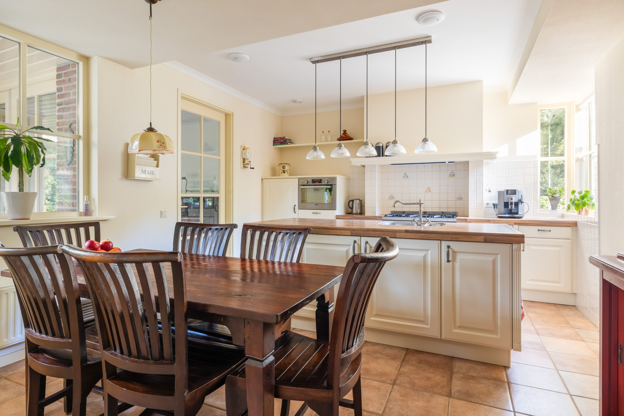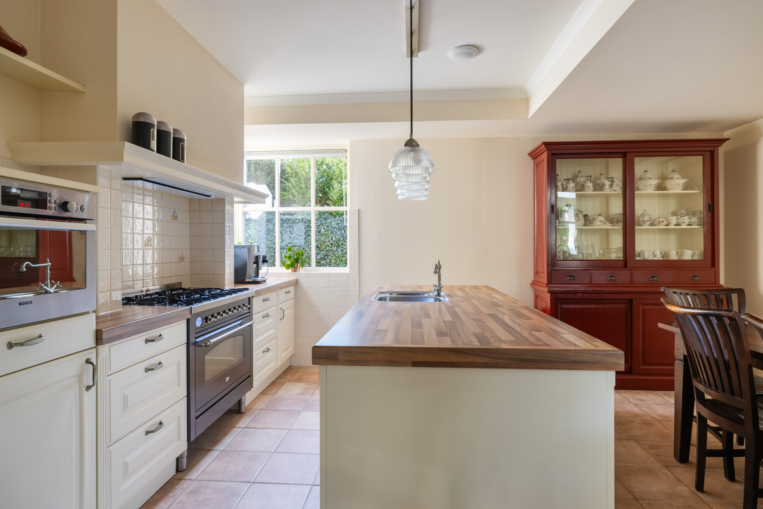 De aangrenzende keukenruimte is voorzien van een keuken in lichte kleurstelling, heeft een spoeleiland en beschikt over 'Bose' speakers in het plafond. De ruimte is groot genoeg om hier ook een eettafel neer te zetten. Grenzend aan de keuken bevindt zich een bijkeuken/achter-entree voorzien van een vaste kastenwand met schuifdeuren en met directe toegang tot zowel de naastgelegen garage als de achtertuin.
