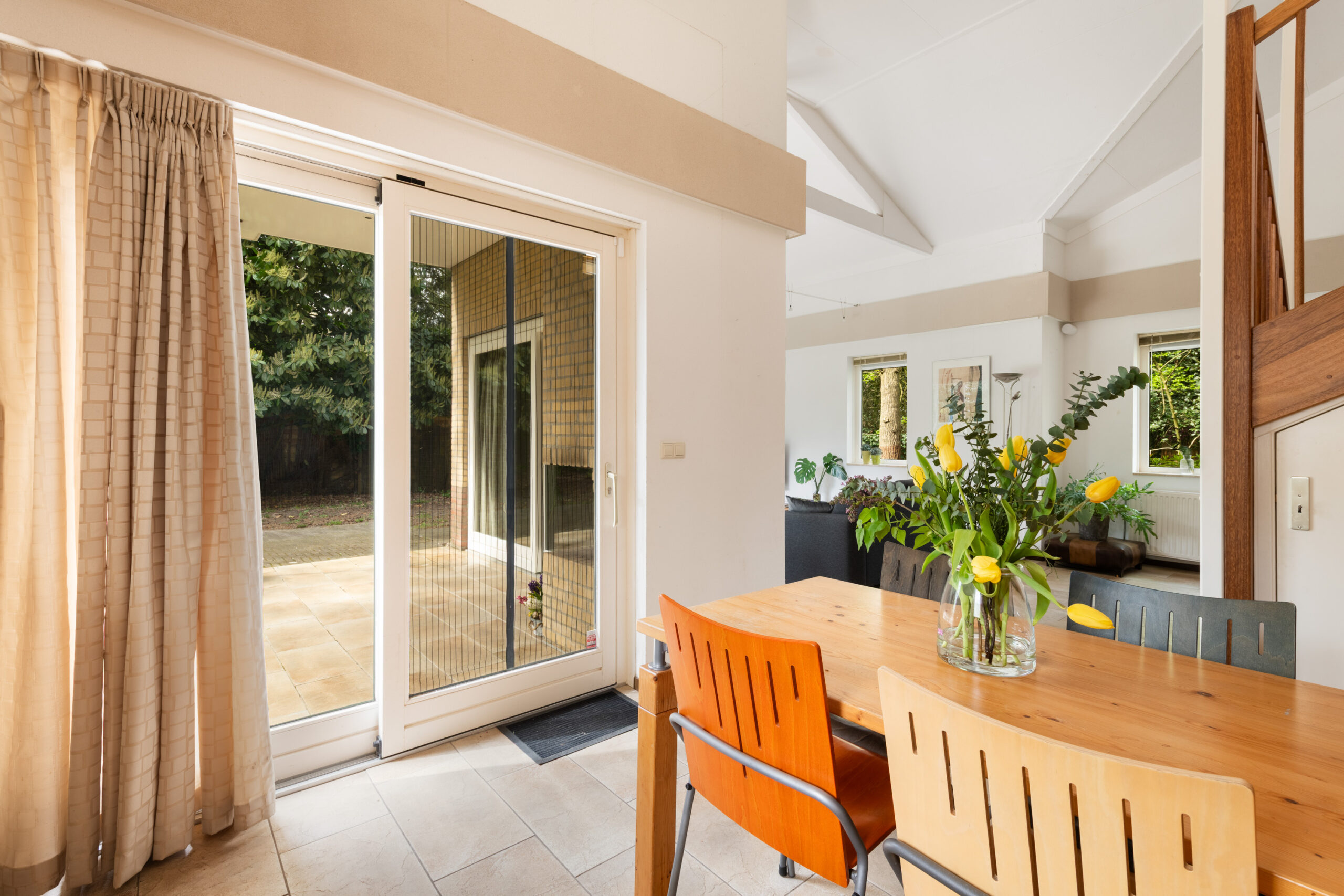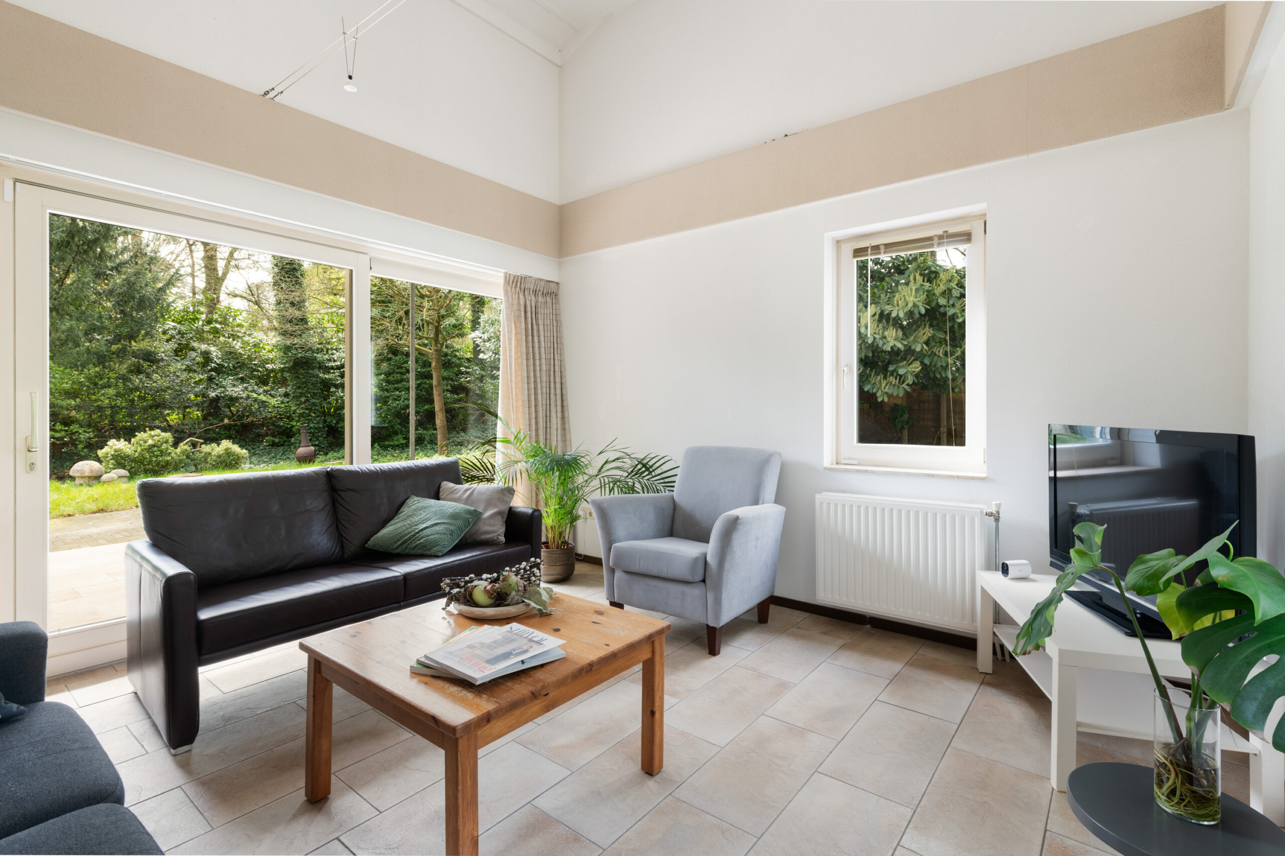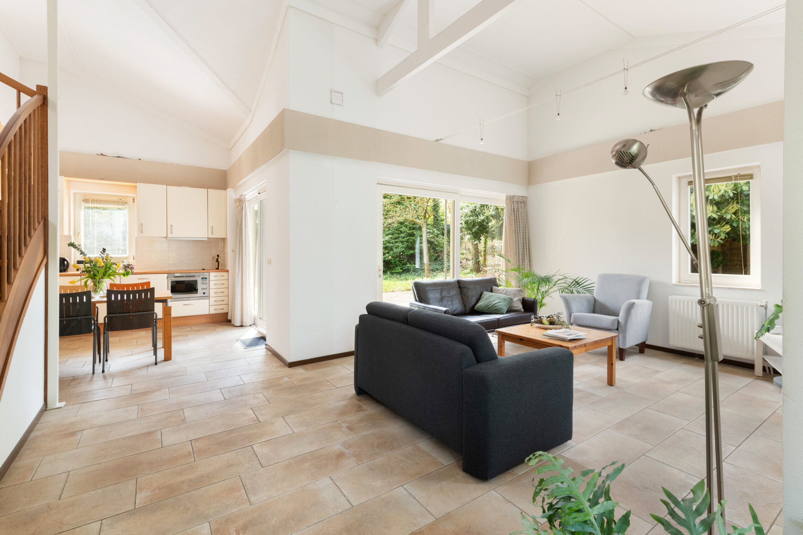 De leefruimte is voorzien van 2 schuifpuien, heeft een plafondhoogte van circa 4,12 m (!) en vormt het hart van de woning. Dankzij de grote glaspartijen geniet u hier van een prettig uitzicht op de tuin.