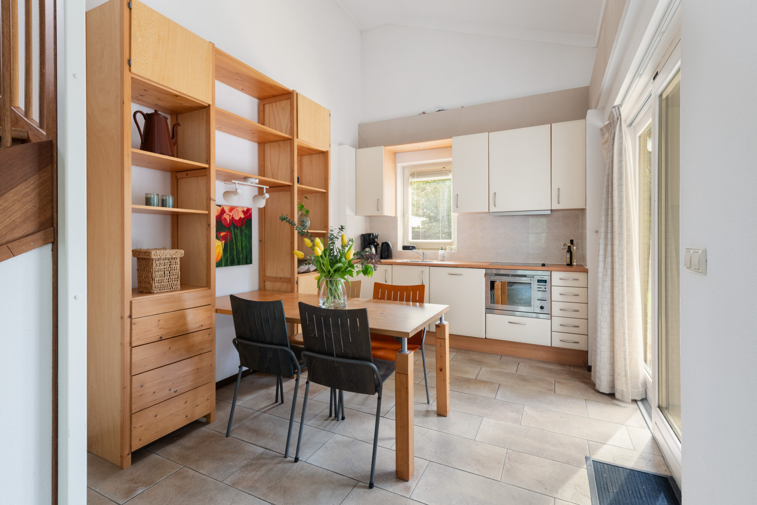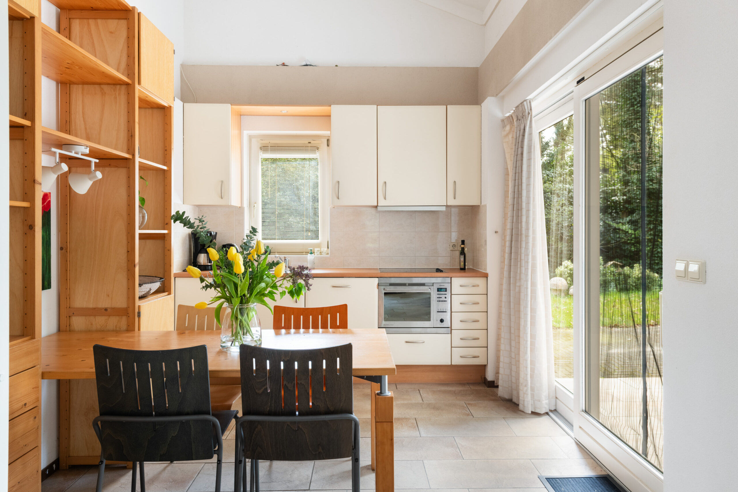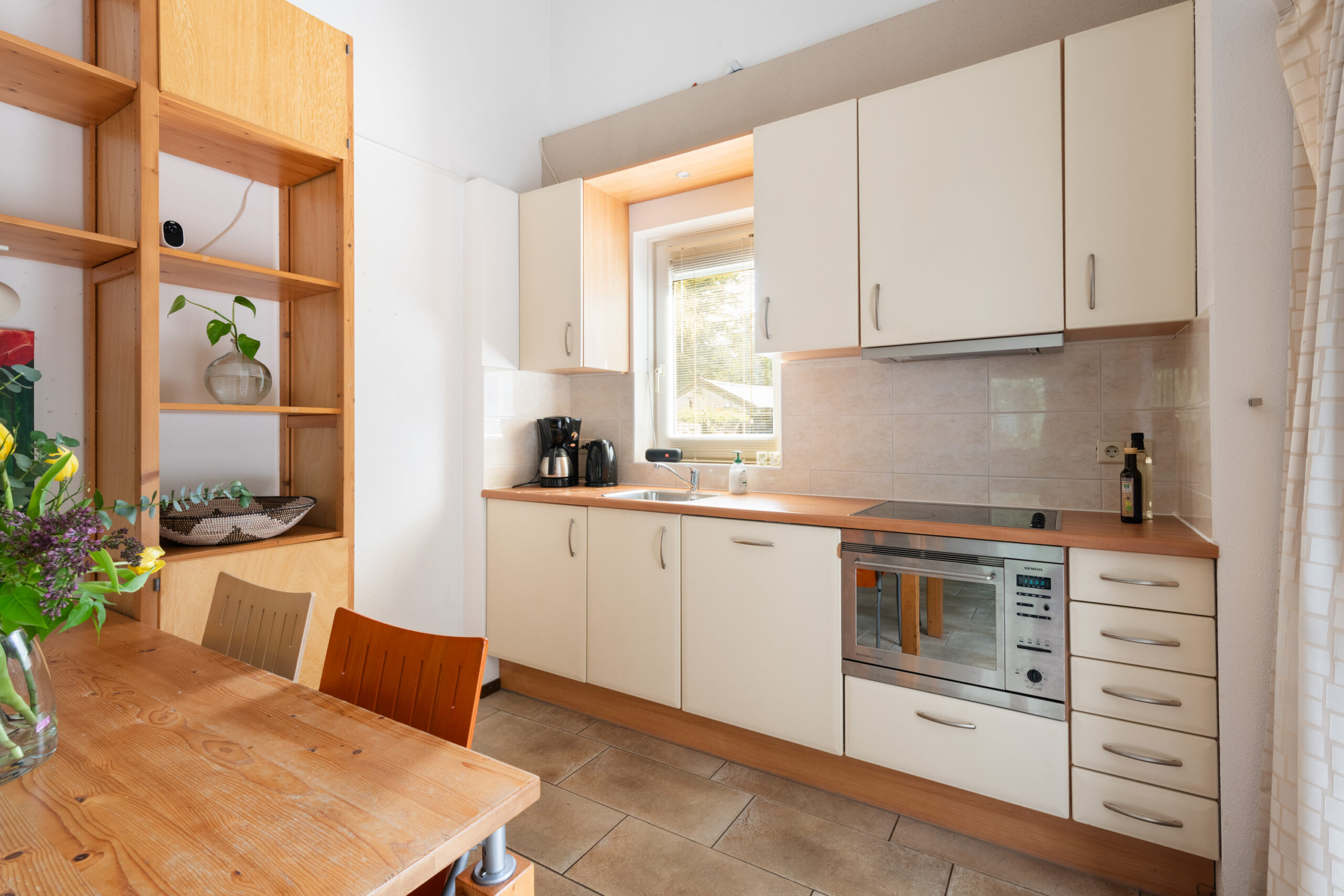 De leefruimte is voorzien van 2 schuifpuien, heeft een plafondhoogte van circa 4,12 m (!) en vormt het hart van de woning. Dankzij de grote glaspartijen geniet u hier van een prettig uitzicht op de tuin.