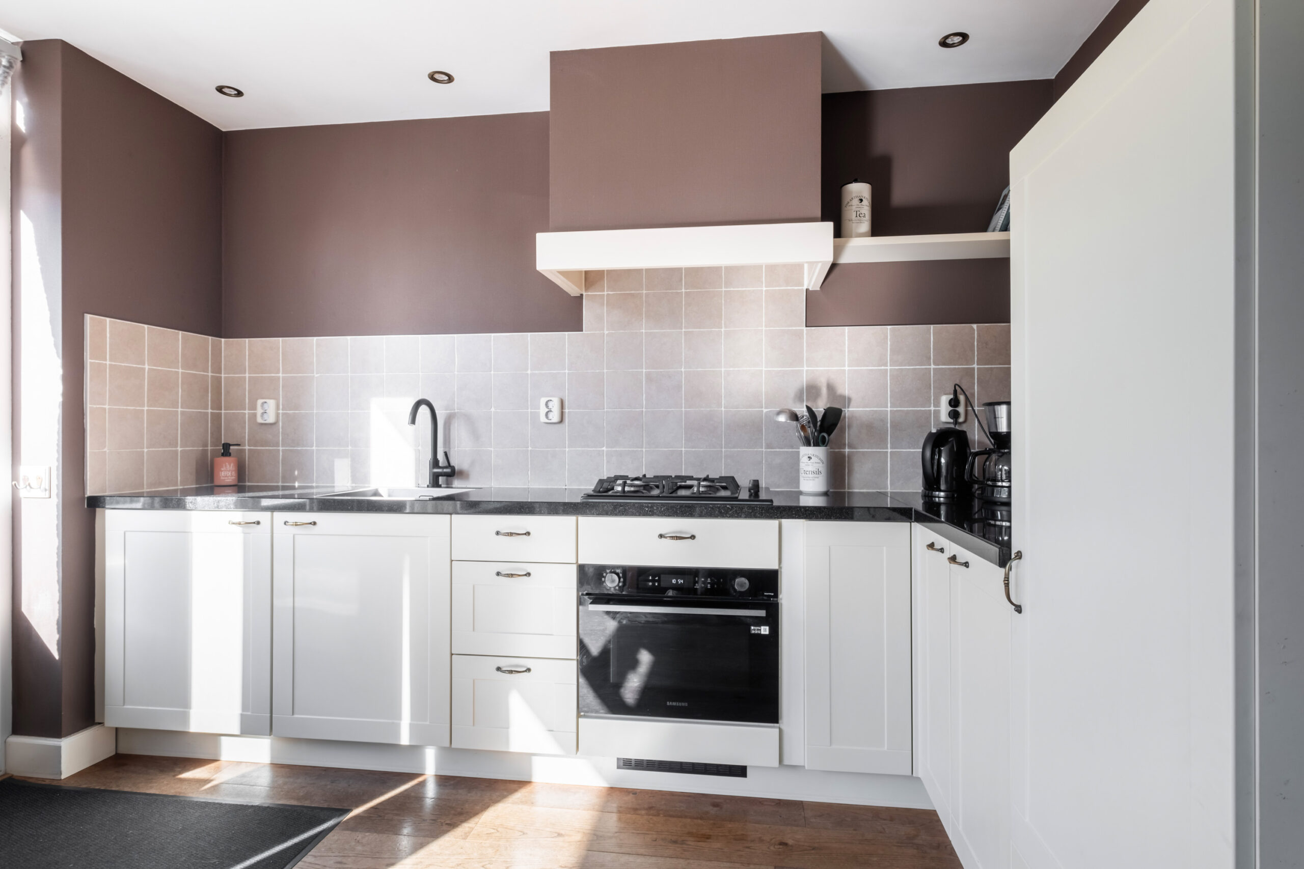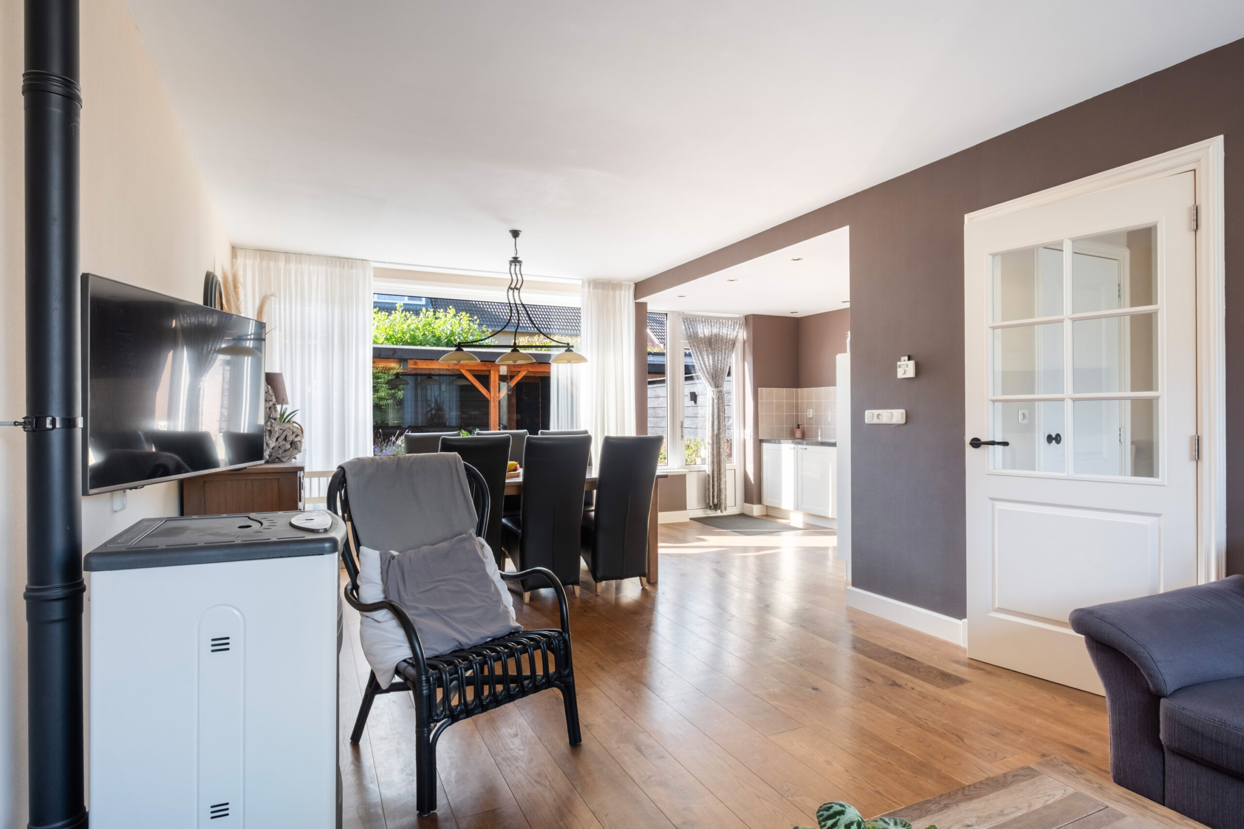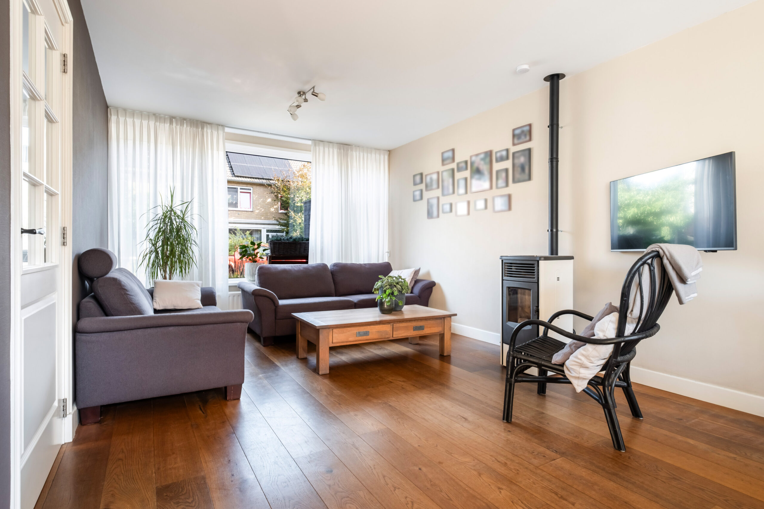 Begane grond: hal, toilet, royale trapkast met daarin tevens de meterkast, woonkamer met lamelparketvloer, pelletkachel en open keuken met koelkast, combi-oven (2024), gaskookplaat en afzuigkap.