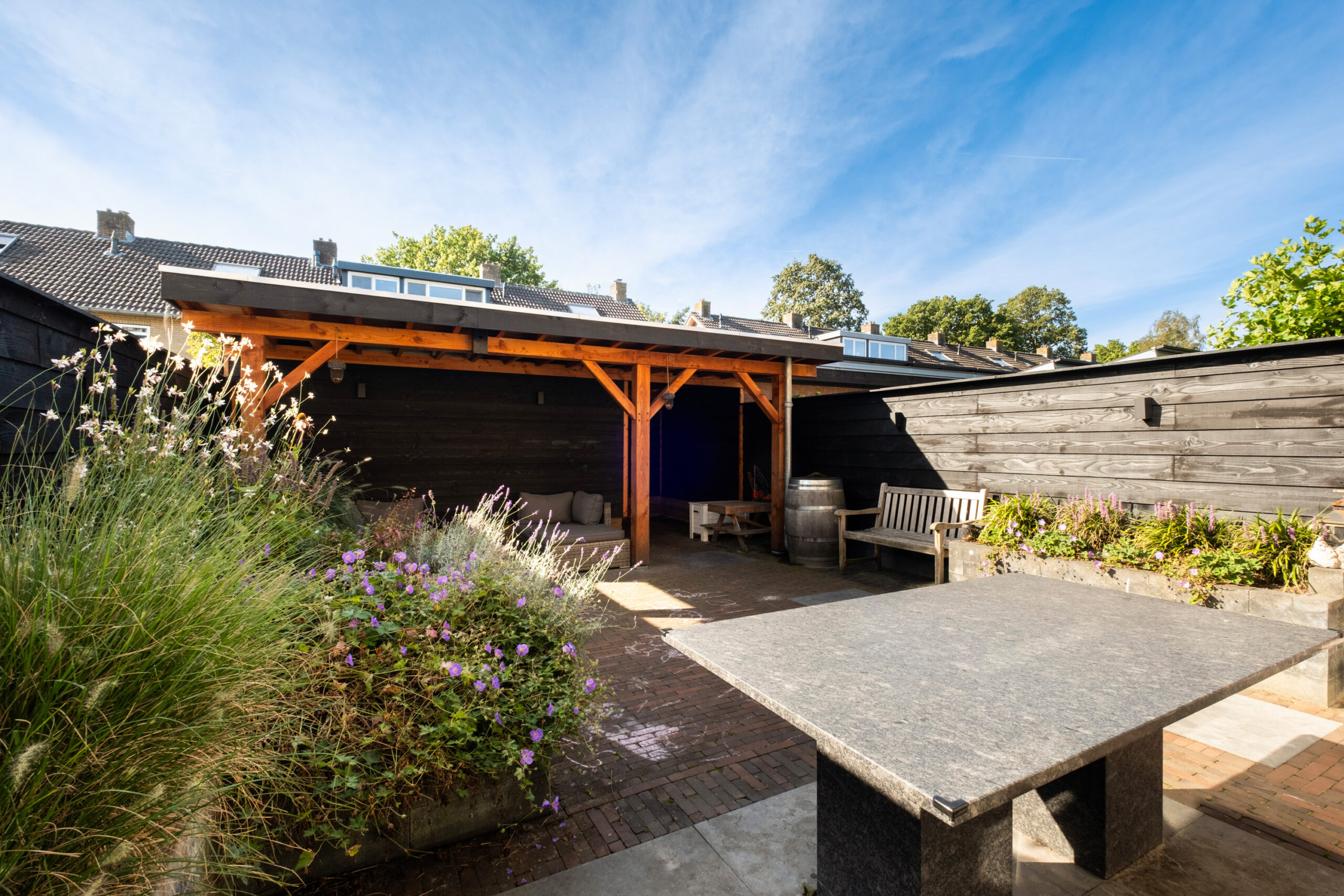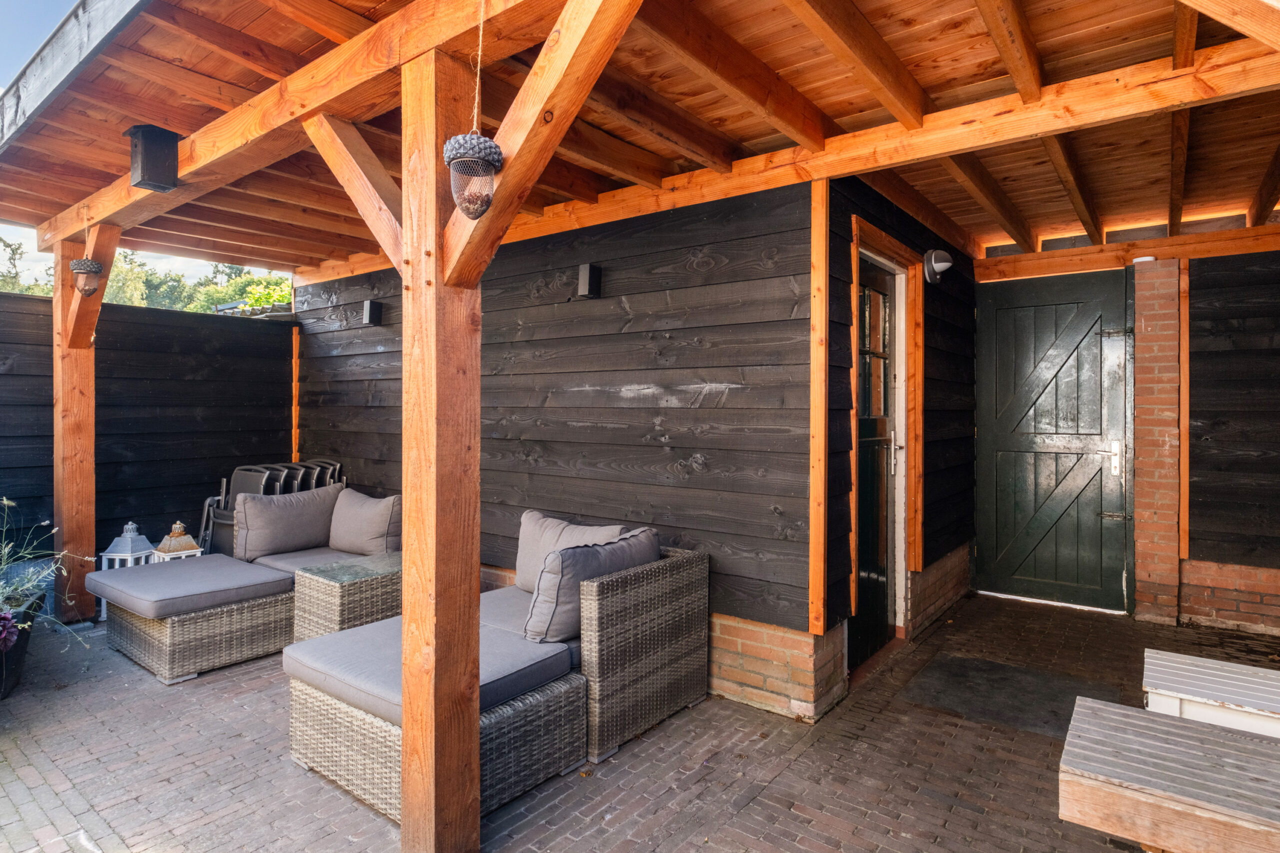Onder de overkapping is ook al zo'n heerlijke plek gemaakt om het buitenleven optimaal te beleven.