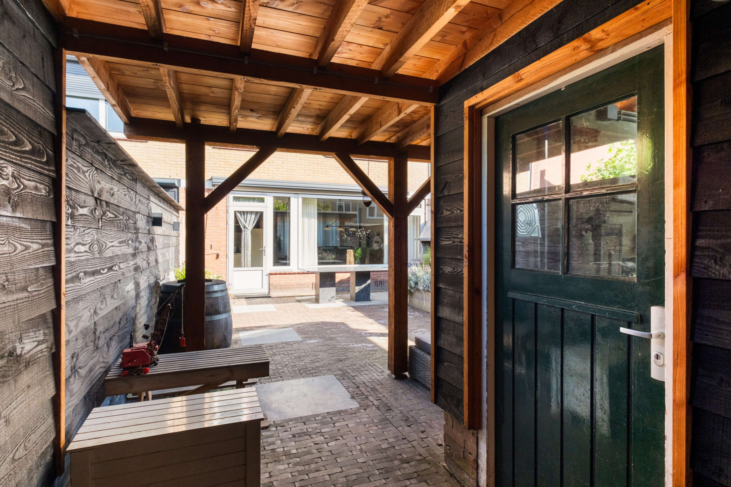 Tuin: een heerlijk terras om lang te genieten! De achtertuin is voorzien van klinker bestrating en plantenbakken. Aan beide zijkanten zijn de schuttingen vervangen en sluiten naadloos aan op de robuuste gevelbetimmering van de berging en de stoere overkapping.