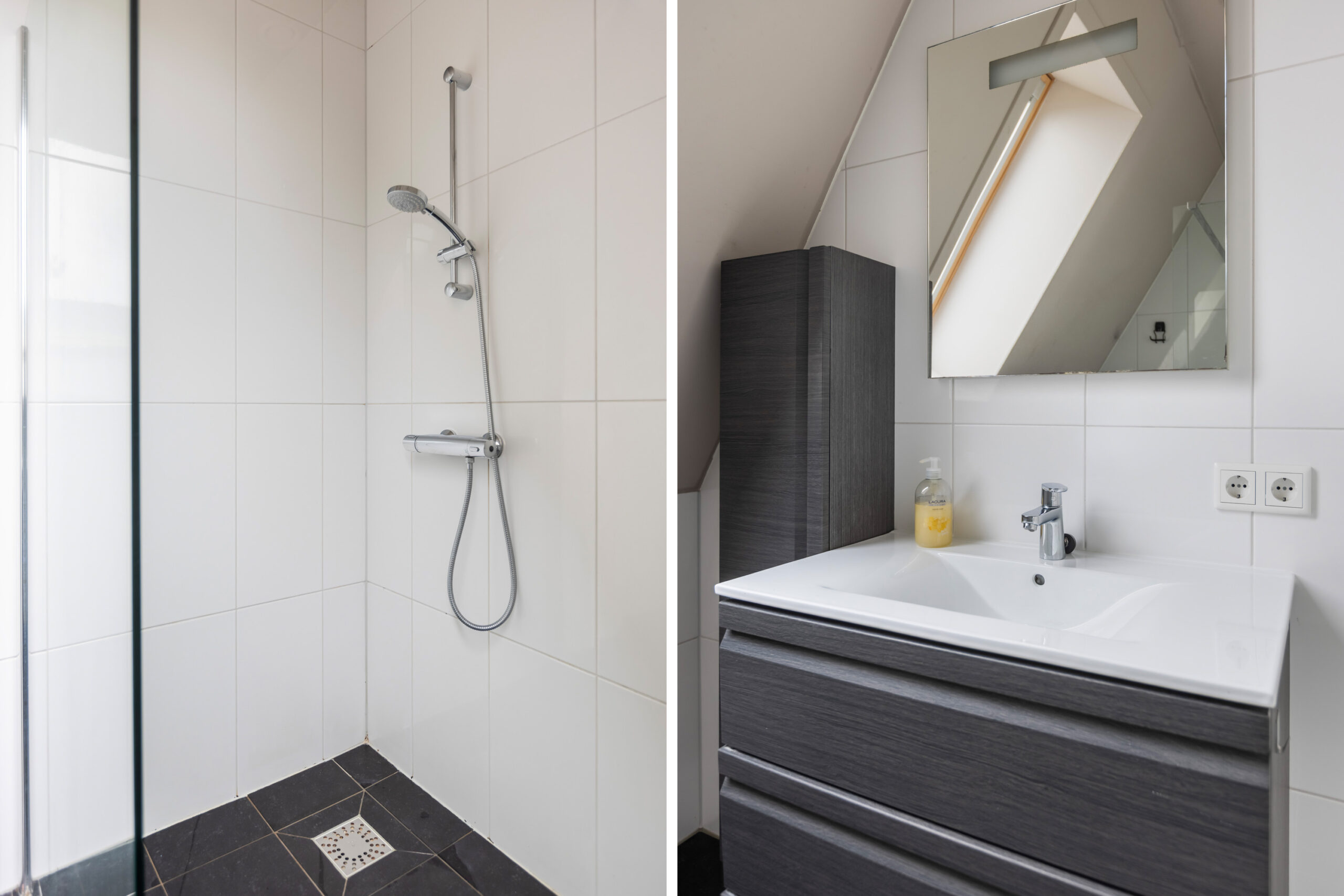 1e verdieping: overloop, 2 slaapkamers, badkamer met inloopdouche en wastafel. Het is mogelijk de grote slaapkamer aan de voorzijde te splitsen in 2 slaapkamers.