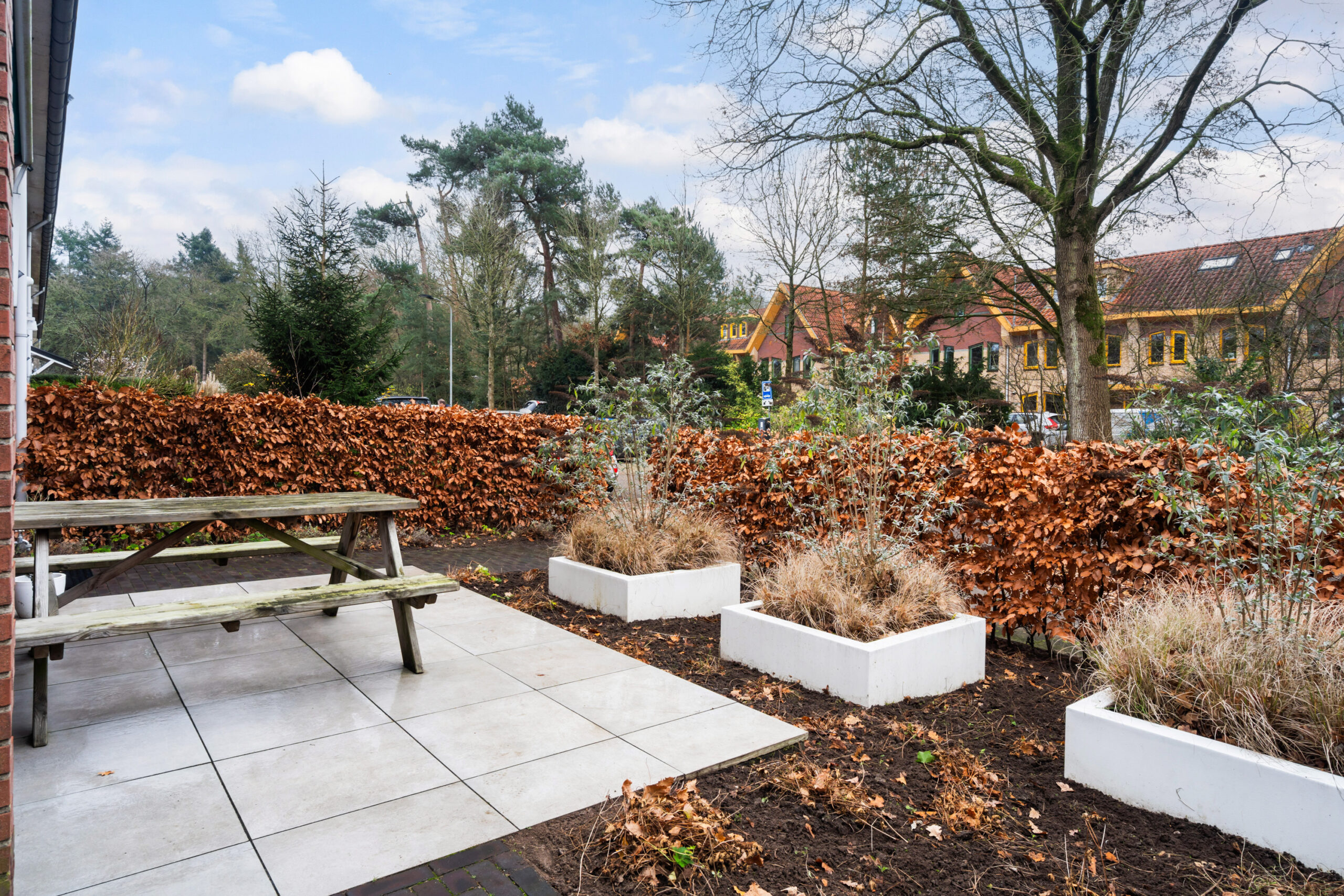 De voortuin is omzoomd met een beukenhaag en net als de achtertuin voorzien van een mooi terras en eigentijdse plantenbakken.