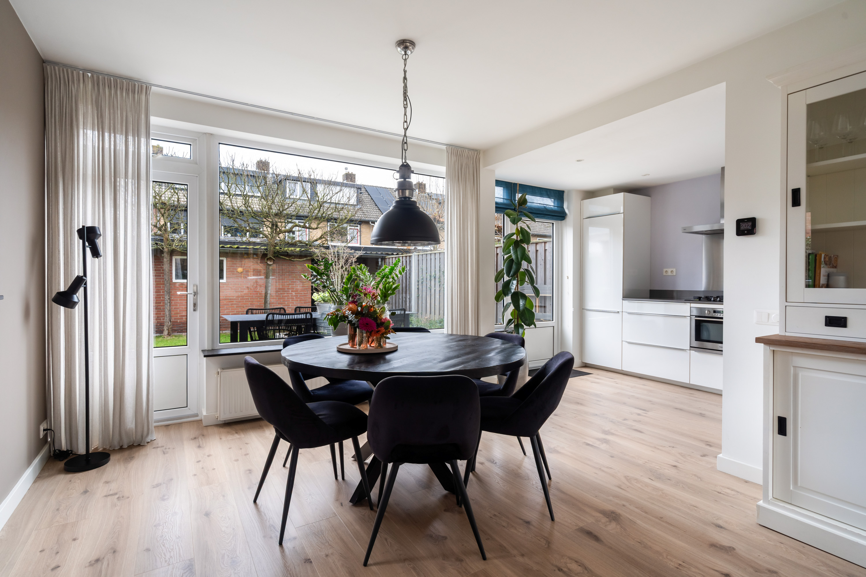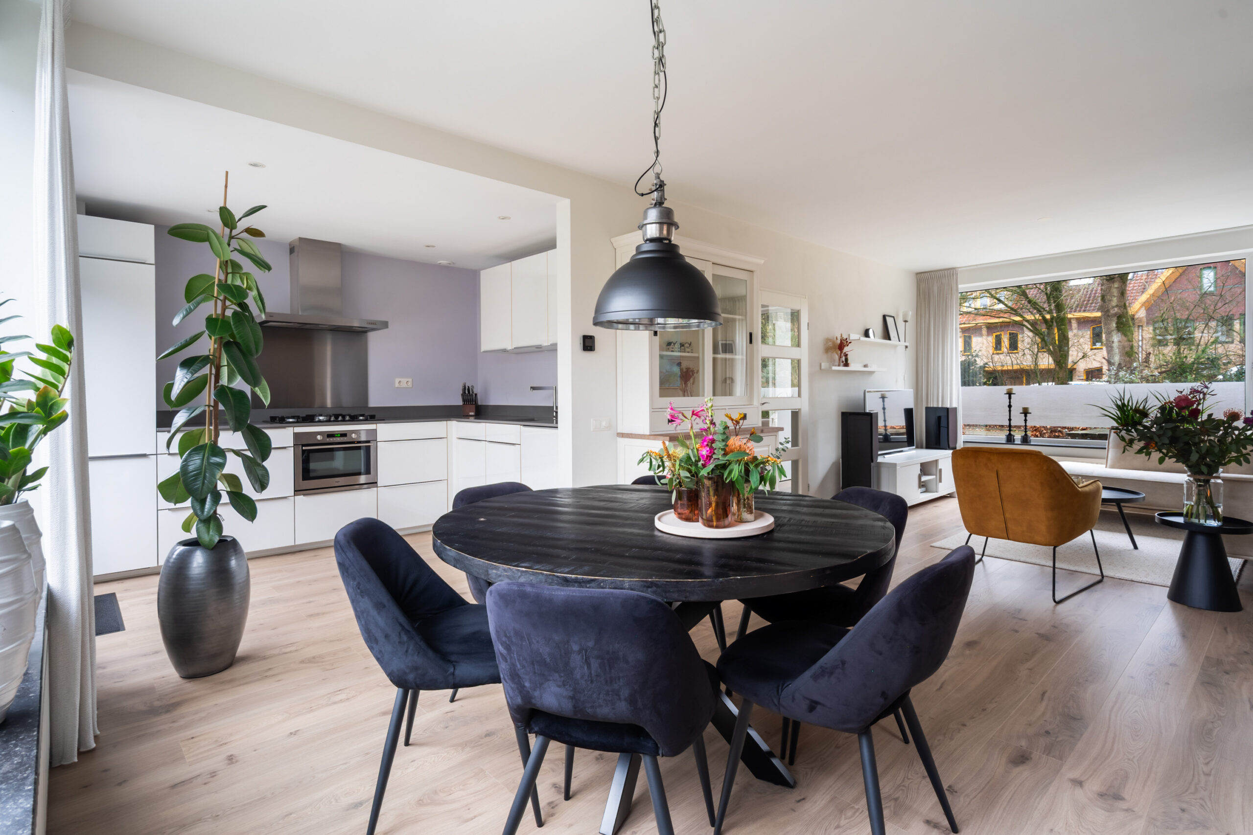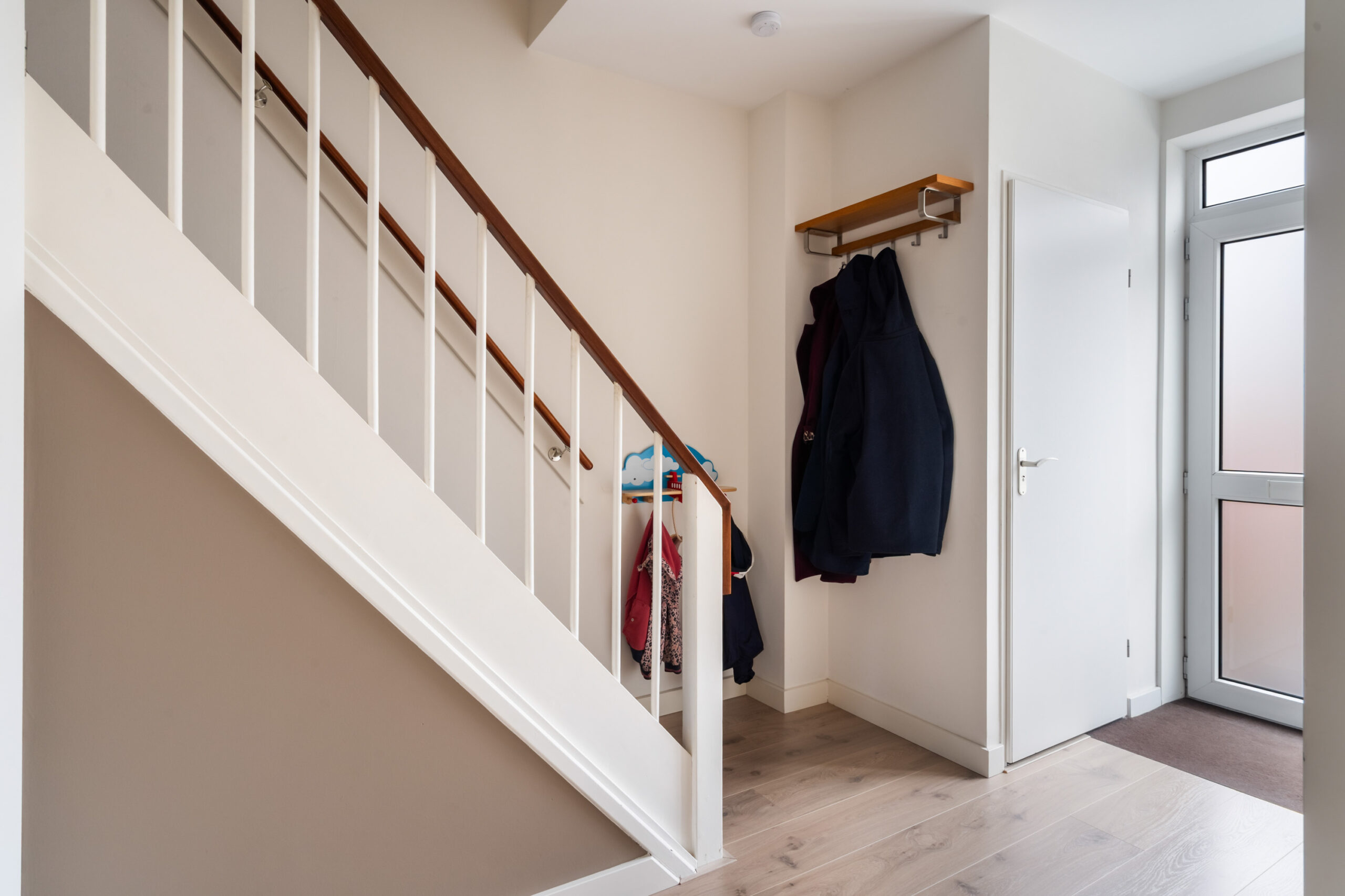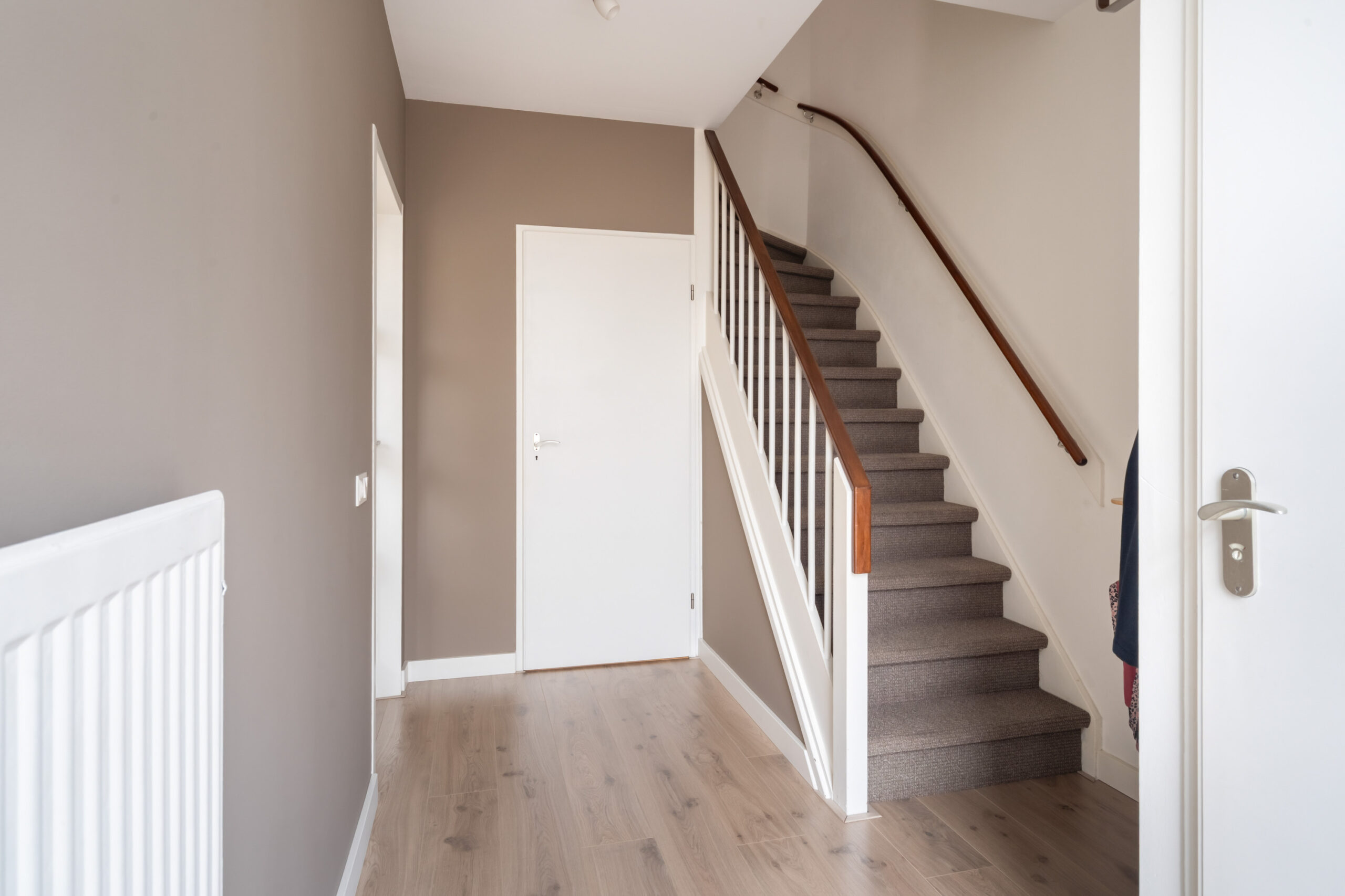 Hal, toilet, royale vaste kast (deels onder de trap) met daarin tevens de meterkast. Woonkamer met mooie laminaatvloer en open hoekkeuken met vaatwasser, koel-/vriescombinatie, 5-pits gaskookplaat, combi-oven en afzuigkap.