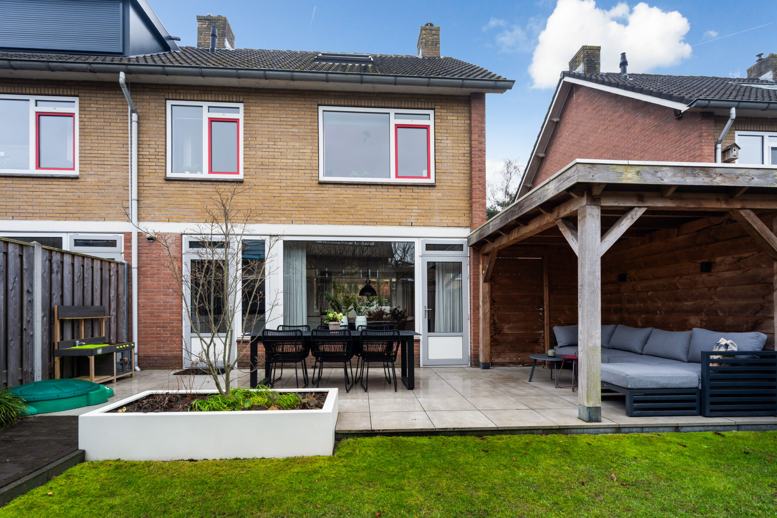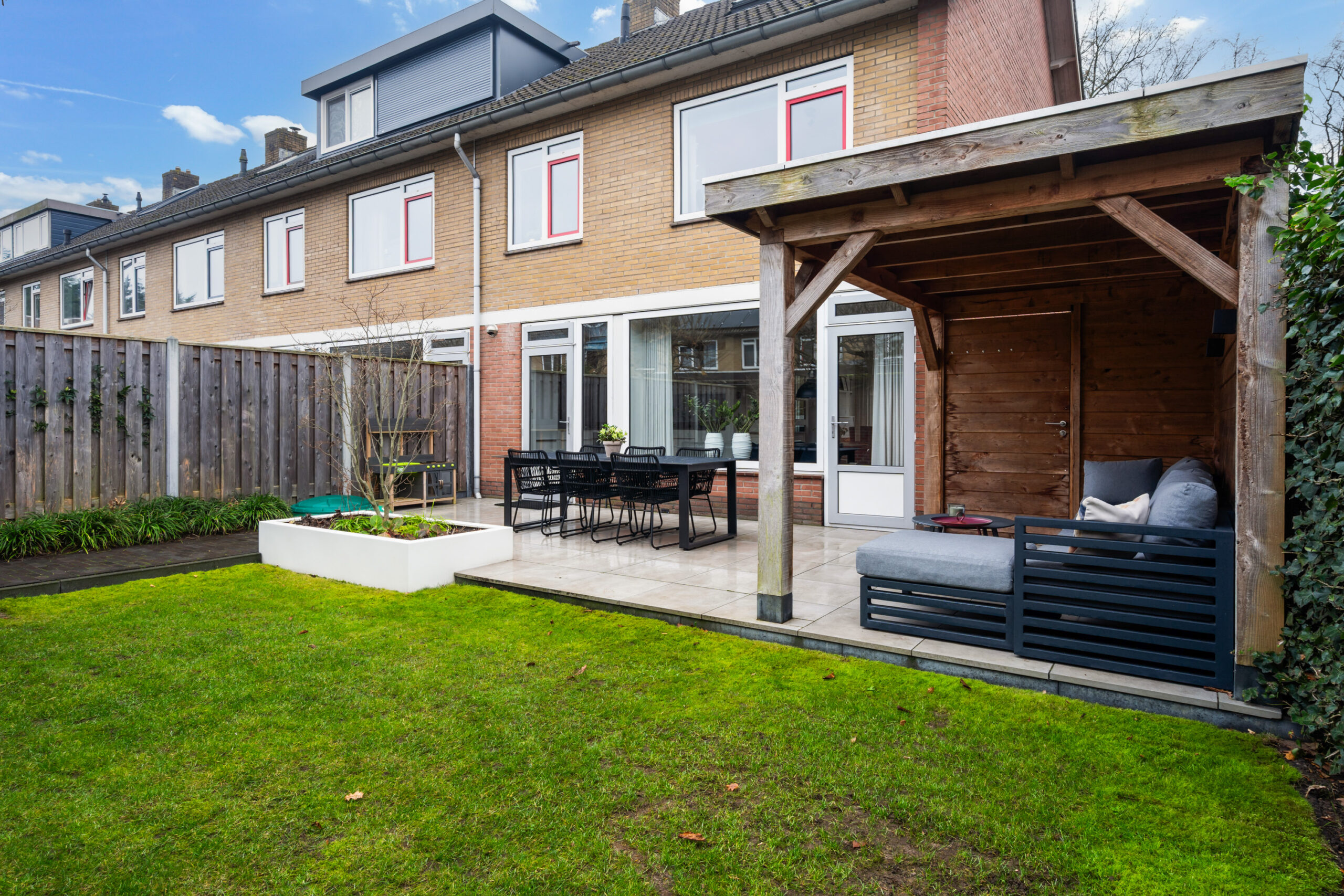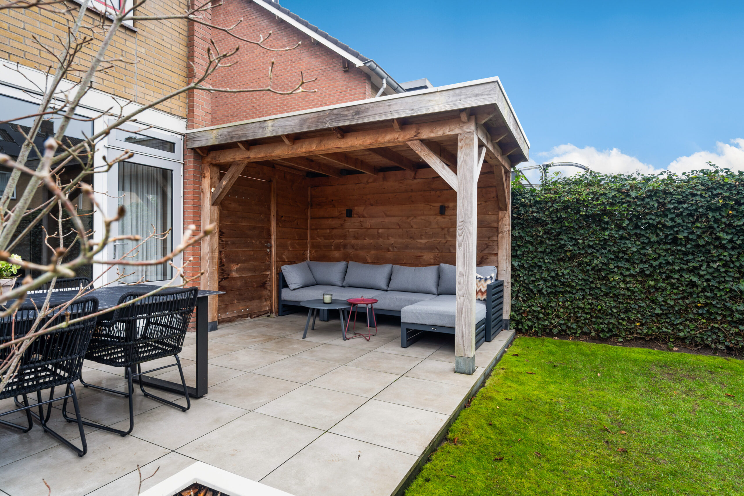 Onder de overkapping is een heerlijke plek gemaakt om het buitenleven optimaal te beleven.
