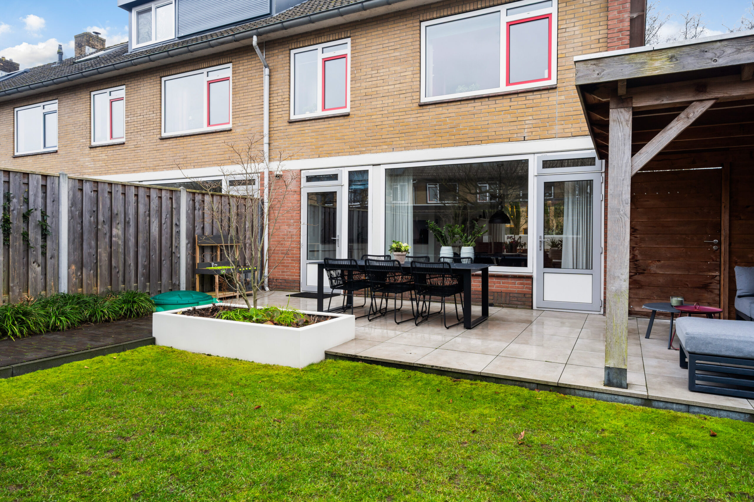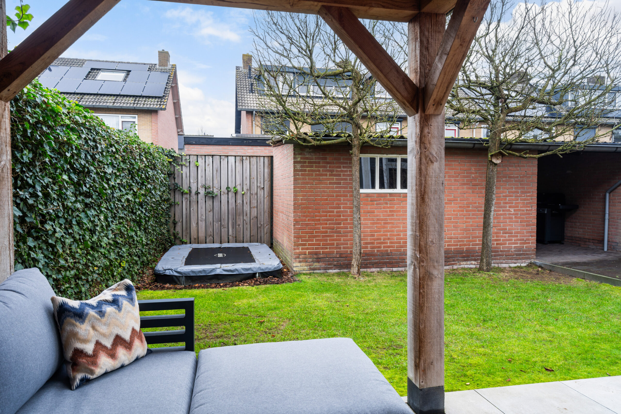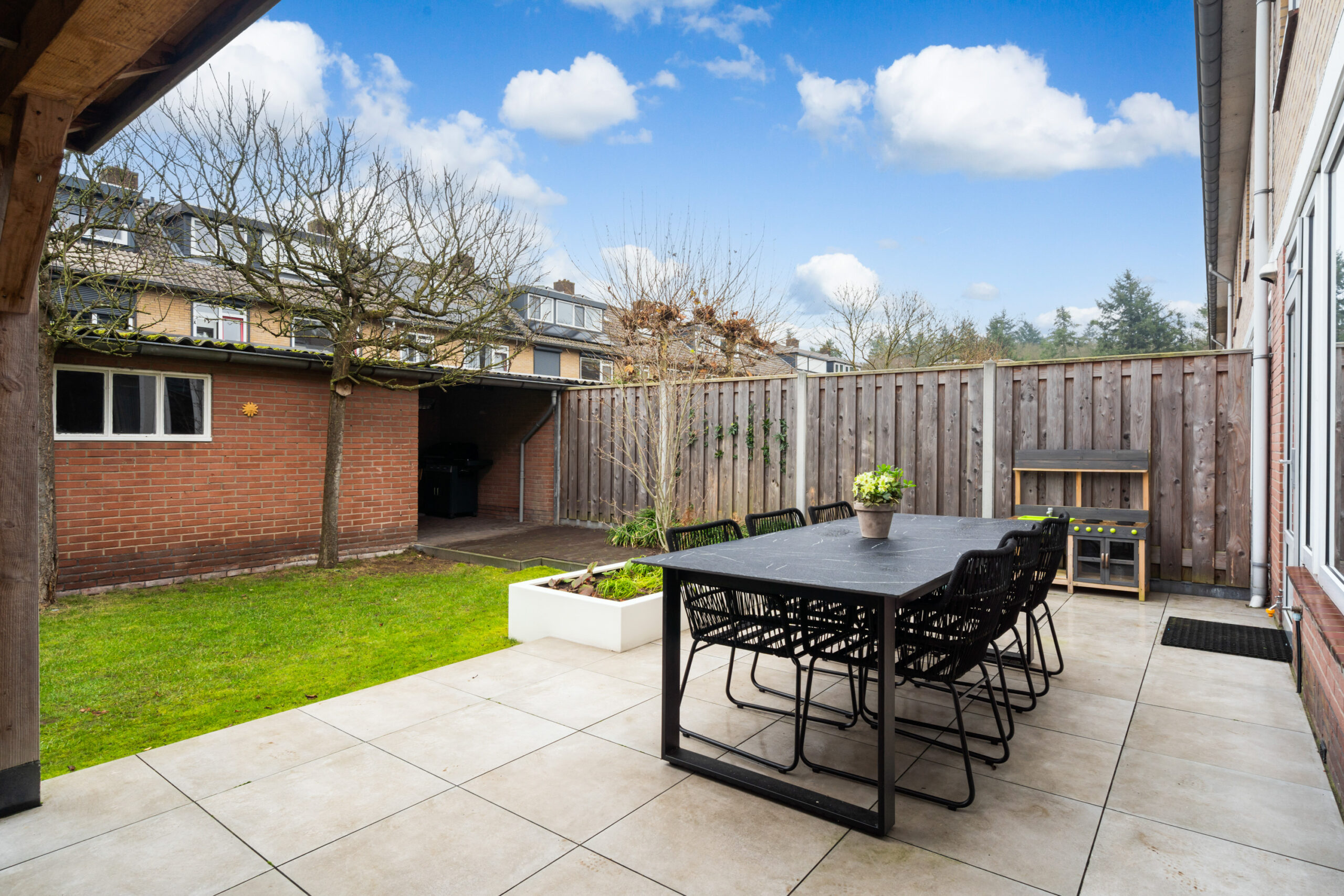 Onder de overkapping is een heerlijke plek gemaakt om het buitenleven optimaal te beleven.