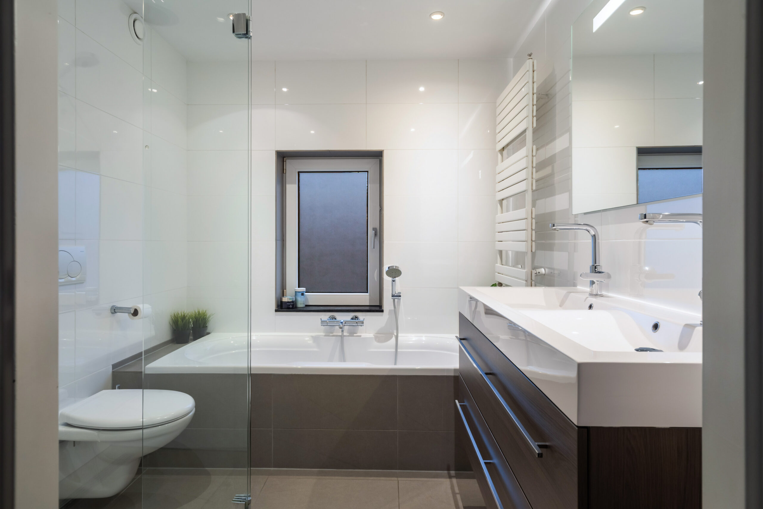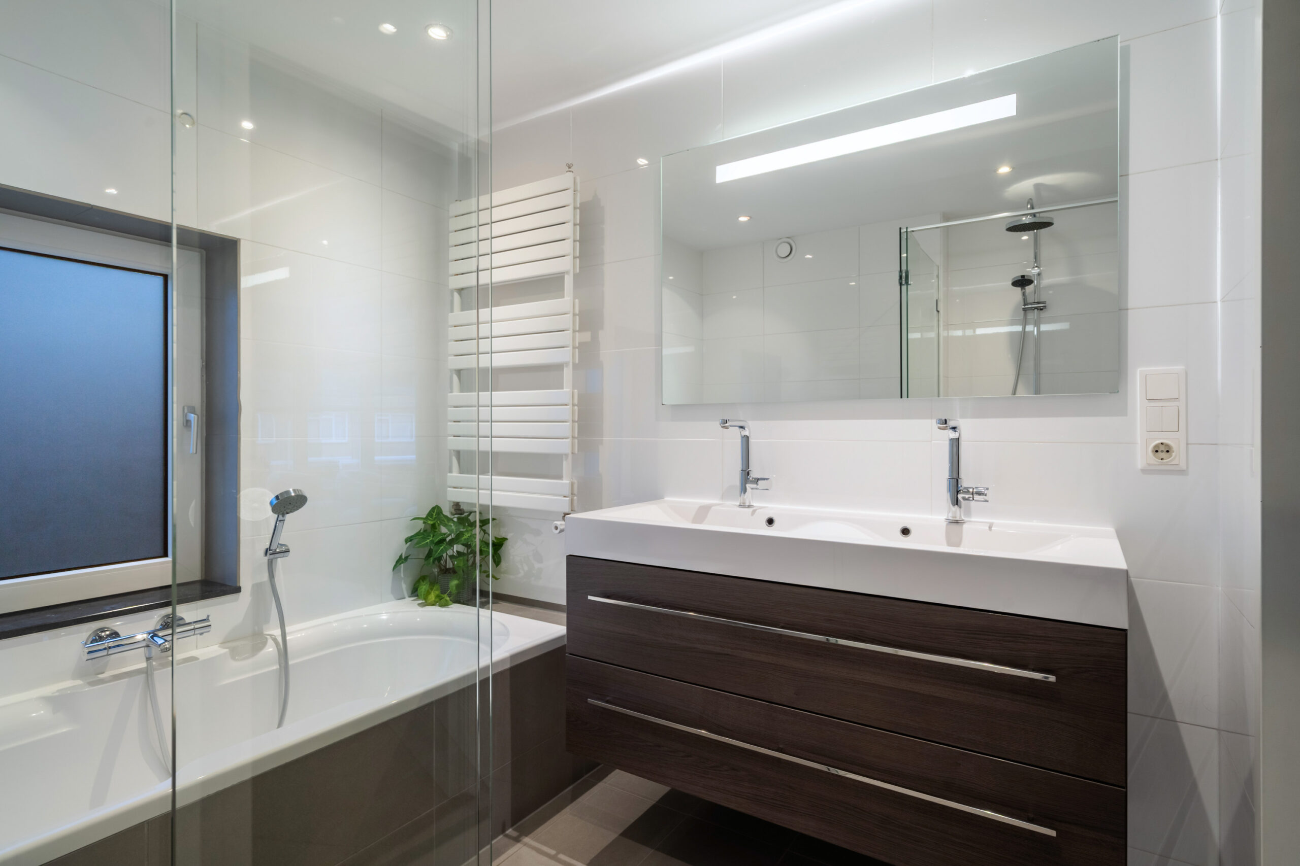 Overloop, 3 slaapkamers en badkamer met ligbad, inloopdouche, dubbele wastafel en 2e toilet. De hoofdslaapkamer is voorzien van een ruime vaste, inloopkast.