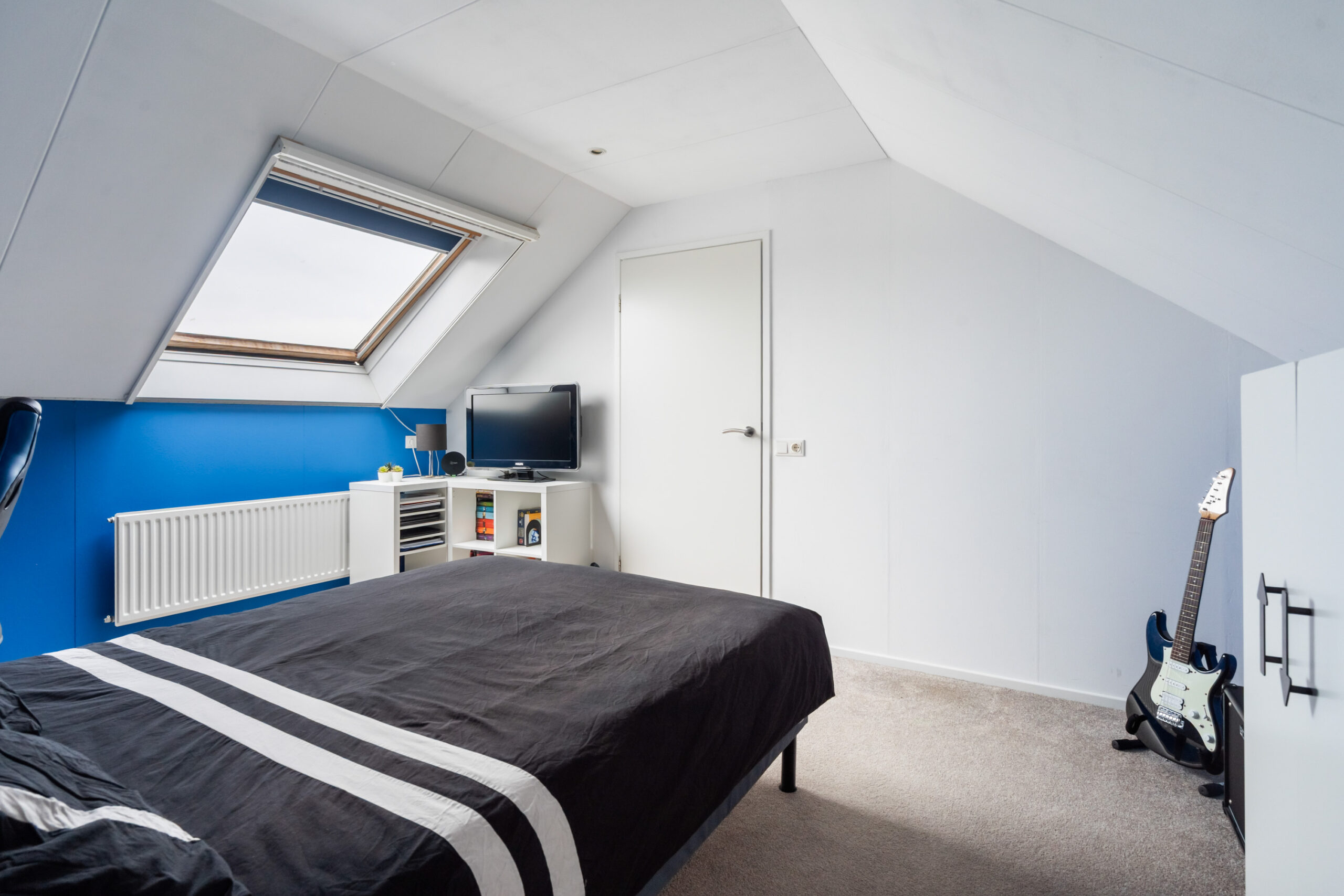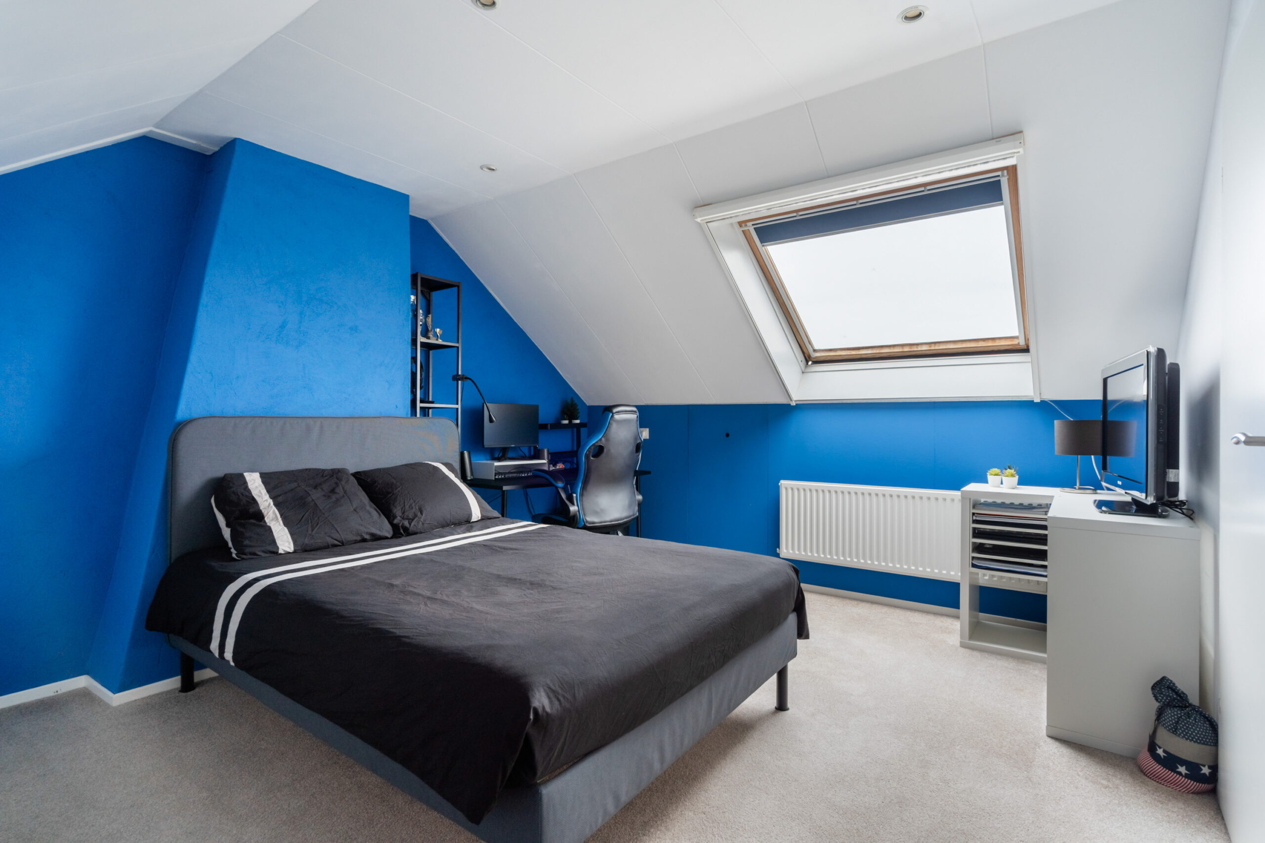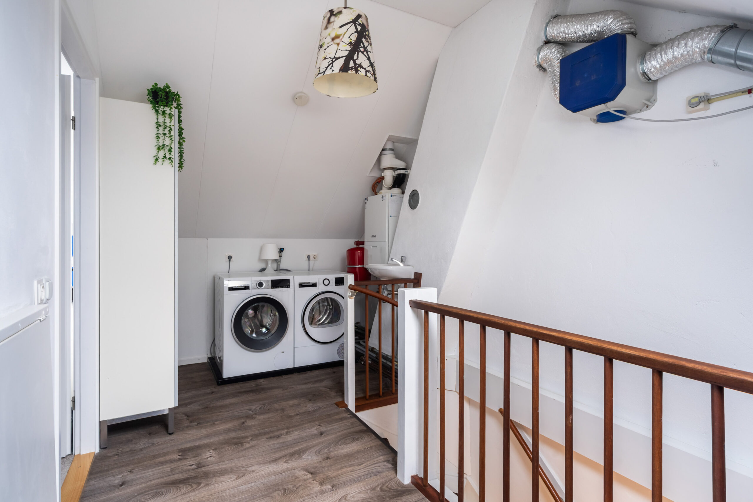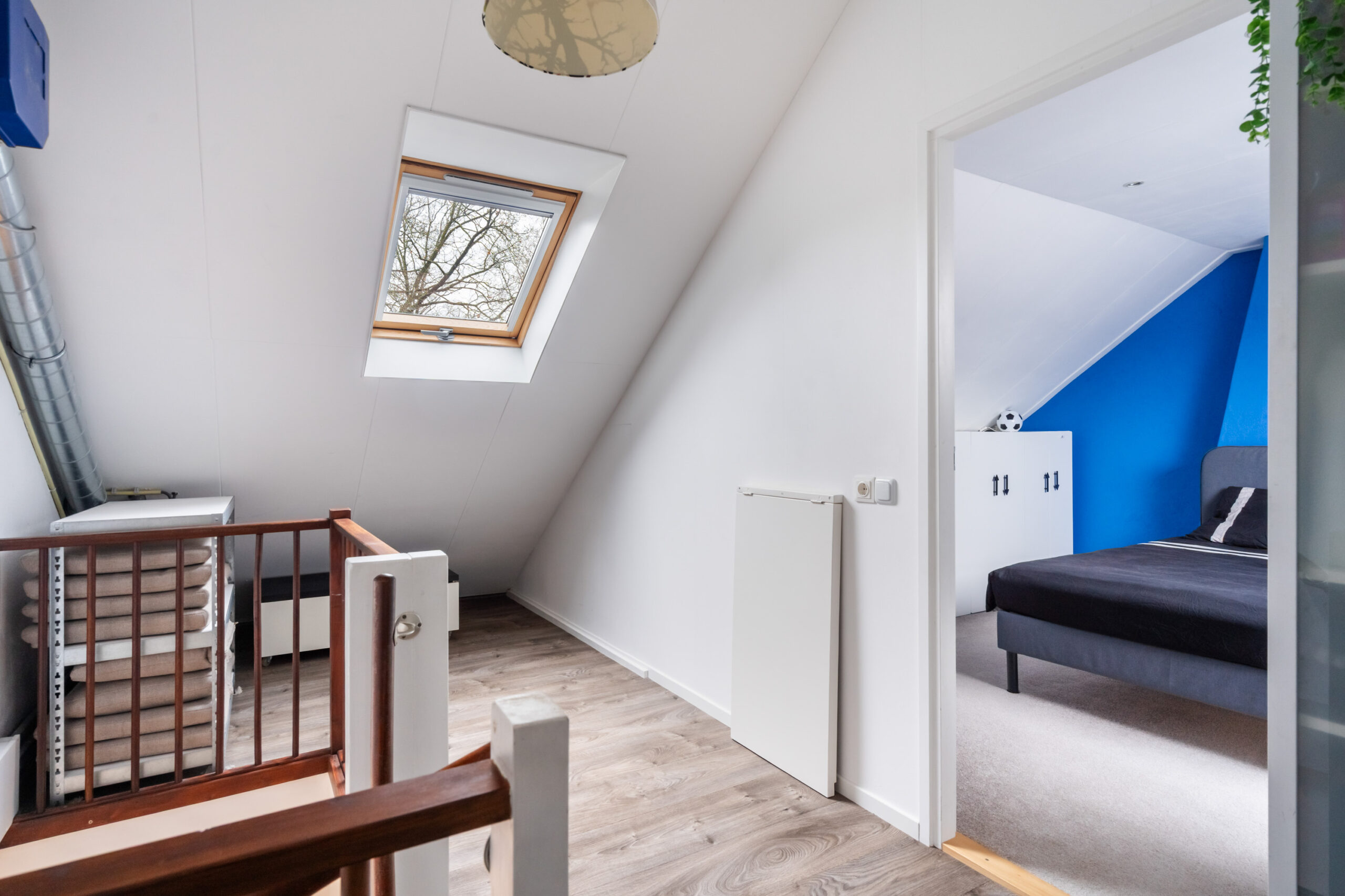Voorzolder/overloop met bergruimte, wasmachine-aansluiting en C.v.-ketel en een 4e slaapkamer met dakraam, radiator en bergruimte.