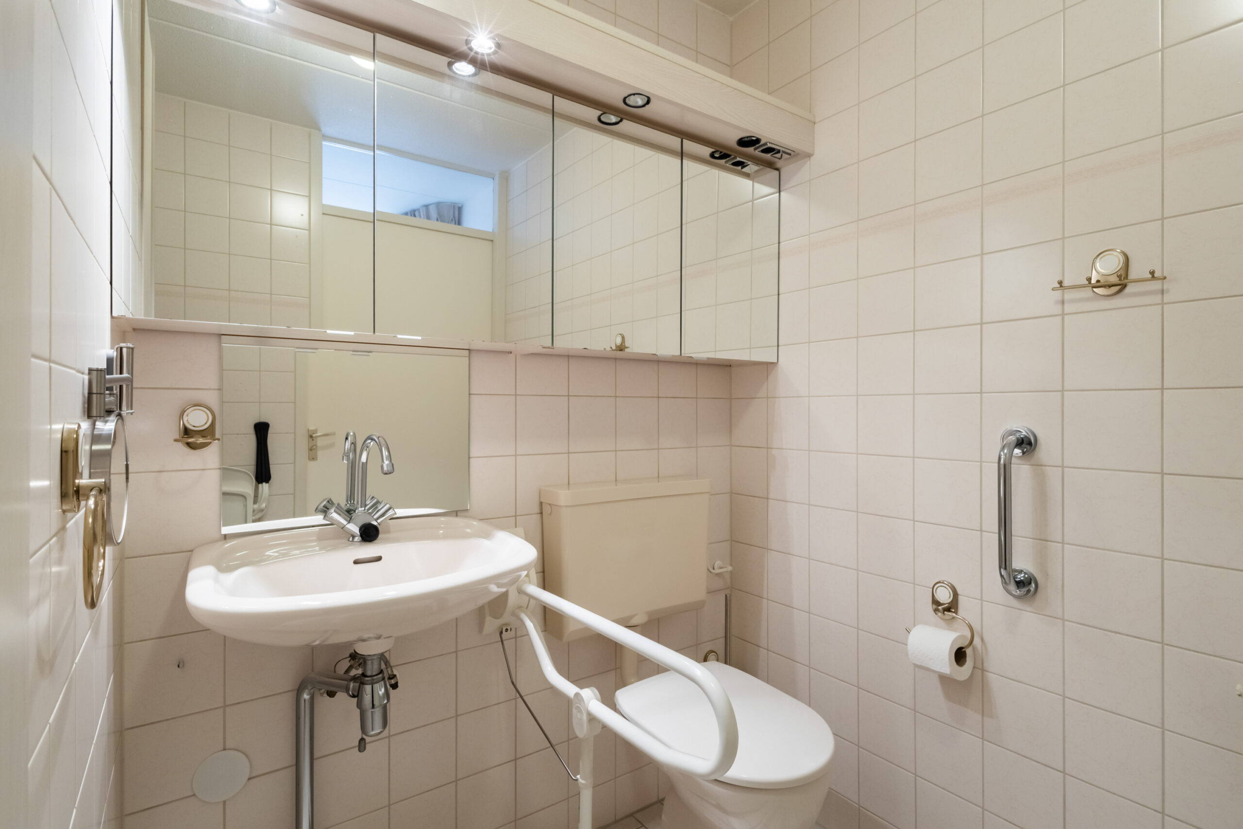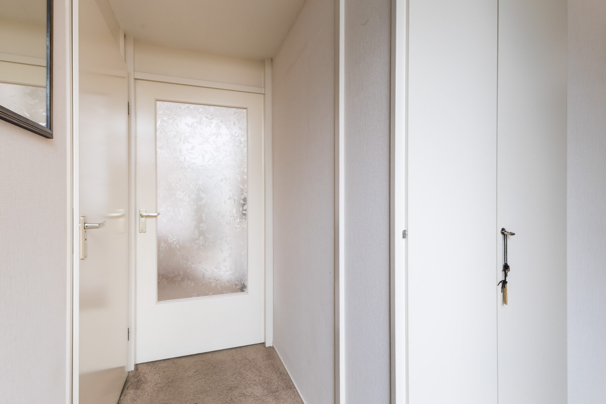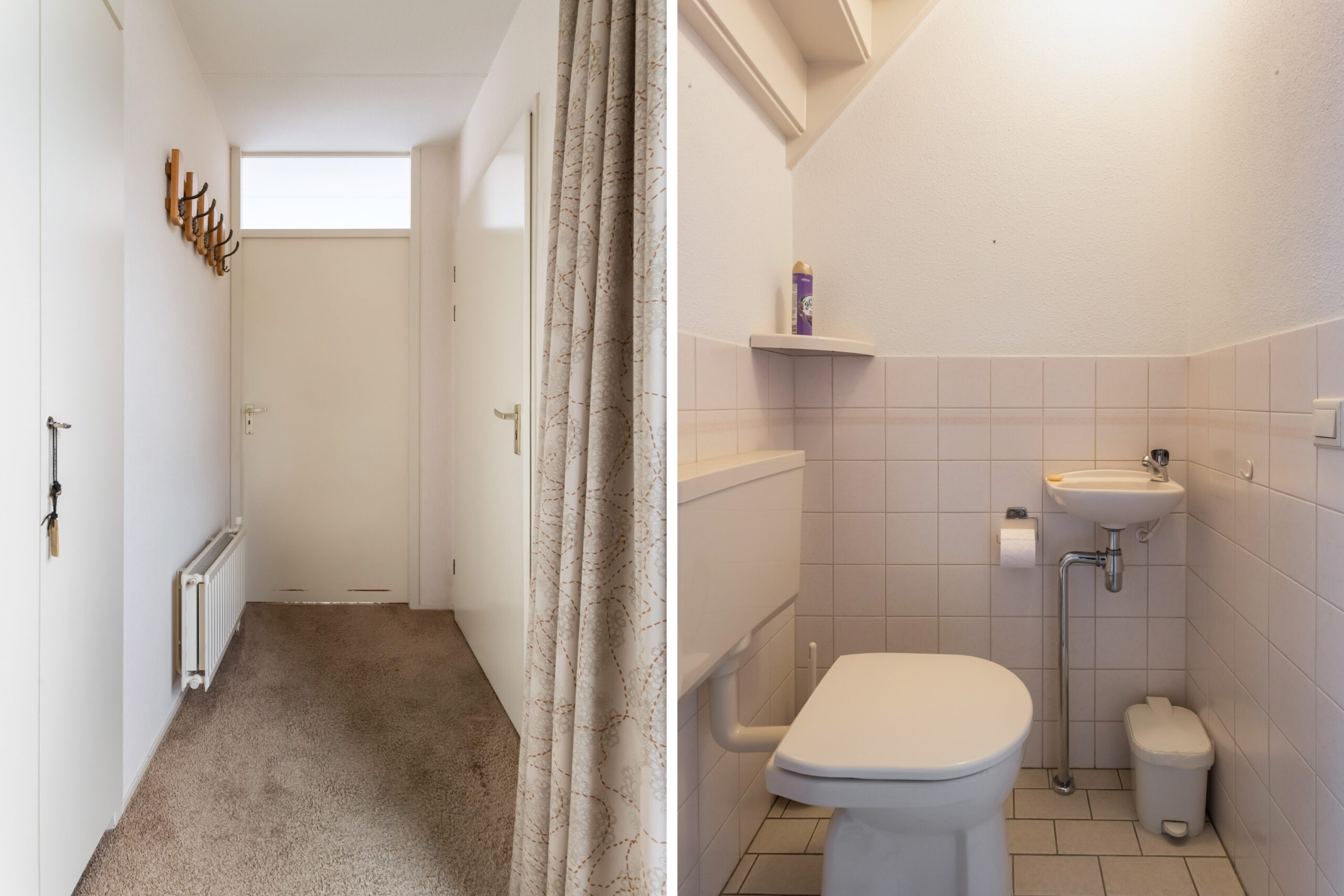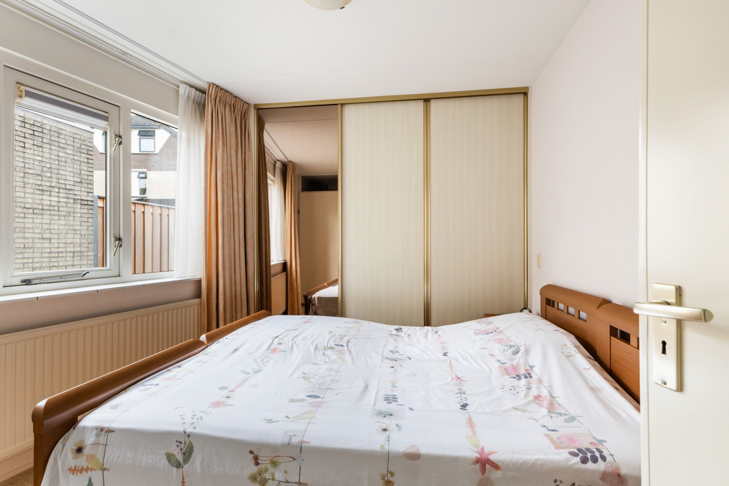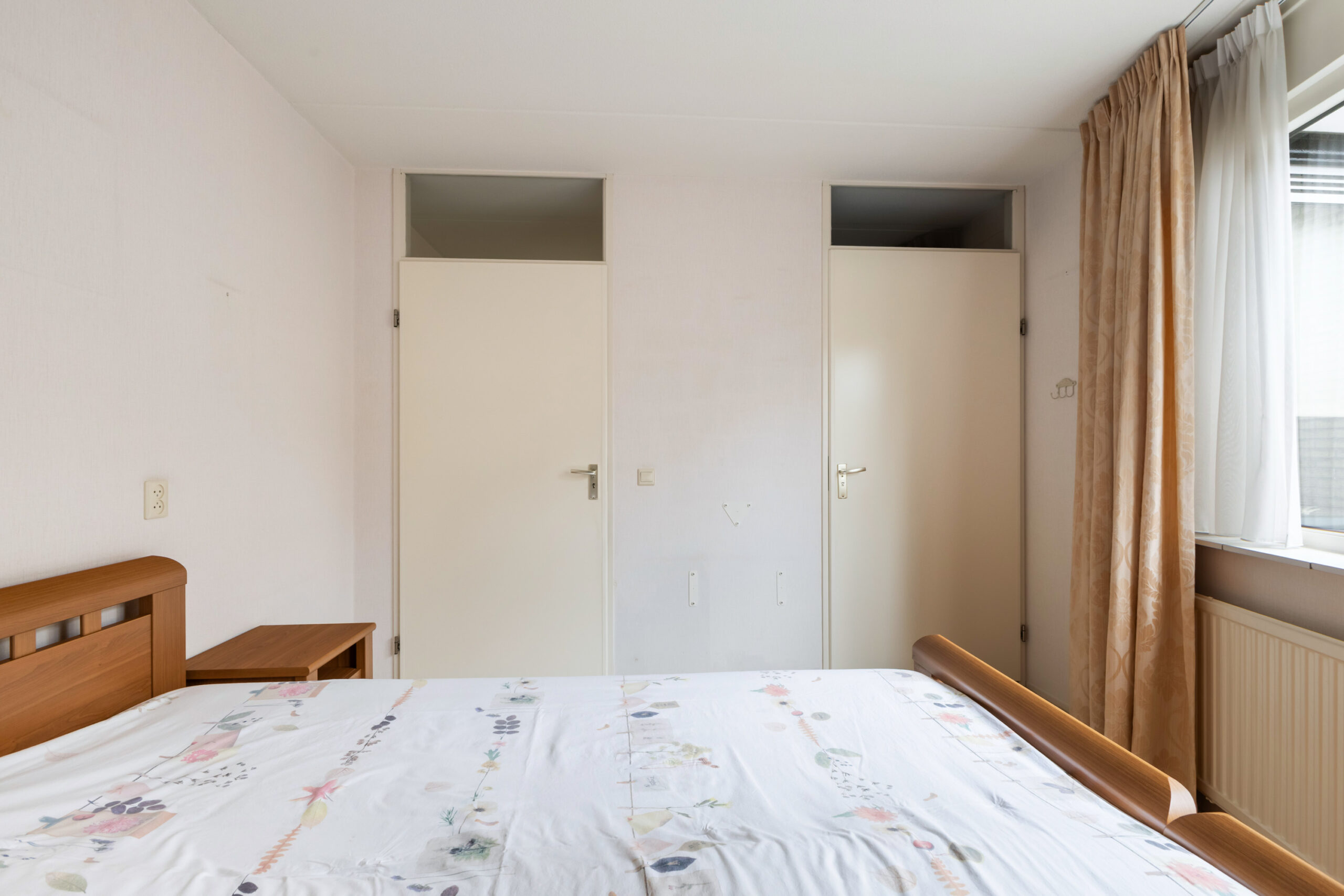 Vanuit de hal toegang tot de 1e slaapkamer voorzien van vaste kastenwand met schuifdeuren, aangrenzende badkamer met douche, wastafel en toilet. Tevens heeft u vanuit de hal toegang tot de aangebouwde garage.