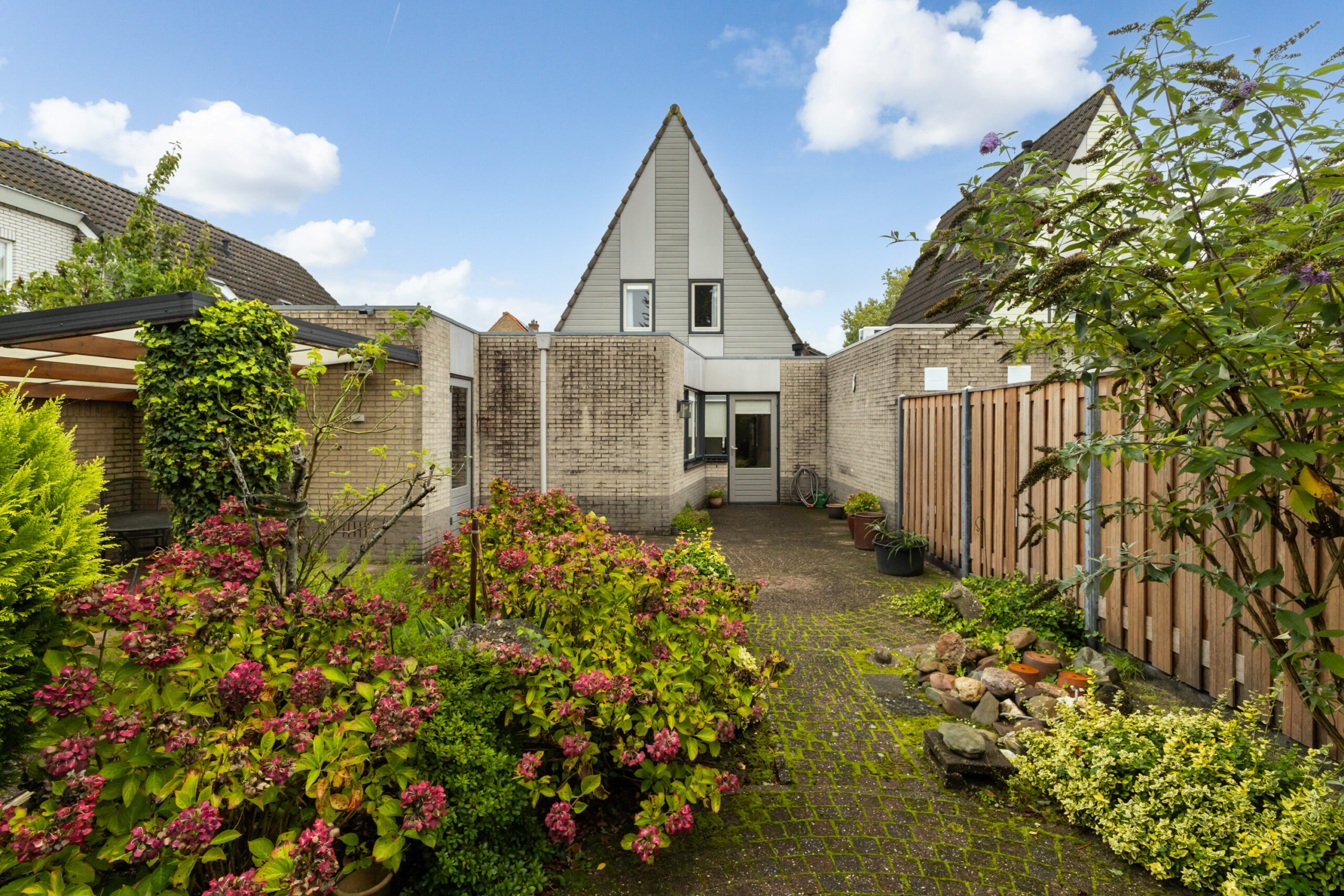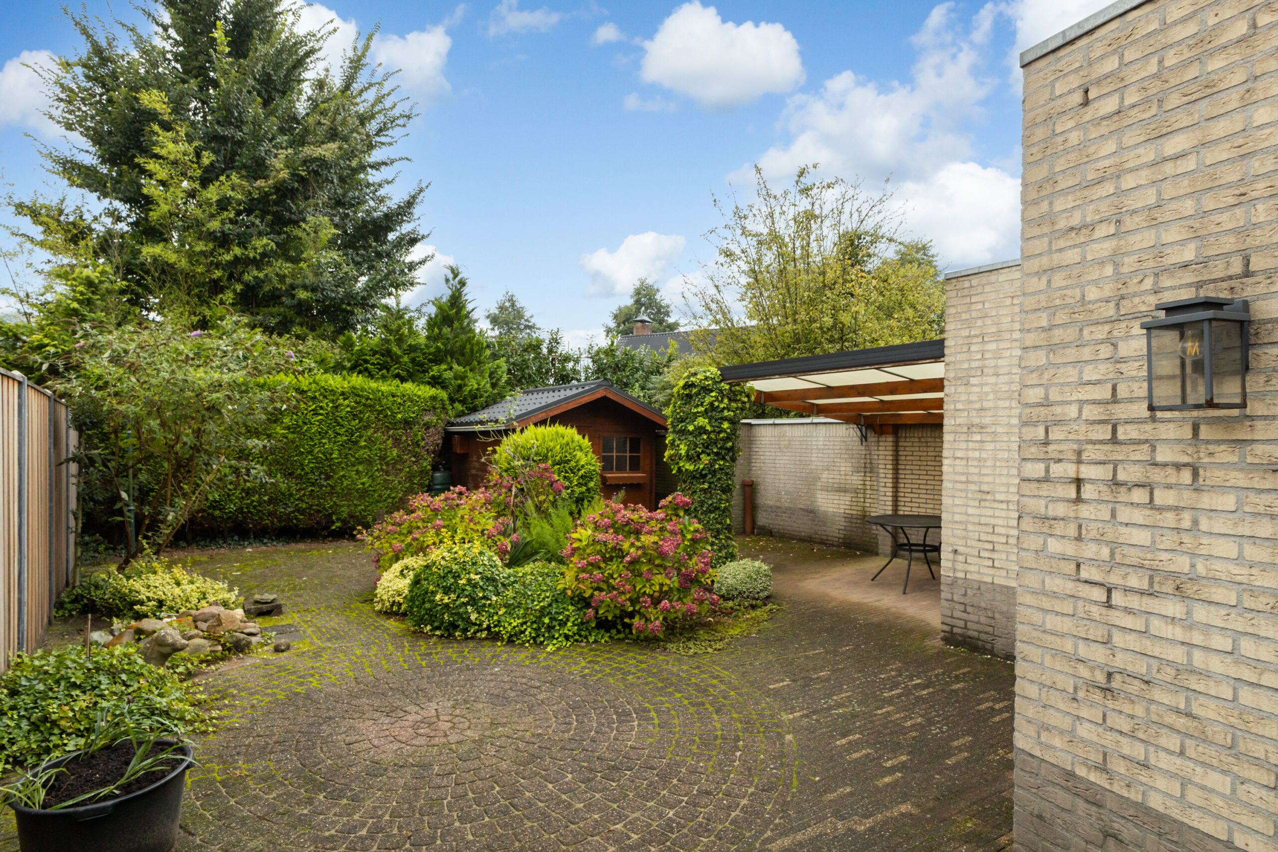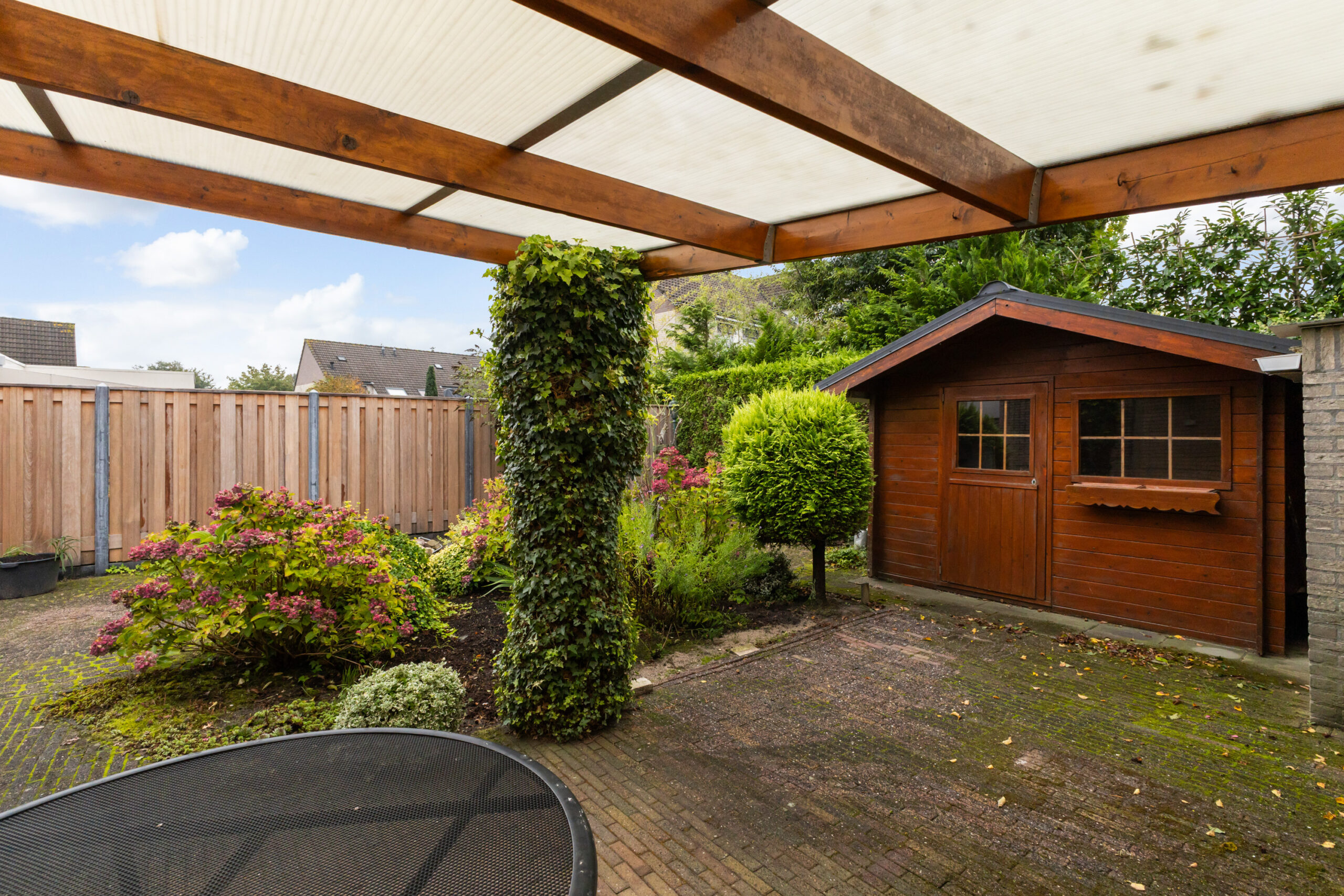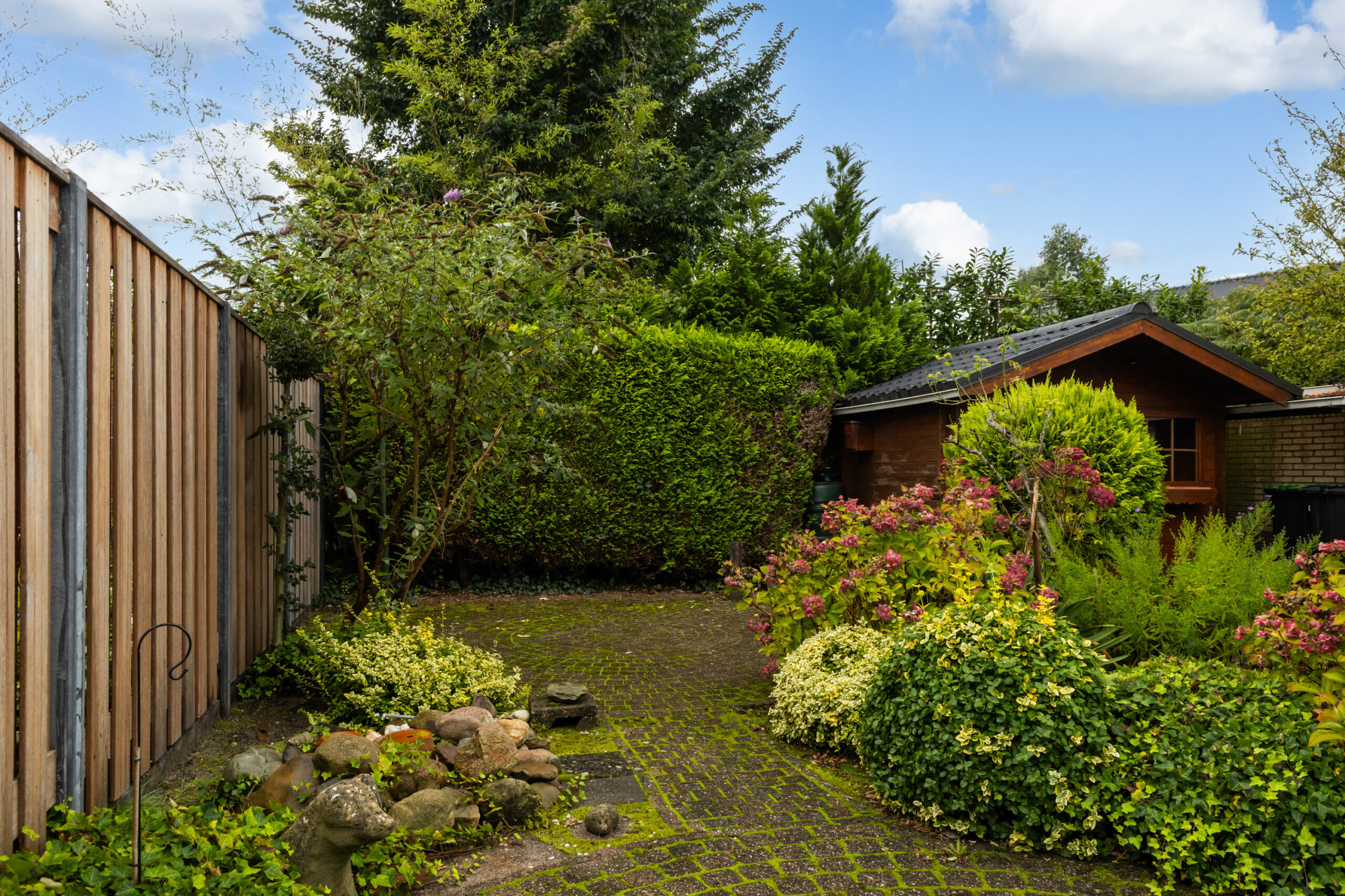 De voortuin is onderhoudsvriendelijk aangelegd en voorzien van sierbestrating met grind een een aantal borders met beplanting. De fijne en privacy-volle achtertuin is gesitueerd op het zuidwesten en voorzien van sierbestrating met in het midden van de tuin een border voorzien van diverse beplanting, een overdekt terras direct achter de garage en een houten berging/tuinhuis.