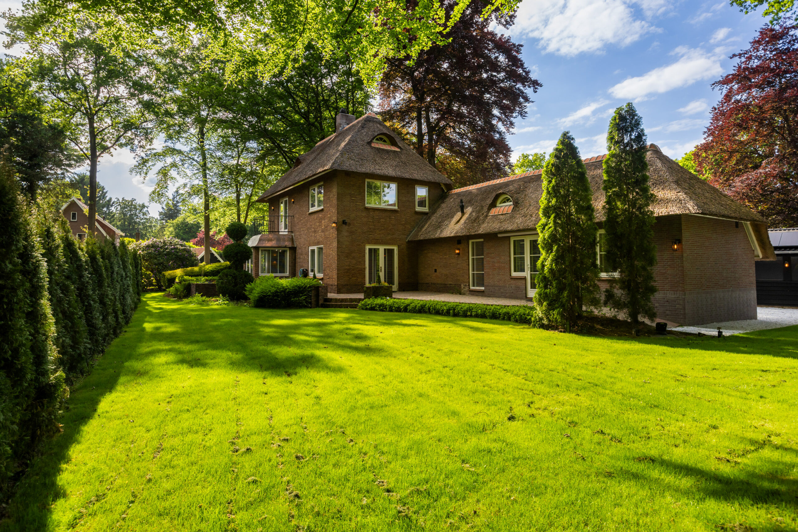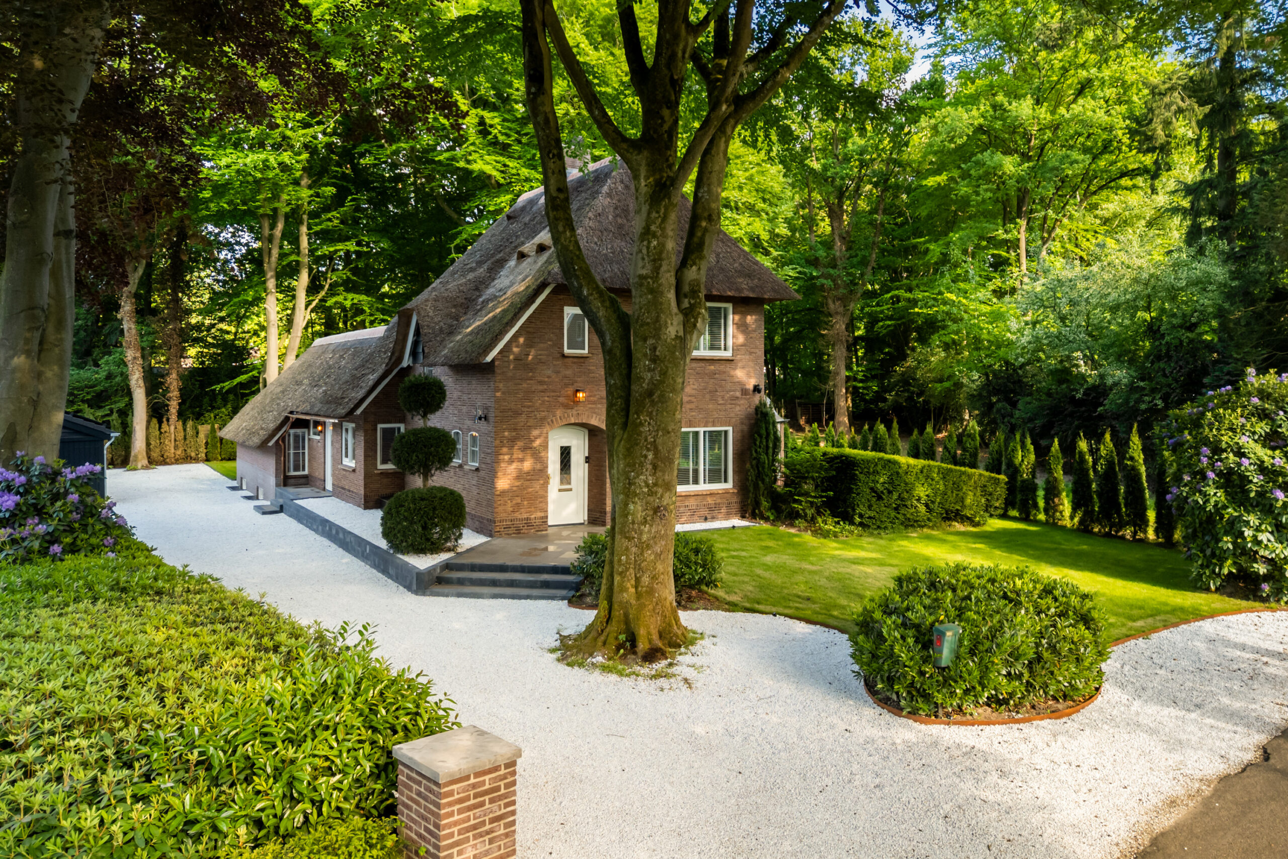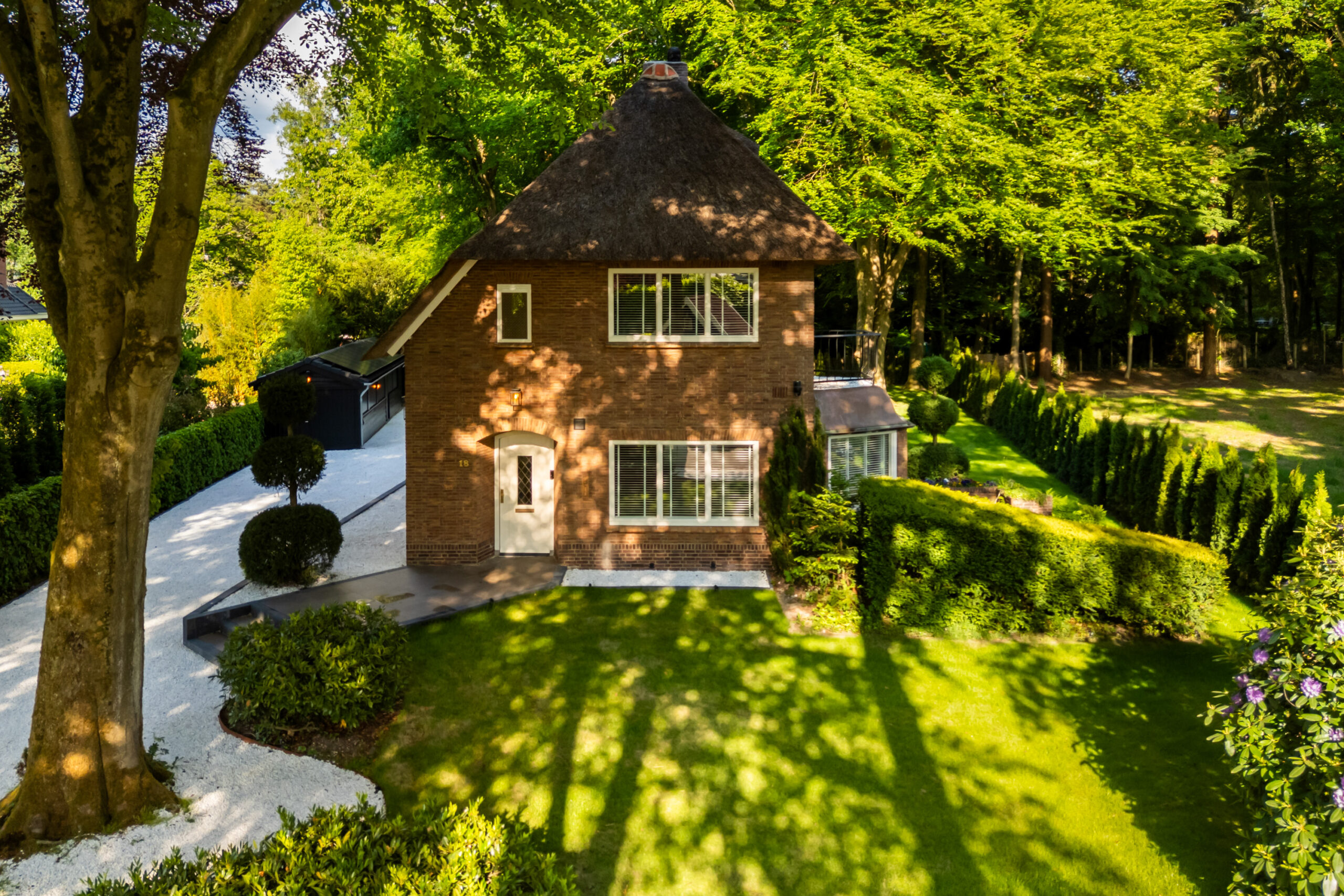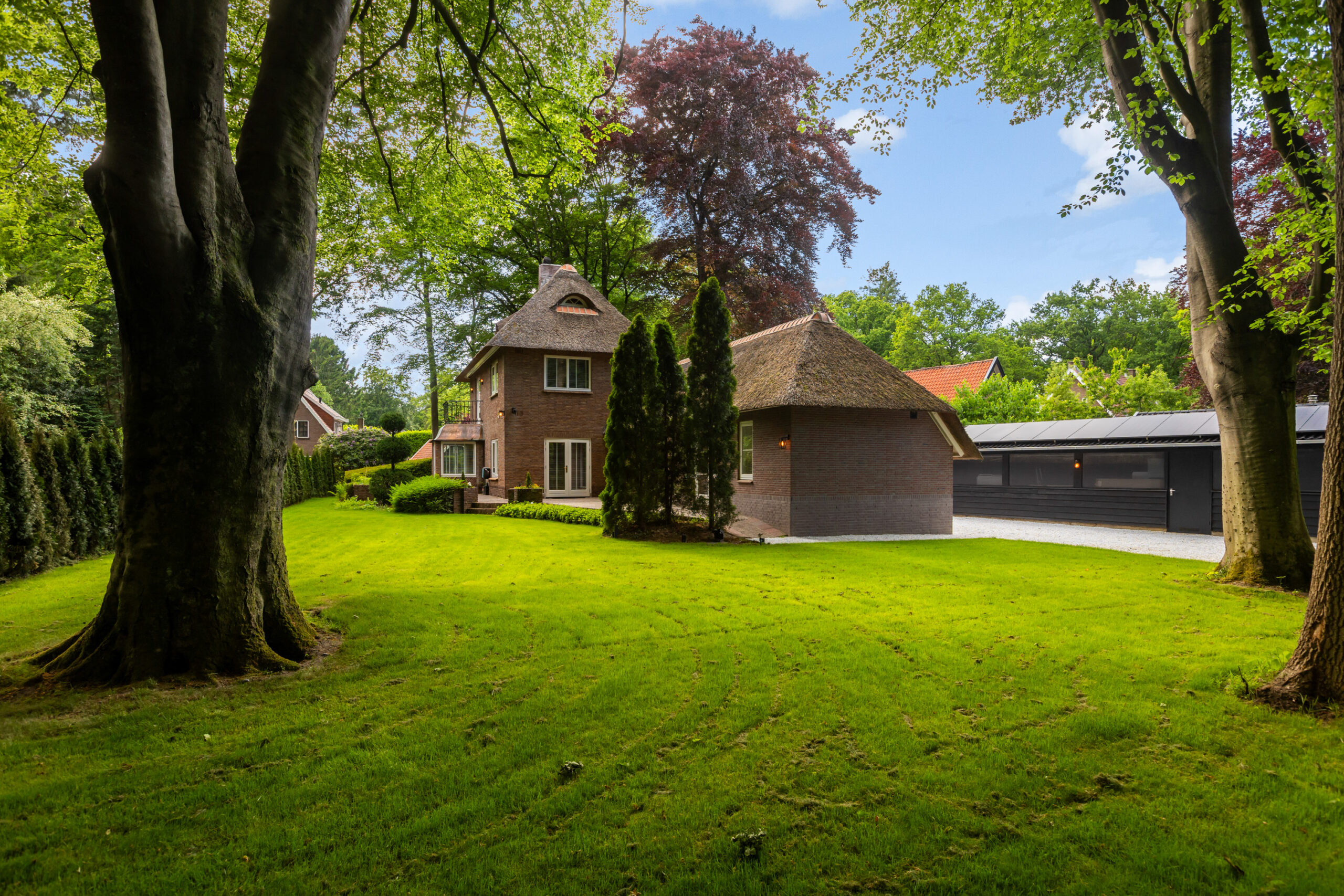 Op een fenomenale locatie aan de rand van de uitgestrekte Veluwse bossen, enigszins verscholen in het groen, bevindt zich aan een prachtige laan vol volgroeide bomen en veel openbaar groen deze schitterende rietgedekte villa met bijgebouw op een onder architectuur aangelegd perceel van circa 1.085 m².