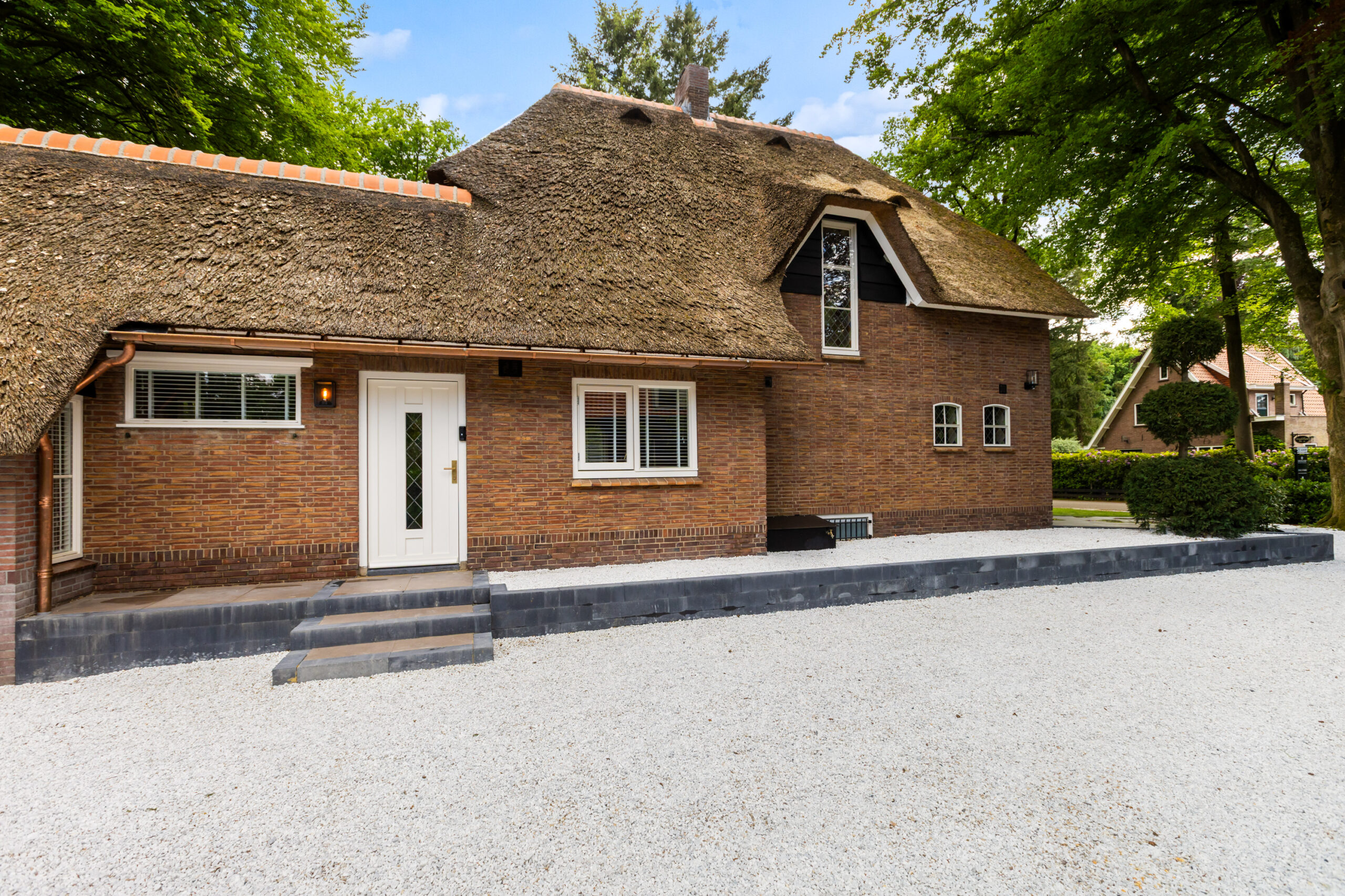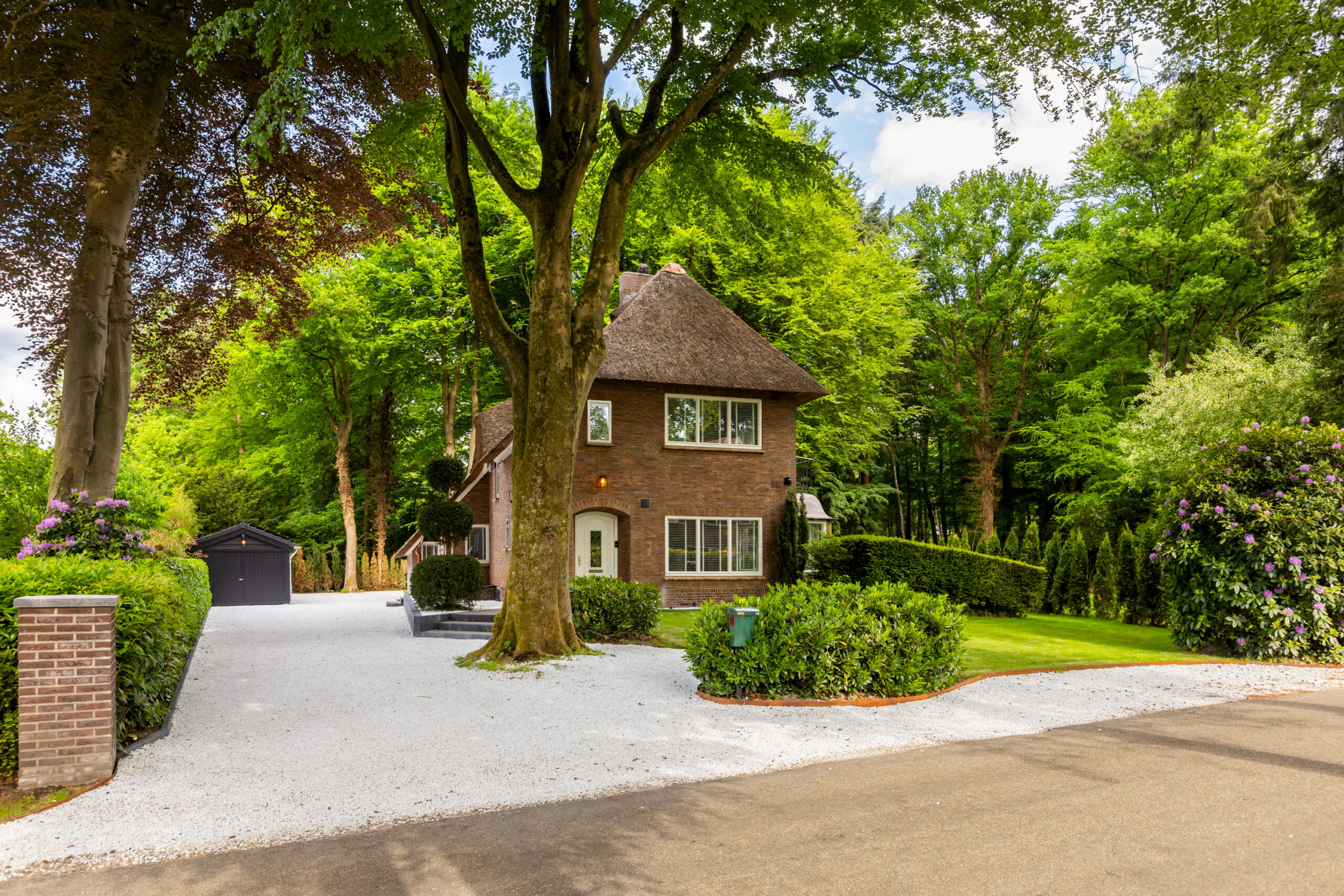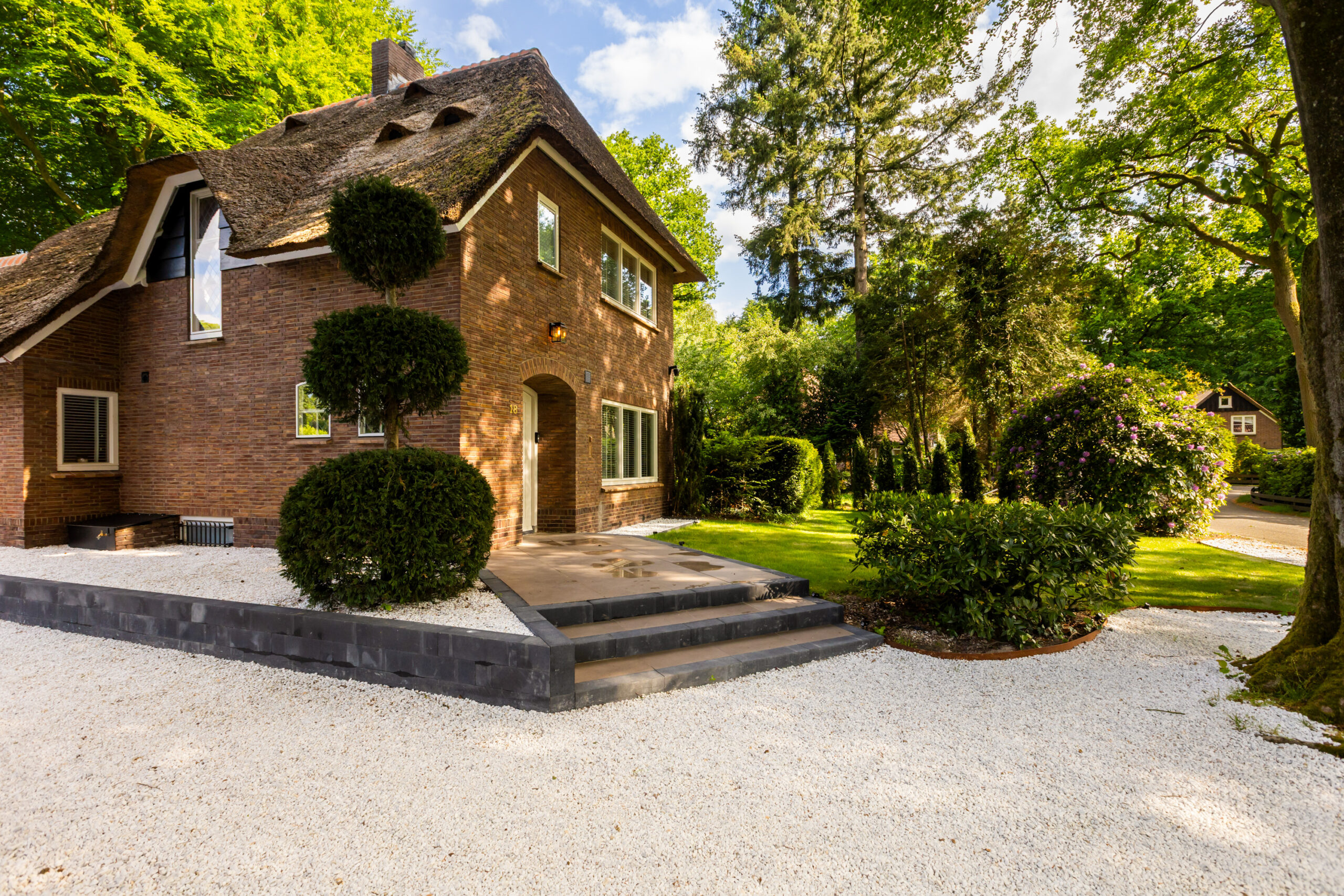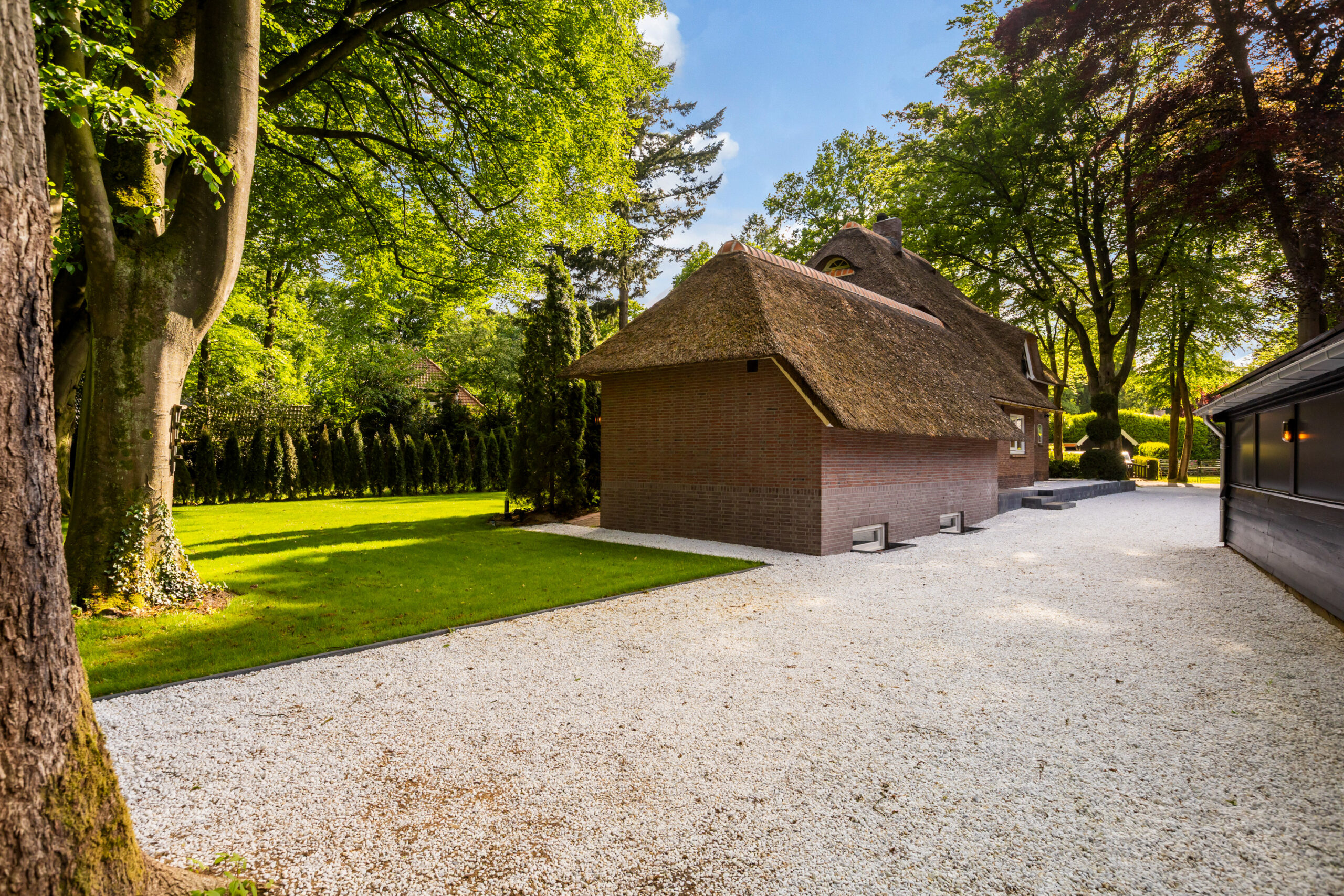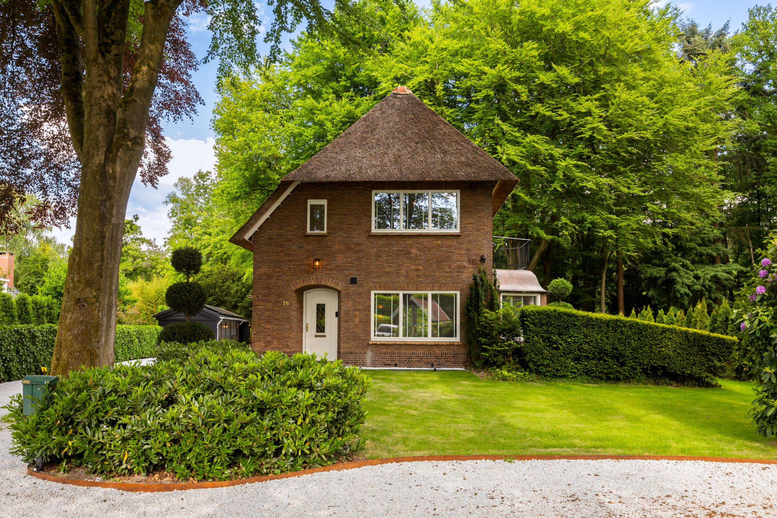 Op een fenomenale locatie aan de rand van de uitgestrekte Veluwse bossen, enigszins verscholen in het groen, bevindt zich aan een prachtige laan vol volgroeide bomen en veel openbaar groen deze schitterende rietgedekte villa met bijgebouw op een onder architectuur aangelegd perceel van circa 1.085 m².