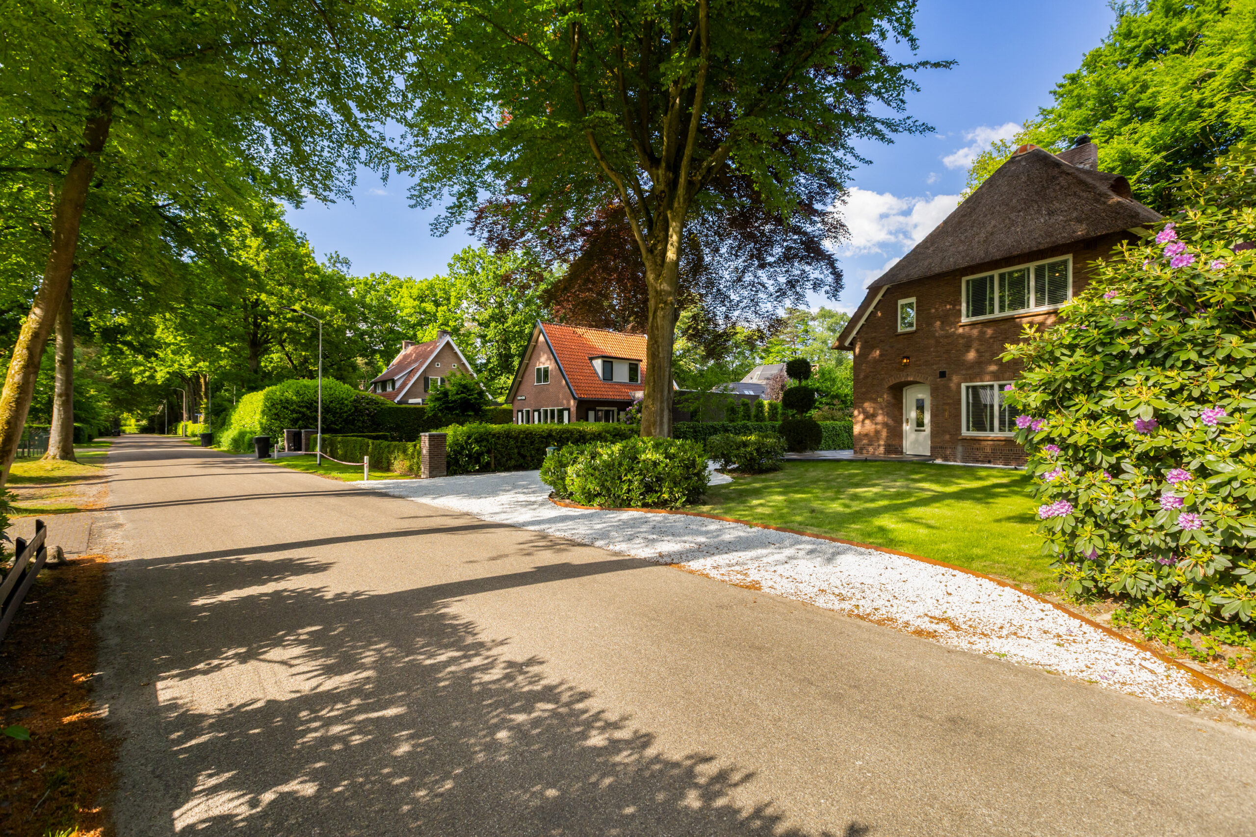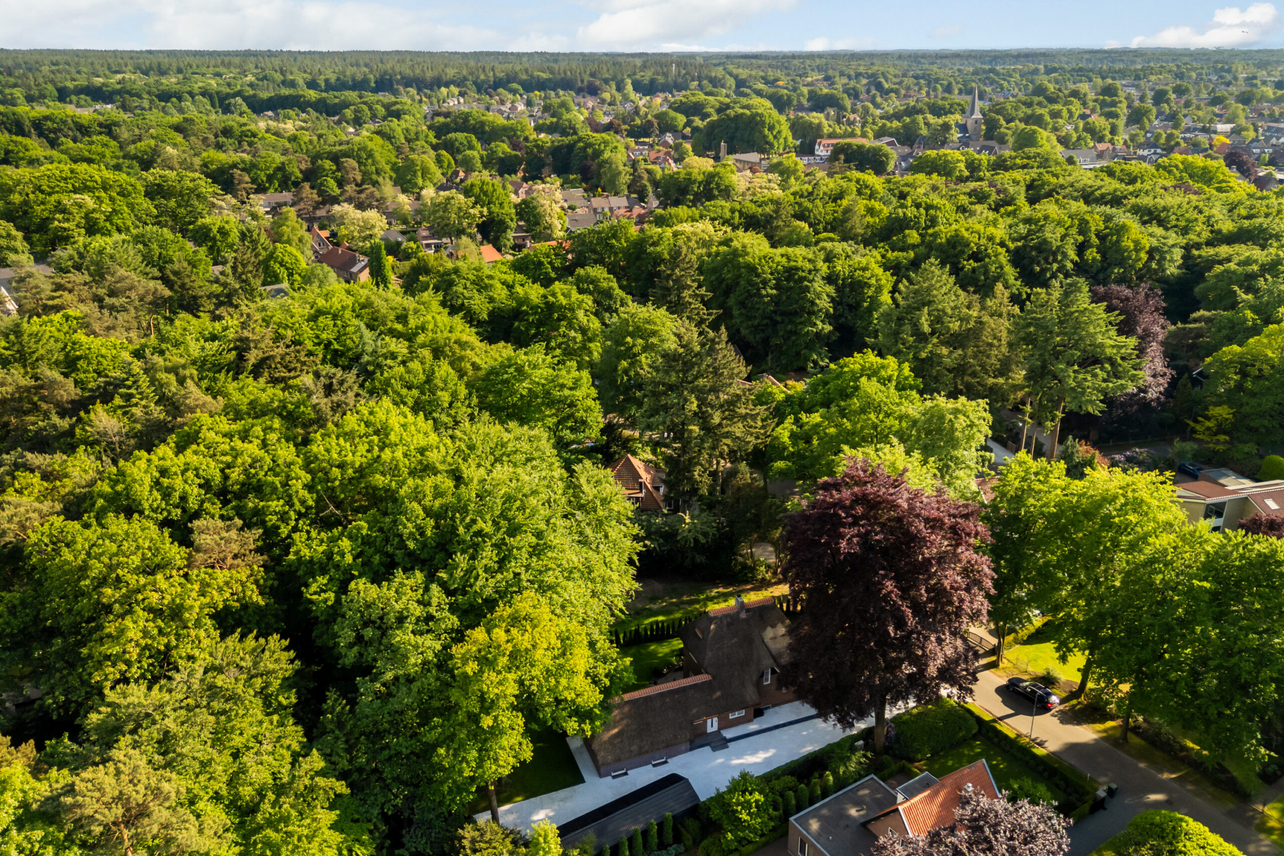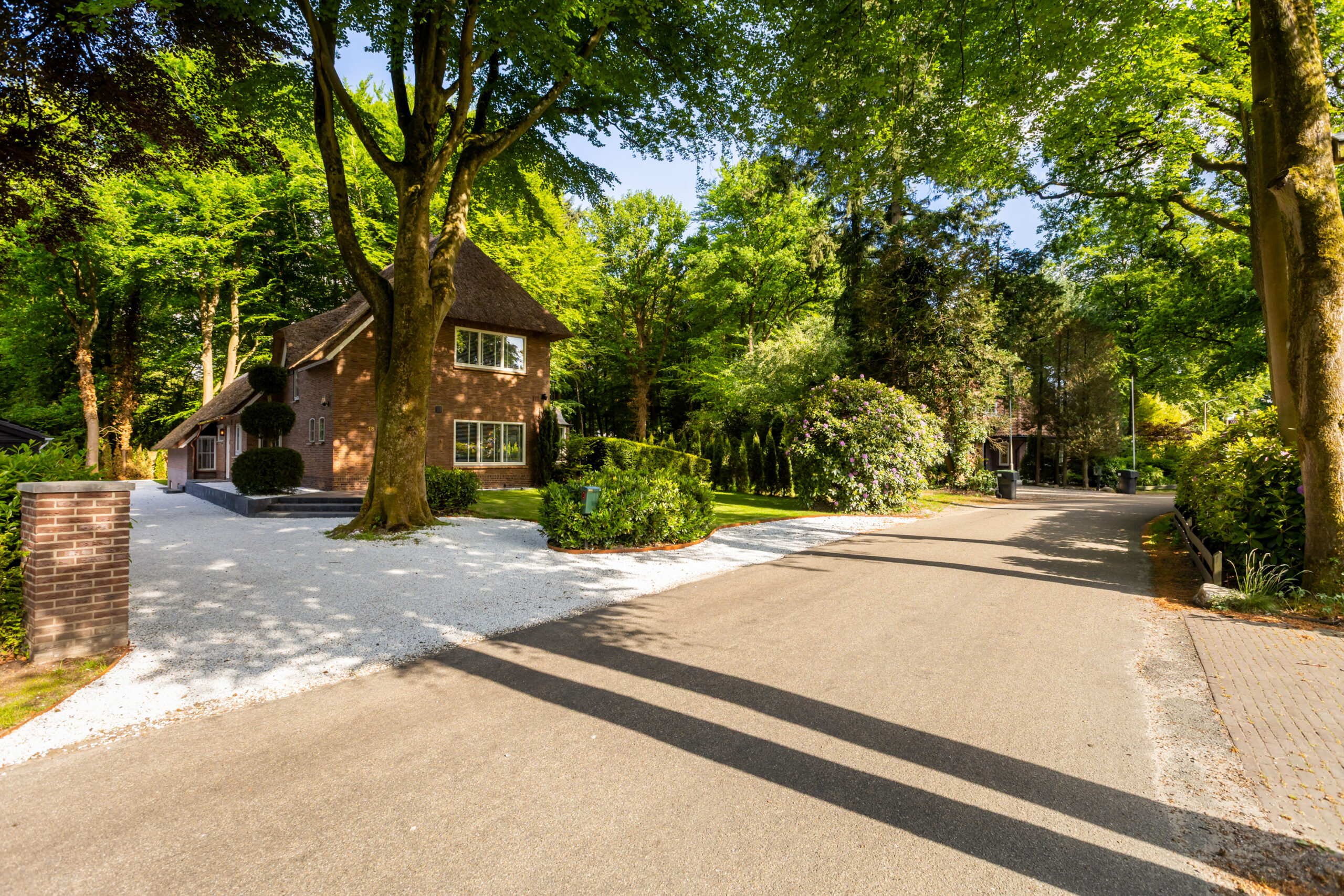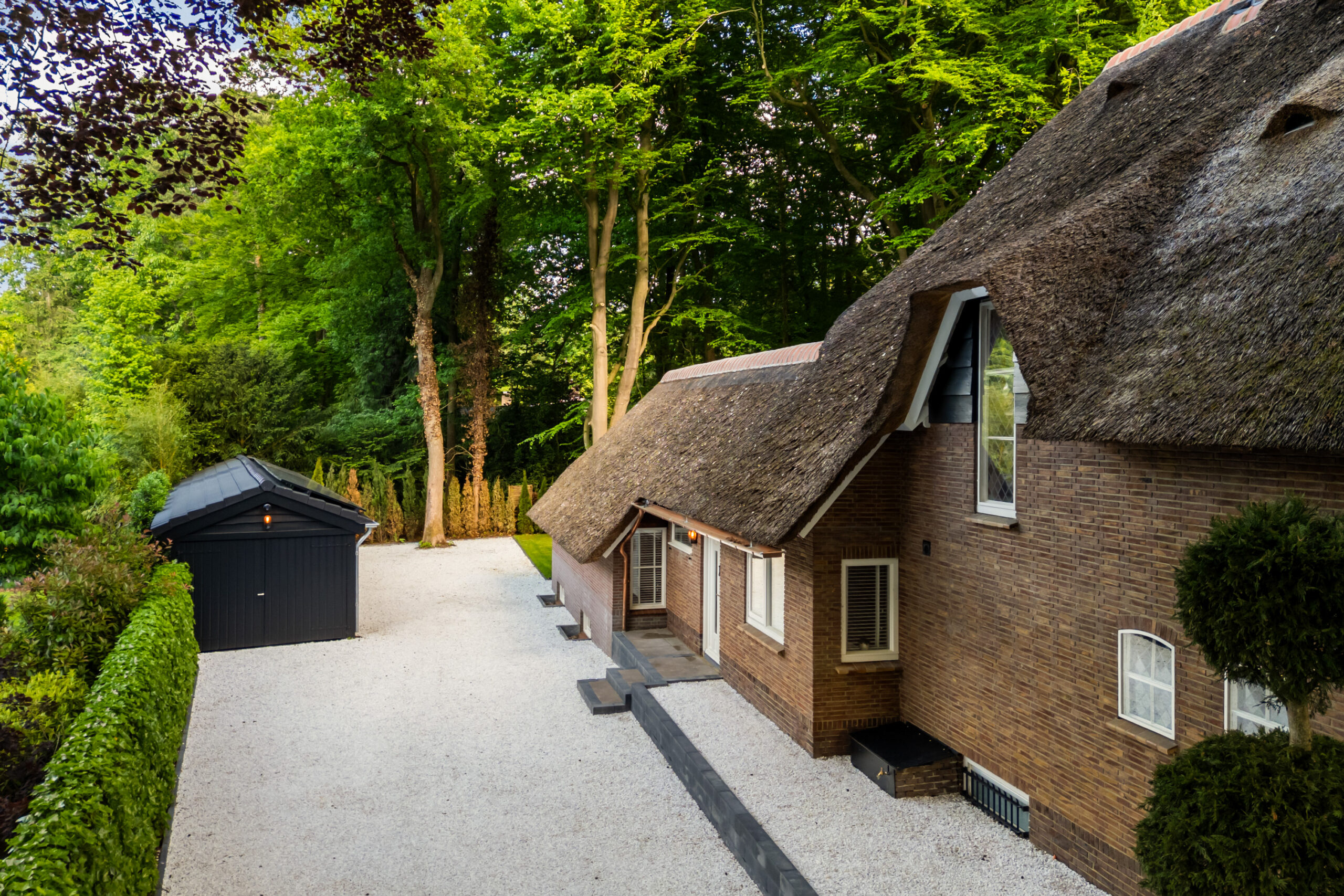 Op een fenomenale locatie aan de rand van de uitgestrekte Veluwse bossen, enigszins verscholen in het groen, bevindt zich aan een prachtige laan vol volgroeide bomen en veel openbaar groen deze schitterende rietgedekte villa met bijgebouw op een onder architectuur aangelegd perceel van circa 1.085 m².