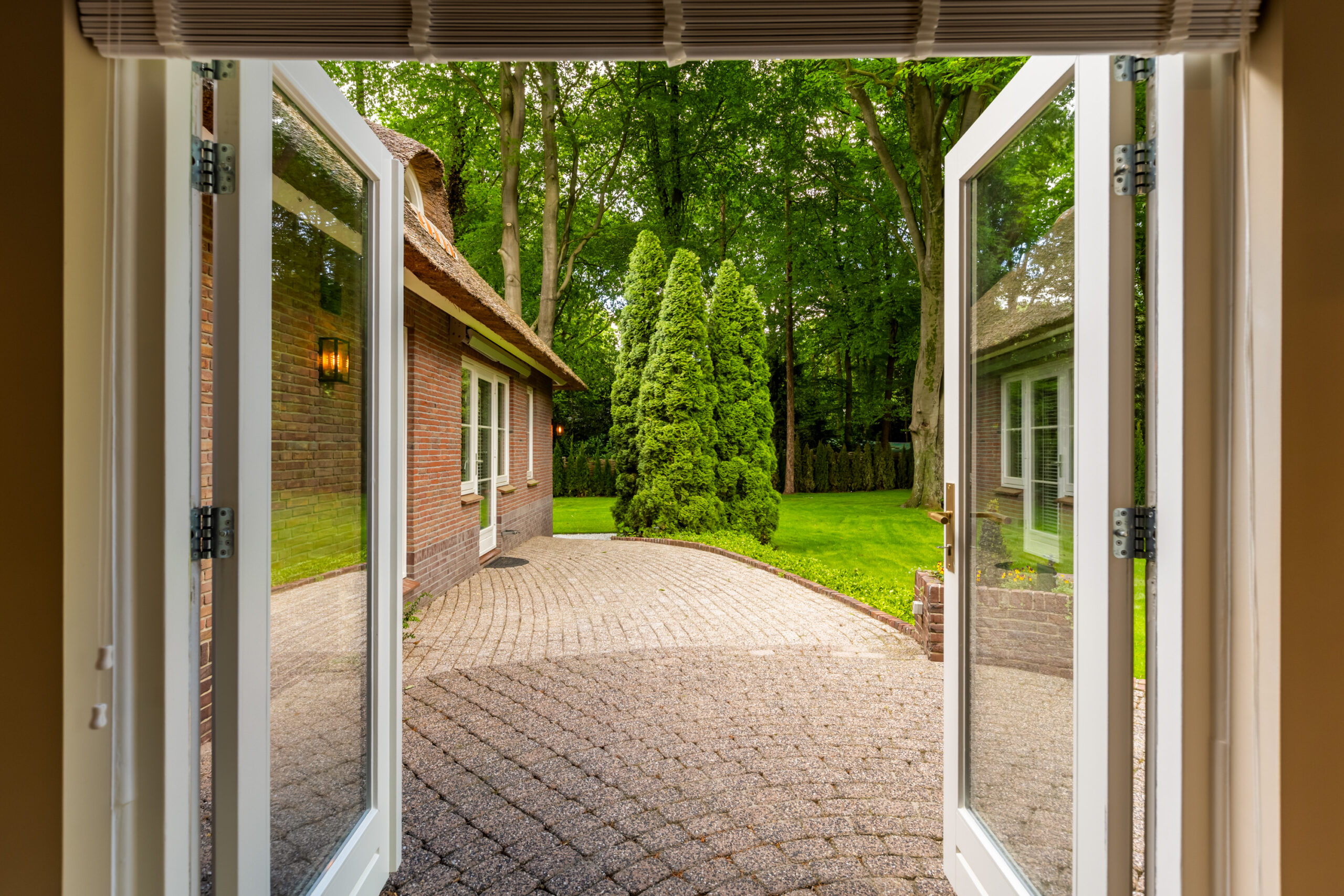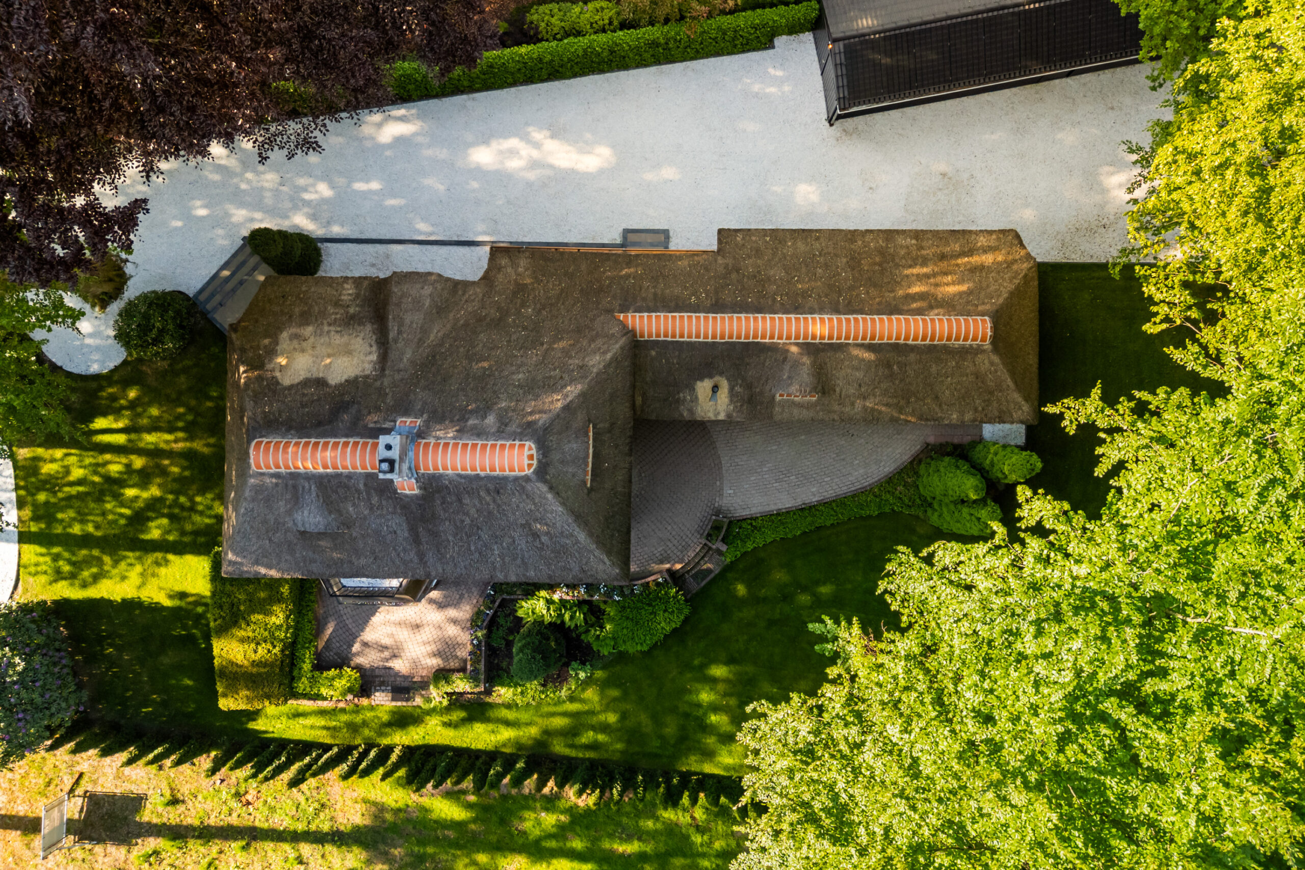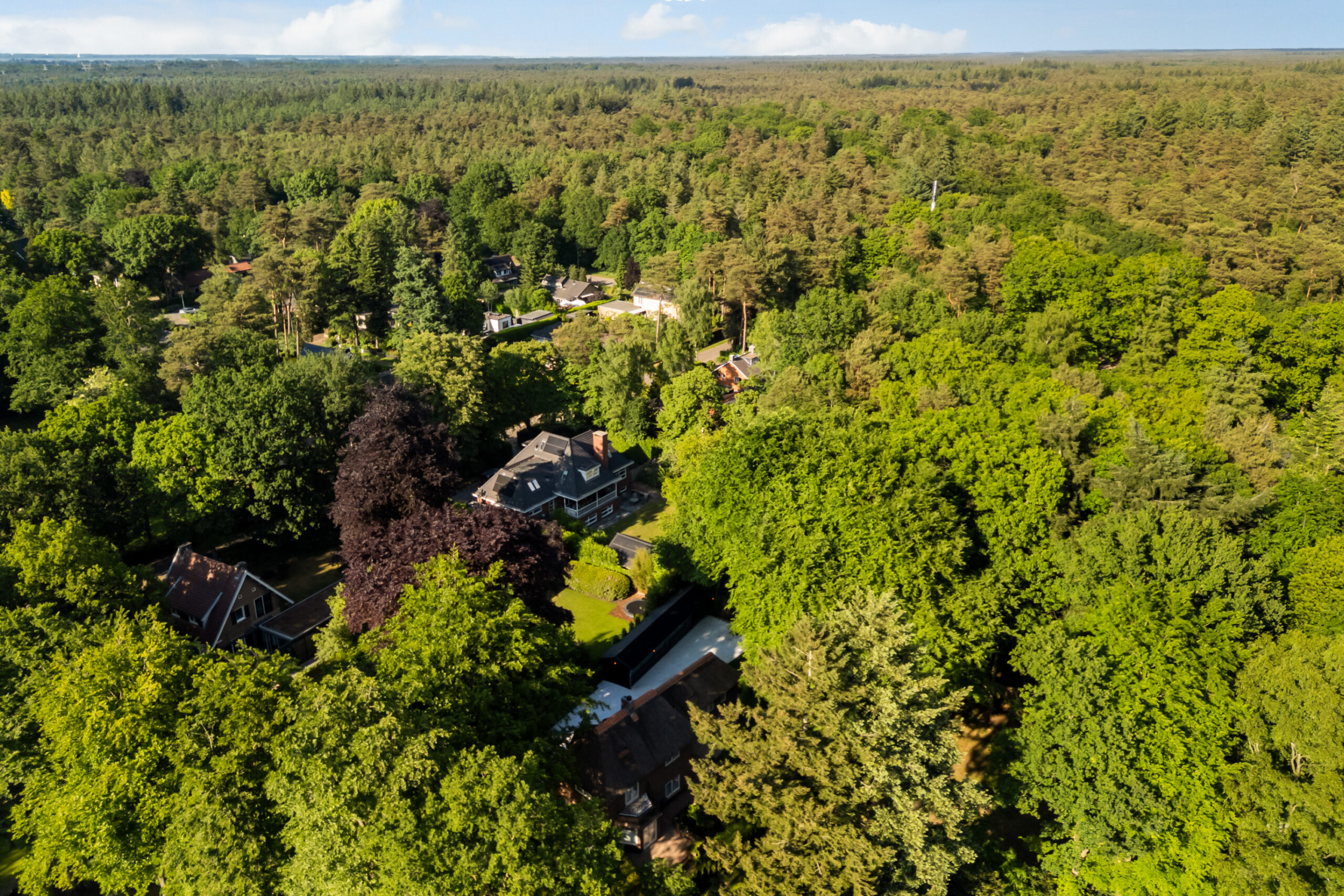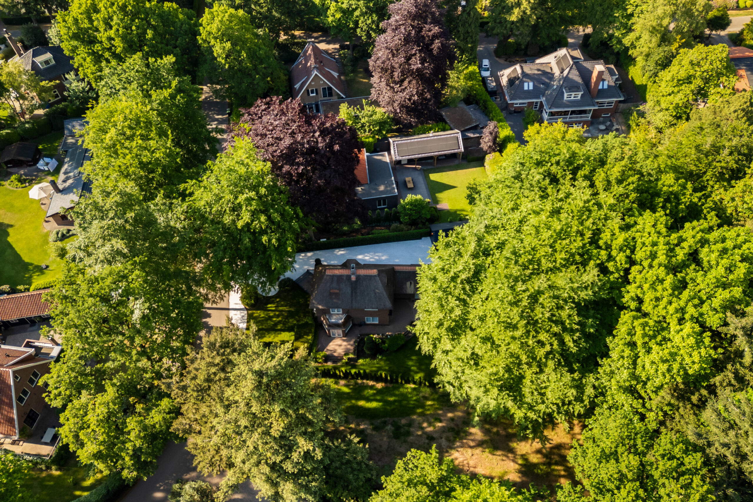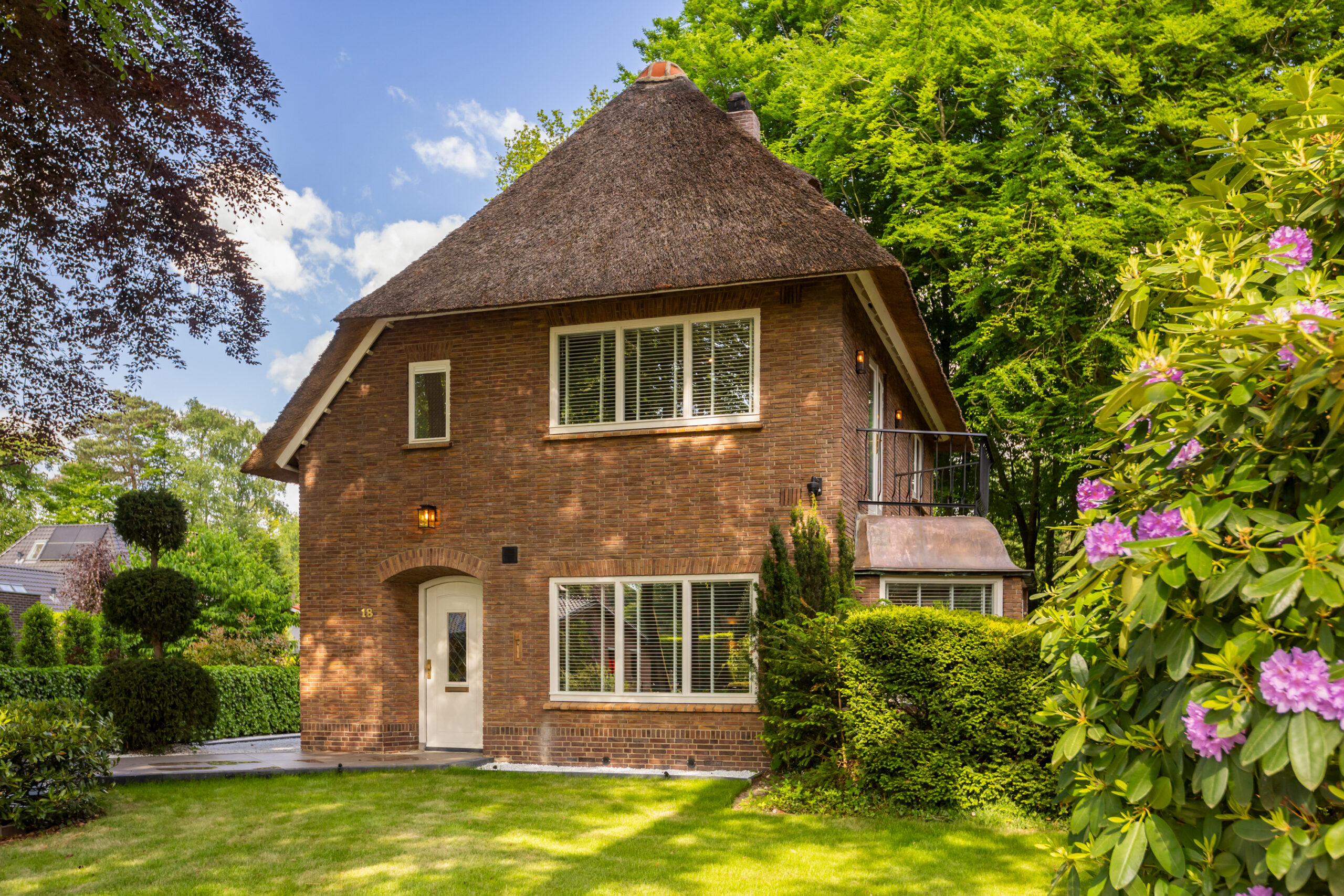 Op een fenomenale locatie aan de rand van de uitgestrekte Veluwse bossen, enigszins verscholen in het groen, bevindt zich aan een prachtige laan vol volgroeide bomen en veel openbaar groen deze schitterende rietgedekte villa met bijgebouw op een onder architectuur aangelegd perceel van circa 1.085 m².