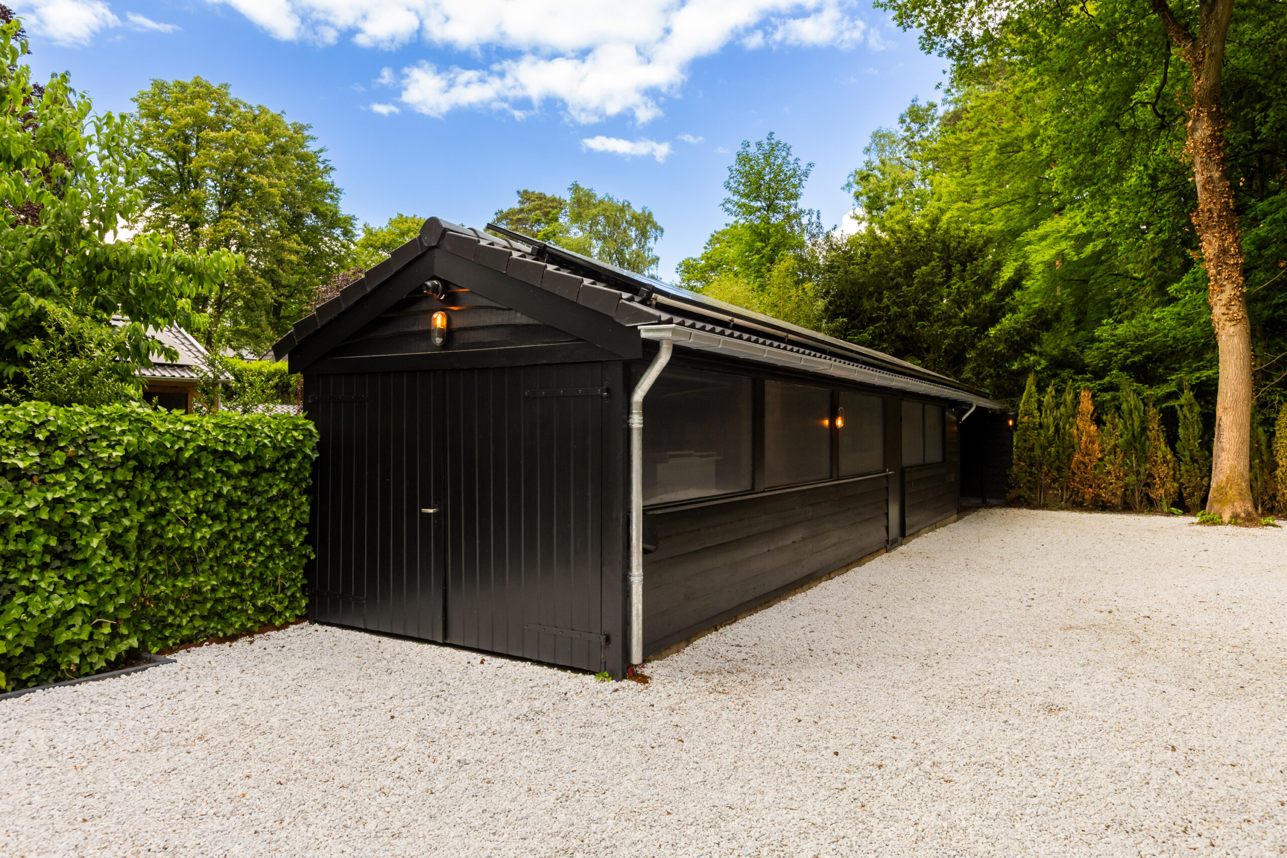 Het grote houten bijgebouw is voorzien van een garage met openslaande deuren en een ruime berging met een aangrenzende overkapping. Het vernieuwde dak van het bijgebouw is voorzien van 18 zonnepanelen. De enorm lange oprit biedt voldoende parkeergelegenheid voor meerdere auto's op eigen terrein.