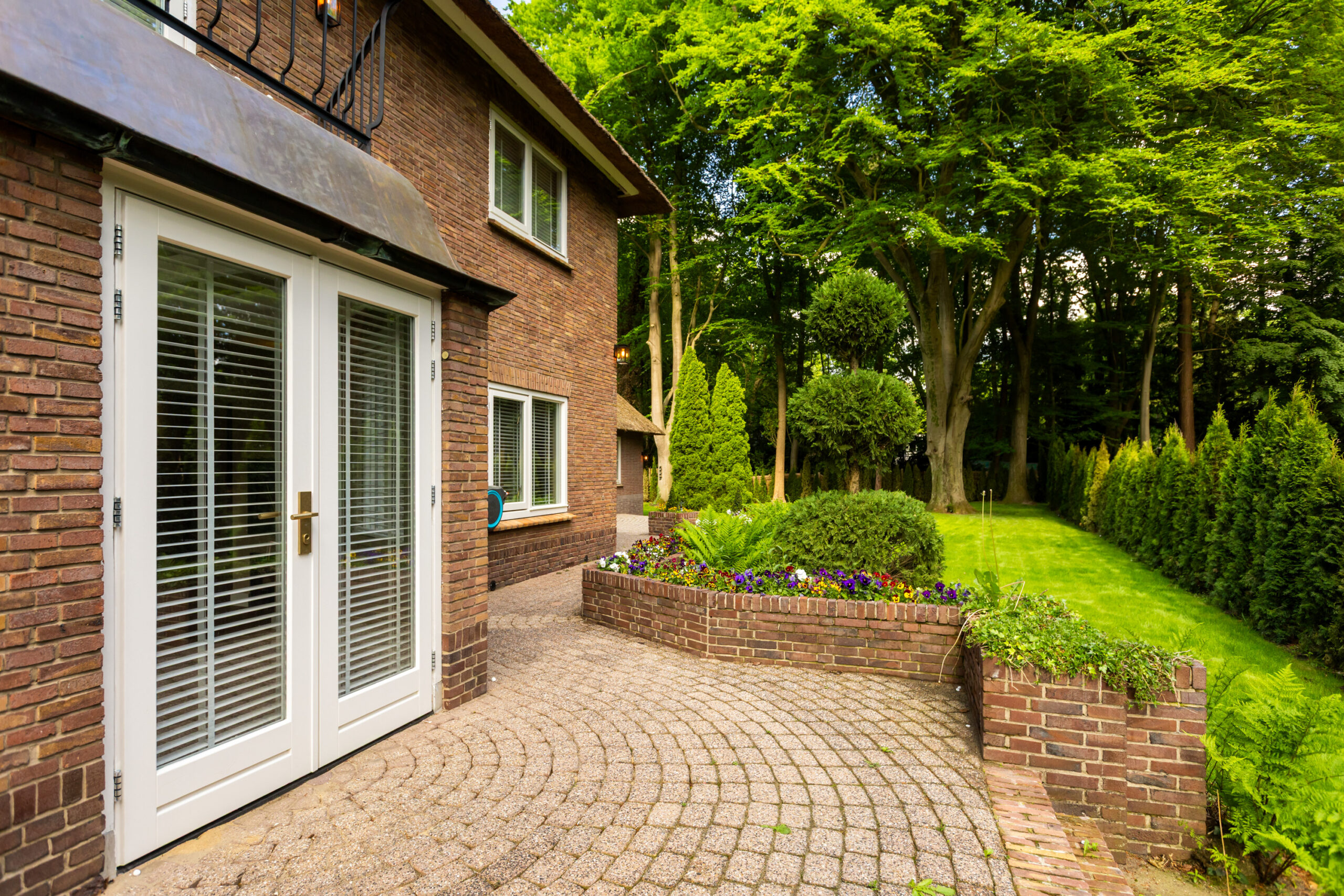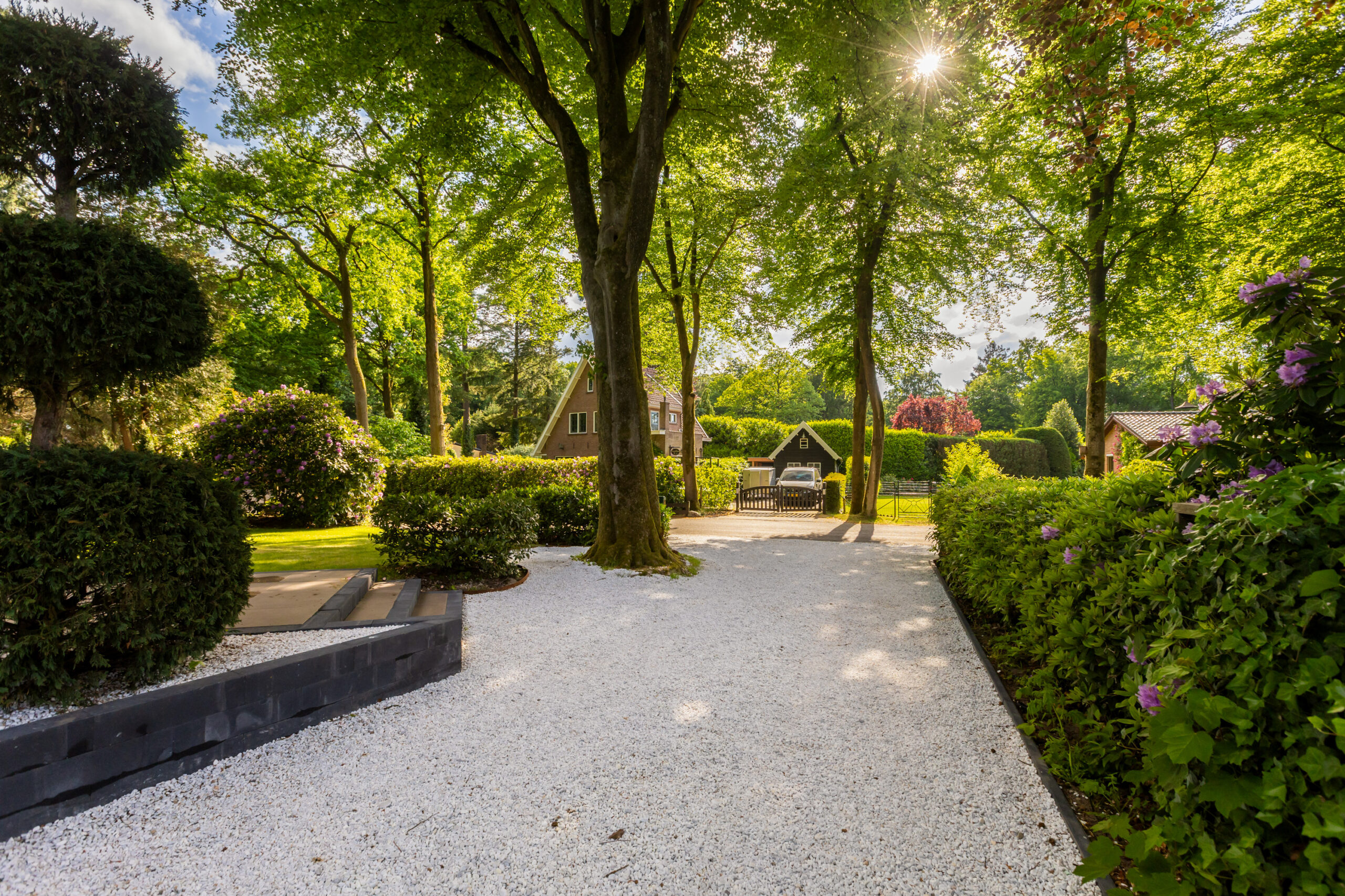 En dan de tuin ..... gesitueerd rondom de woning en een oase van rust. Hier ervaart u optimale privacy! Het grote gazon is op de erfgrens voorzien van een coniferenhaag. Zowel aan de voor- als achterzijde bevinden zich ook een aantal prachtige volgroeide bomen. Direct grenzend aan de rechterzijde van de woning bevindt zich een groot verhoogd zonneterras waar het heerlijk genieten is van de zon. Een deel van de voortuin en de gehele oprit is voorzien van mooi licht grind wat prachtig afsteekt tegen de gevel van de villa. De tuin is eveneens voorzien van een sproei-installatie en een robotmaaier.