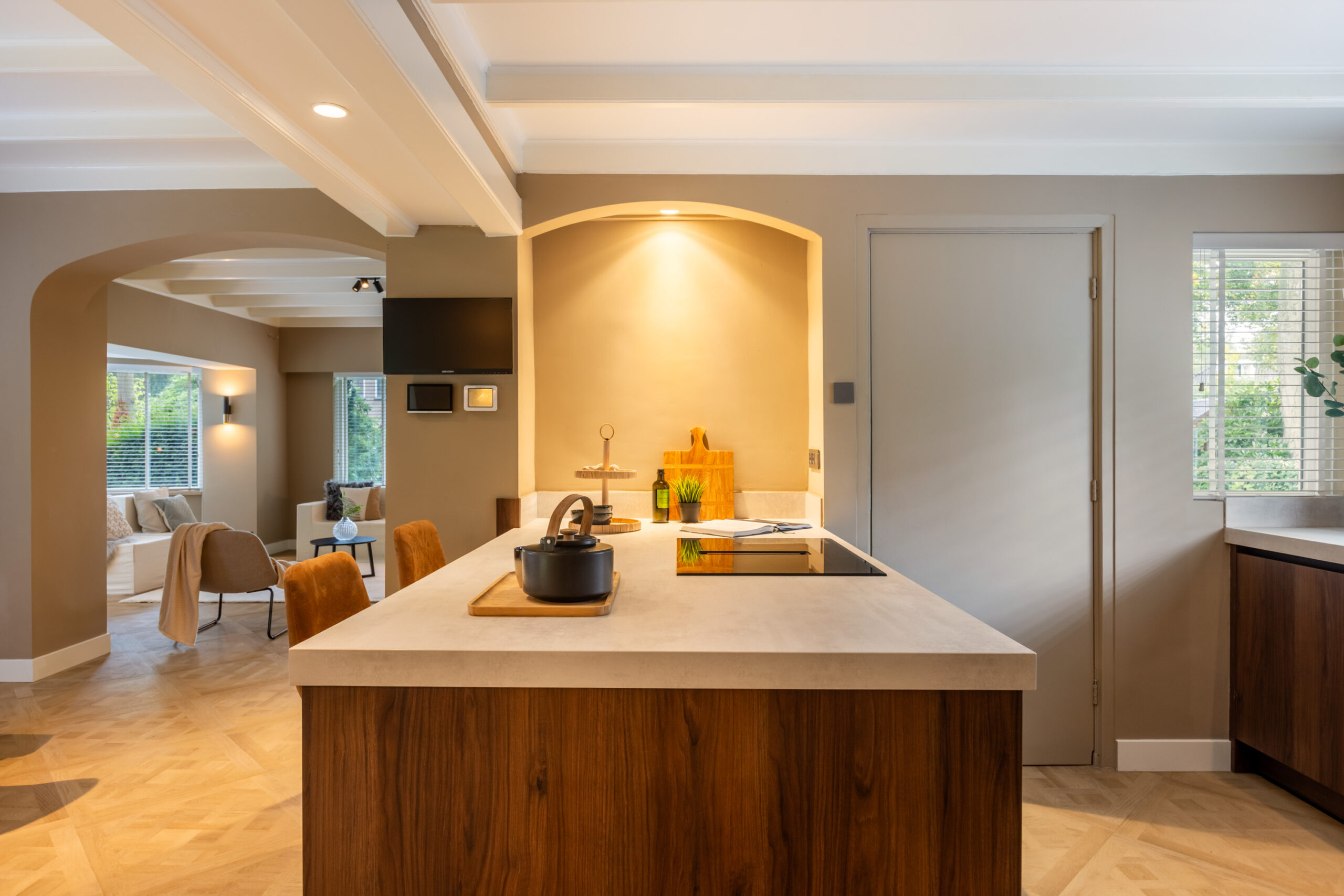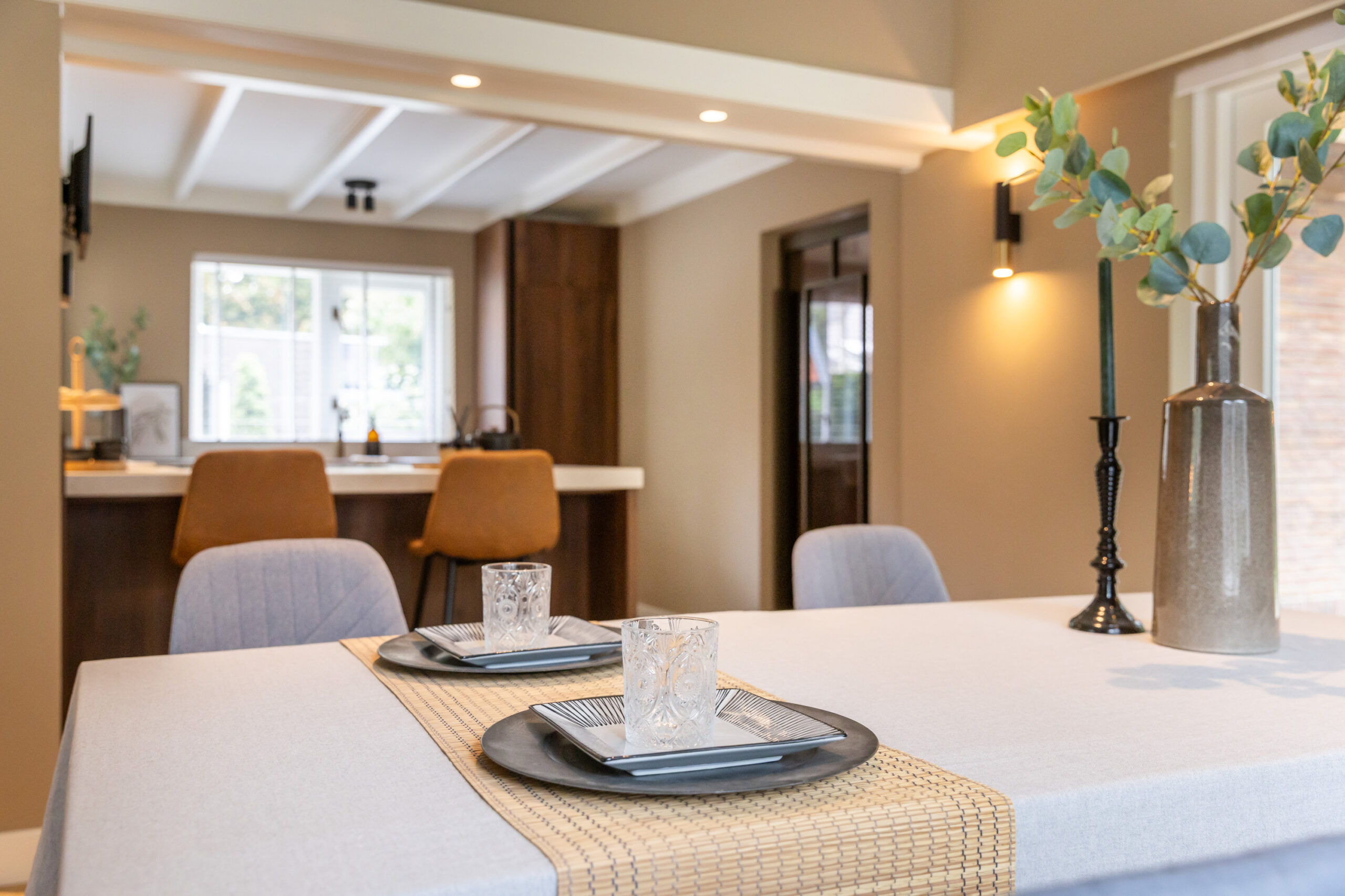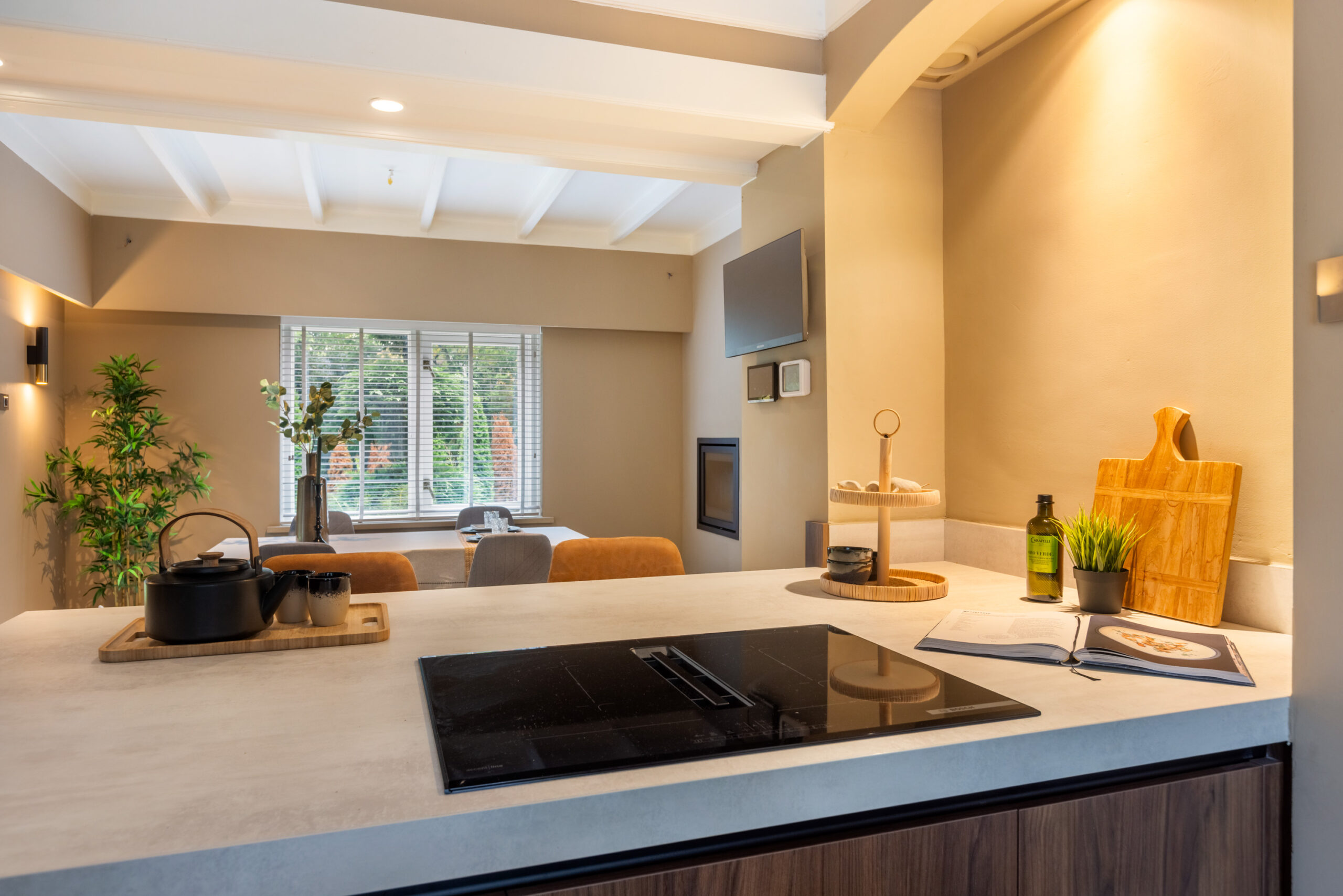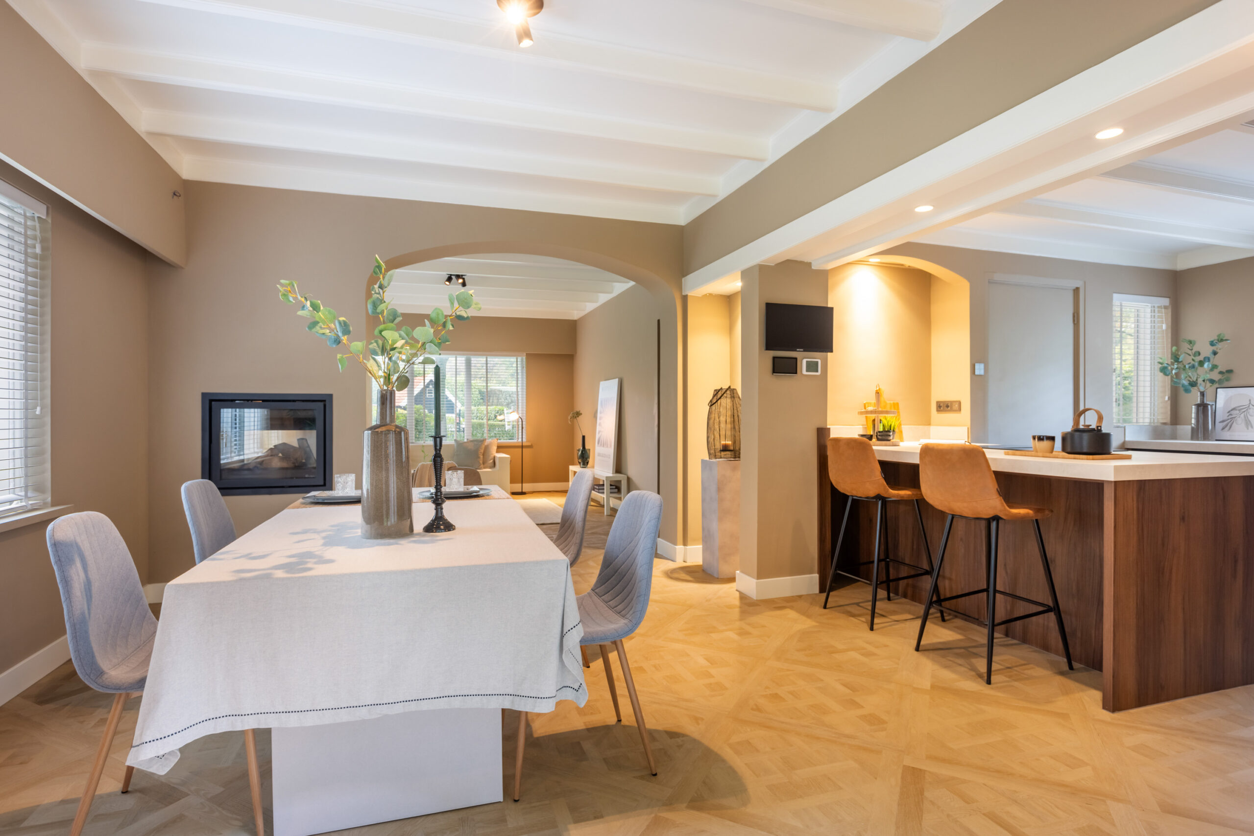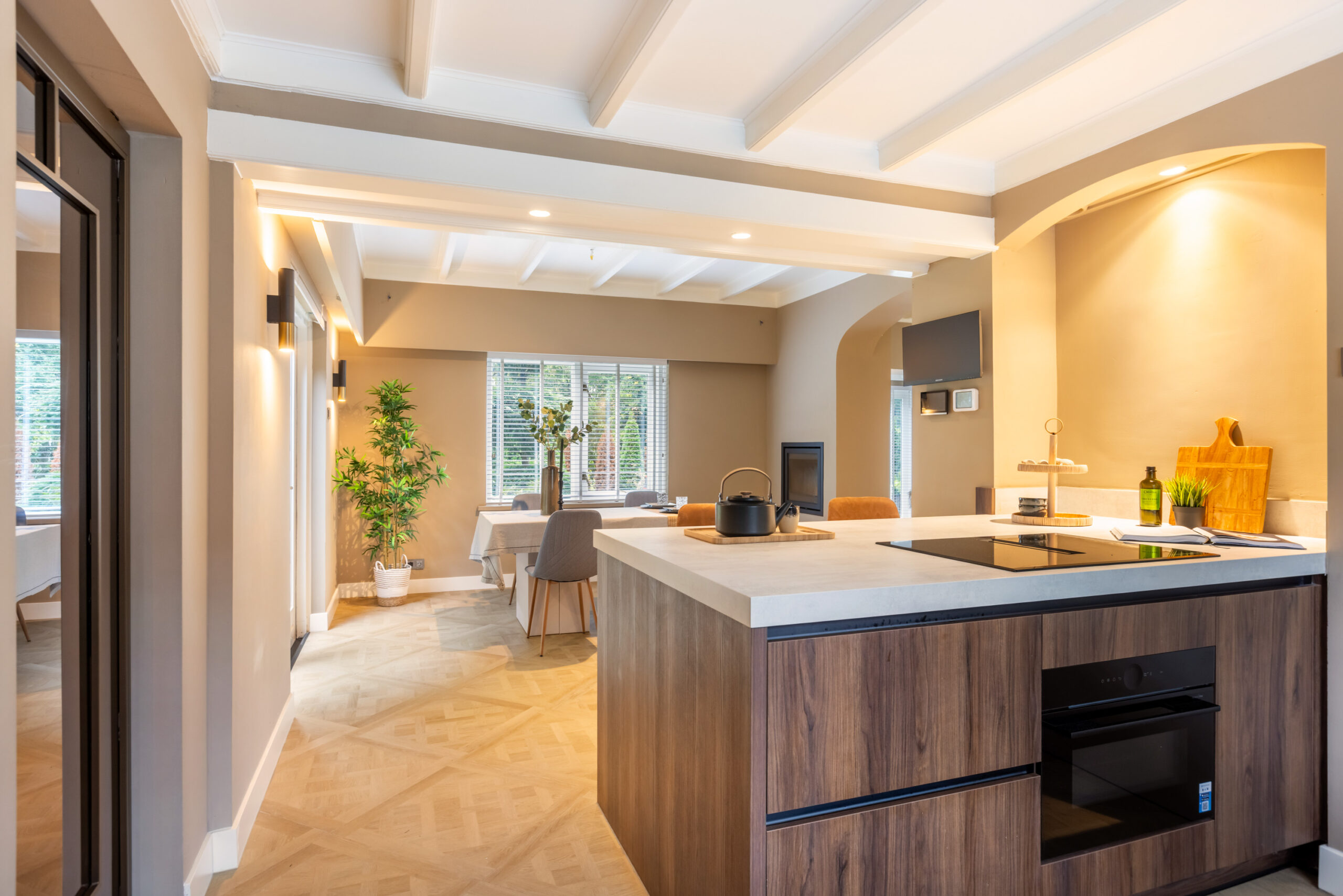 Middels een open doorgang bereikt u de ruime eetkamer eveneens voorzien van openslaande deuren naar het terras en met aangrenzend de luxe open keuken welke is voorzien van een kookeiland met bargelegenheid, een separaat spoelgedeelte, en alle gewenste inbouwapparatuur die in een luxe keuken te vinden is, waaronder een Bosch inductiekookplaat met integrale afzuiging, hete luchtoven, vaatwasser, koel- vriescombinatie en een quooker. Tevens krijgt u toegang tot de prachtig afgewerkte kelder voorzien van houten wandpanelen en daglichttoetreding.