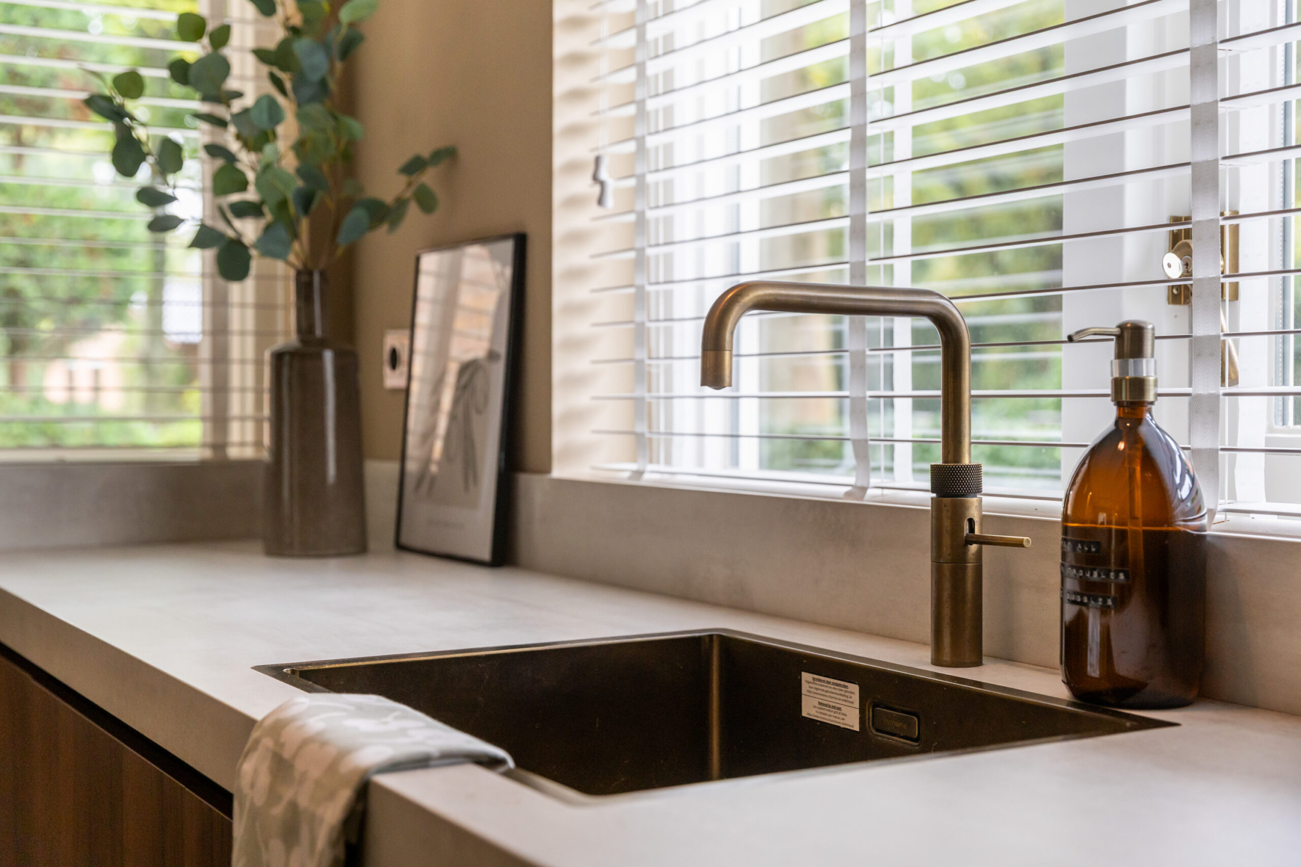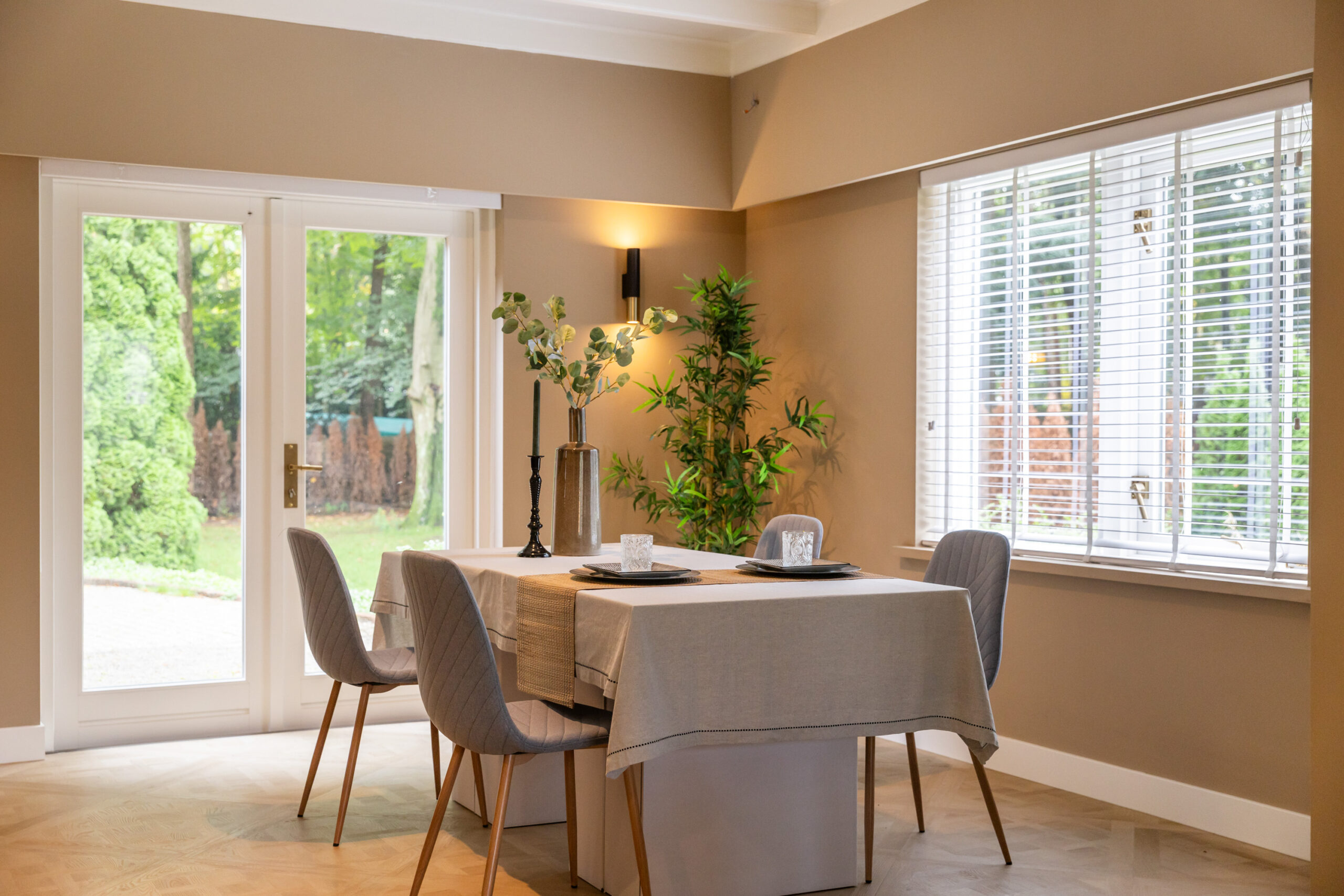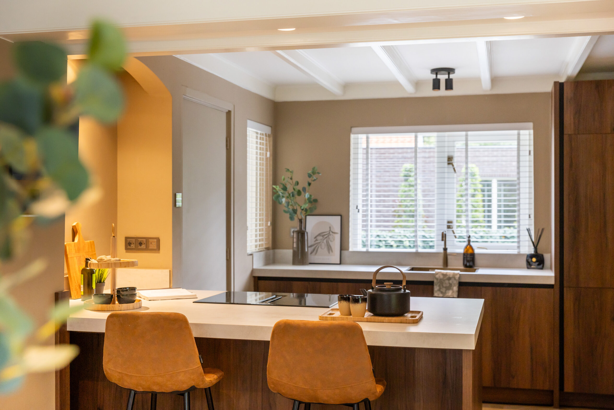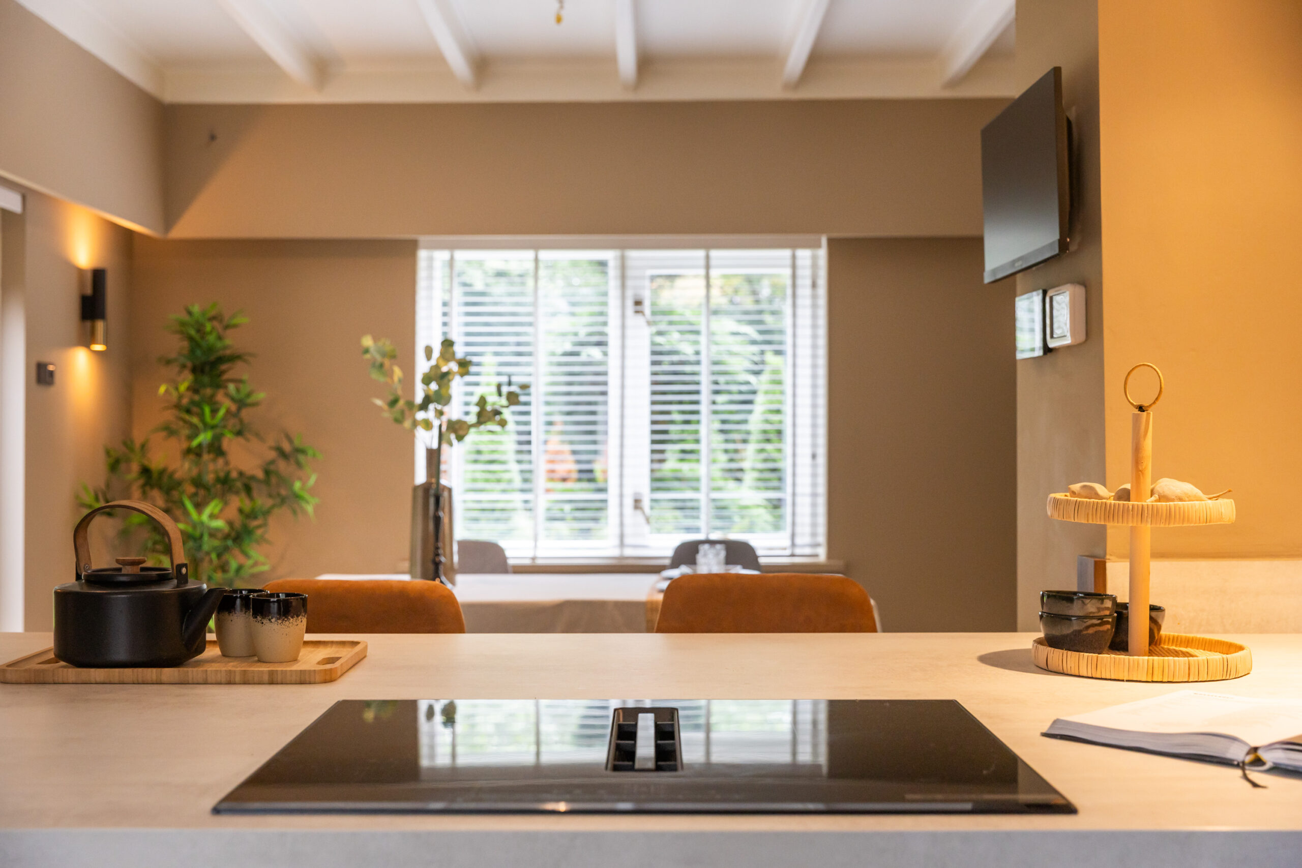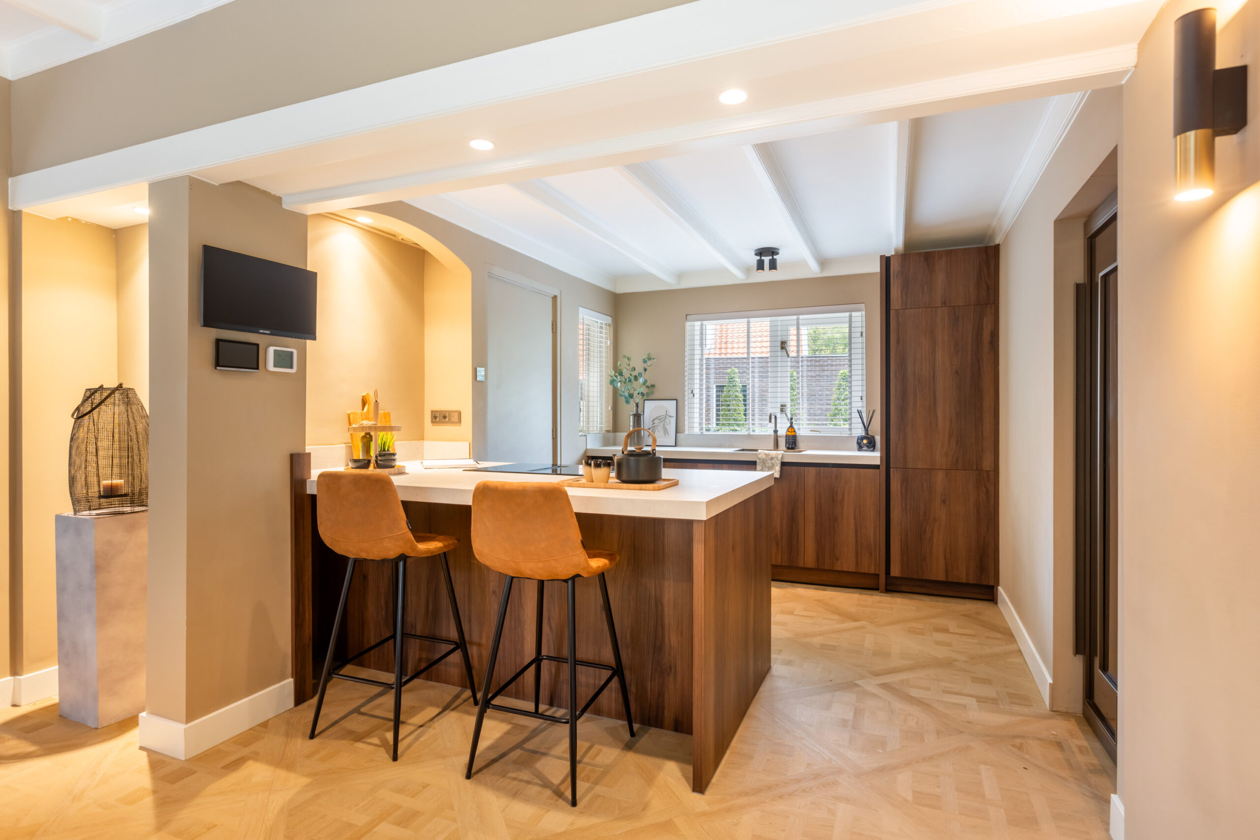 Middels een open doorgang bereikt u de ruime eetkamer eveneens voorzien van openslaande deuren naar het terras en met aangrenzend de luxe open keuken welke is voorzien van een kookeiland met bargelegenheid, een separaat spoelgedeelte, en alle gewenste inbouwapparatuur die in een luxe keuken te vinden is, waaronder een Bosch inductiekookplaat met integrale afzuiging, hete luchtoven, vaatwasser, koel- vriescombinatie en een quooker. Tevens krijgt u toegang tot de prachtig afgewerkte kelder voorzien van houten wandpanelen en daglichttoetreding.