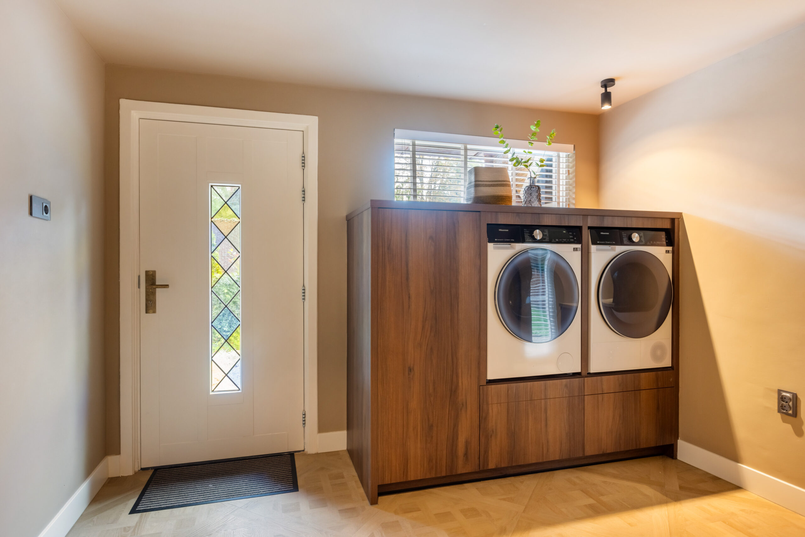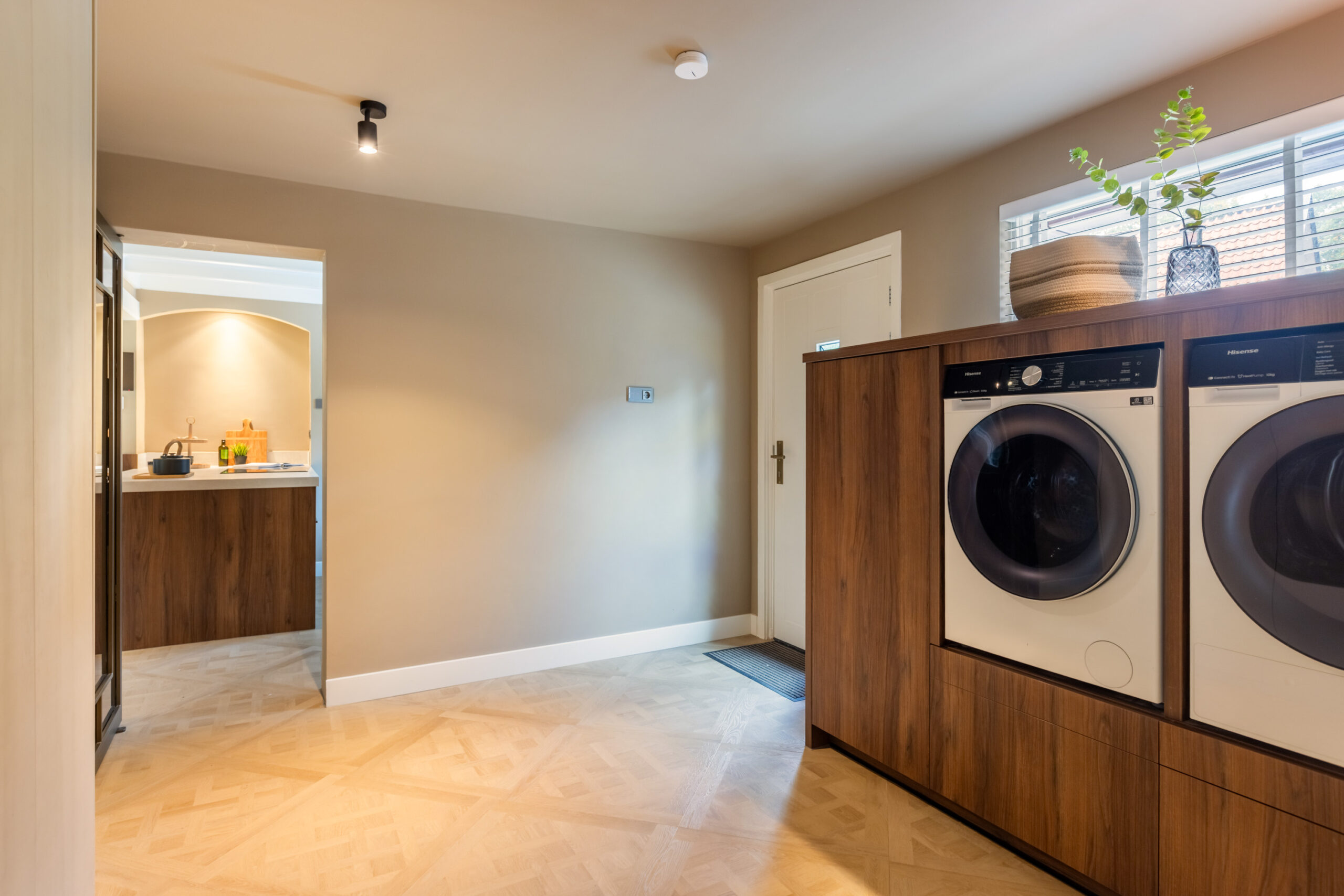 Via de keuken én vanaf buiten bereikt u de praktische bijkeuken/wasruimte met aansluitingen voor de was-apparatuur en een vaste kastenwand. Vanuit de bijkeuken krijgt u middels een vlizotrap toegang tot de bovengelegen vliering en middels een vaste trap toegang tot het ruime ondergelegen souterrain welke is voorzien van daglichttoetreding. Deze sfeervolle, multifunctionele ruimte is voor verschillende doeleinden geschikt en is eveneens voorzien van een eiken pvc-vloer met vloerverwarming.