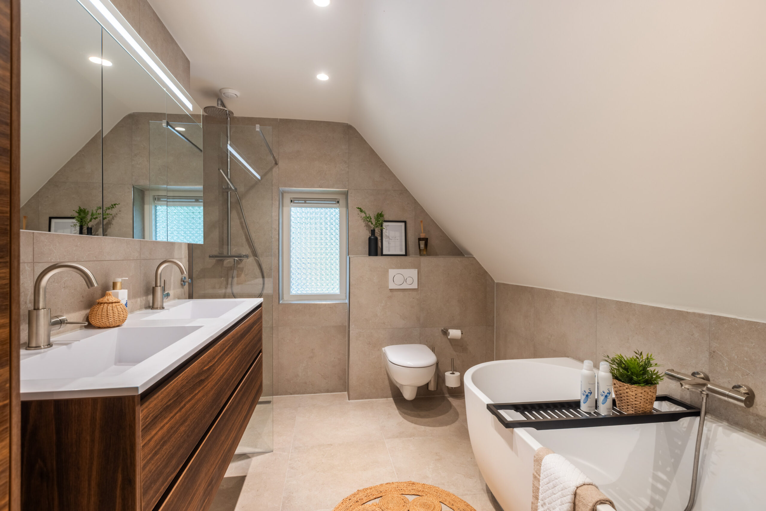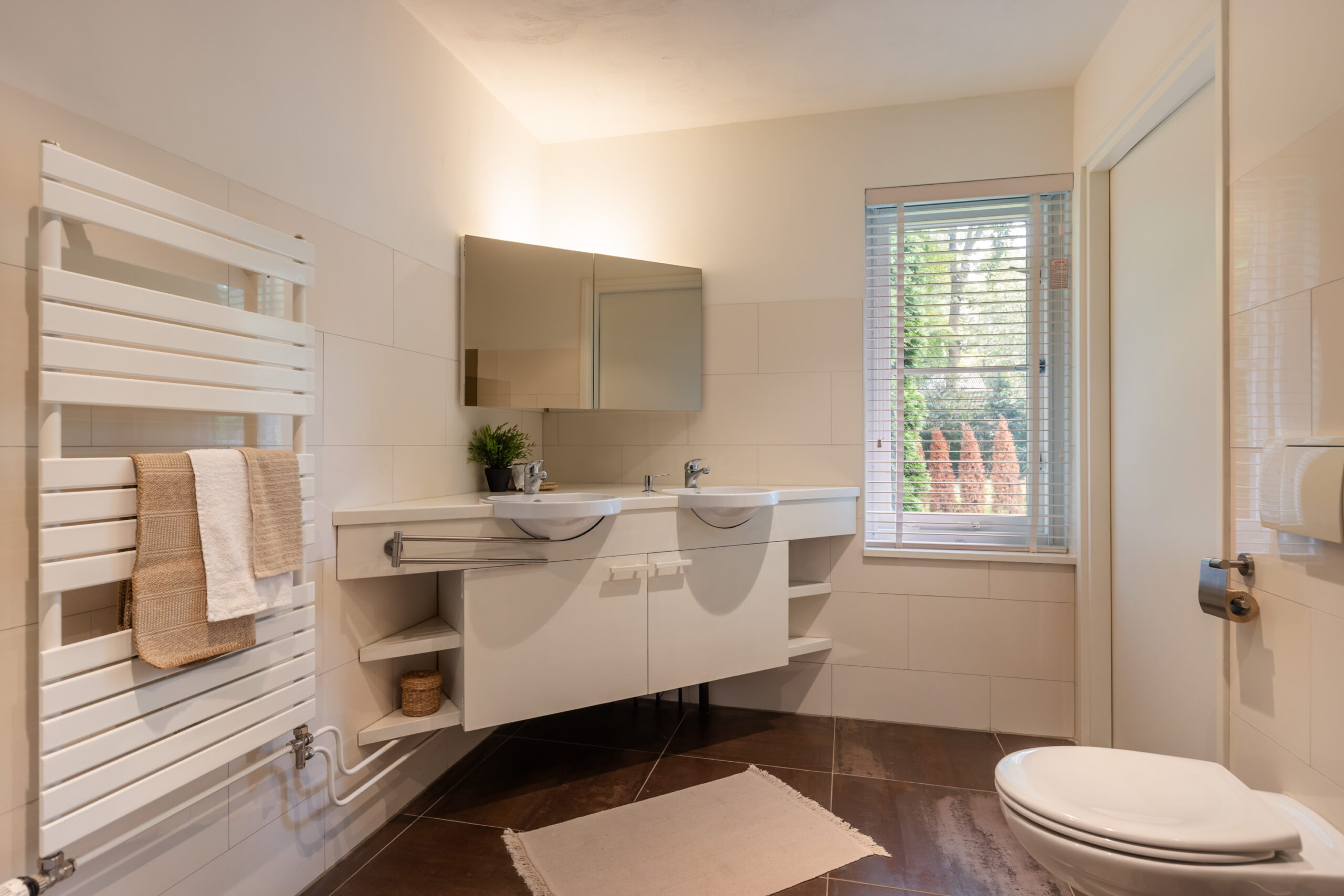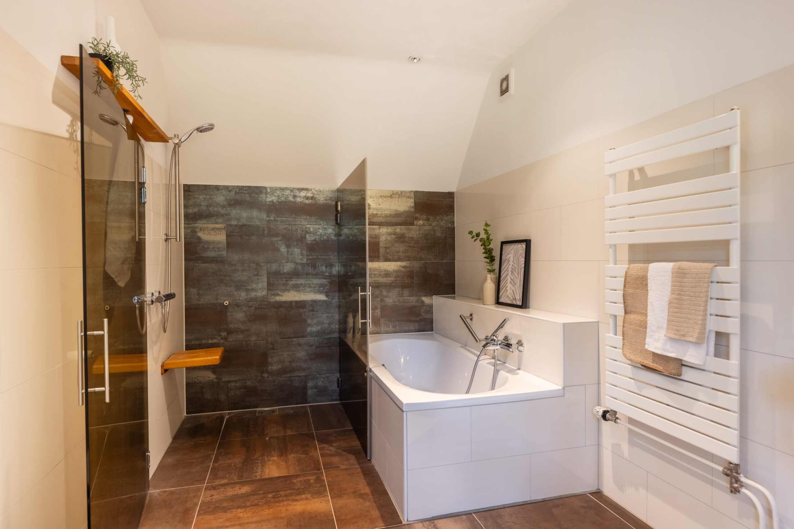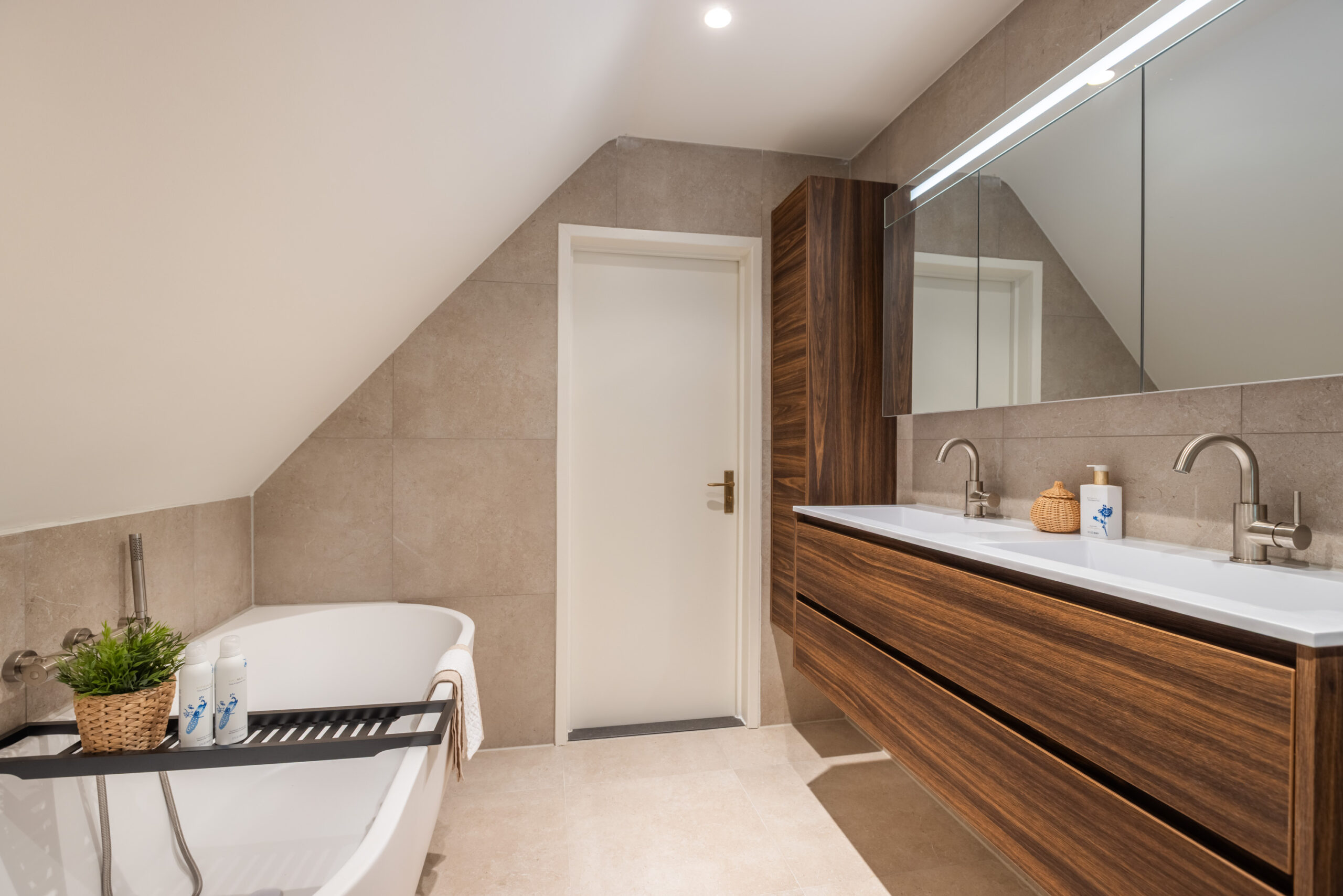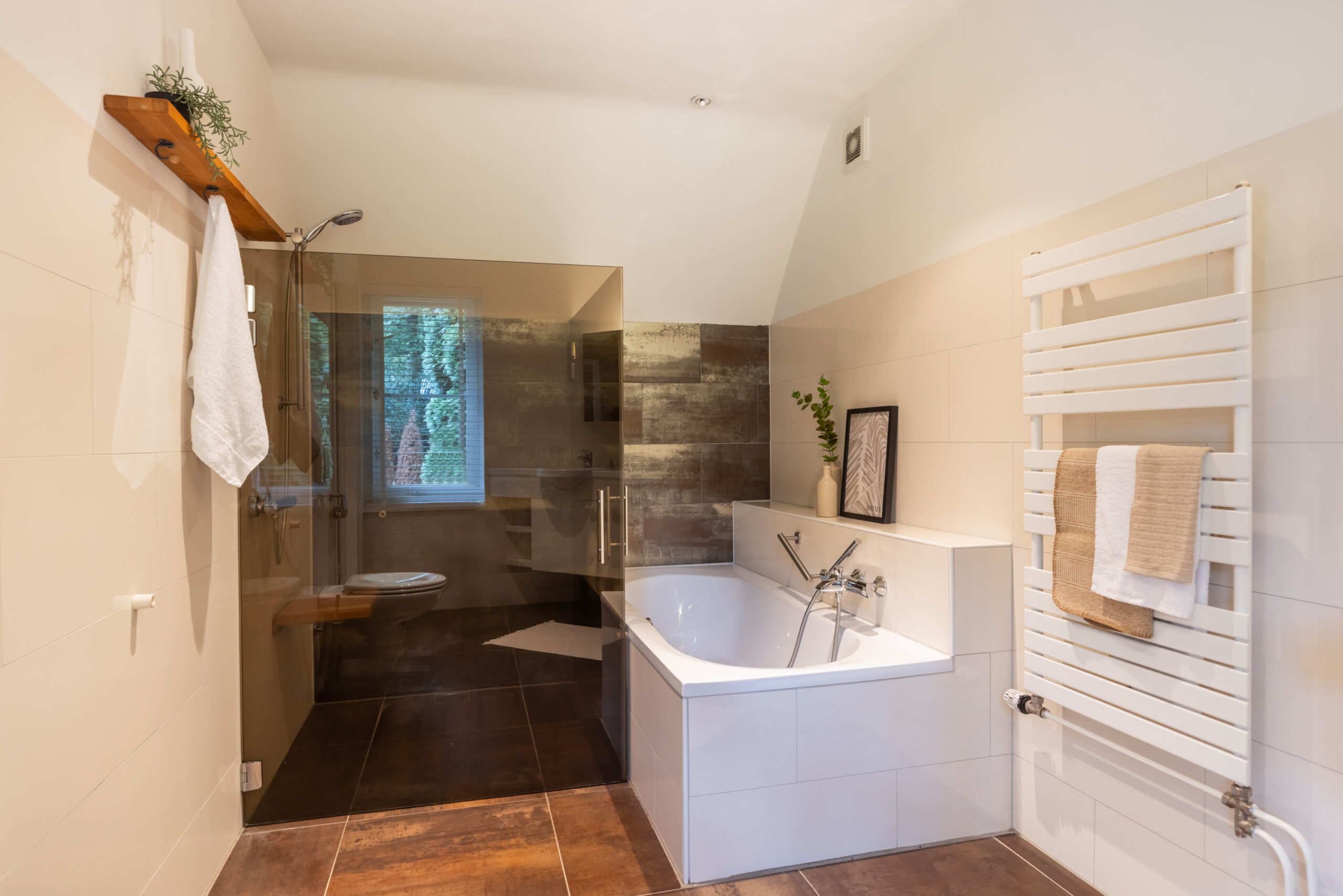 Naast de bijkeuken bevindt zich een royale (ouder)slaapkamer voorzien van een vaste kastenwand en directe toegang tot het terras. Direct grenzend aan de slaapkamer treft u de ruime badkamer met vloerverwarming welke is voorzien van een wastafelmeubel met dubbele wasbak, ligbad, inloopdouche en vrijdragend toilet.