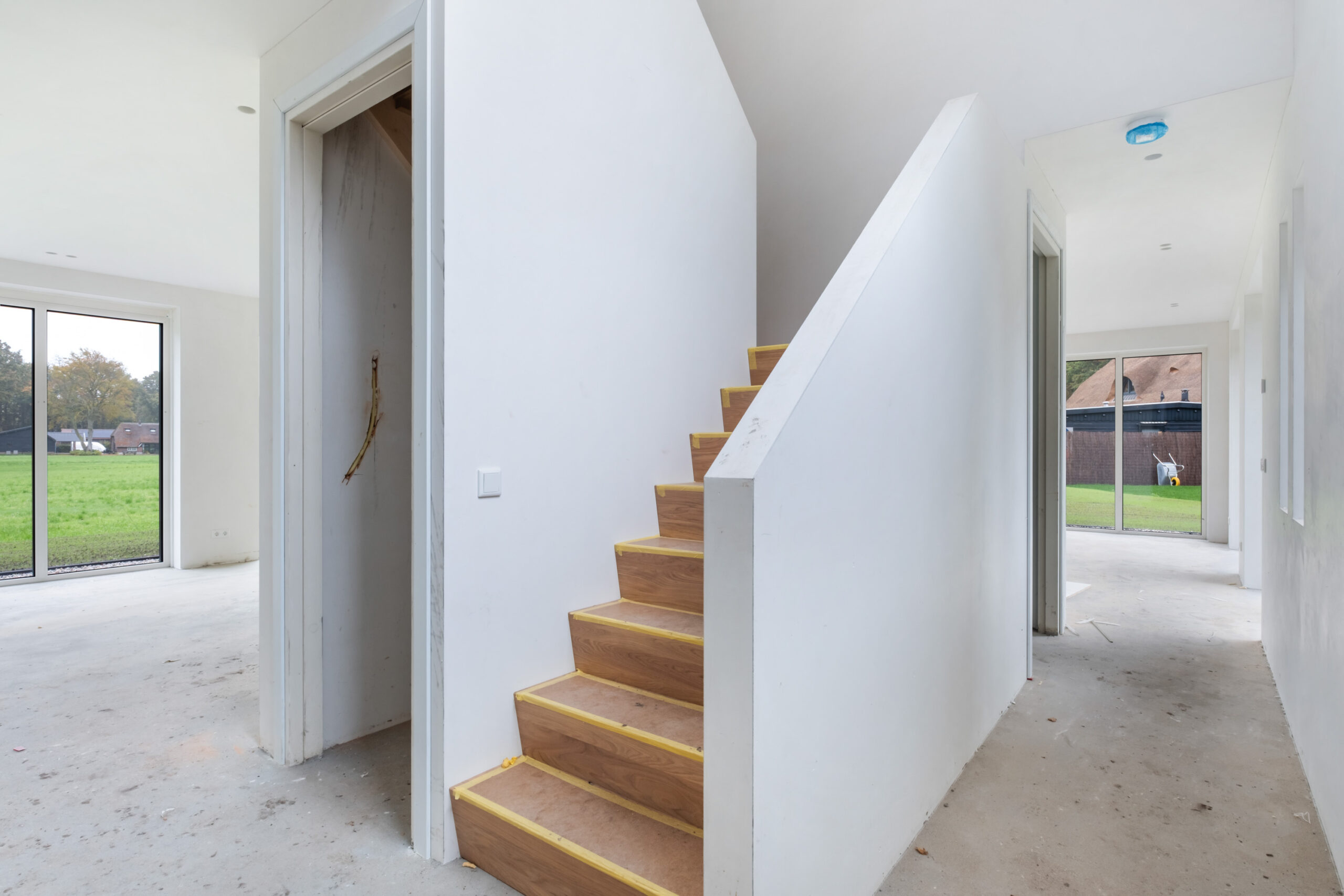 Door het ontwerp van de hal met vide ervaart u meteen de allure van dit huis: een zee aan daglicht verwelkomt u. Via de entree komt u bij de toiletruimte, de praktische bijkeuken, de woonkeuken en woonkamer.