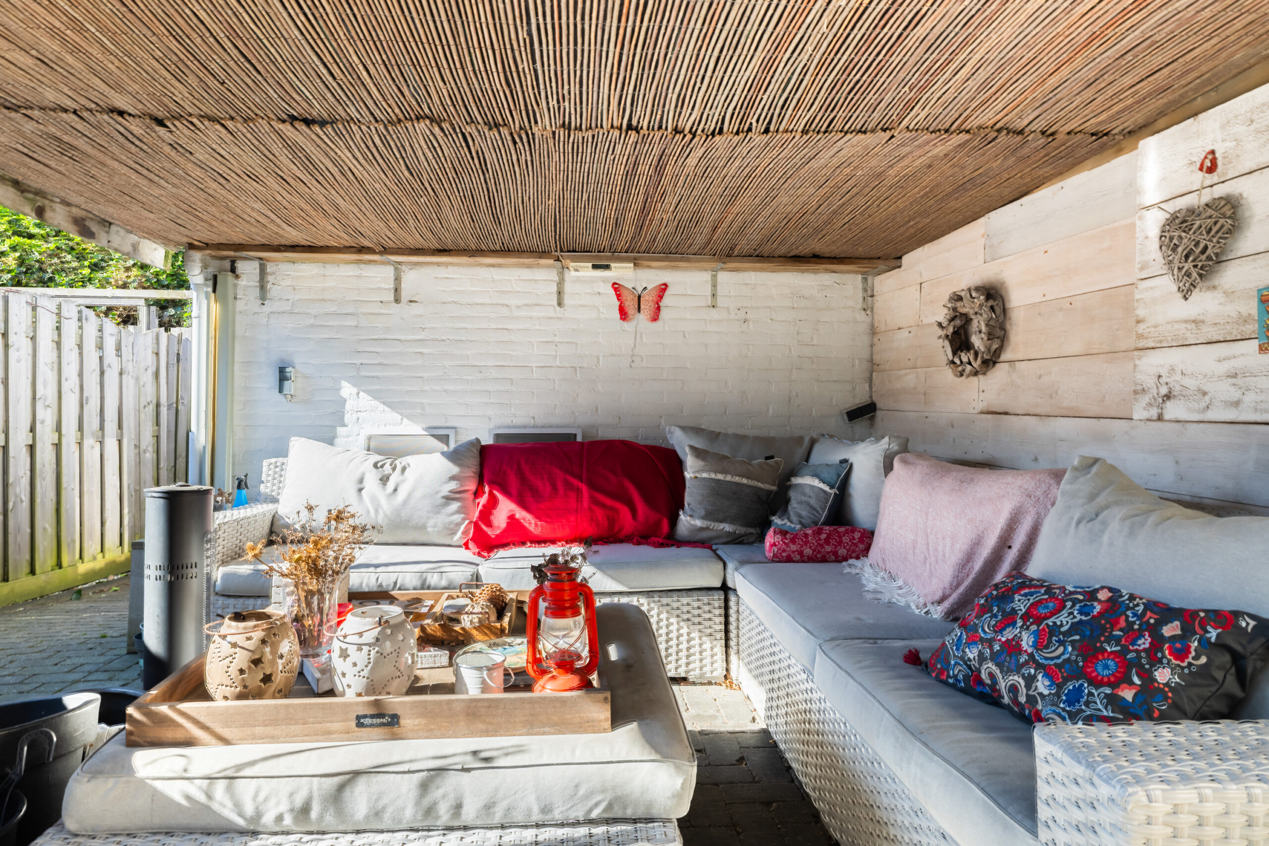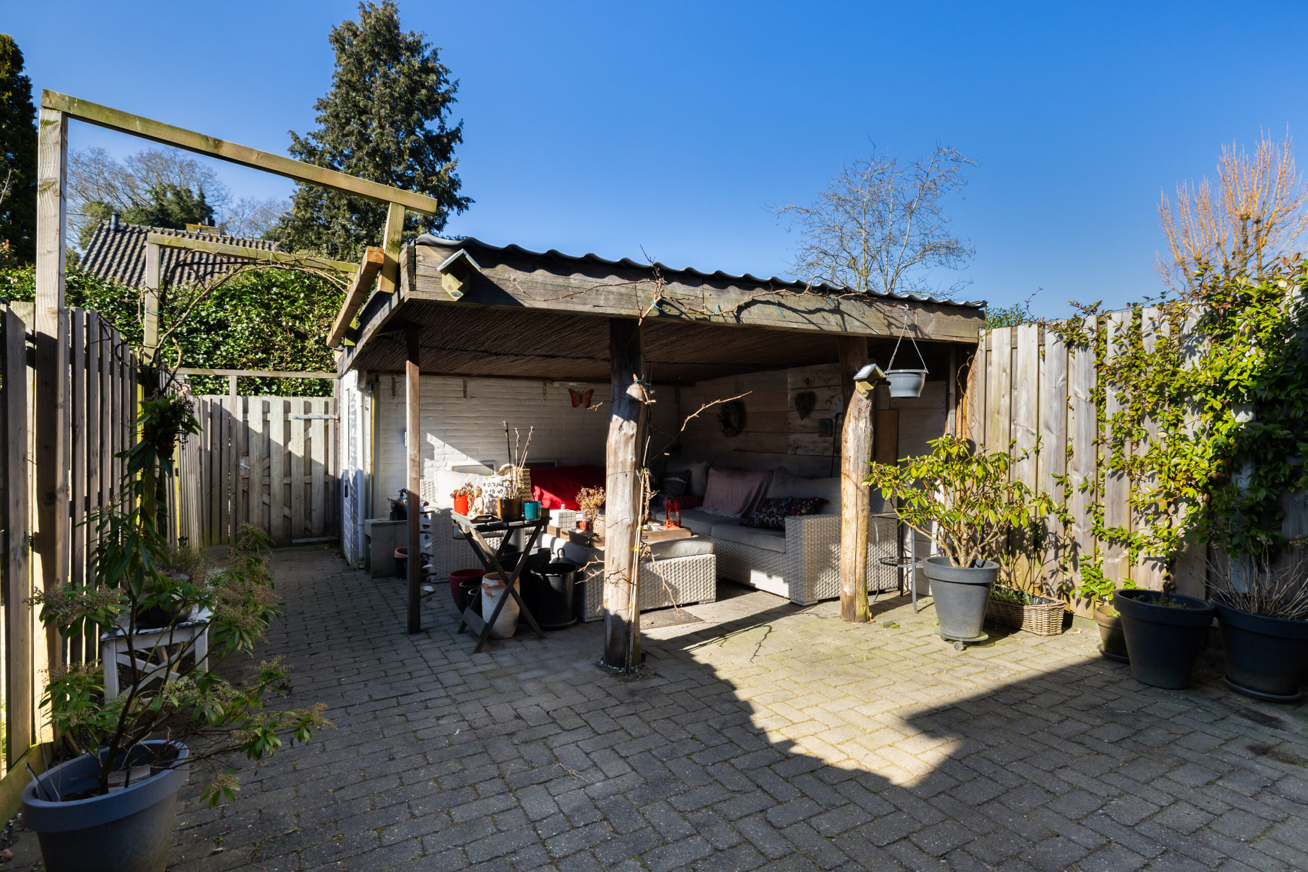 De zonnige achtertuin is gesitueerd op het westen en is onderhoudsvriendelijk aangelegd en voorzien van sierbestrating. Direct achter de woning is het terras voorzien van een zonnescherm. Achter in de tuin staat de stenen berging met aangrenzend een gezellige veranda die de nodige beschutting geeft op warme zomerdagen. Tevens bevindt zich naast de stenen berging de poortdeur naar het achterom.