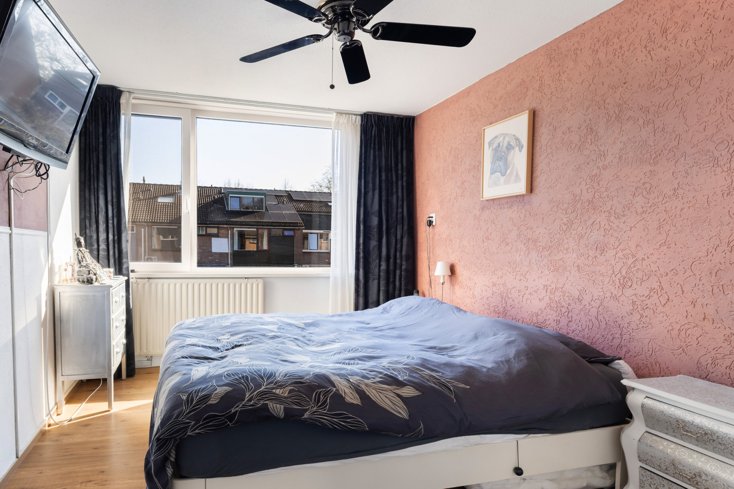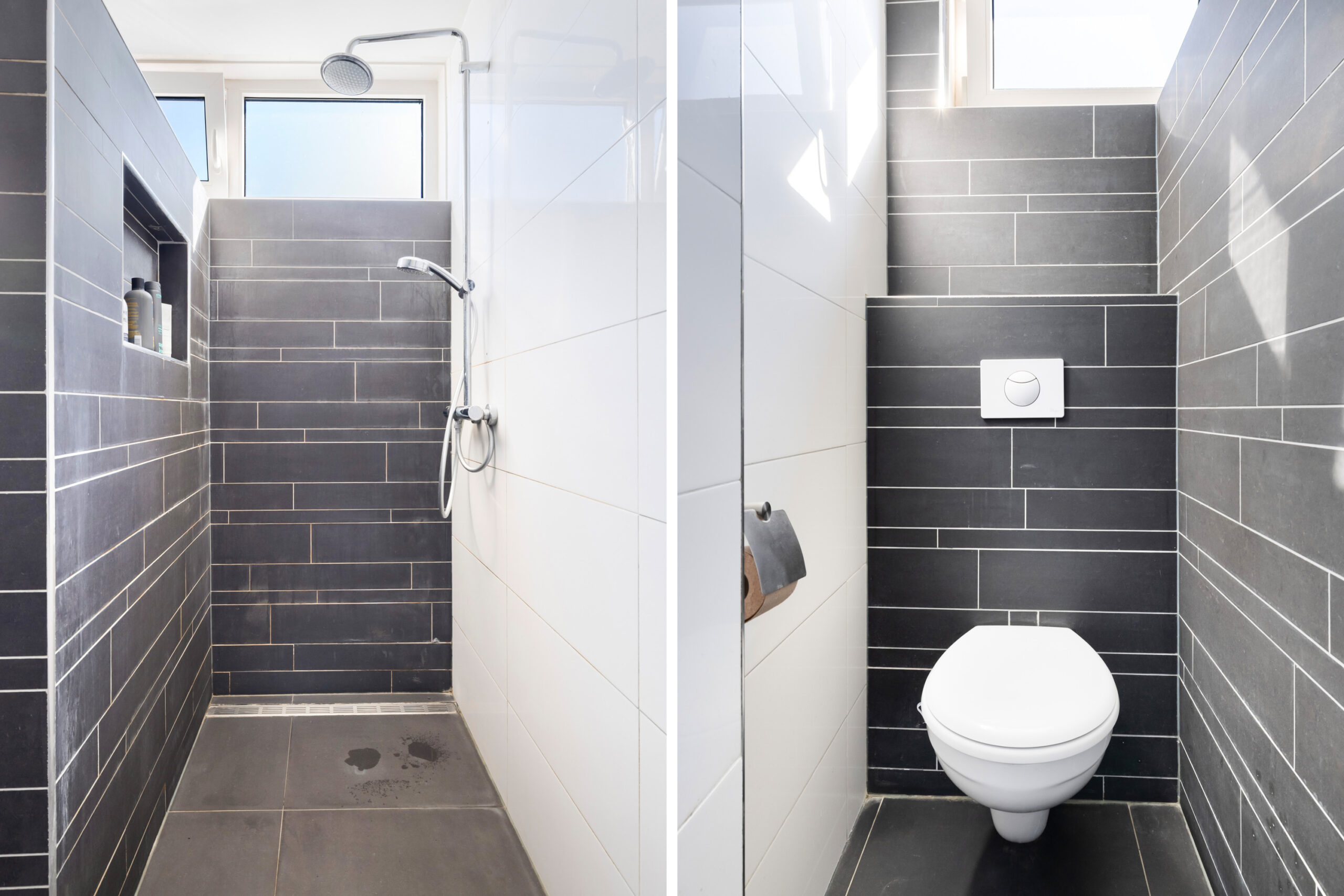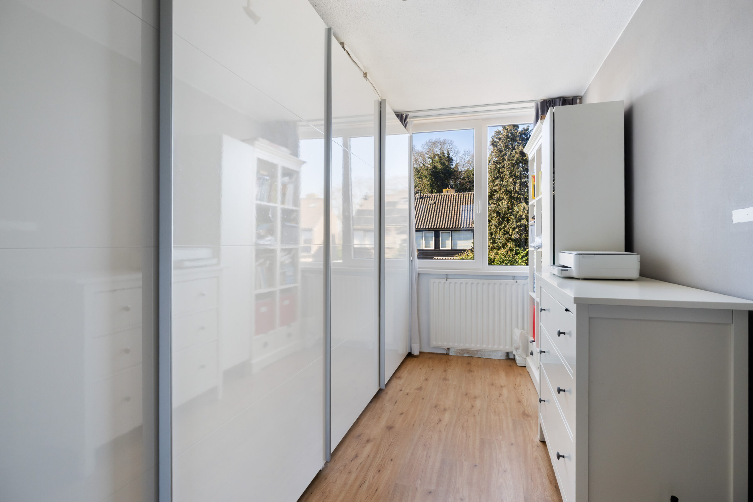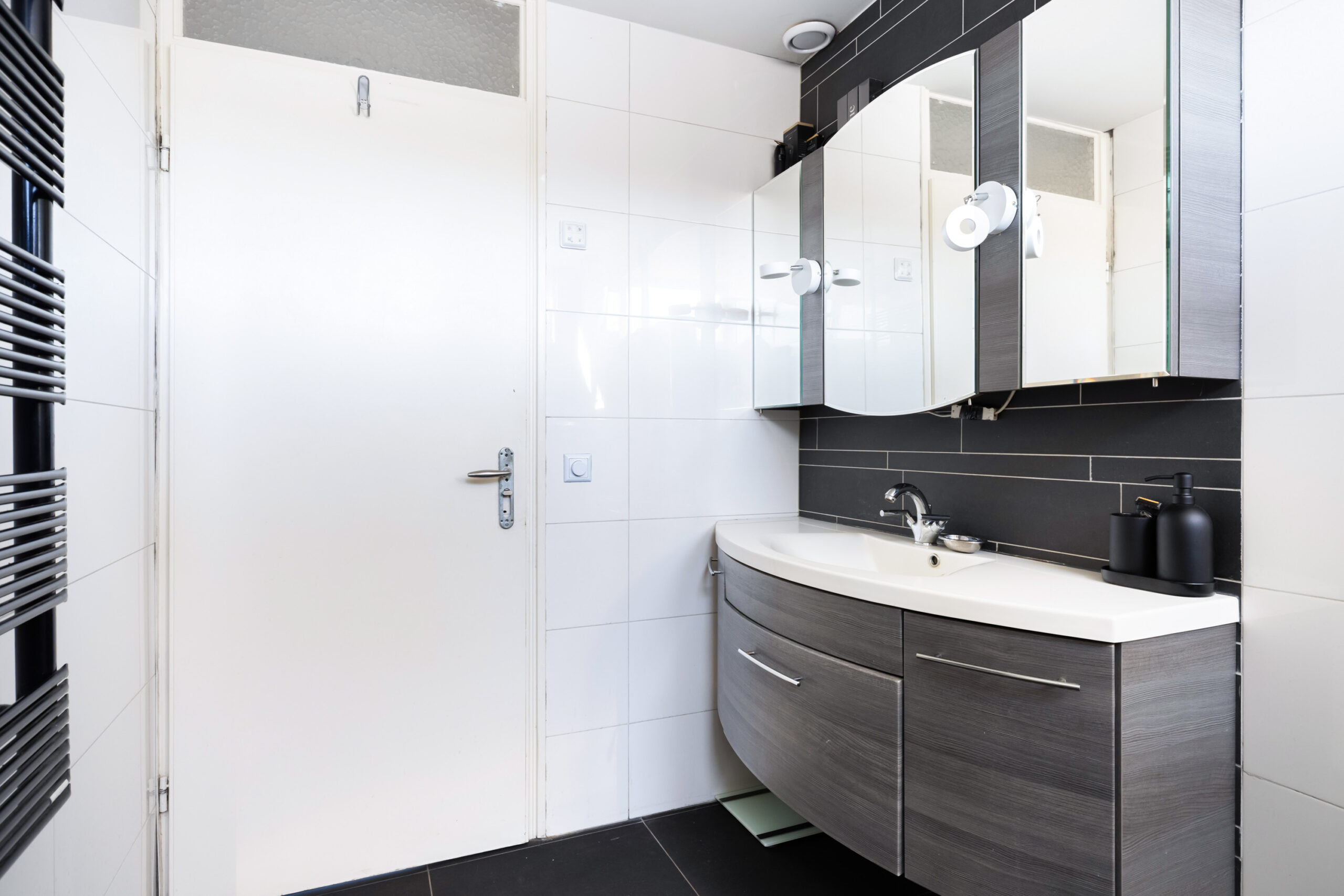 1e verdieping: overloop, 1e slaapkamer en 2e slaapkamer met grote schuifdeurkast gesitueerd aan de achterzijde, 3e slaapkamer gesitueerd aan de voorzijde, nette badkamer voorzien van inloopdouche, vrijdragend toilet en wastafelmeubel.