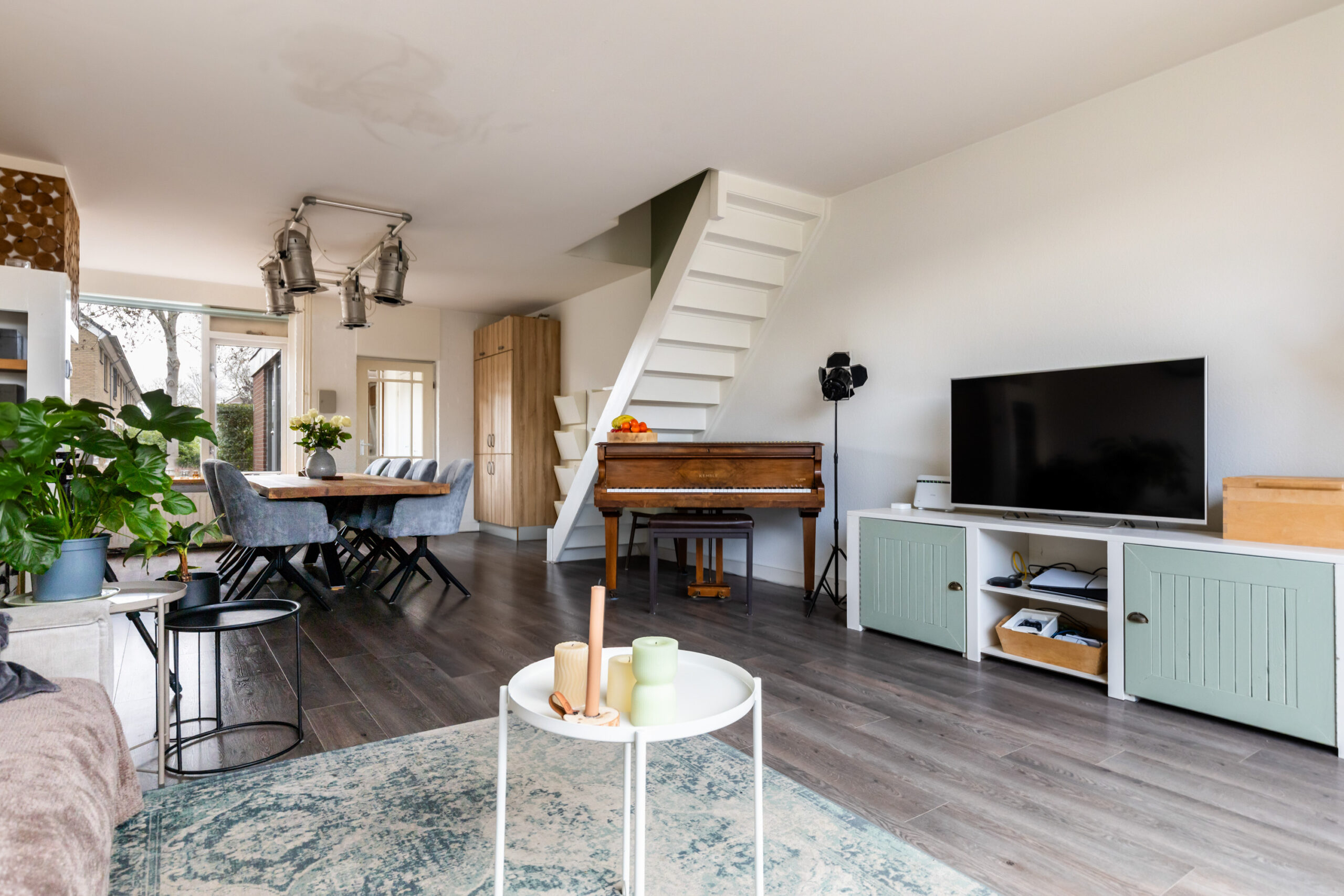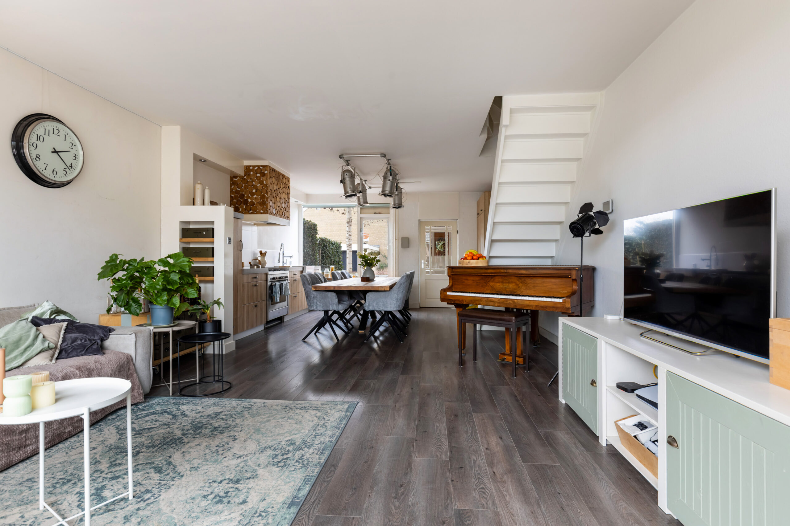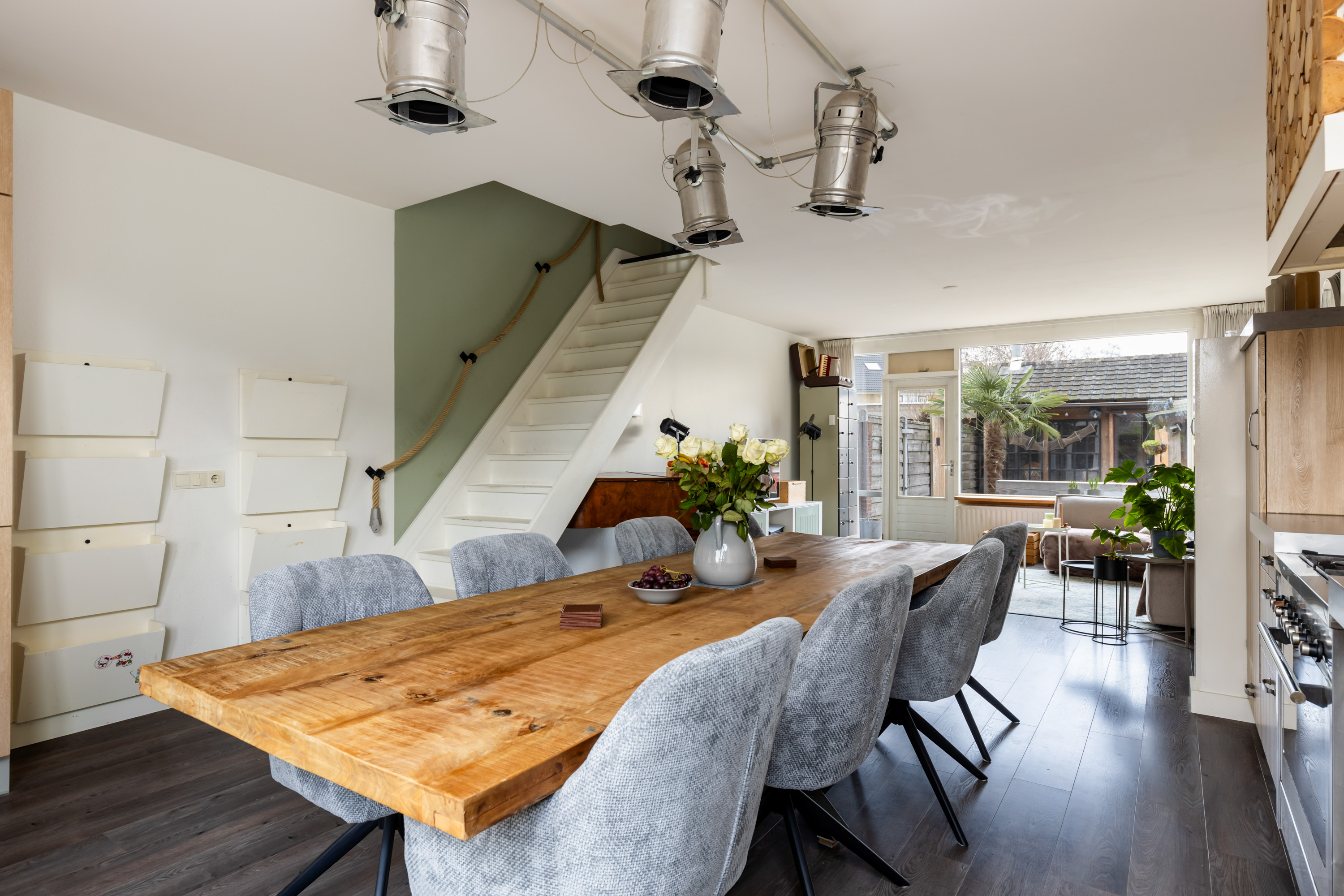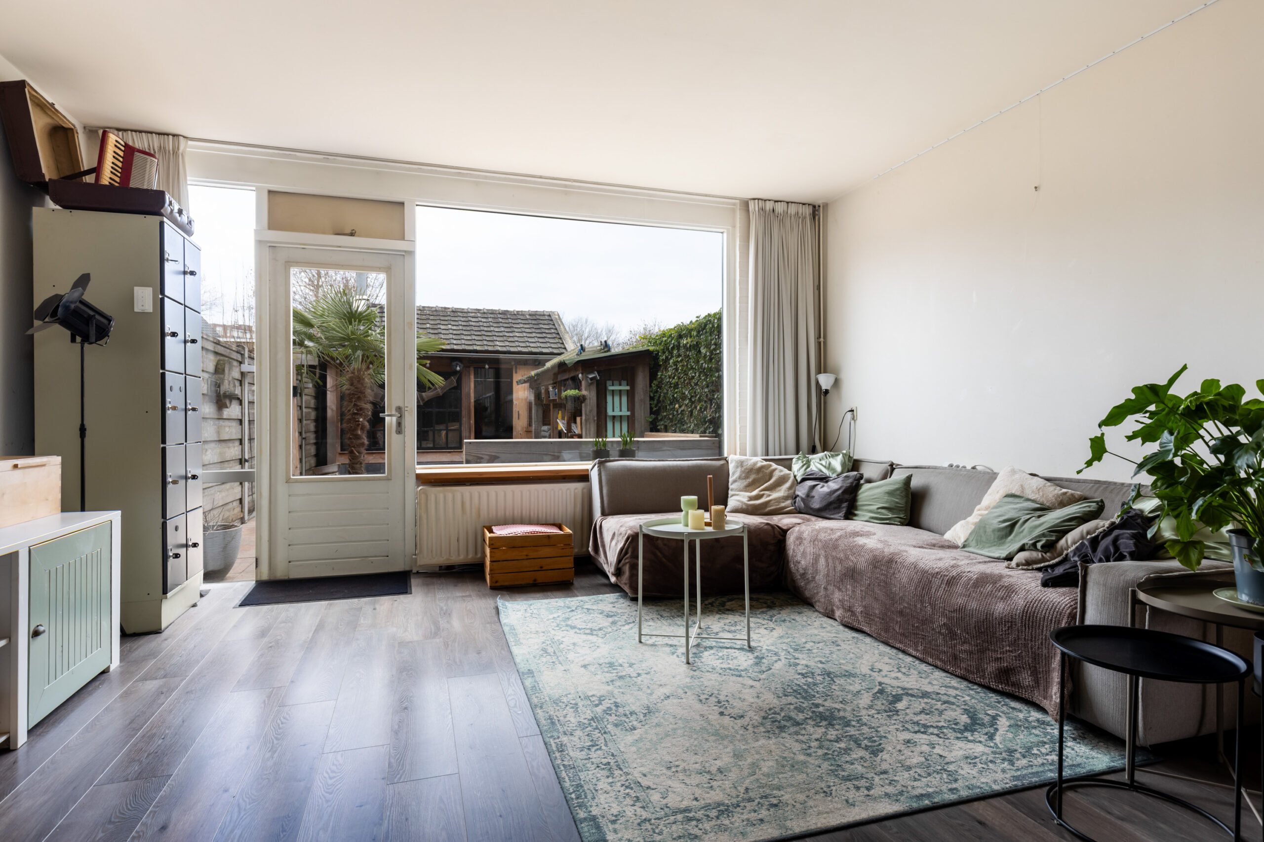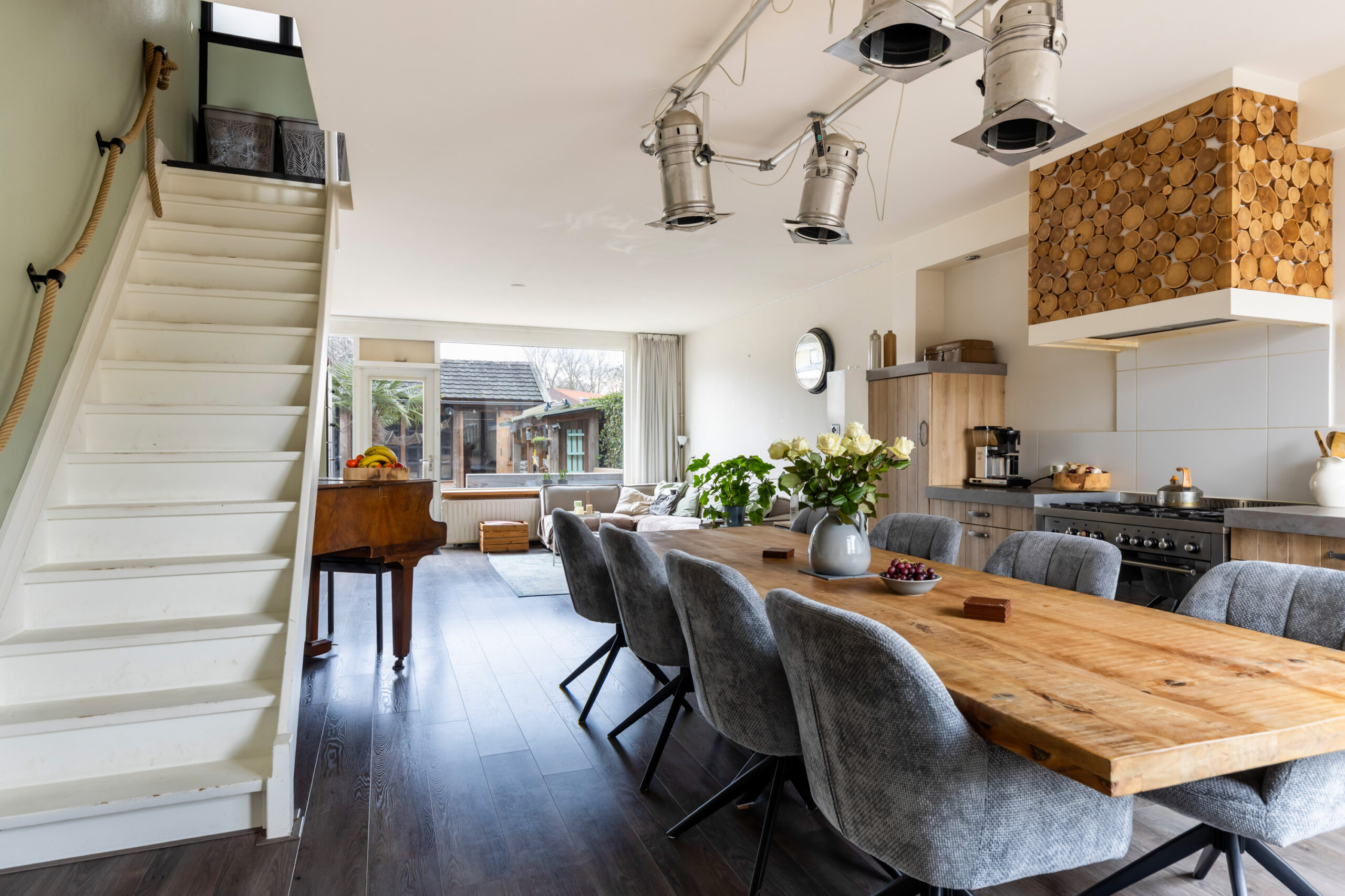 Het zitgedeelte is gesitueerd aan de achterzijde en voorzien van een deur met toegang tot de achtertuin. Ook bevindt zich hier de trapopgang naar de 1e verdieping.