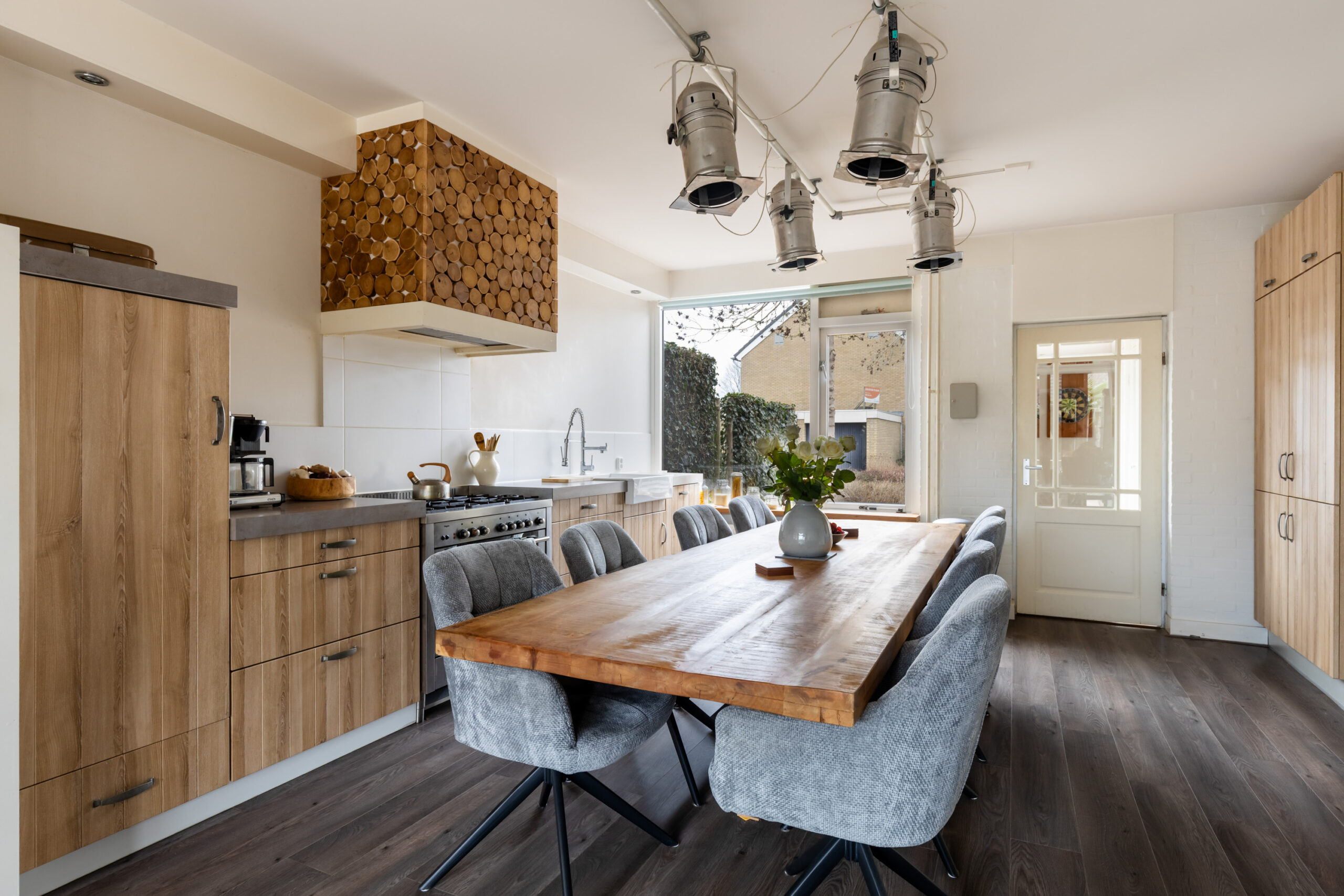 Entree/hal met vaste kasten en aansluitingen voor de was-apparatuur, toiletruimte, meterkast, ruime woon-/eetkamer met eetgedeelte aan de voorzijde, rechte keukenopstelling in houtkleur voorzien van de gewenste inbouwapparatuur en extra kolomkast.