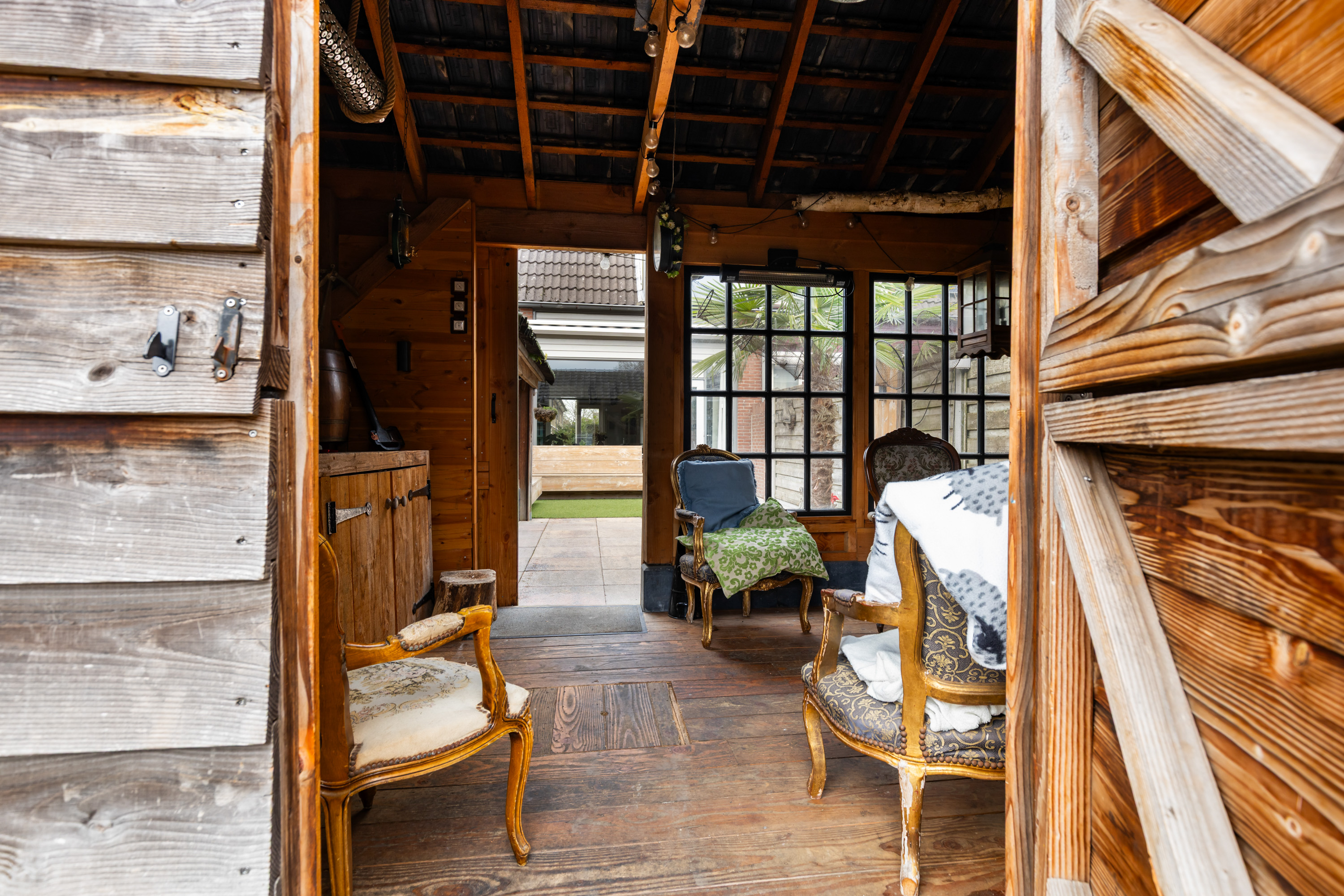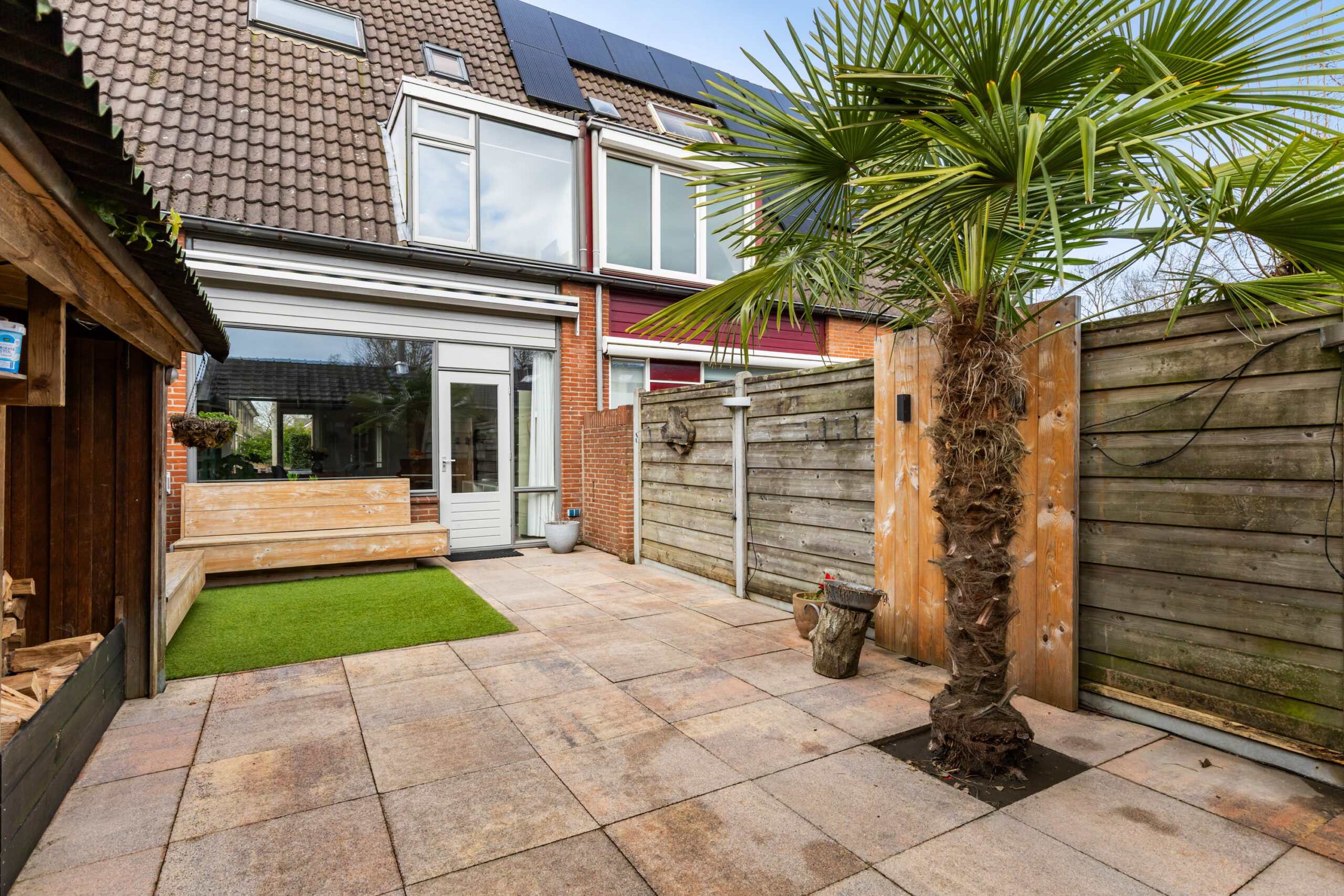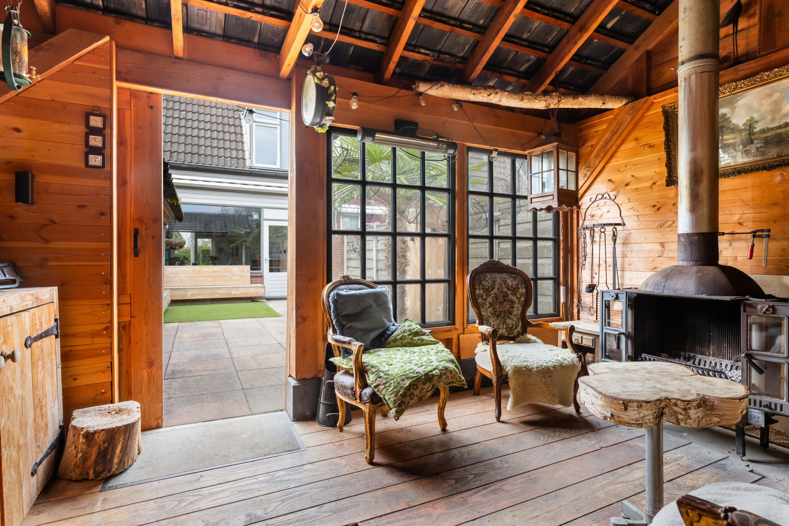 De achtertuin is gesitueerd op het zuidoosten en is voorzien van siertegels met een gedeelte kunstgras wat op de tegels ligt. Aangrenzend bevindt zich een houten haardhok met open bergruimte en een sfeervolle overkapping of tuinkamer met schuifdeur vanuit de tuin en openslaande deuren naar het achtergelegen parkeerplein. Een heerlijke ruimte met een houtkachel om tot laat in de avond te genieten van het buitenleven het hele seizoen door. Door de vrije ligging aan de achterzijde ervaart u eveneens optimale privacy!